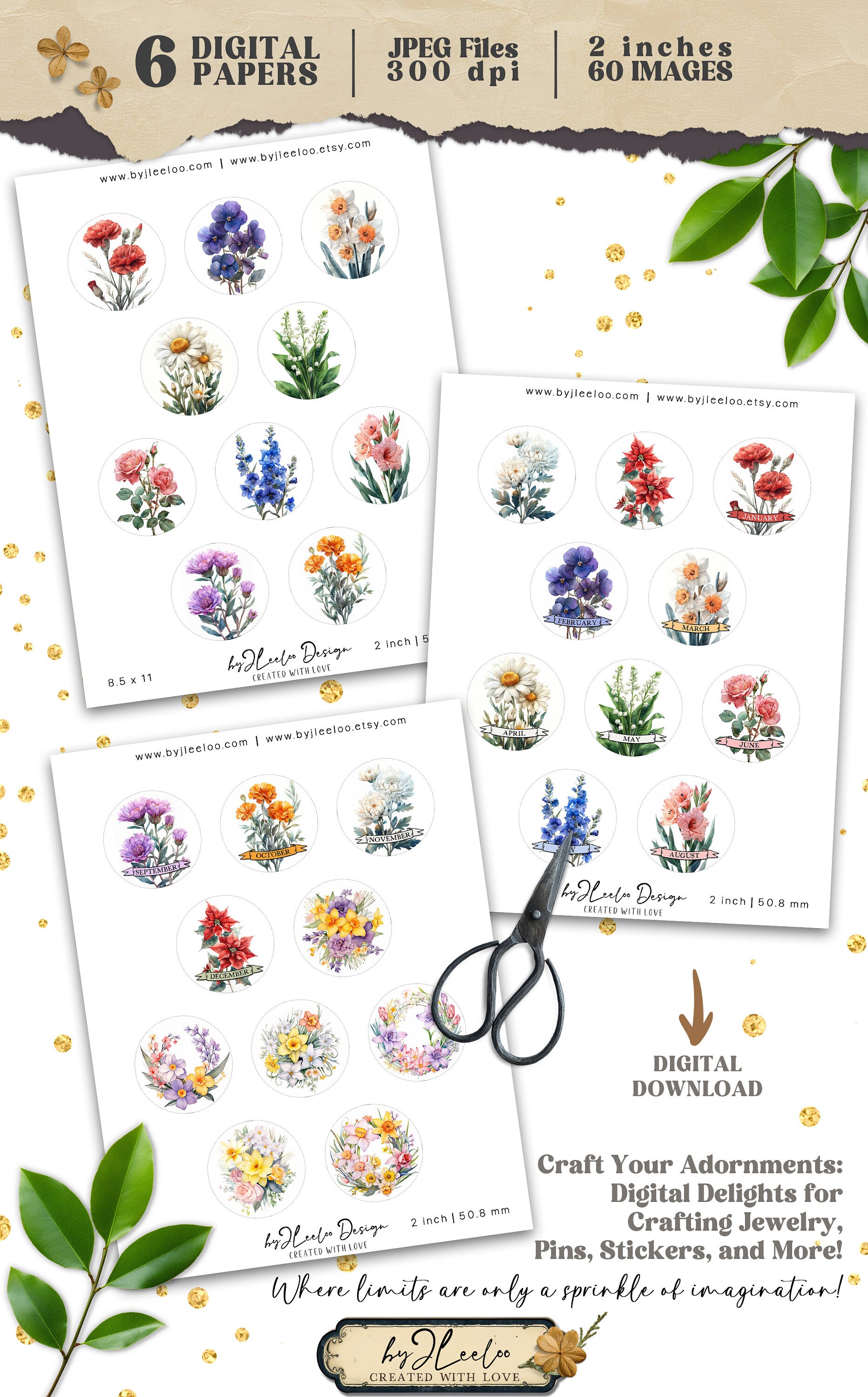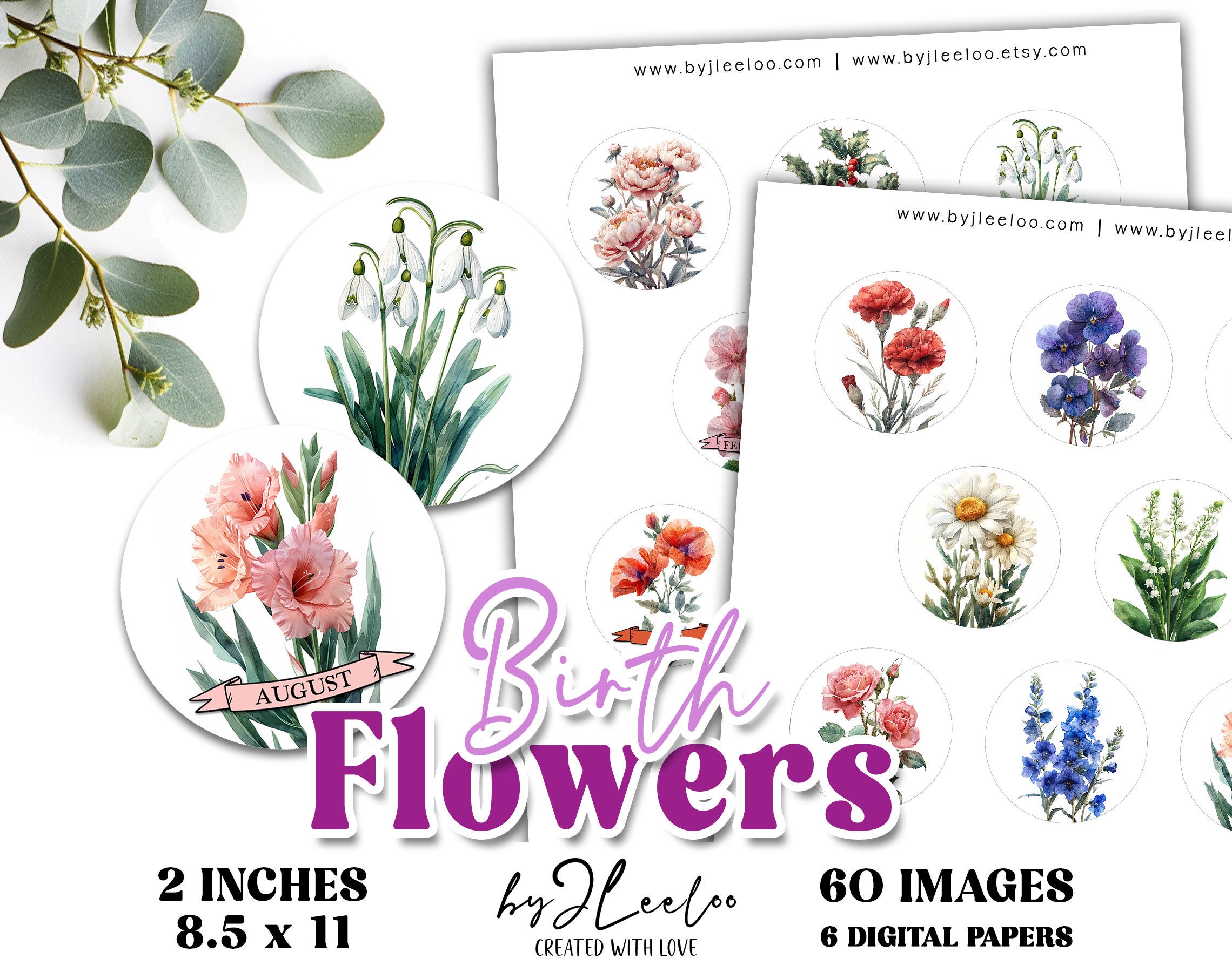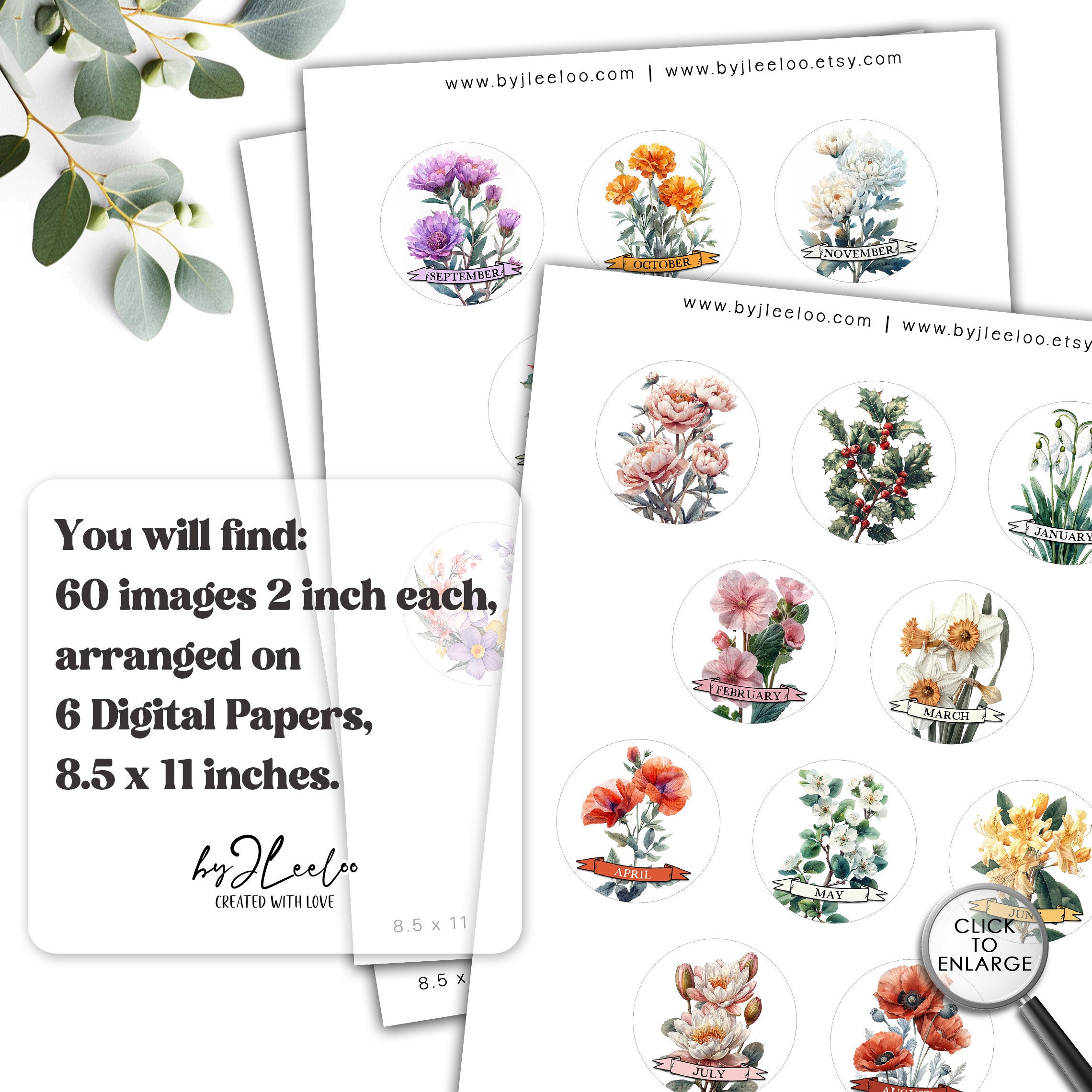 BIRTH FLOWERS 2 inch printable pendant | Birth Month Flower round circle Fussy cut digital download | cabochon necklace sticker pin | tn811