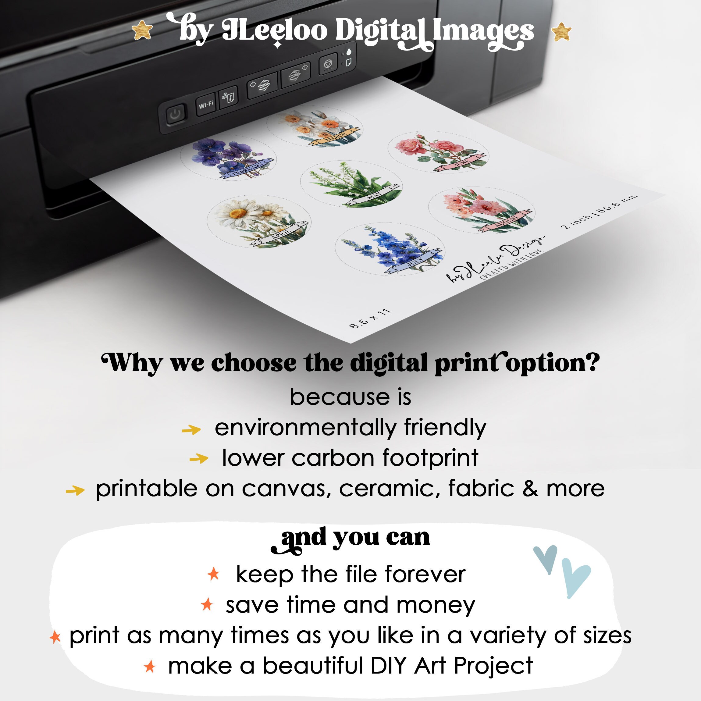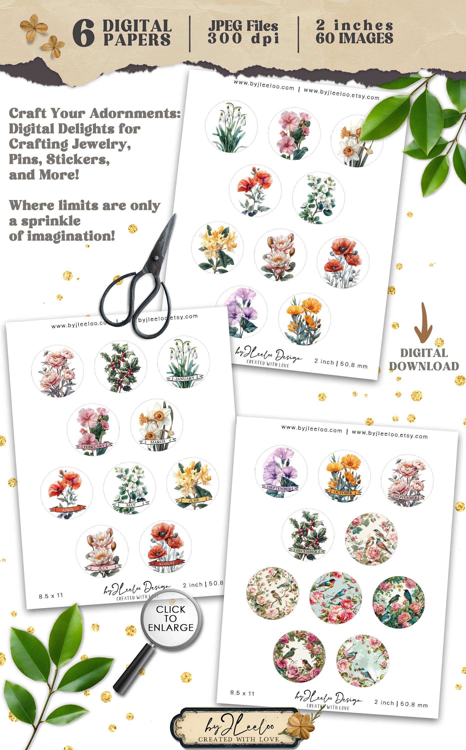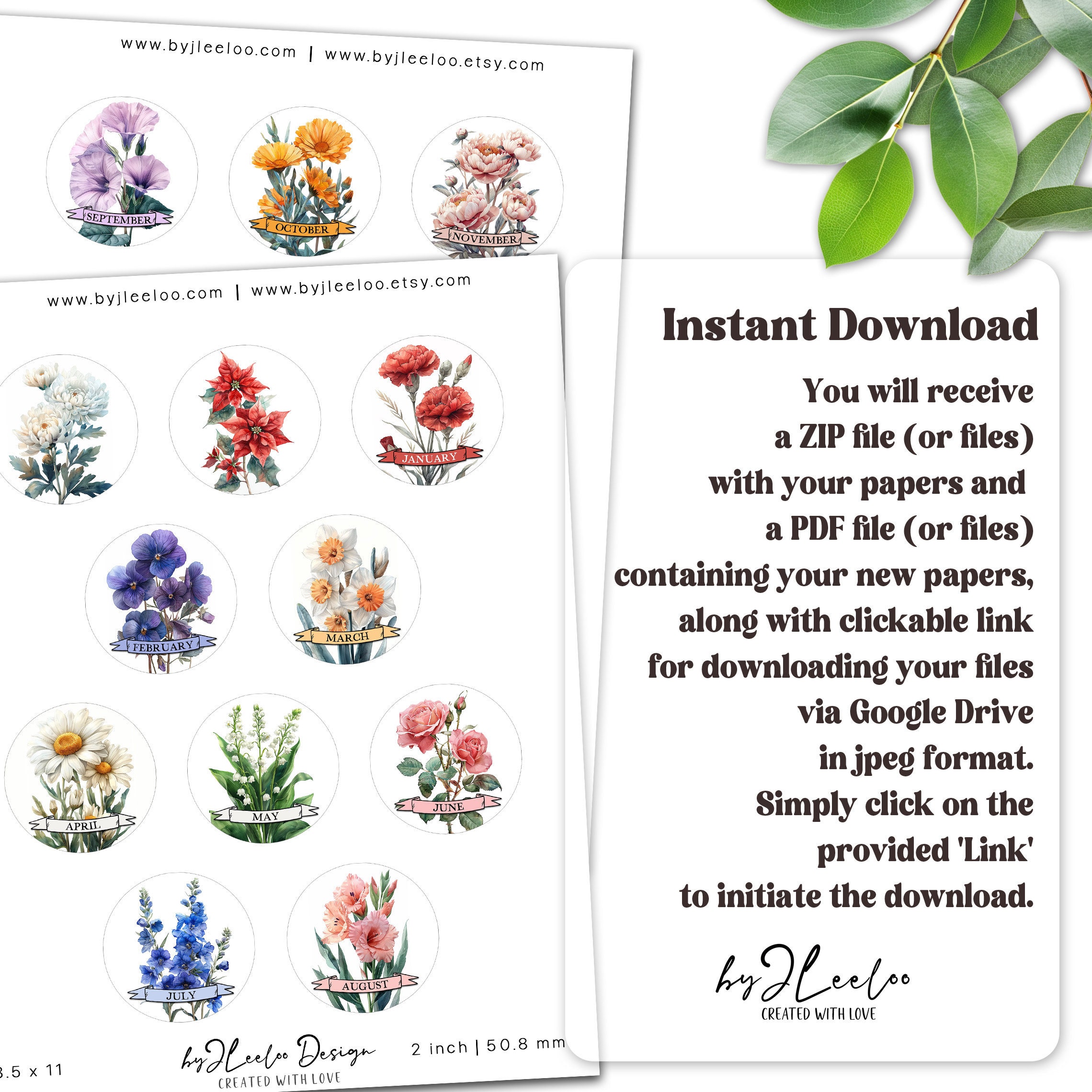 BIRTH FLOWERS 2 inch printable pendant | Birth Month Flower round circle Fussy cut digital download | cabochon necklace sticker pin | tn811