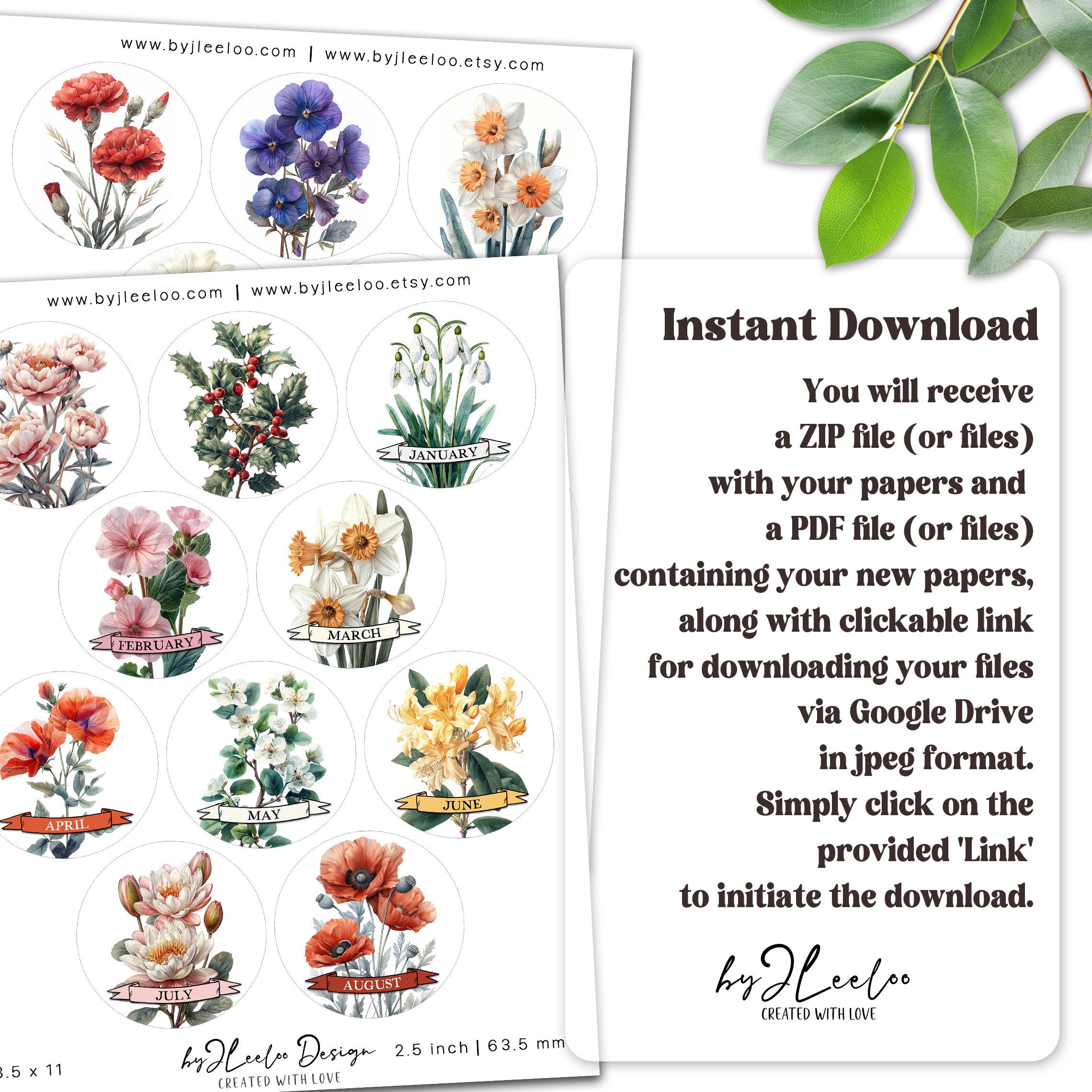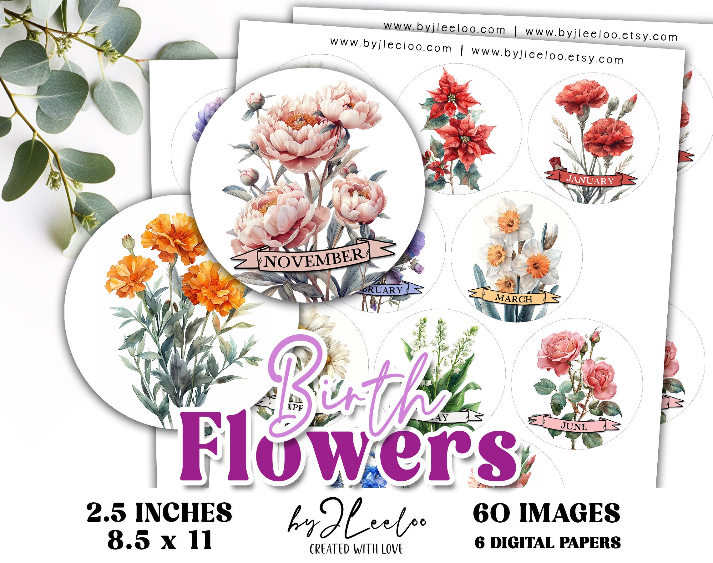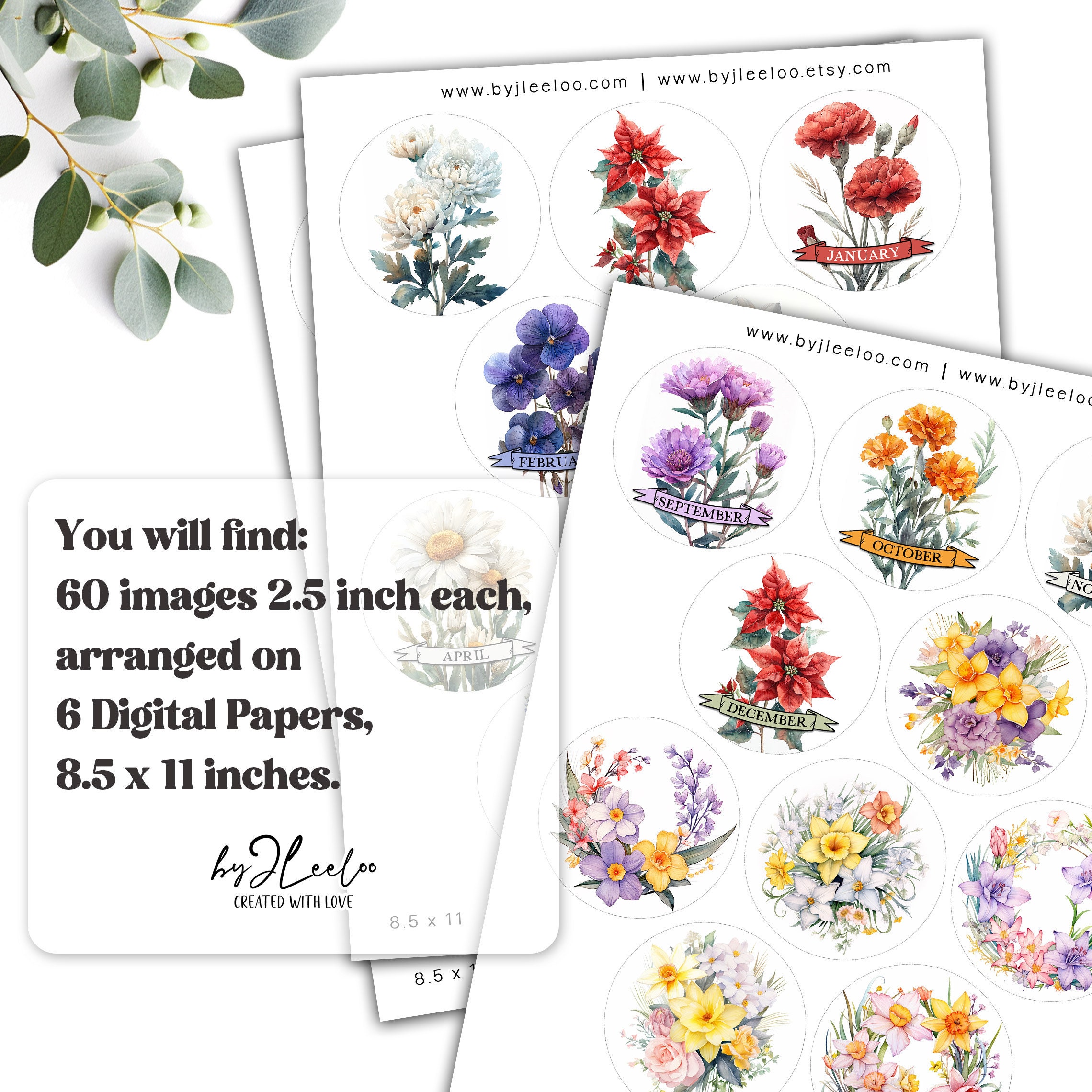 BIRTH FLOWERS 2.5 inch printable pendant | Circle Birth Month Flower round sticker bottlecap cabochon birthday gift pendant | Fussy cut digital download | tn812