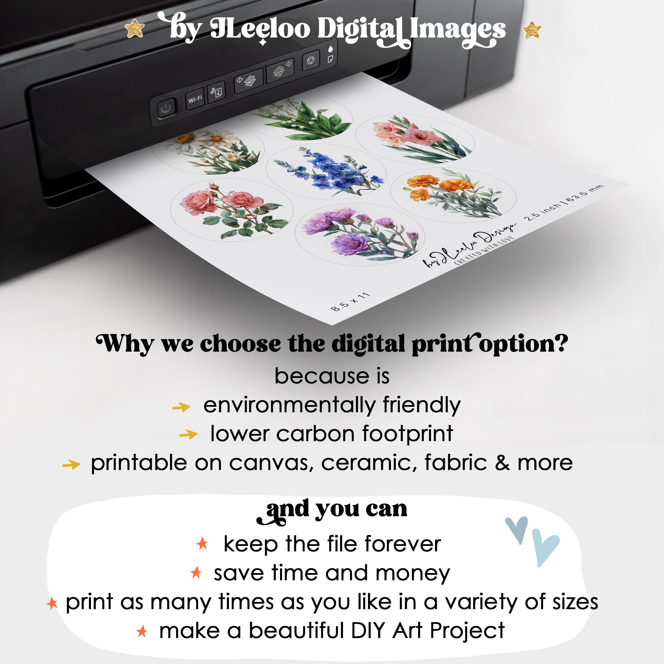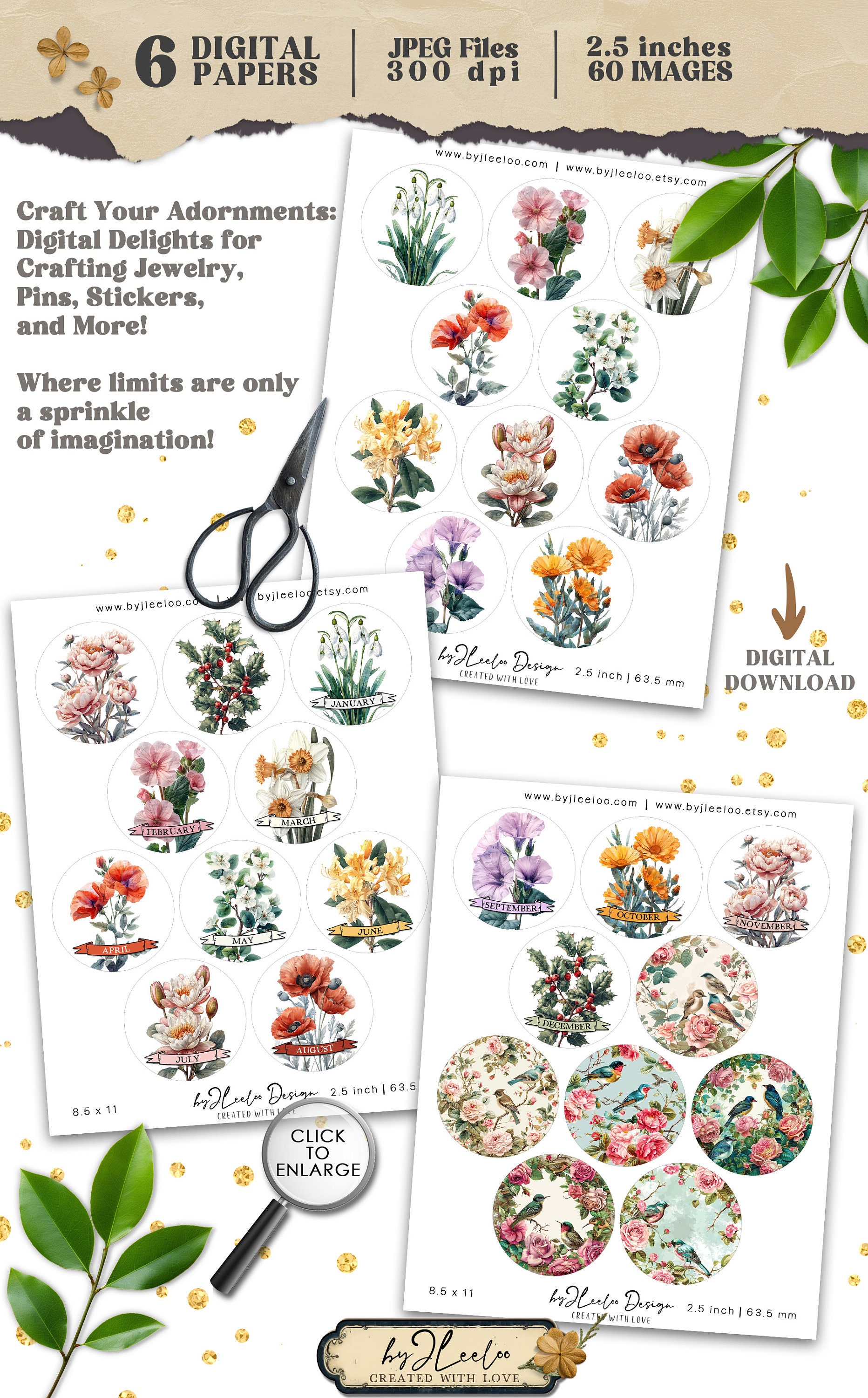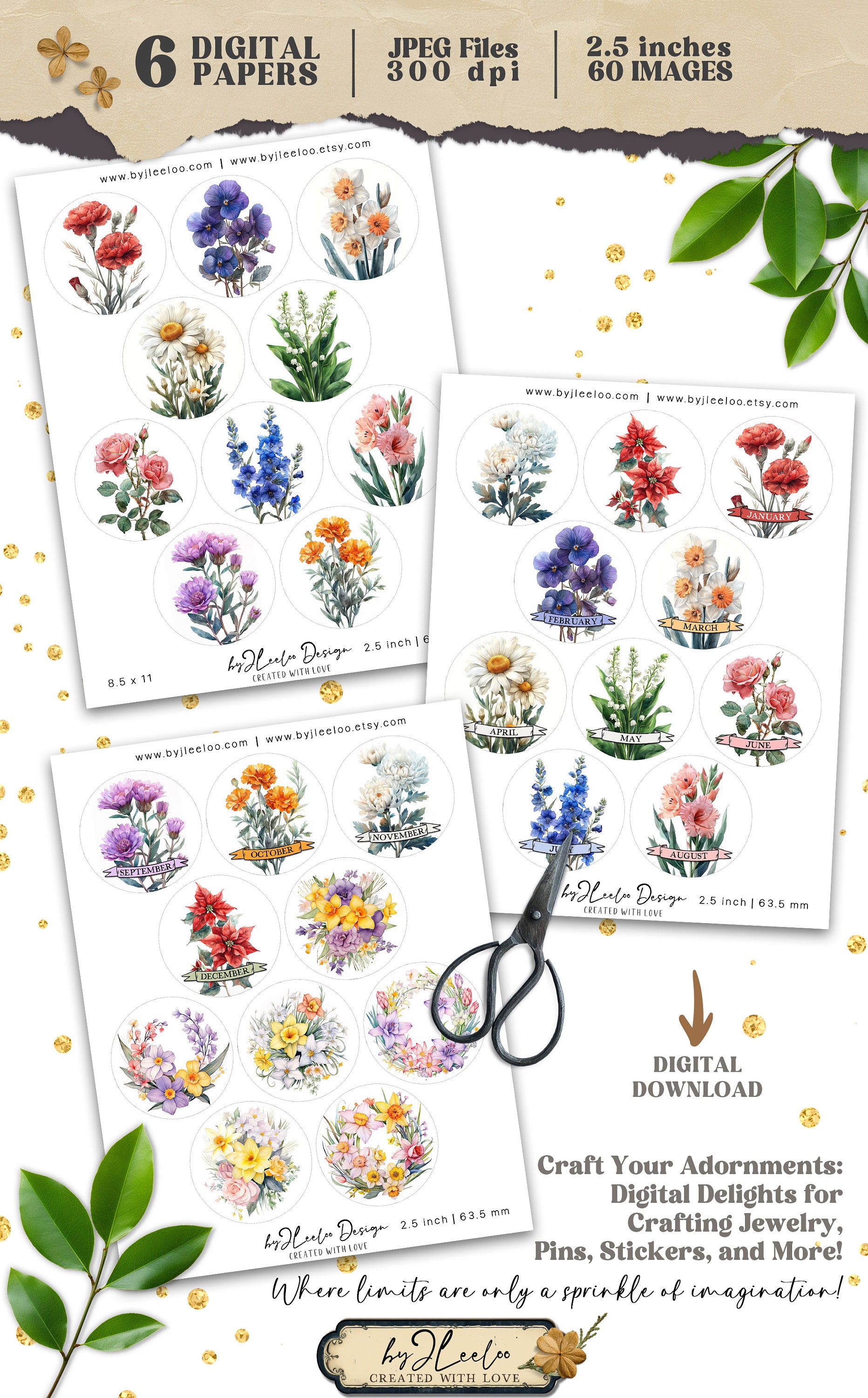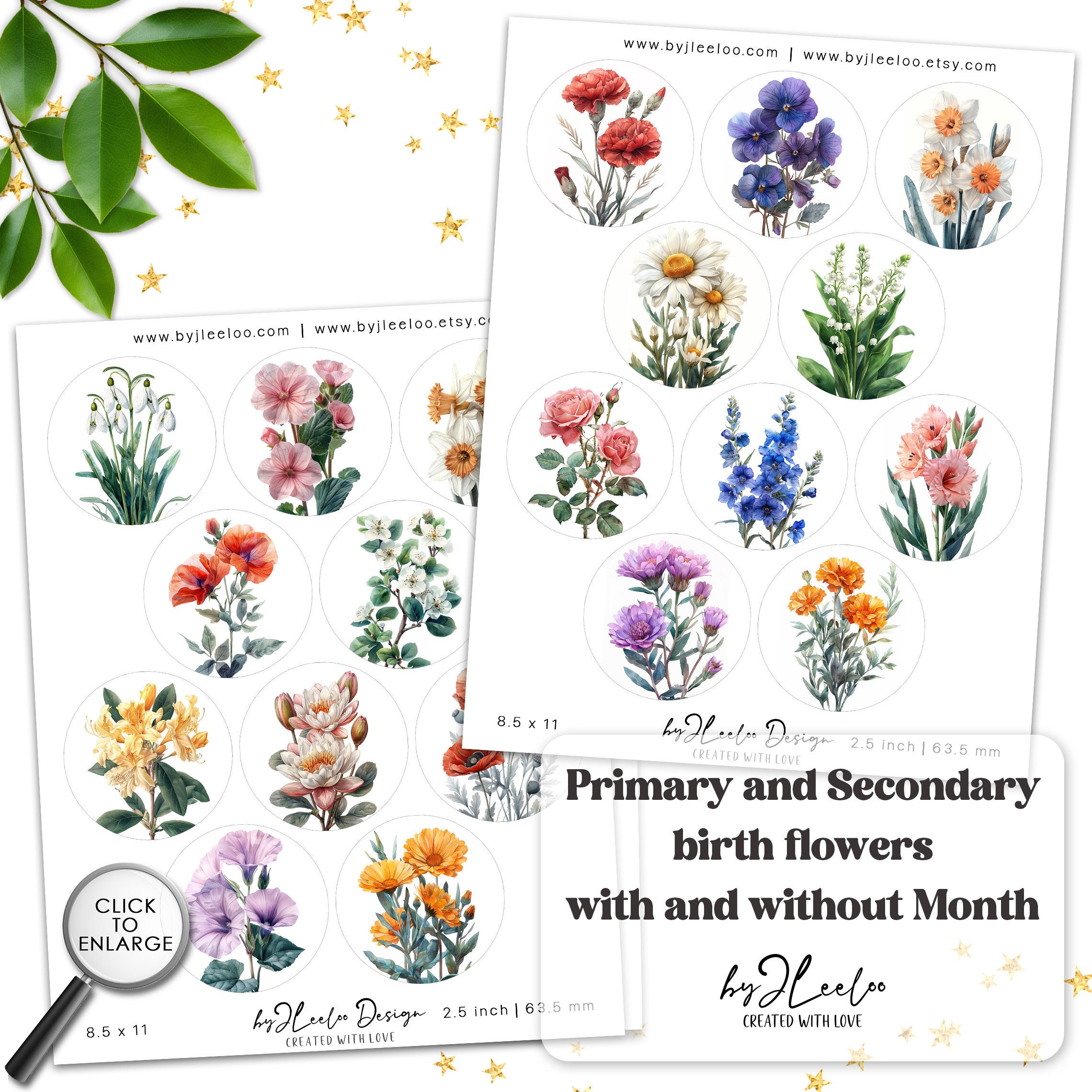 BIRTH FLOWERS 2.5 inch printable pendant | Circle Birth Month Flower round sticker bottlecap cabochon birthday gift pendant | Fussy cut digital download | tn812
