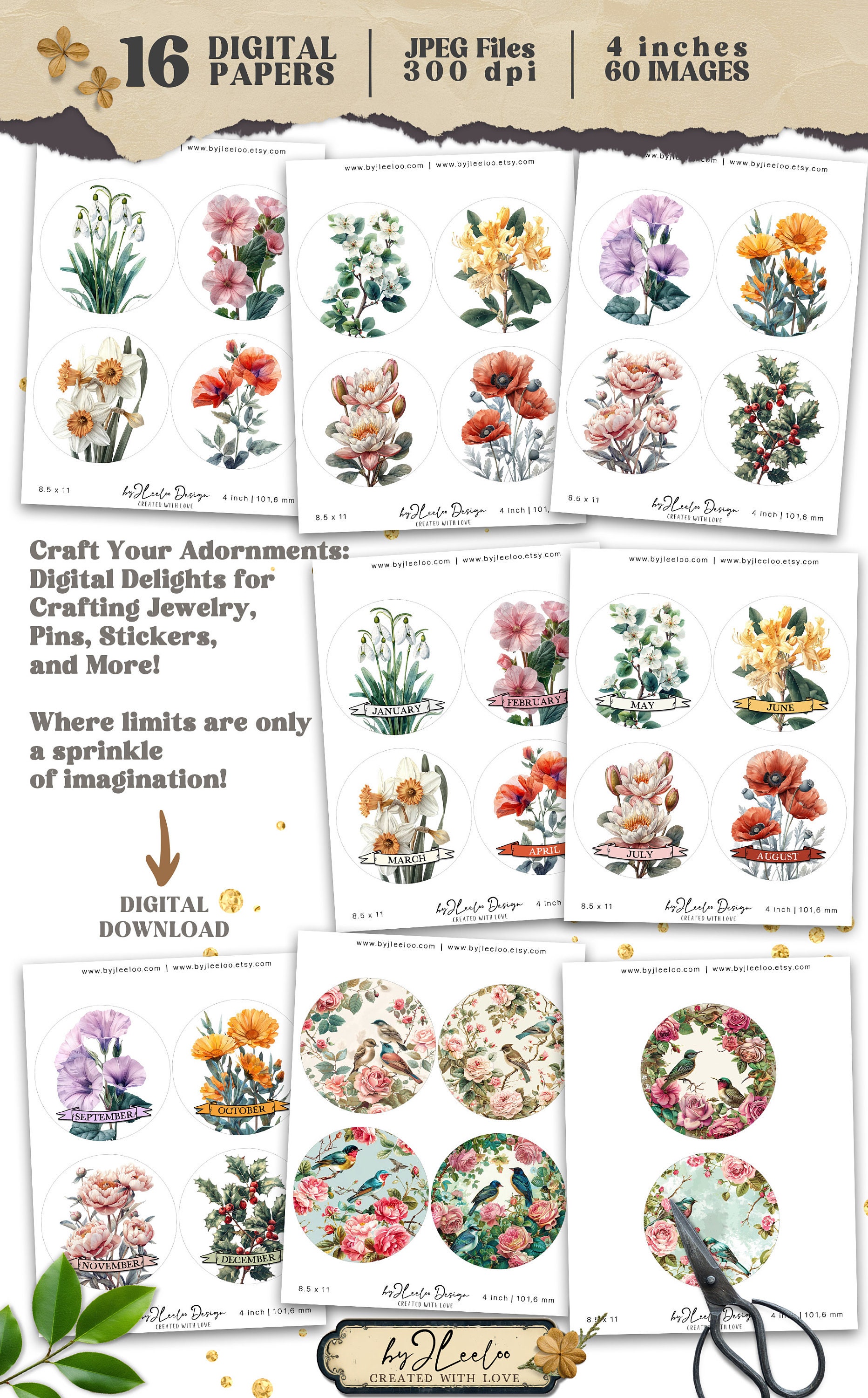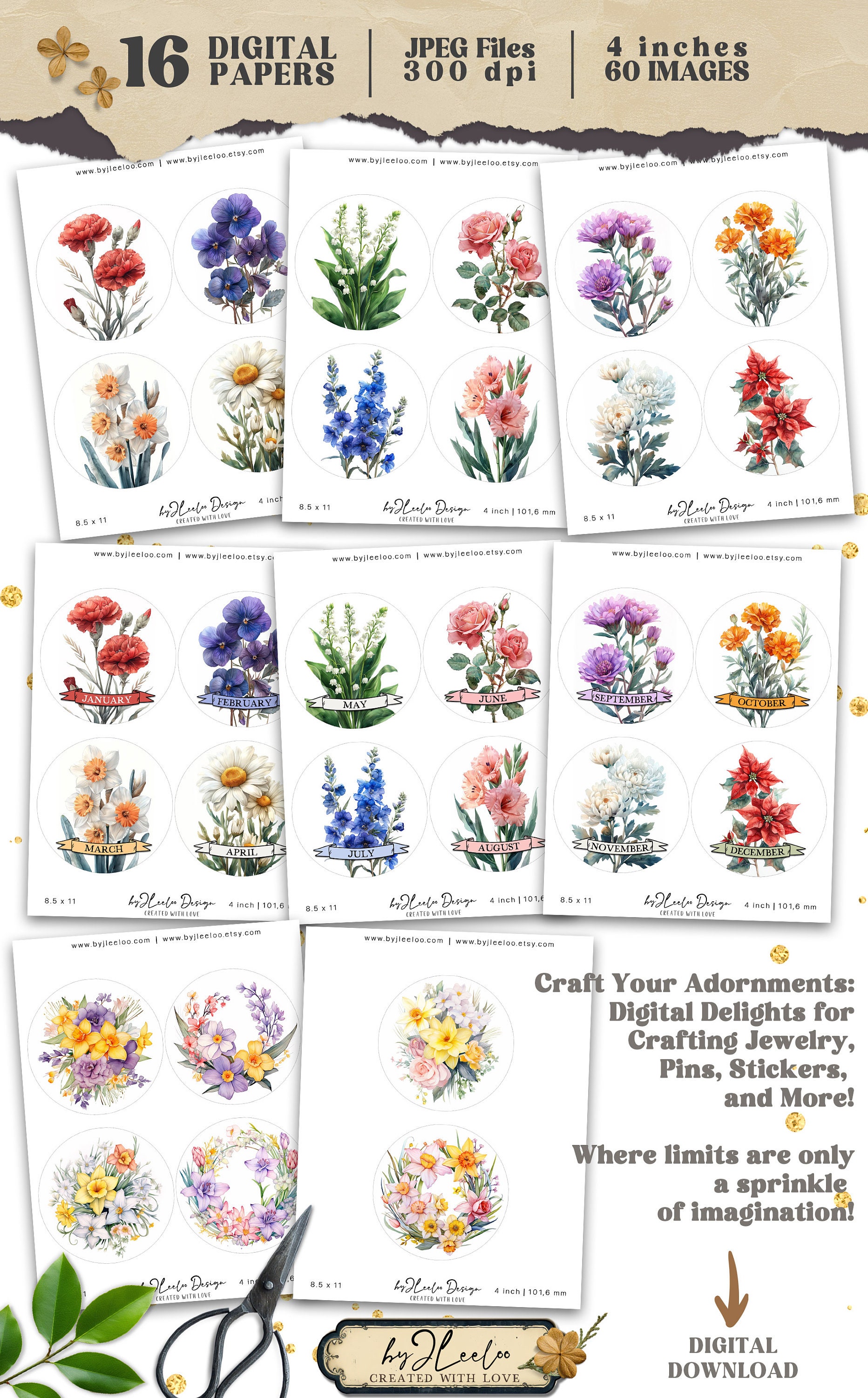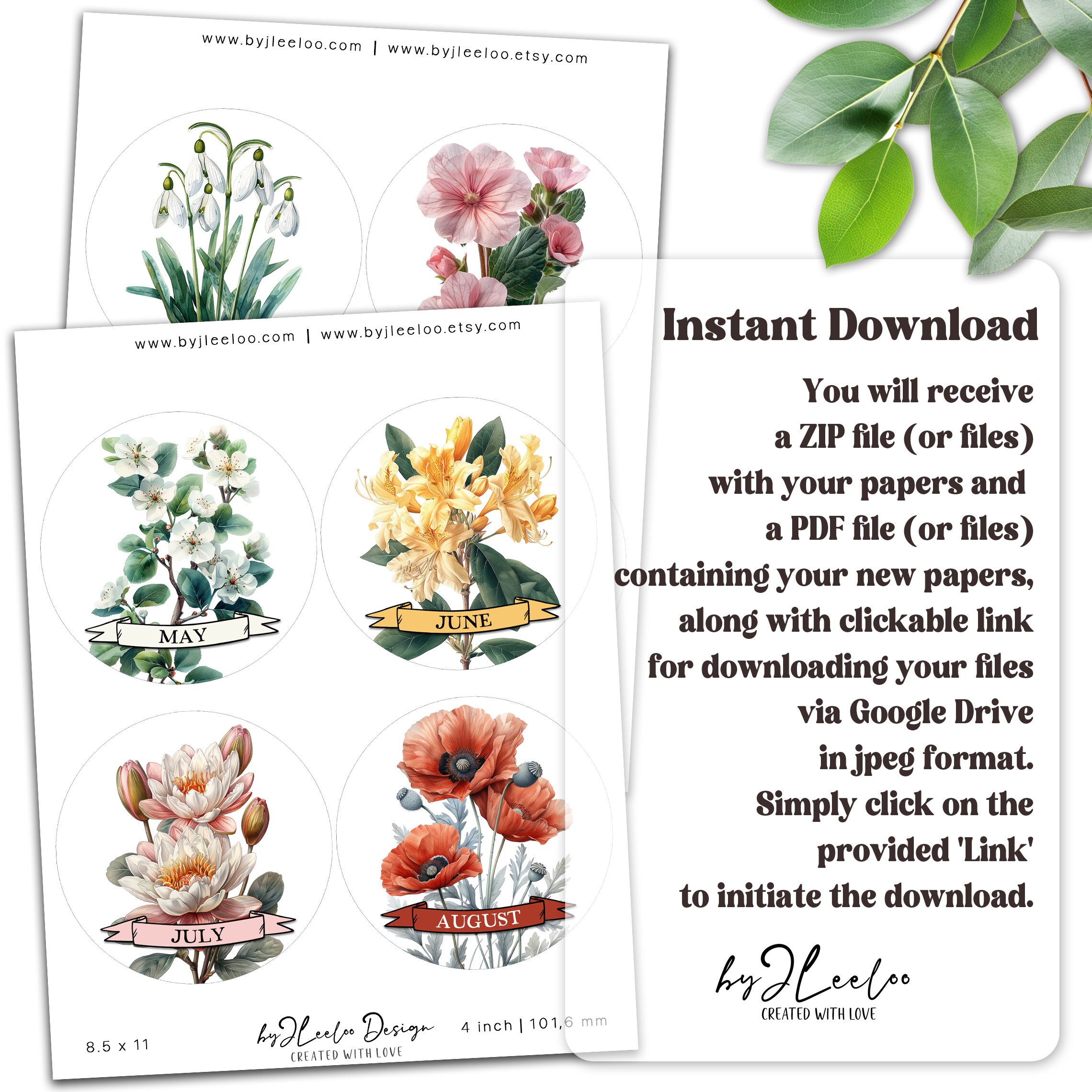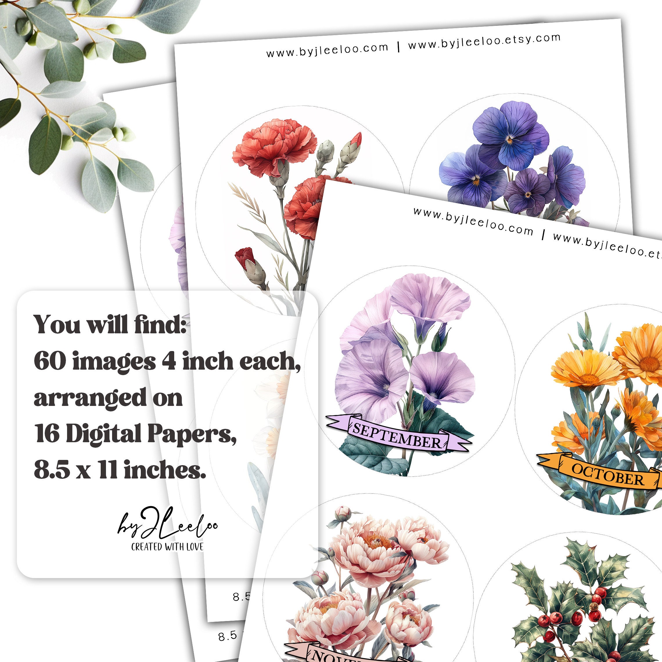BIRTH FLOWERS 4 inches printable birthday gift | coaster Birth Month Flower circle sticker card making | Fussy cut digital download | tn814
