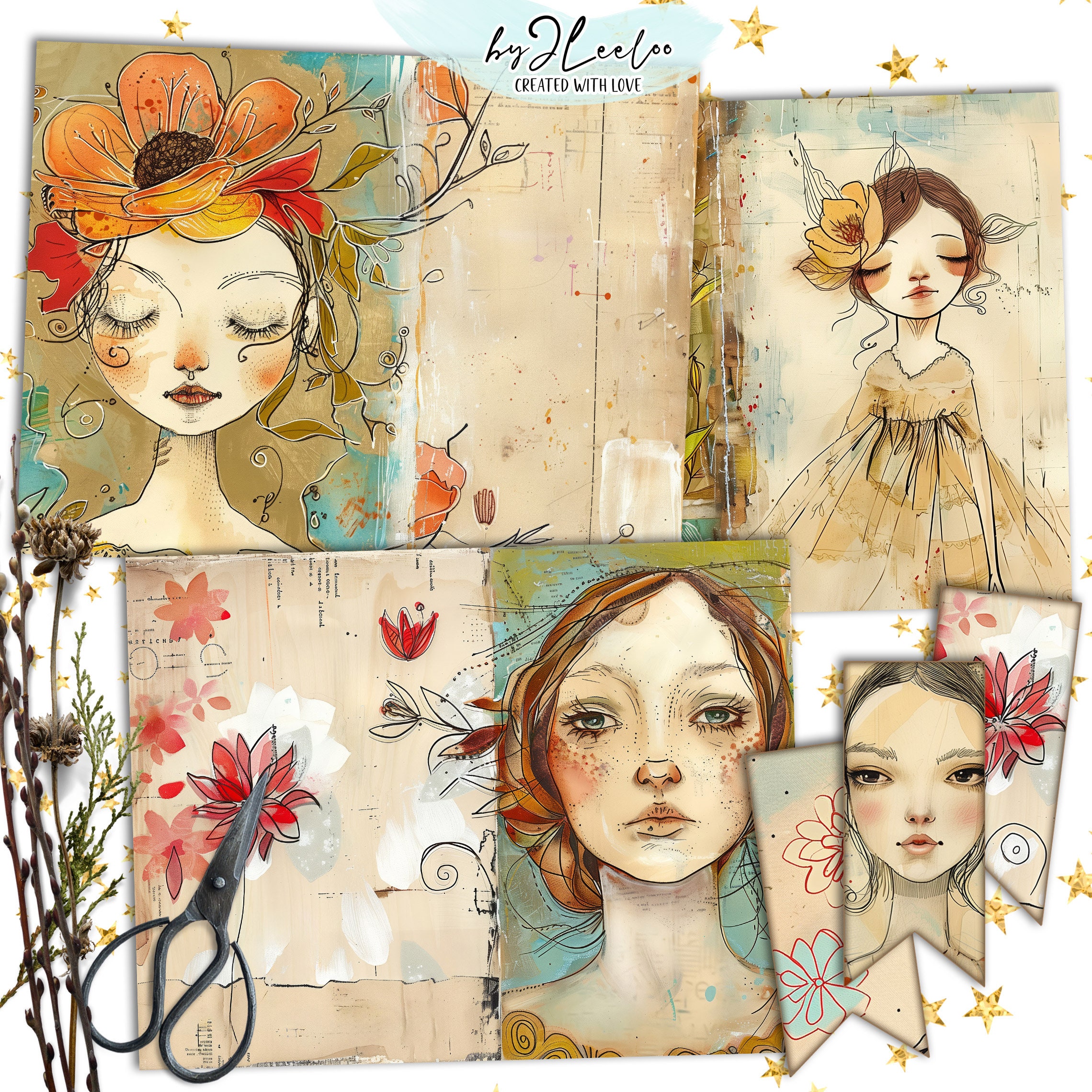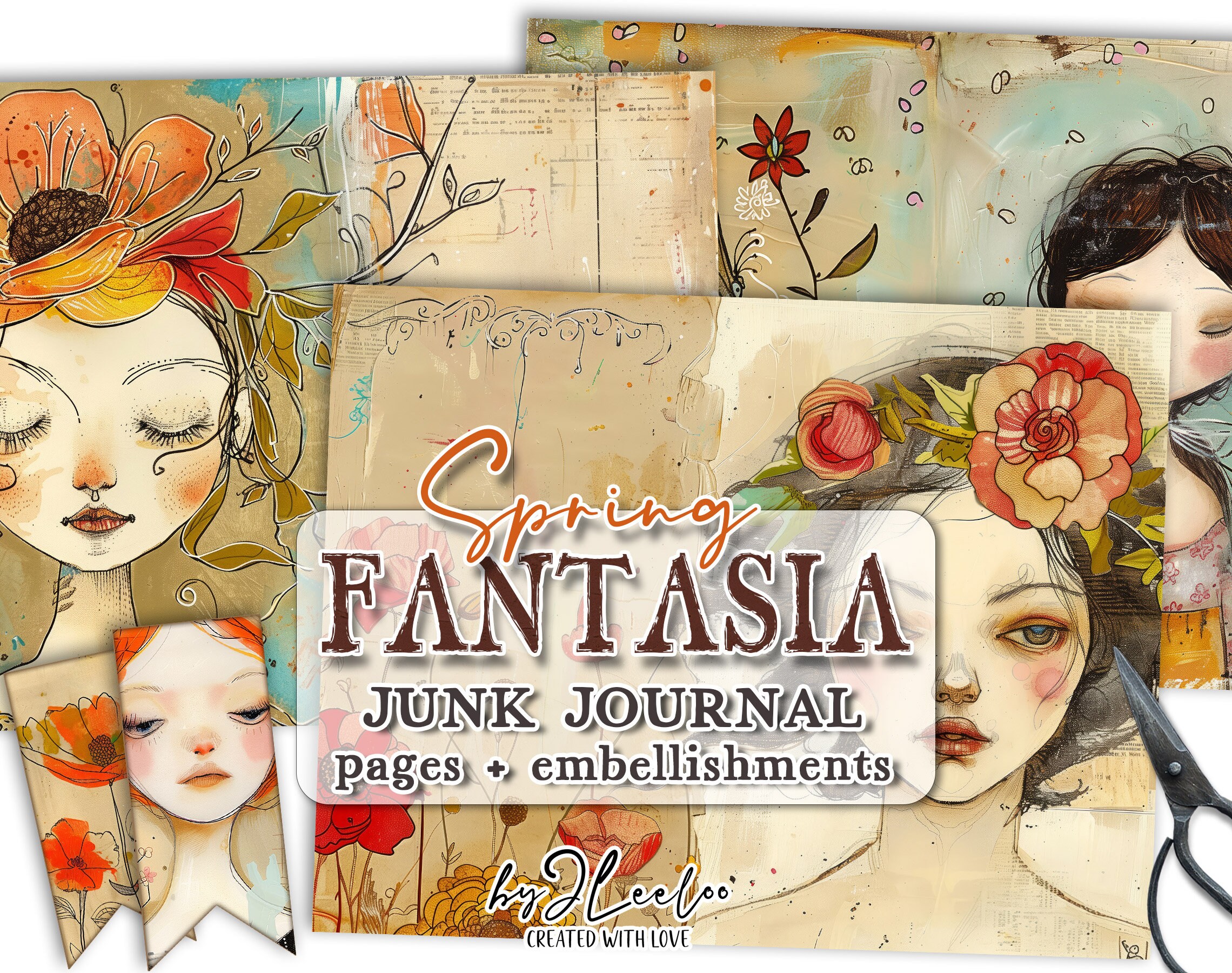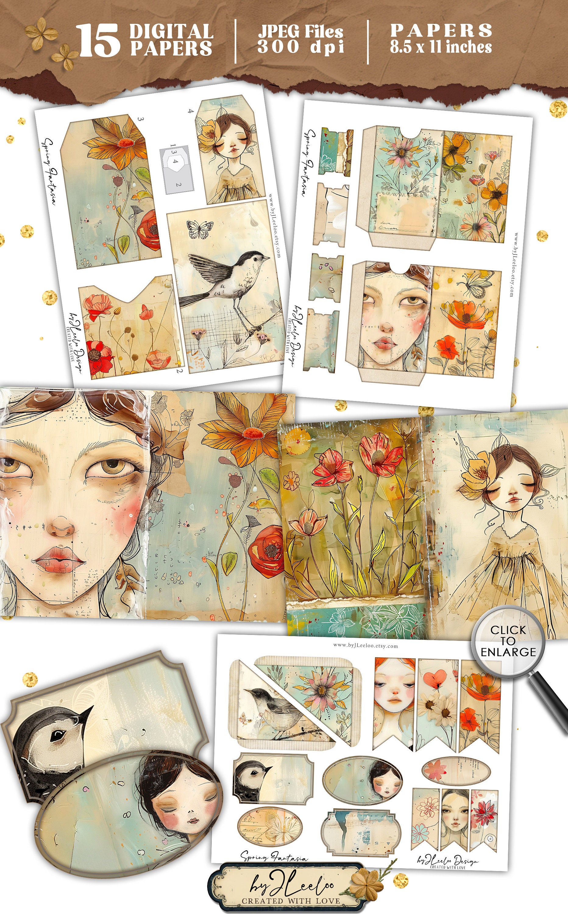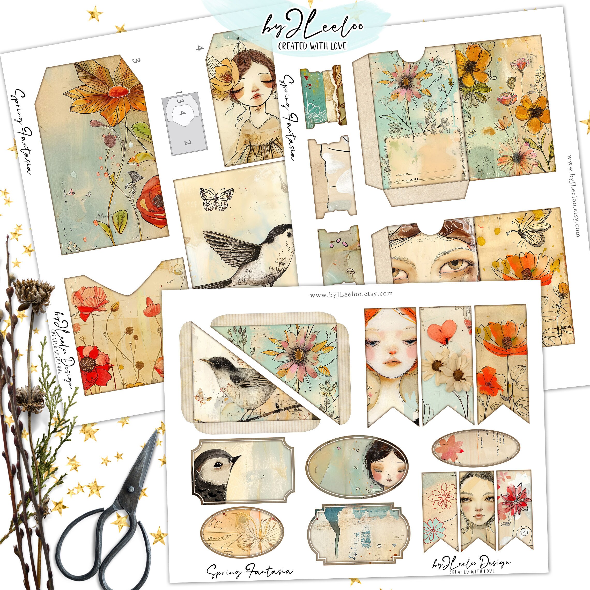SPRING FANTASIA junk journal printable | Hand-drawn mixed media girl half pages ephemera | Vintage pages crafting collage diary | pp794