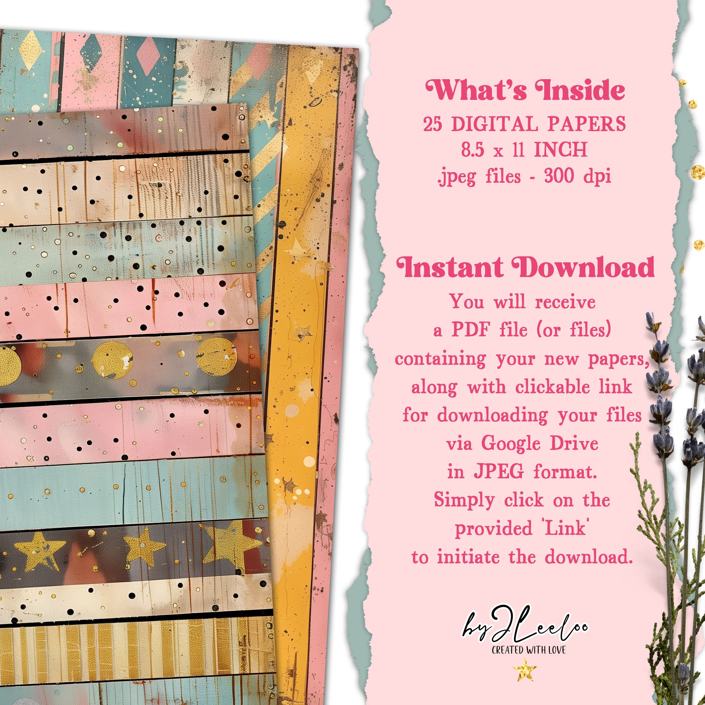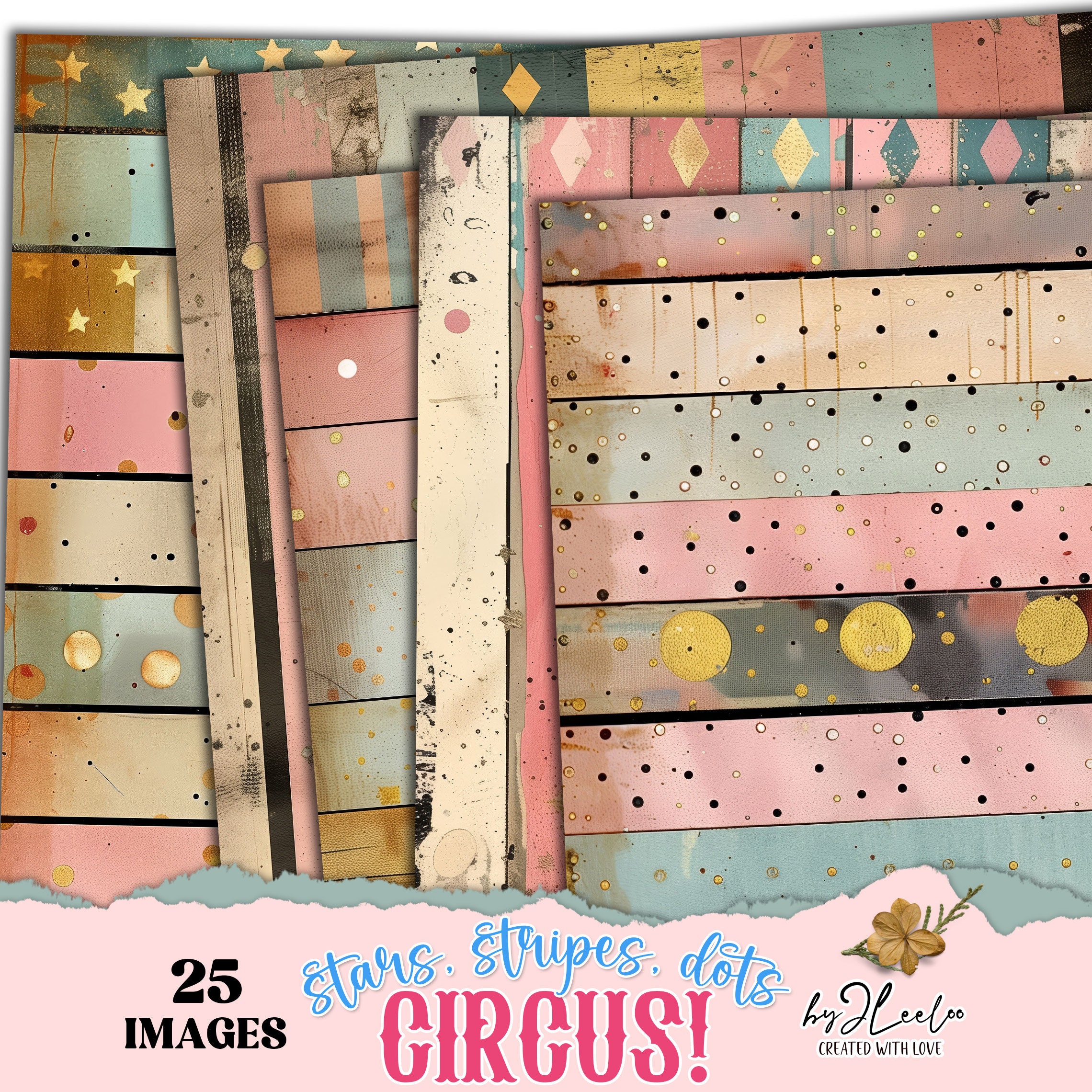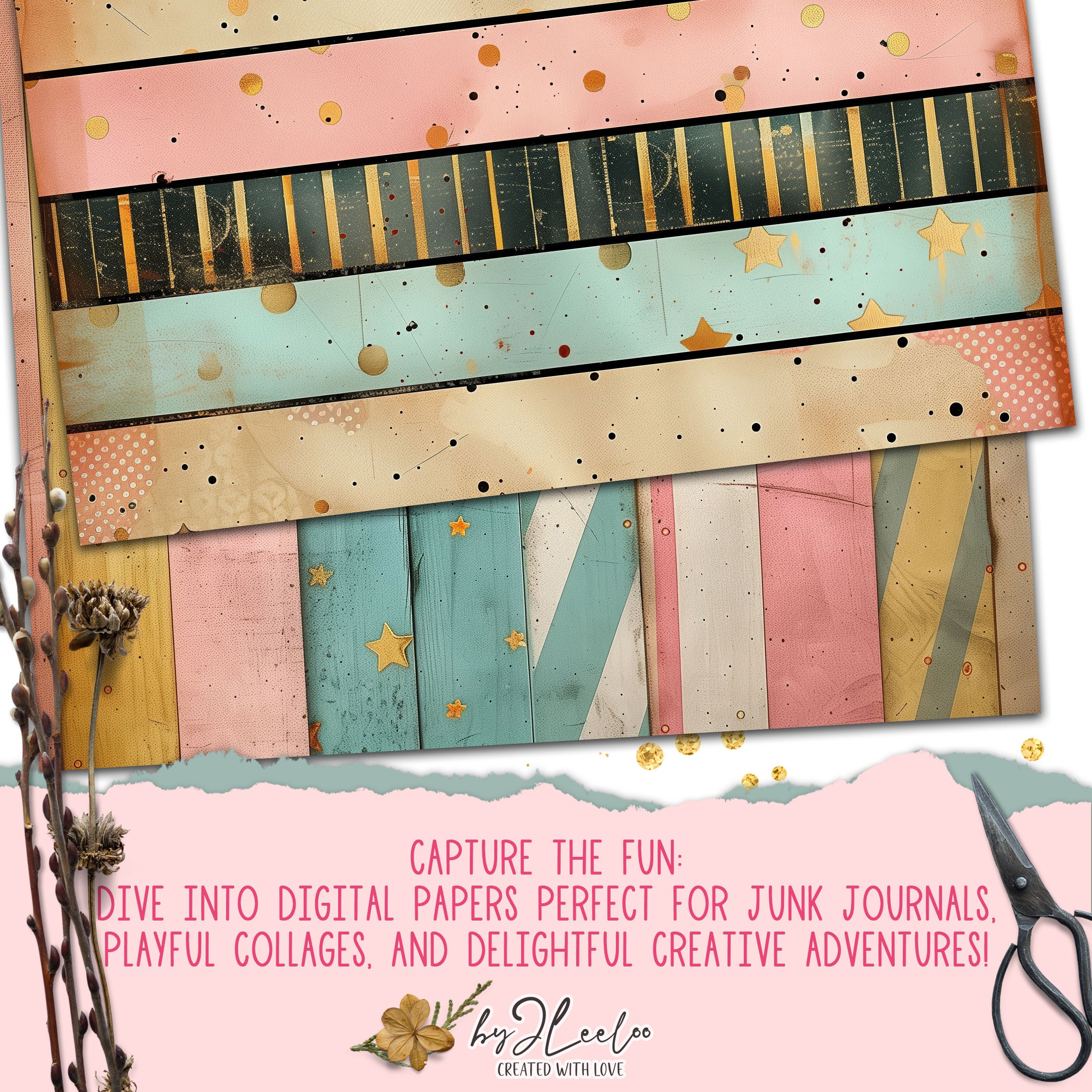 โจ Hey there, fellow creative spirit! Immerse yourself in nostalgia with our collection of charmingly aged papers. Featuring a mix of horizontal and vertical strips adorned with glitter patterns, muted pastel colors, diamond shapes, and faded gold stars, our designs evoke a vintage circus allure. Perfect for crafting enchanting scrapbooks, junk journals, and promotional materials inspired by old circus posters. Let the magic of these retro-inspired textures transform your projects! ๐ซ