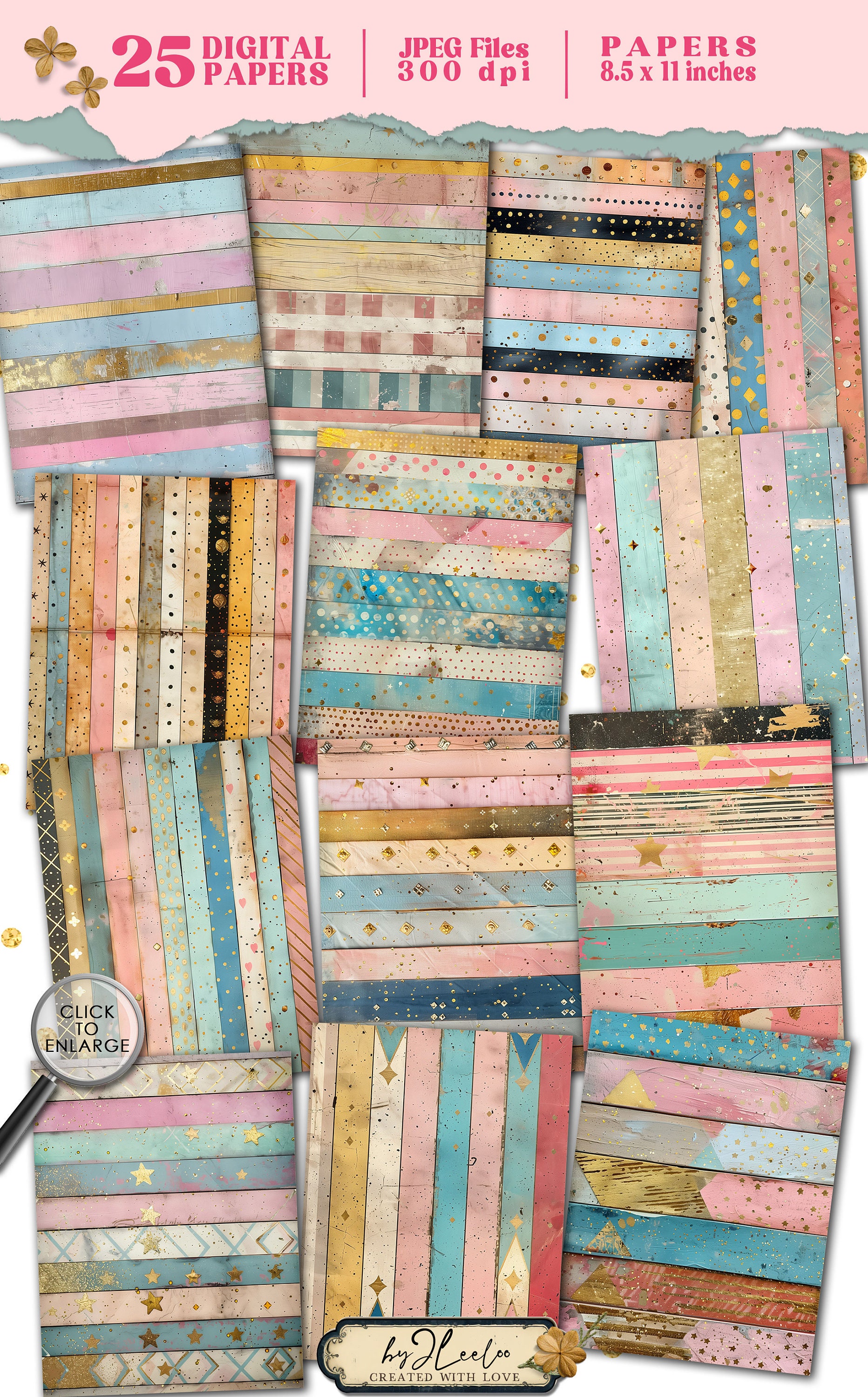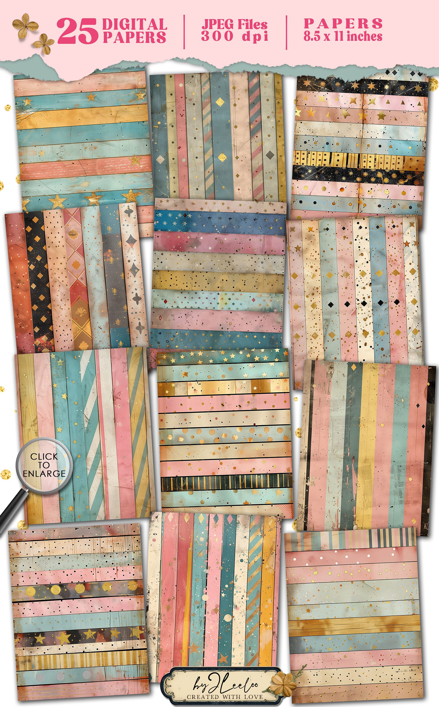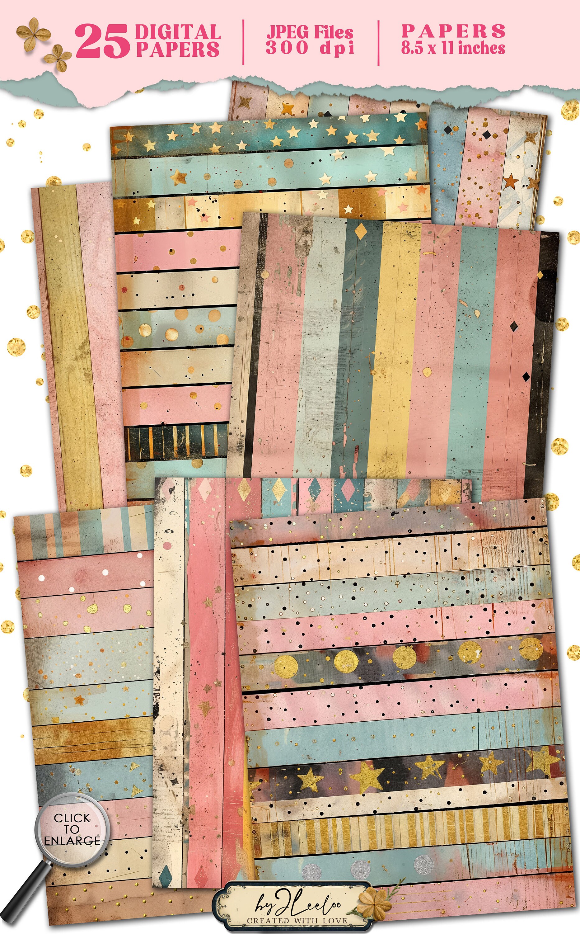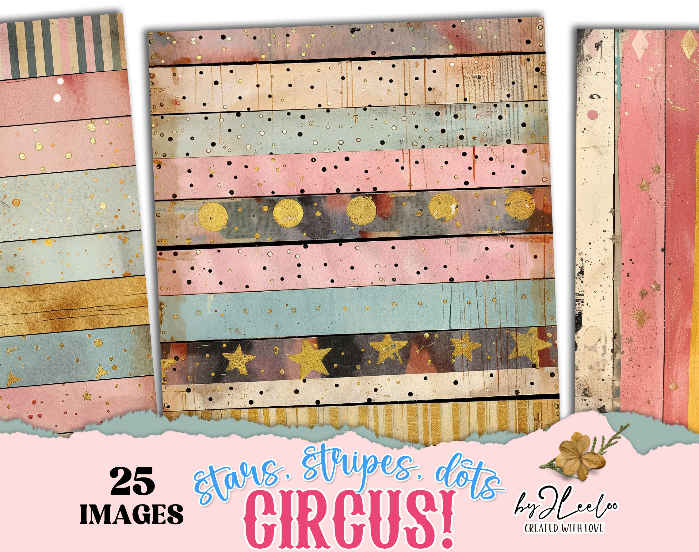 โจ Hey there, fellow creative spirit! Immerse yourself in nostalgia with our collection of charmingly aged papers. Featuring a mix of horizontal and vertical strips adorned with glitter patterns, muted pastel colors, diamond shapes, and faded gold stars, our designs evoke a vintage circus allure. Perfect for crafting enchanting scrapbooks, junk journals, and promotional materials inspired by old circus posters. Let the magic of these retro-inspired textures transform your projects! ๐ซ