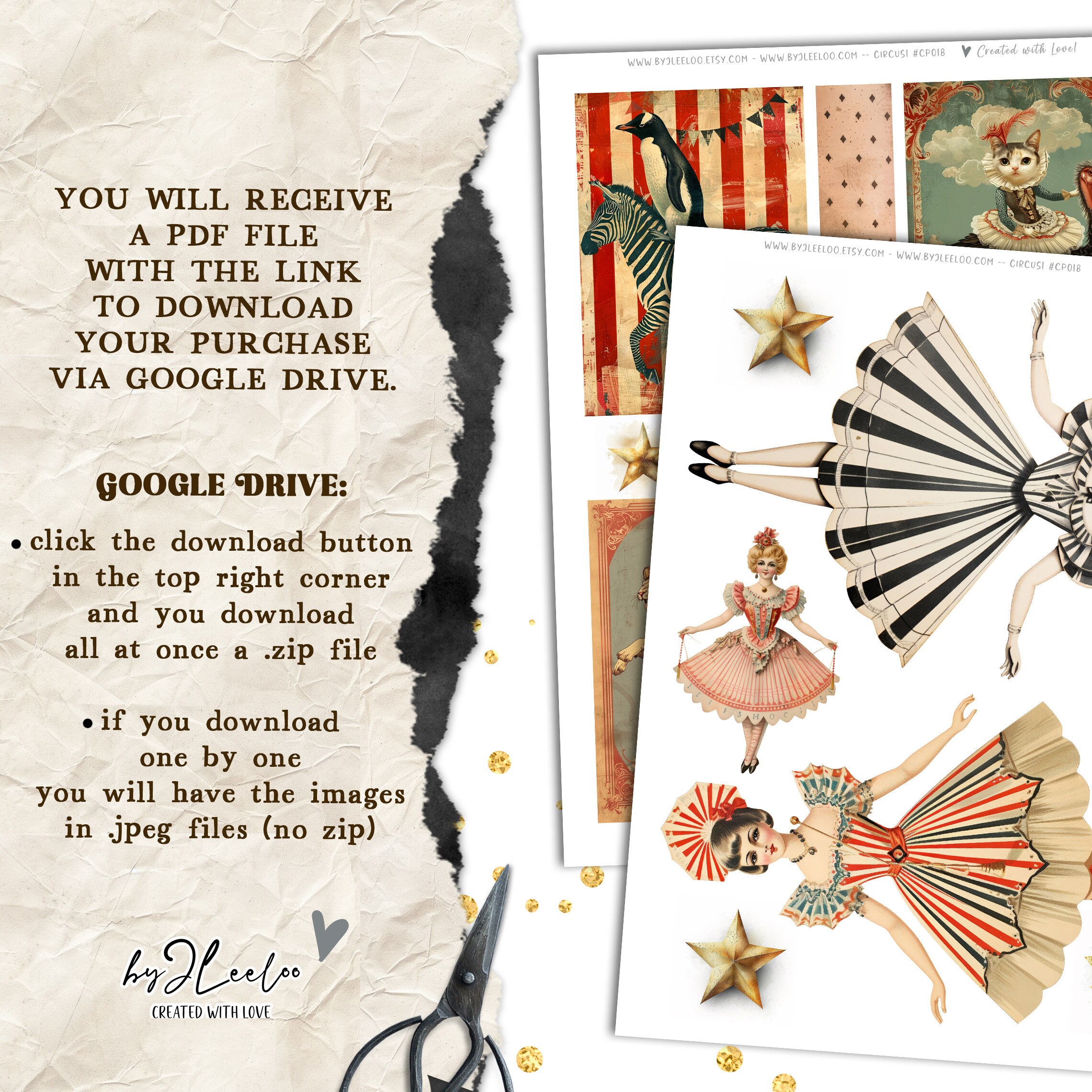 Dive into the magical world of vintage circuses with this delightful collection! Whether you’re working on junk journals, scrapbooking, or any paper craft, these digital sheets are perfect for adding a touch of nostalgia and whimsy. Some pages feature full illustrations, while others are packed with multiple images, including vintage circus photos, tickets, watercolor paintings of circus animals and performers, drawings of clowns, antique circus-themed stamps, and classic circus posters. Let your creativity soar as you mix and match these charming elements to create unique and enchanting projects!"