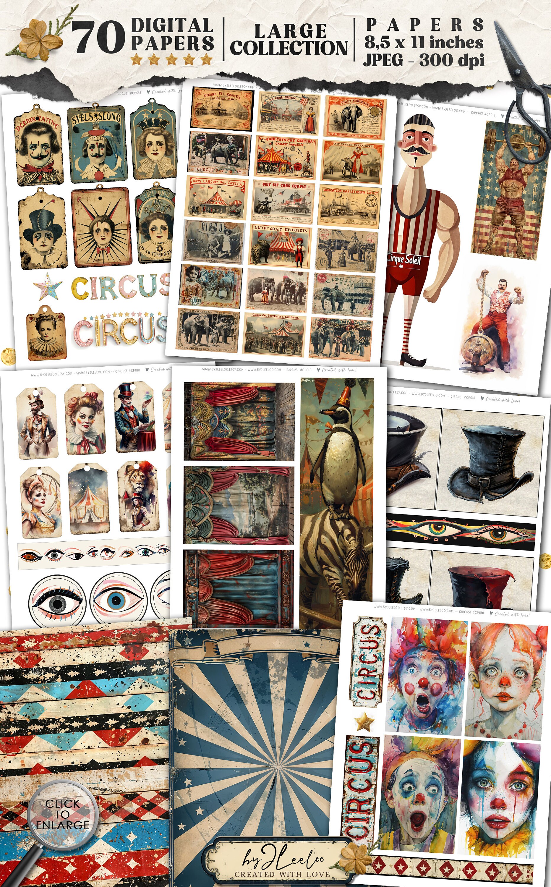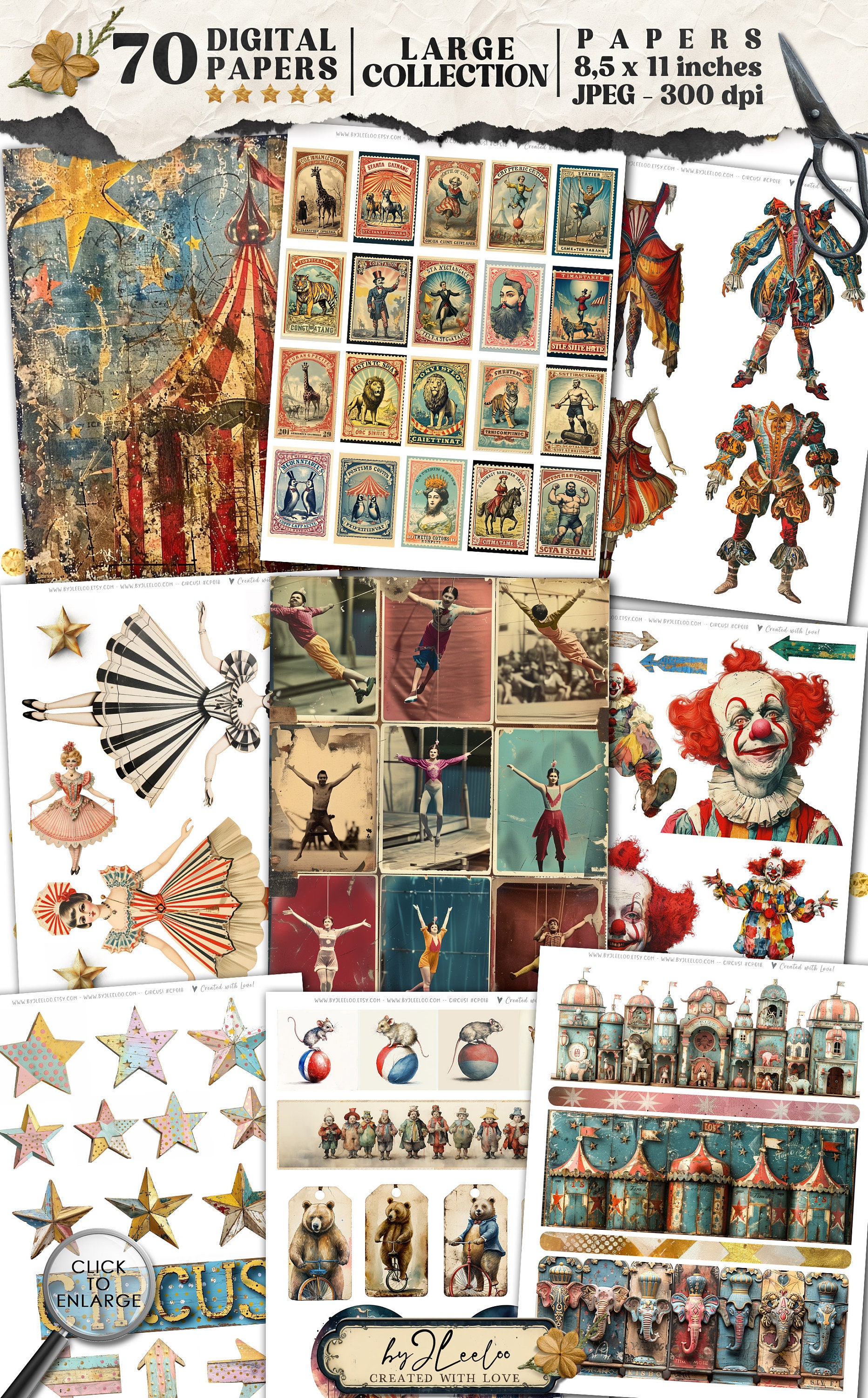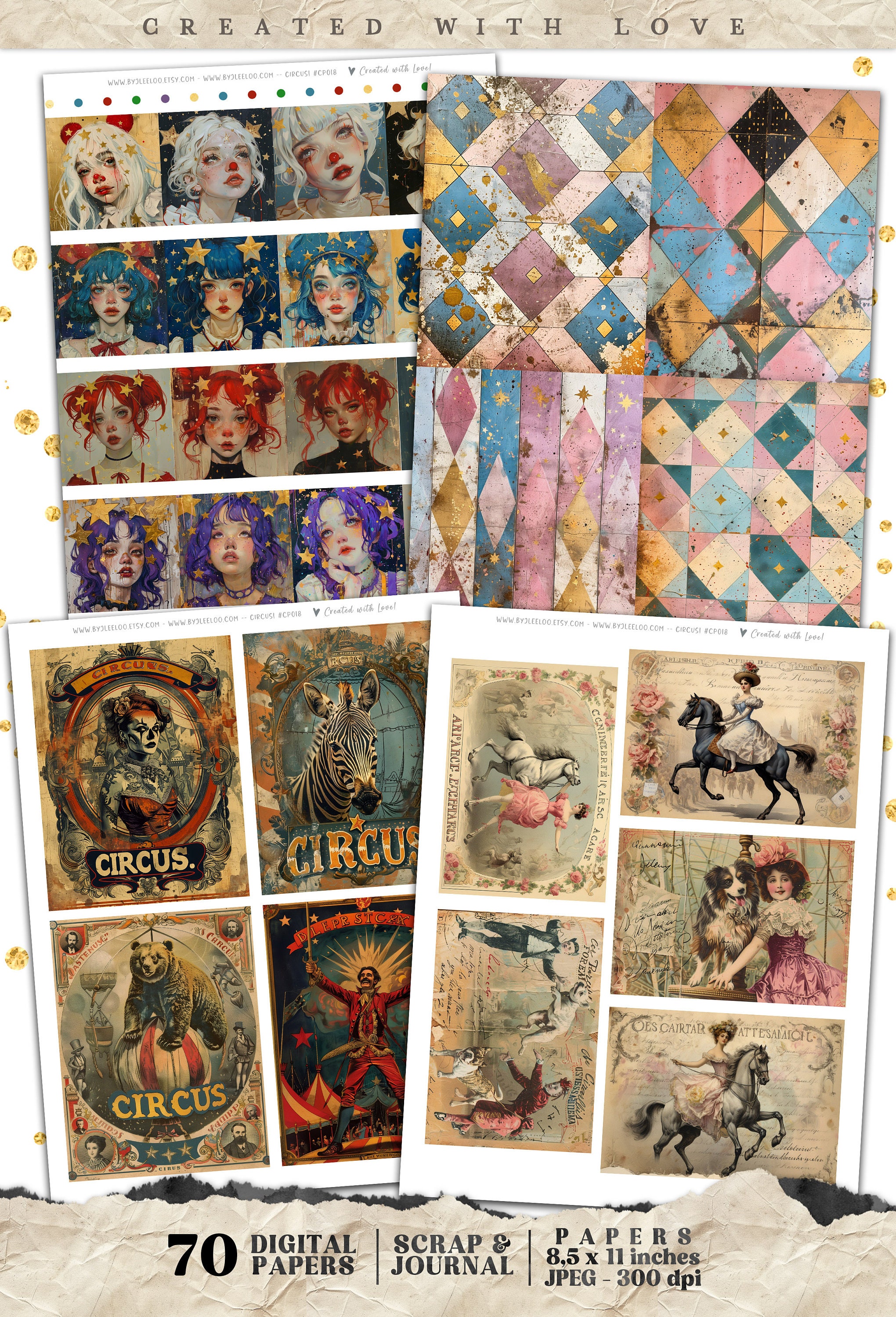CIRCUS 70 Digital Papers Printable | Large Collection for Mixed Media Junk Journals Collage Digital Art Scrapbook Papercraft | cp018