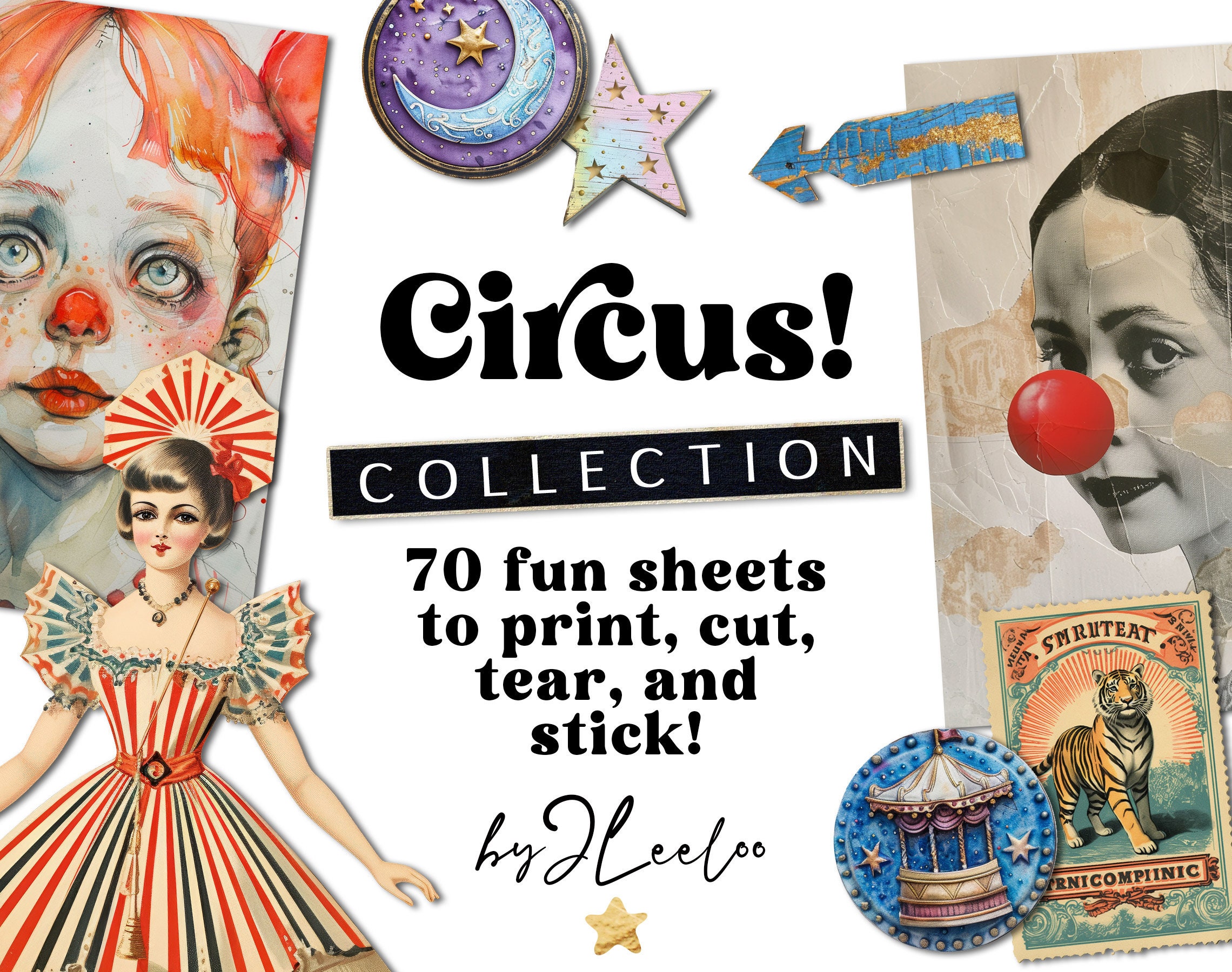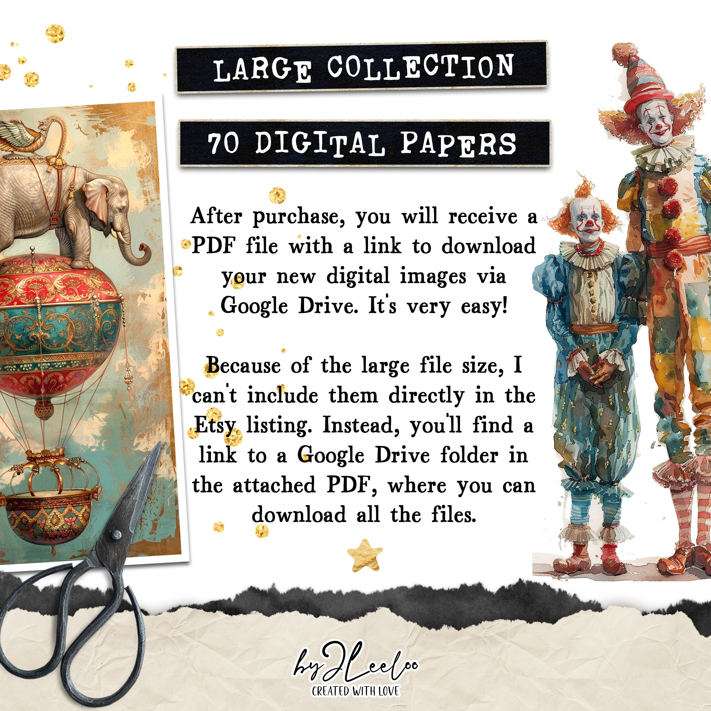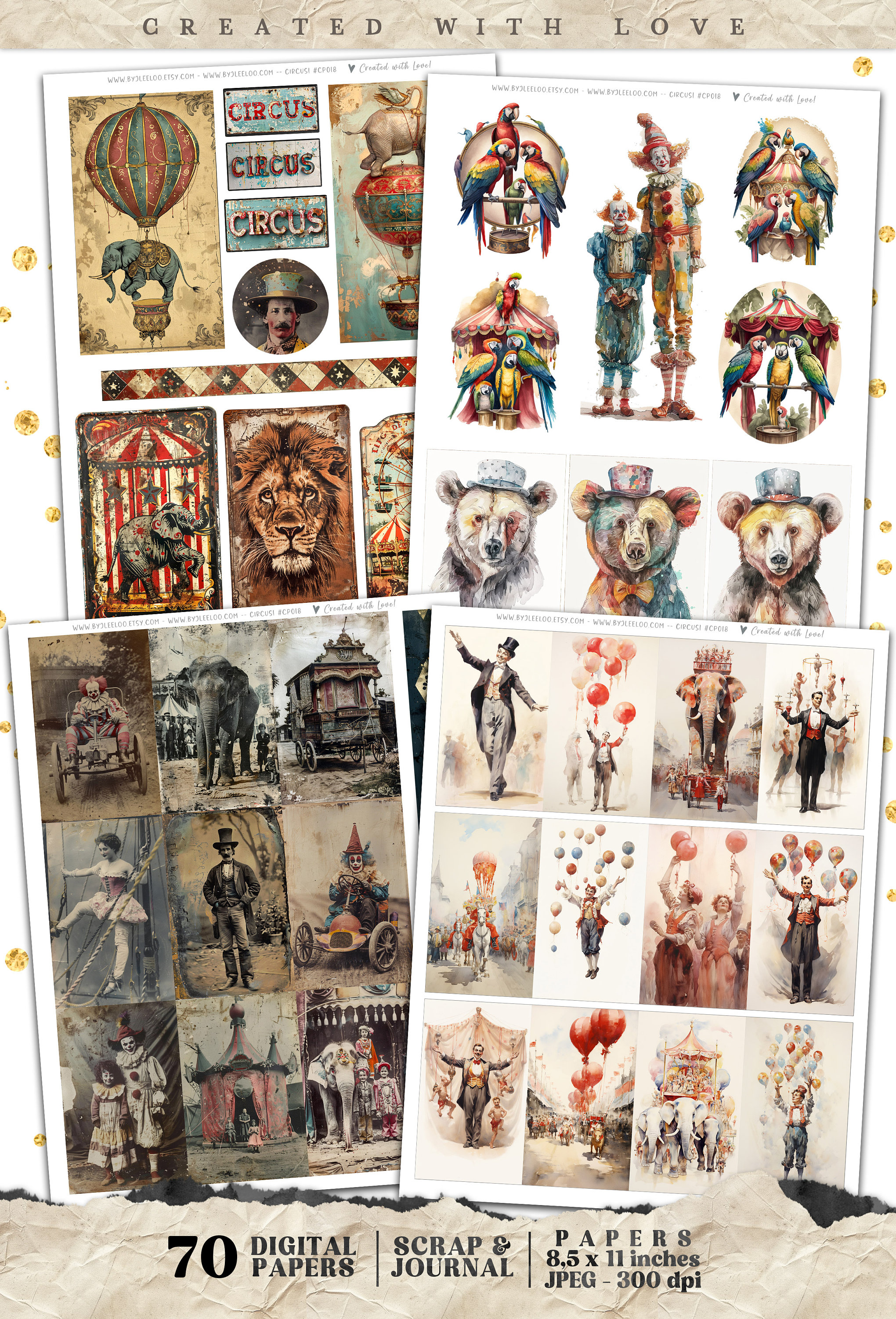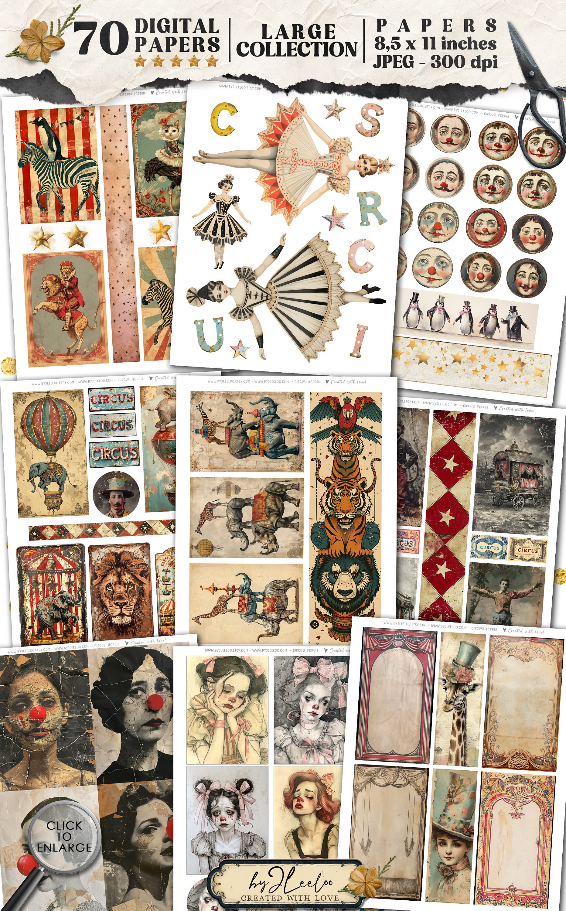 CIRCUS 70 Digital Papers Printable | Large Collection for Mixed Media Junk Journals Collage Digital Art Scrapbook Papercraft | cp018