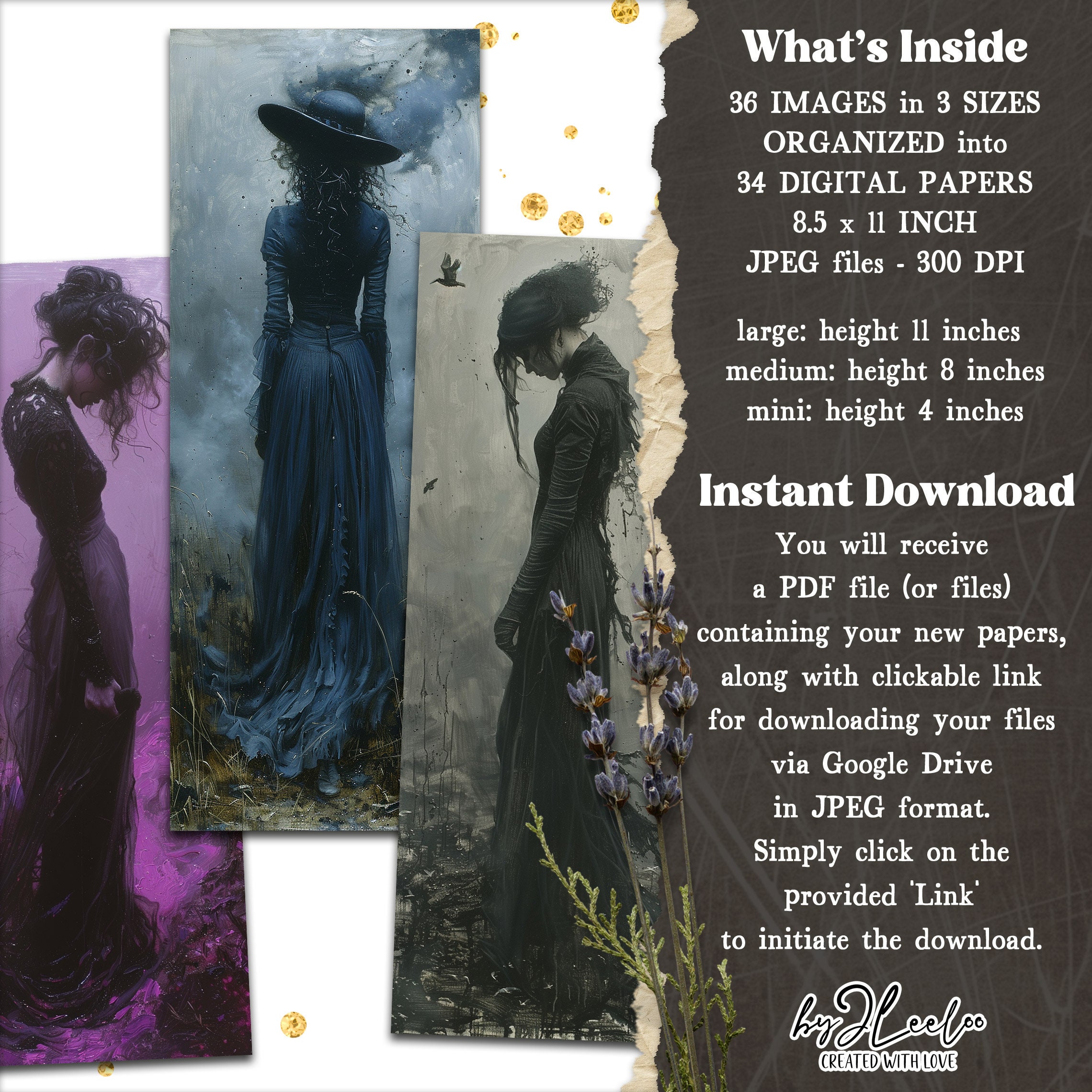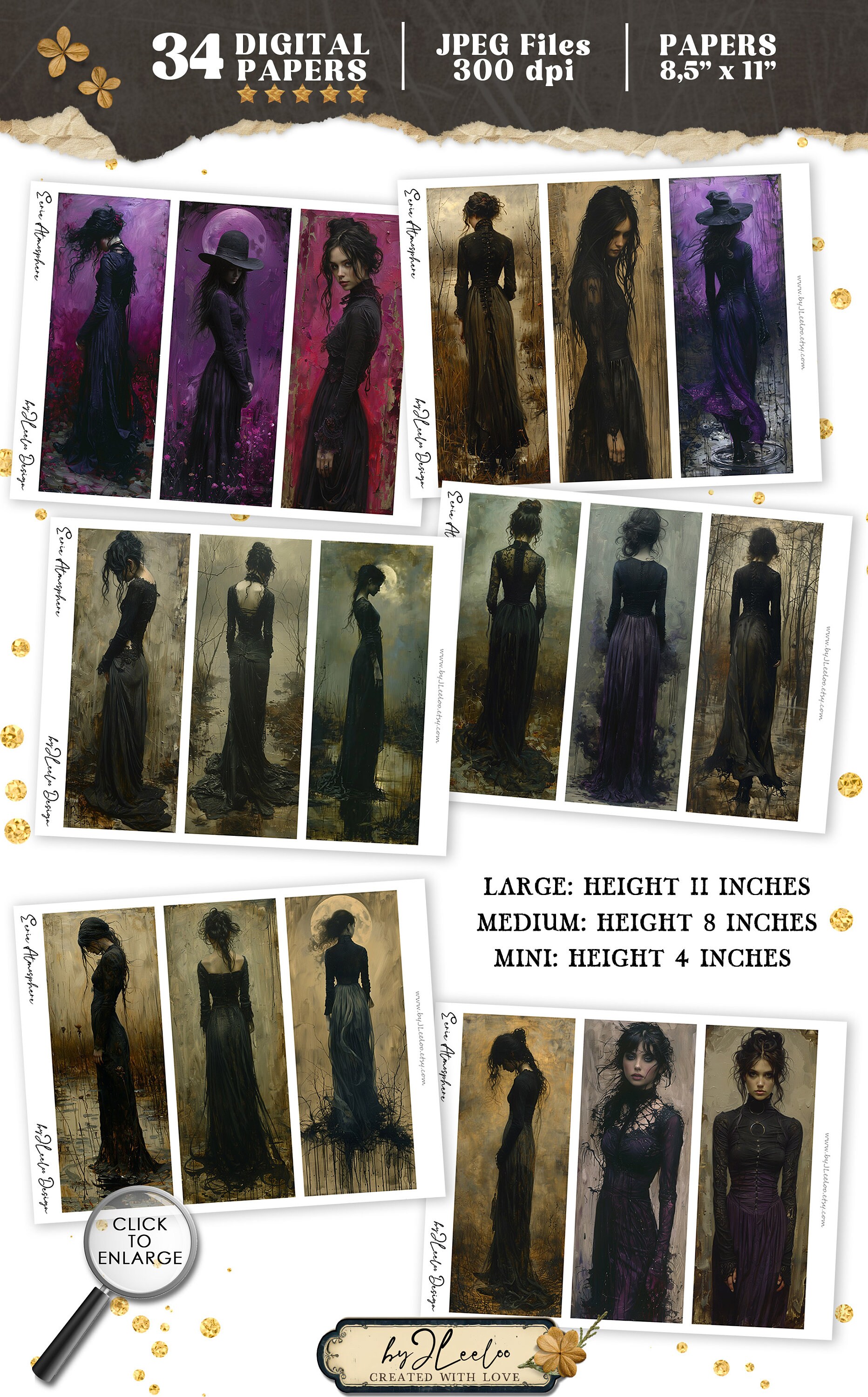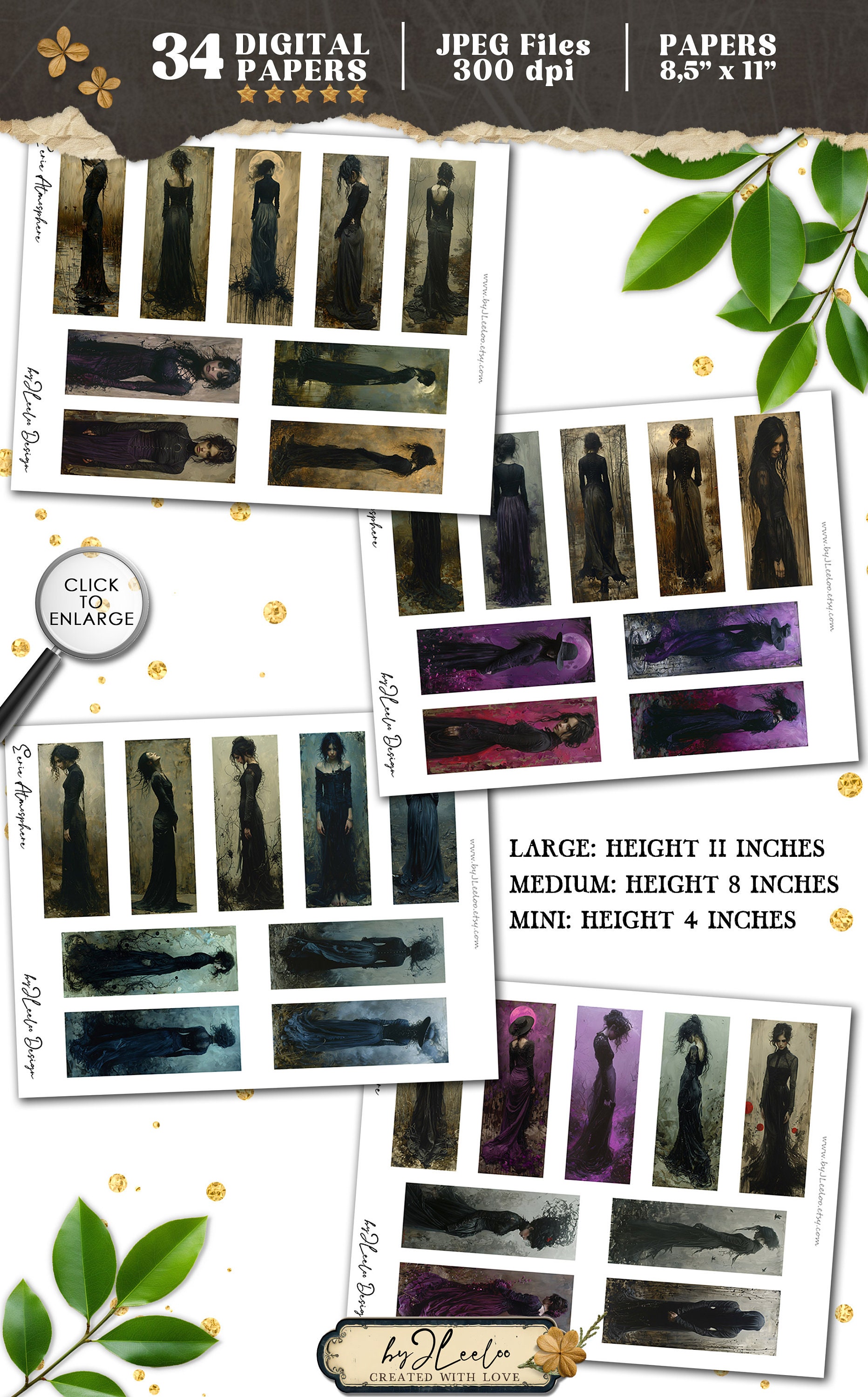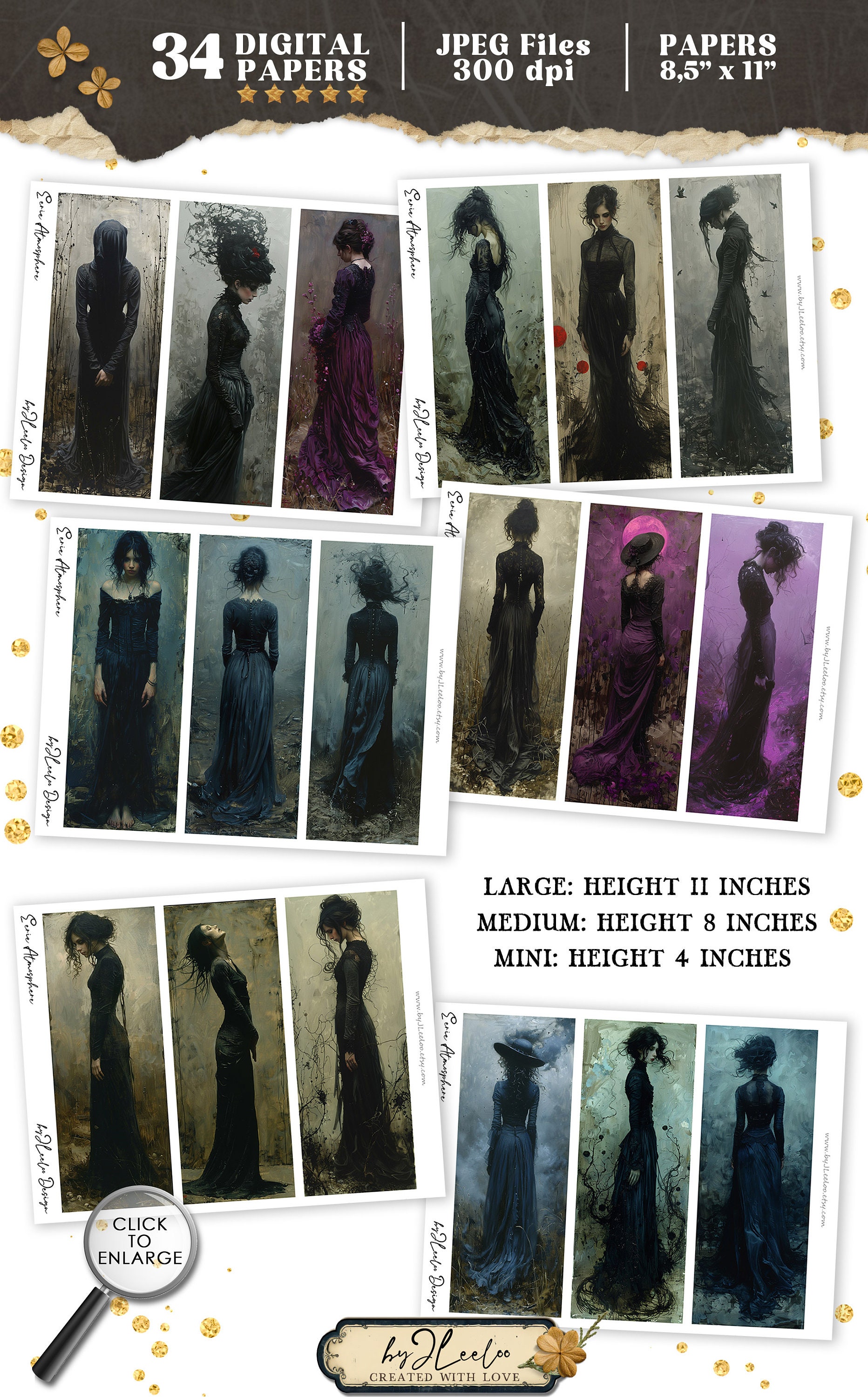 EERIE ATMOSPHERE gothic tall bookmarks 3 sizes | Creepy Halloween characters antique victorian lady paper craft tag junk journal CU | pp814