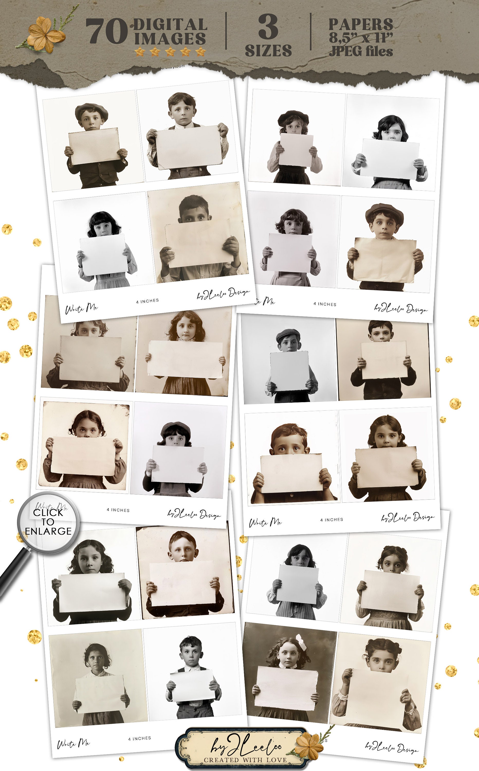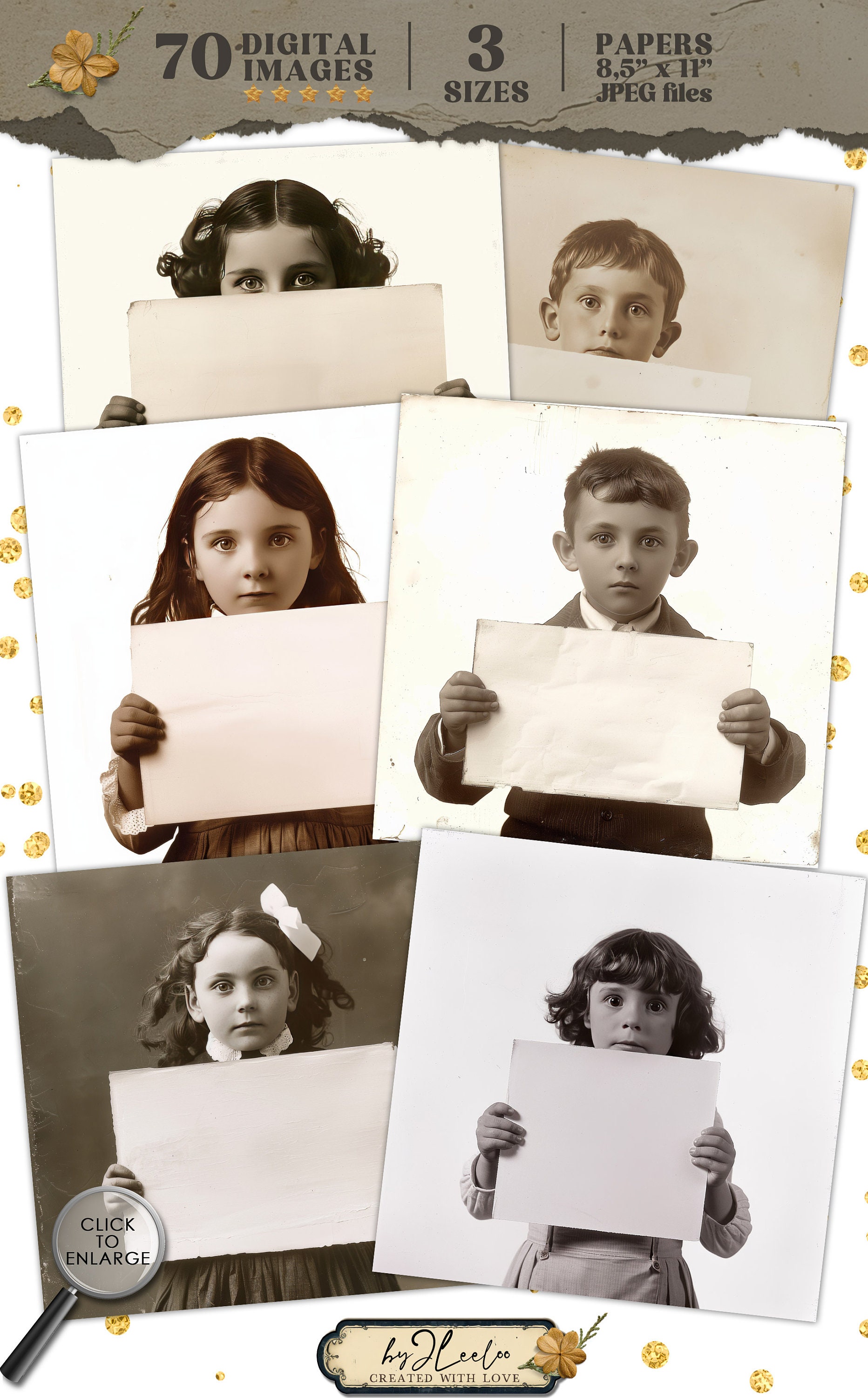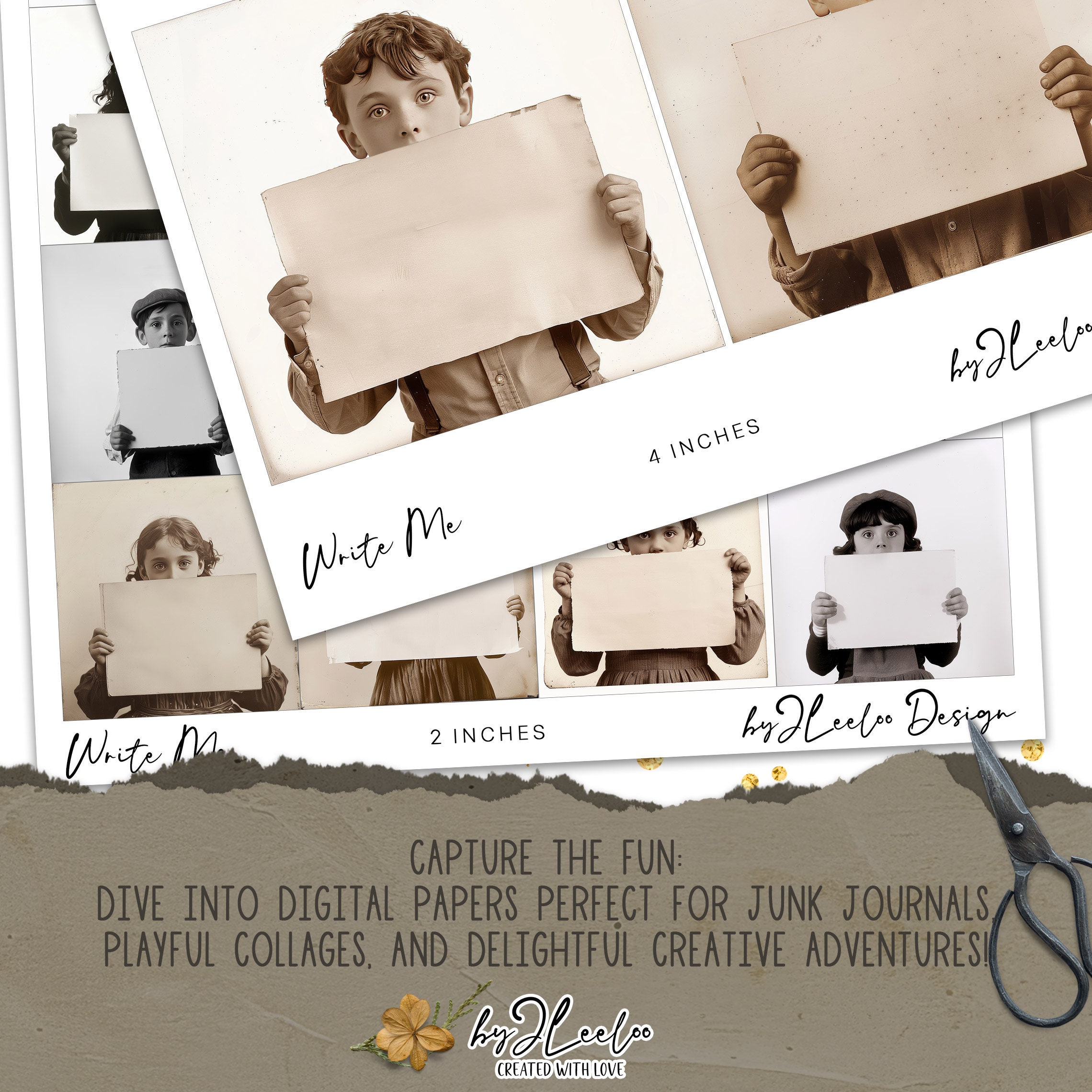 Welcome to our delightful collection of vintage photos featuring charming children holding blank signs! Each photo captures a unique moment, with some kids holding the sign low, some right in front of their faces, and others peeking just their eyes above. These nostalgic images, in classic black-and-white or sepia tones, come in three square sizes: 8x8 inches, 4x4 inches, and 2x2 inches.