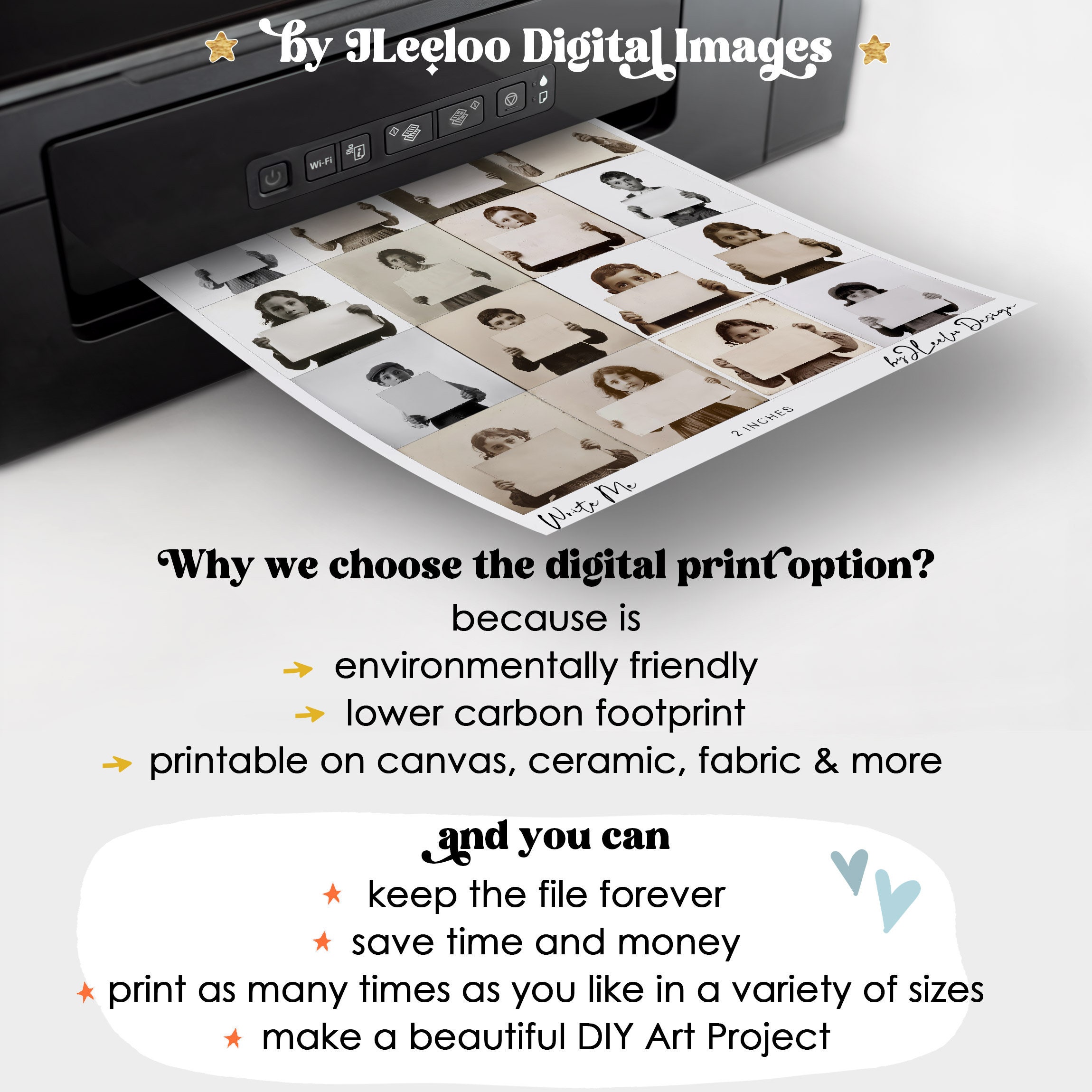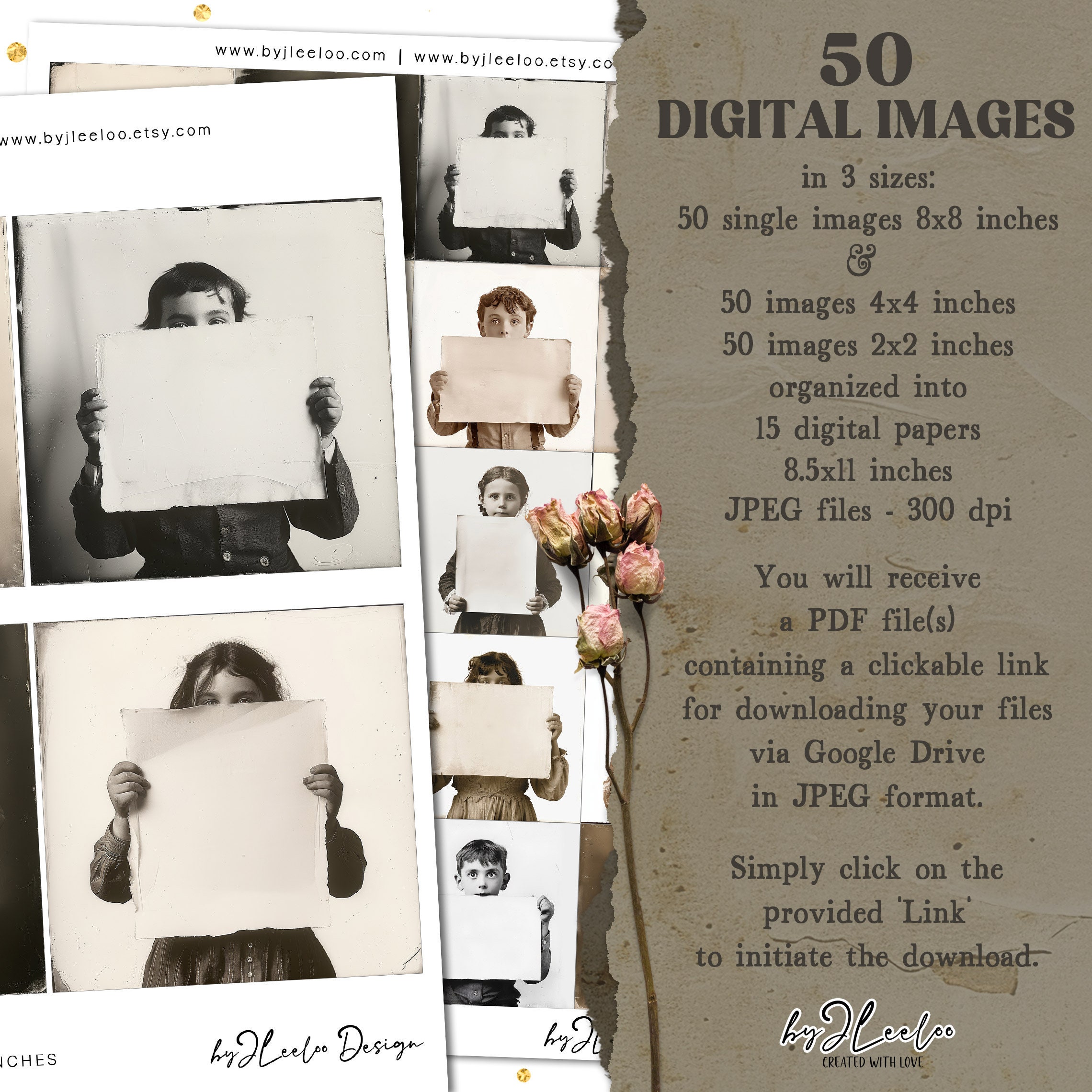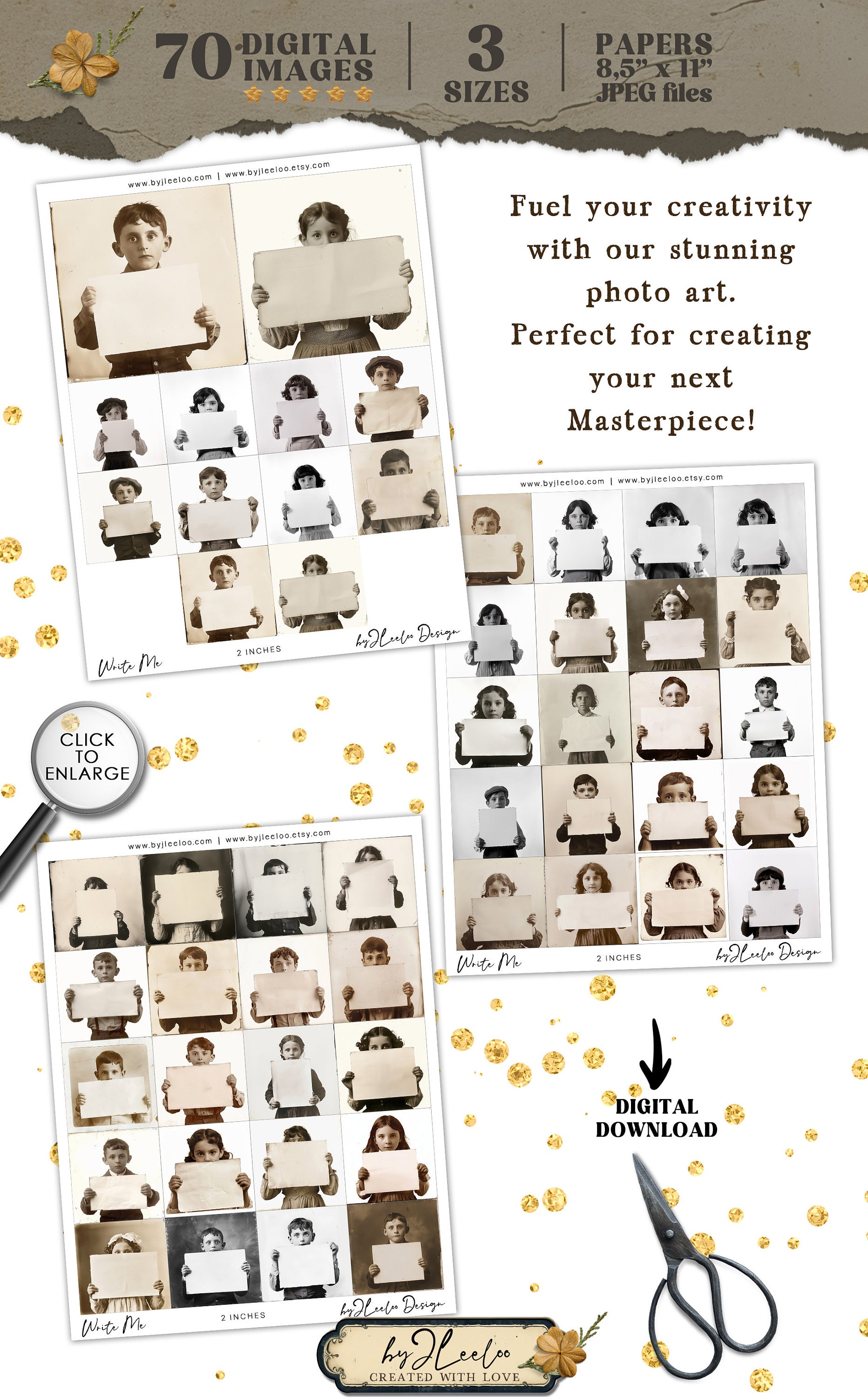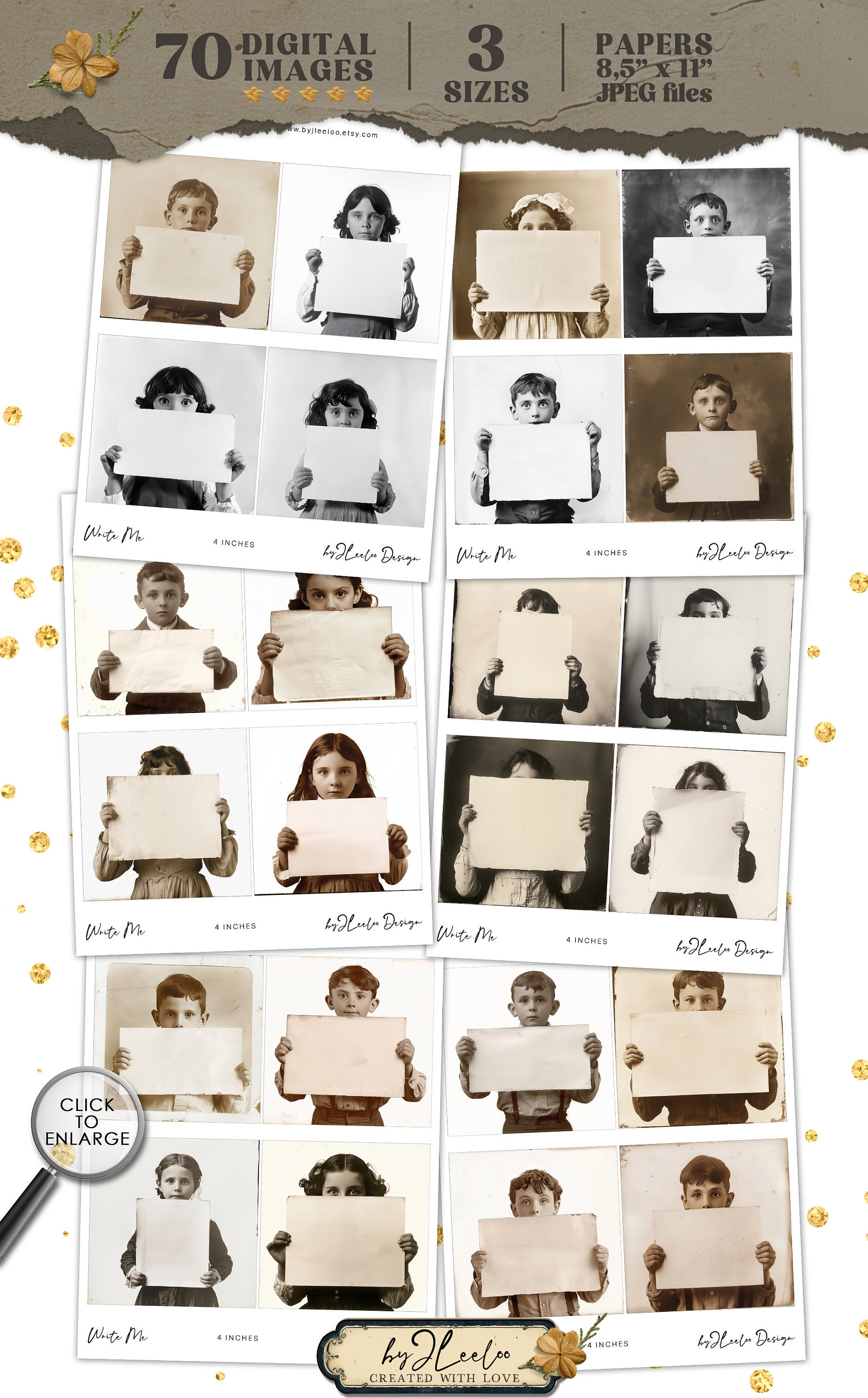 Welcome to our delightful collection of vintage photos featuring charming children holding blank signs! Each photo captures a unique moment, with some kids holding the sign low, some right in front of their faces, and others peeking just their eyes above. These nostalgic images, in classic black-and-white or sepia tones, come in three square sizes: 8x8 inches, 4x4 inches, and 2x2 inches.