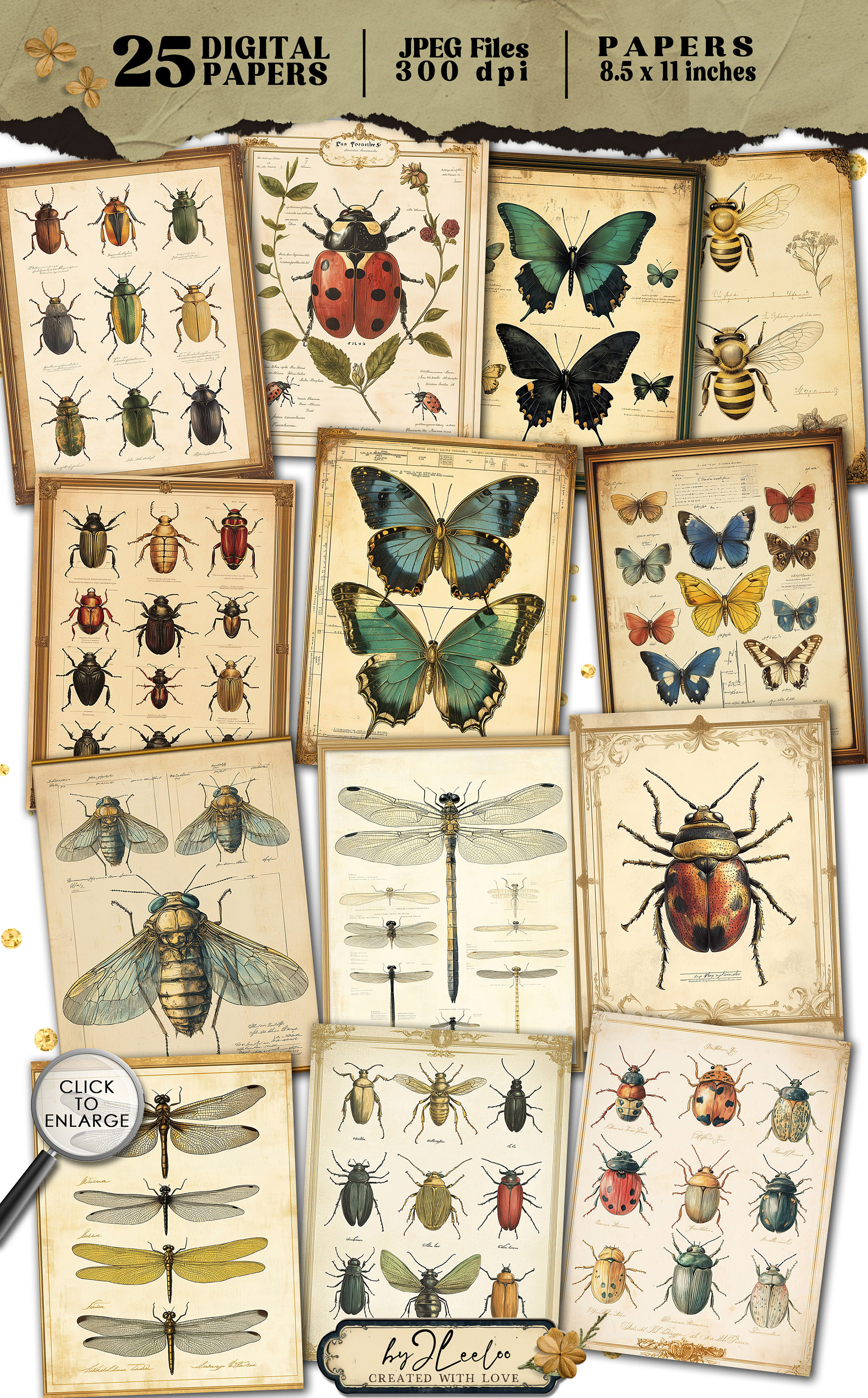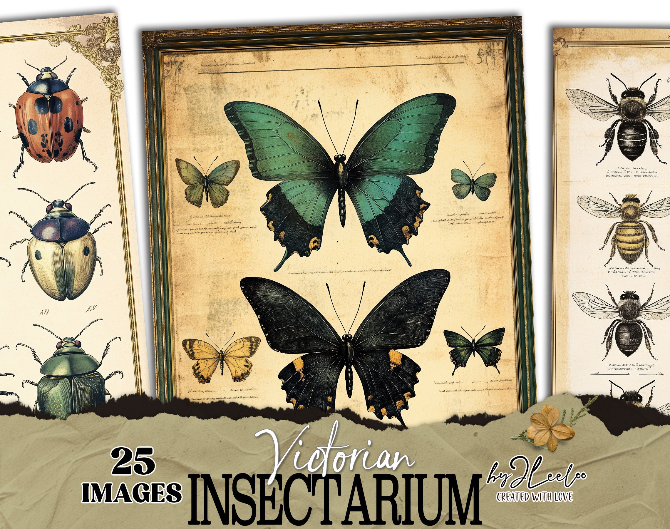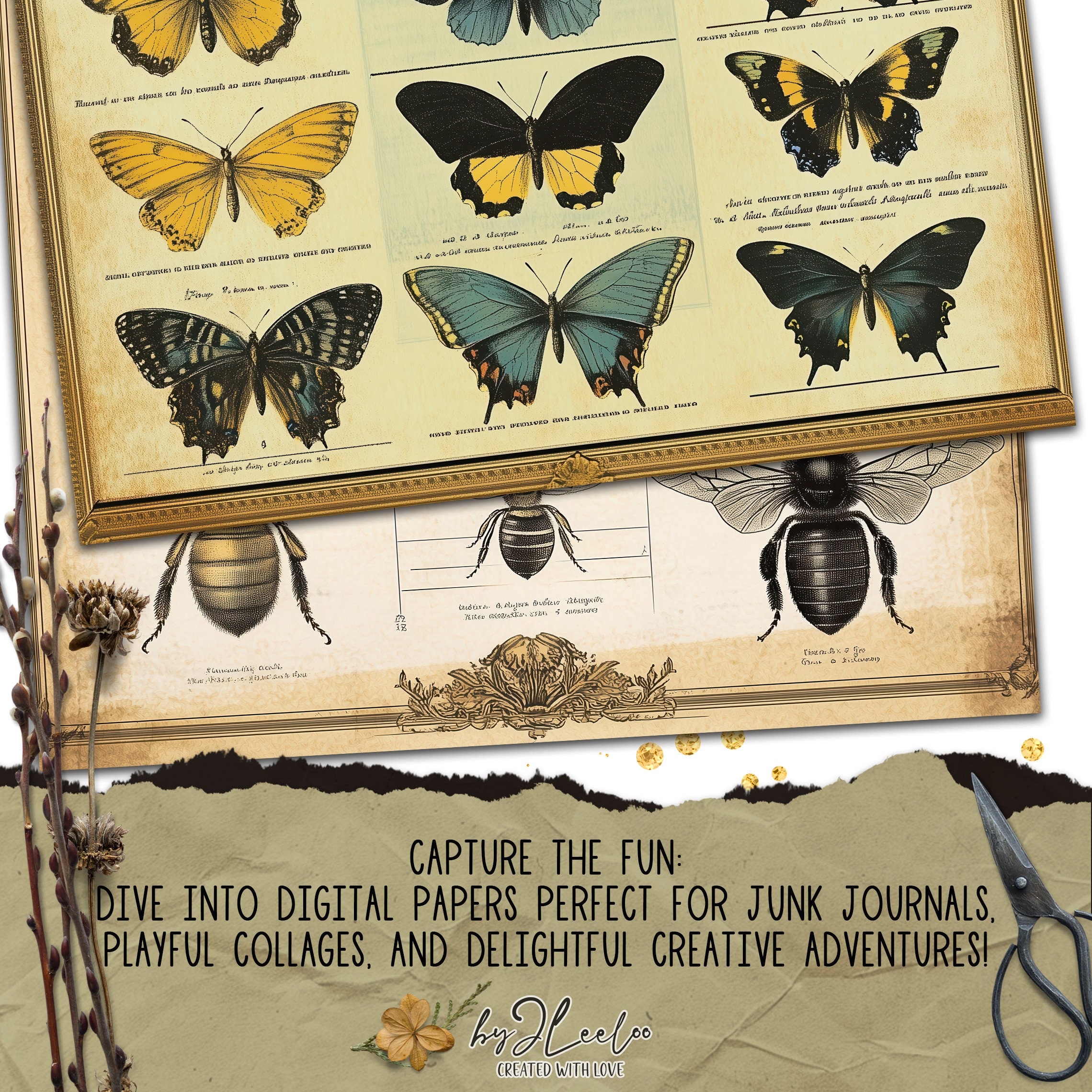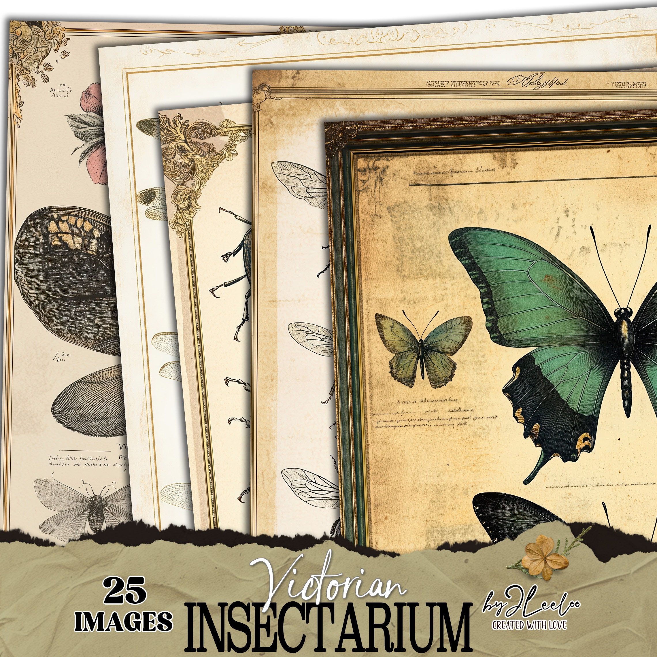 VICTORIAN INSECTARIUM vintage pages collage | Old naturalistic charts junk journal digital background Insect collection Mixed media | pp827