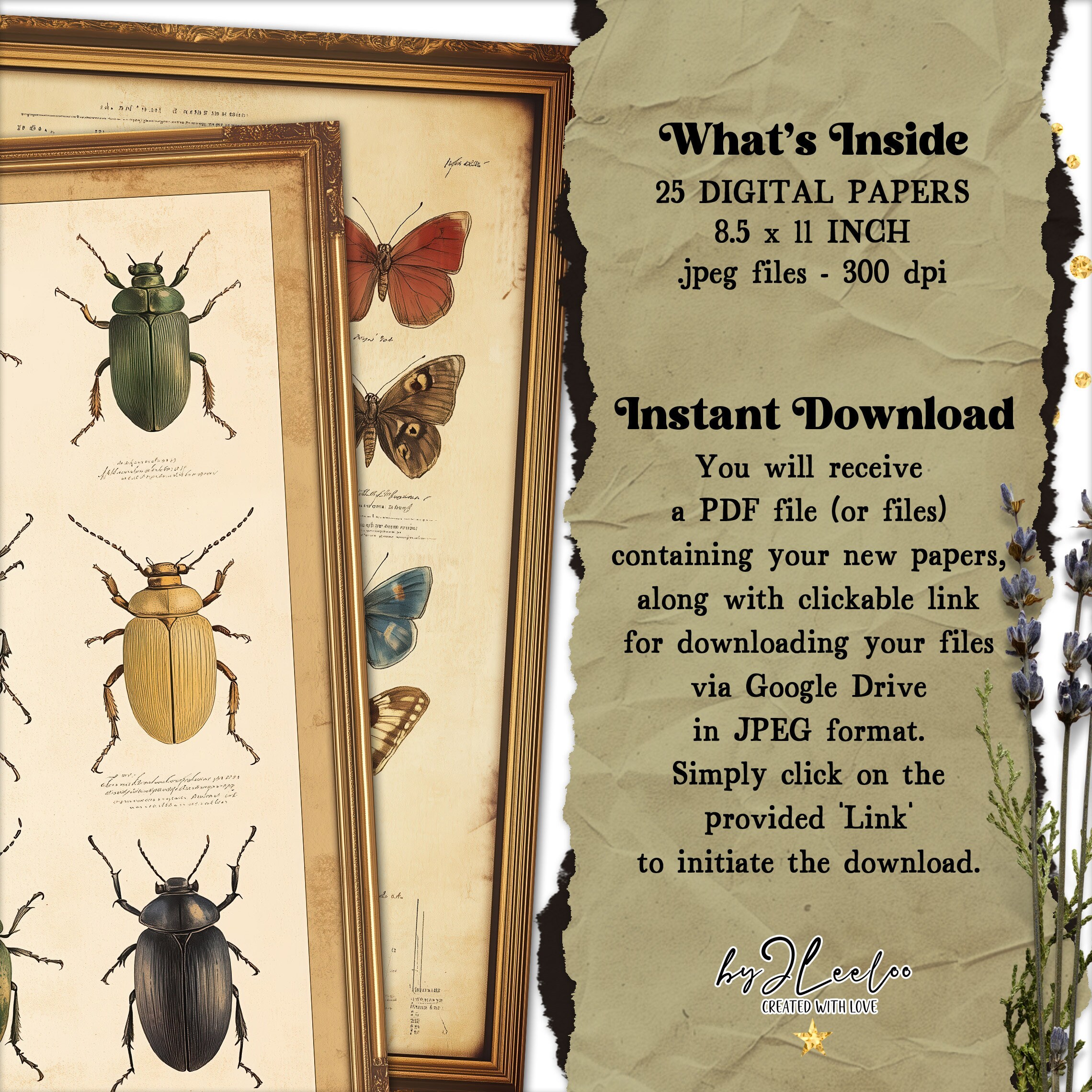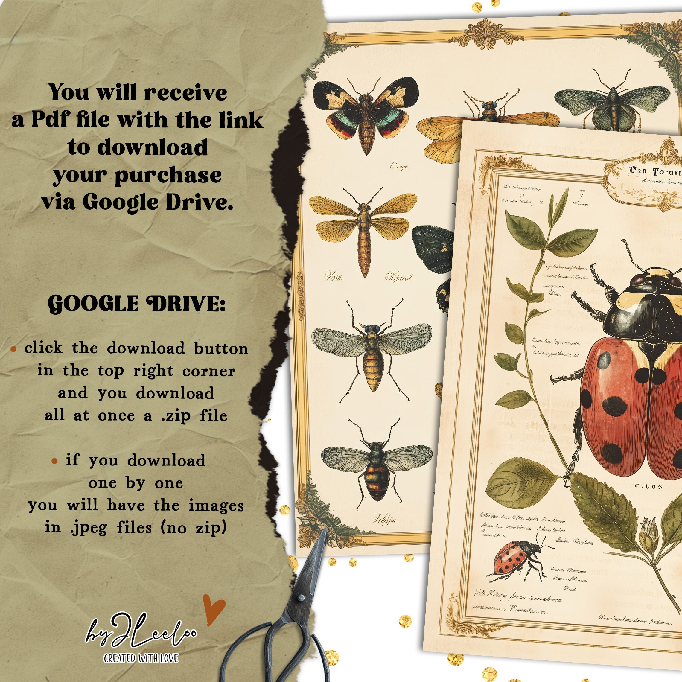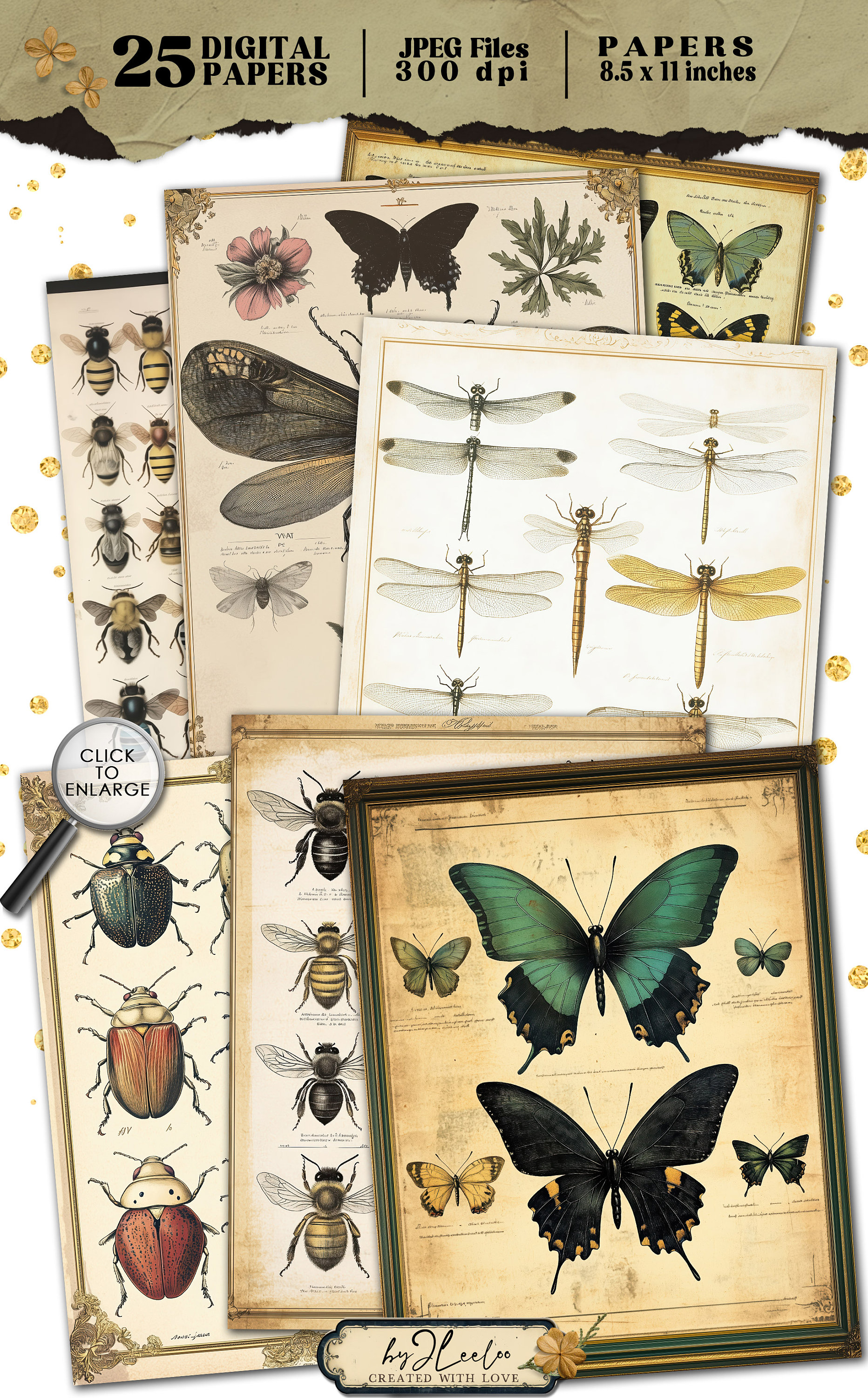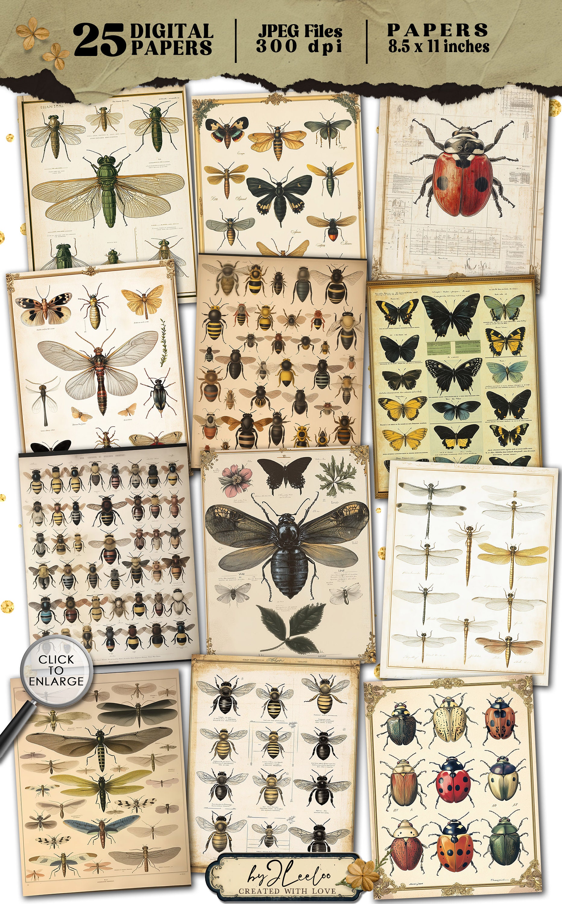 VICTORIAN INSECTARIUM vintage pages collage | Old naturalistic charts junk journal digital background Insect collection Mixed media | pp827