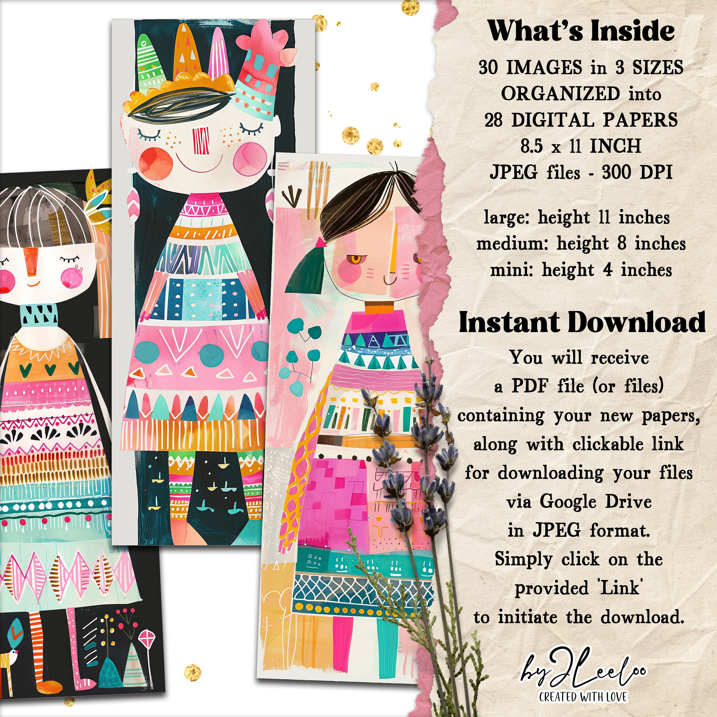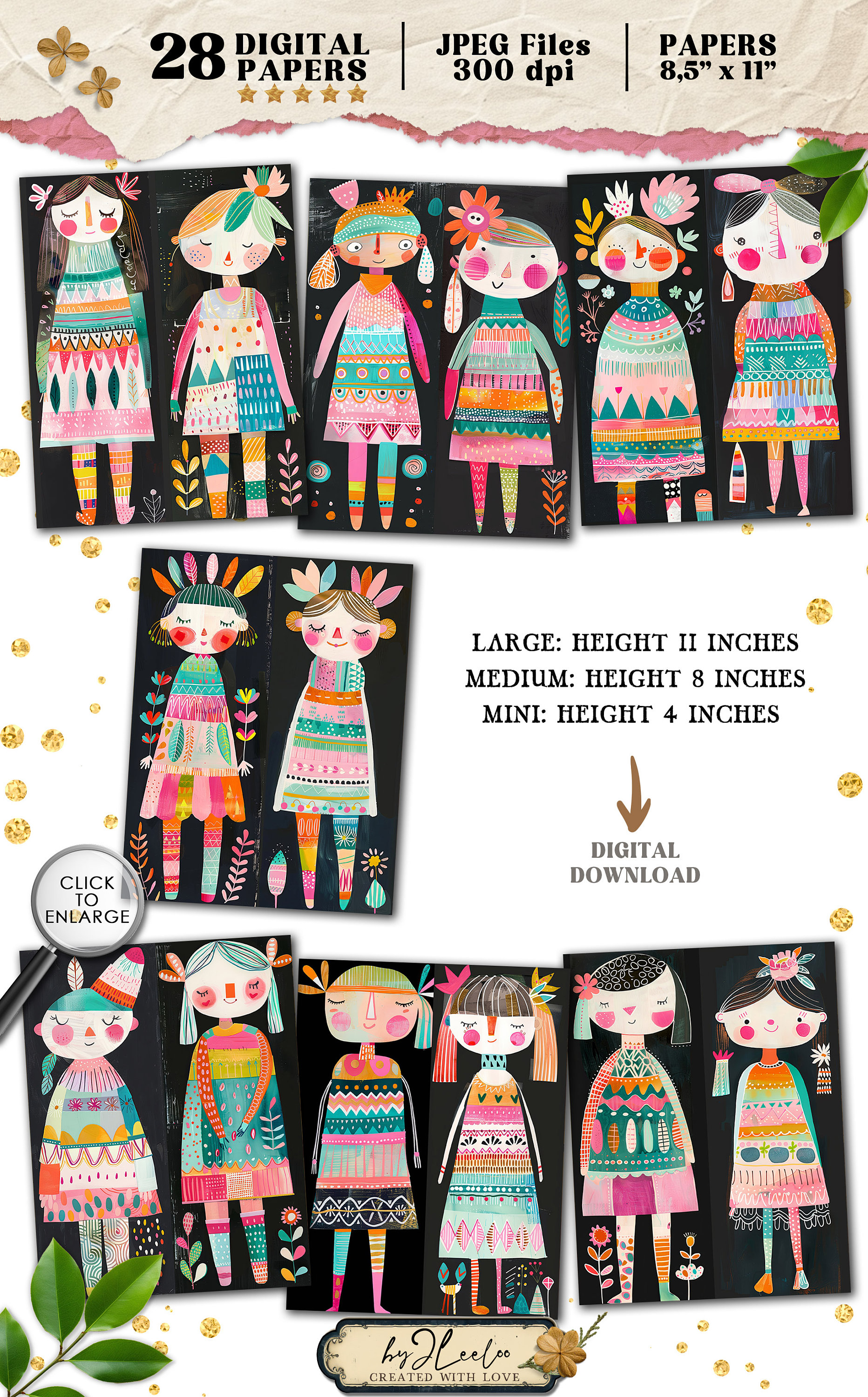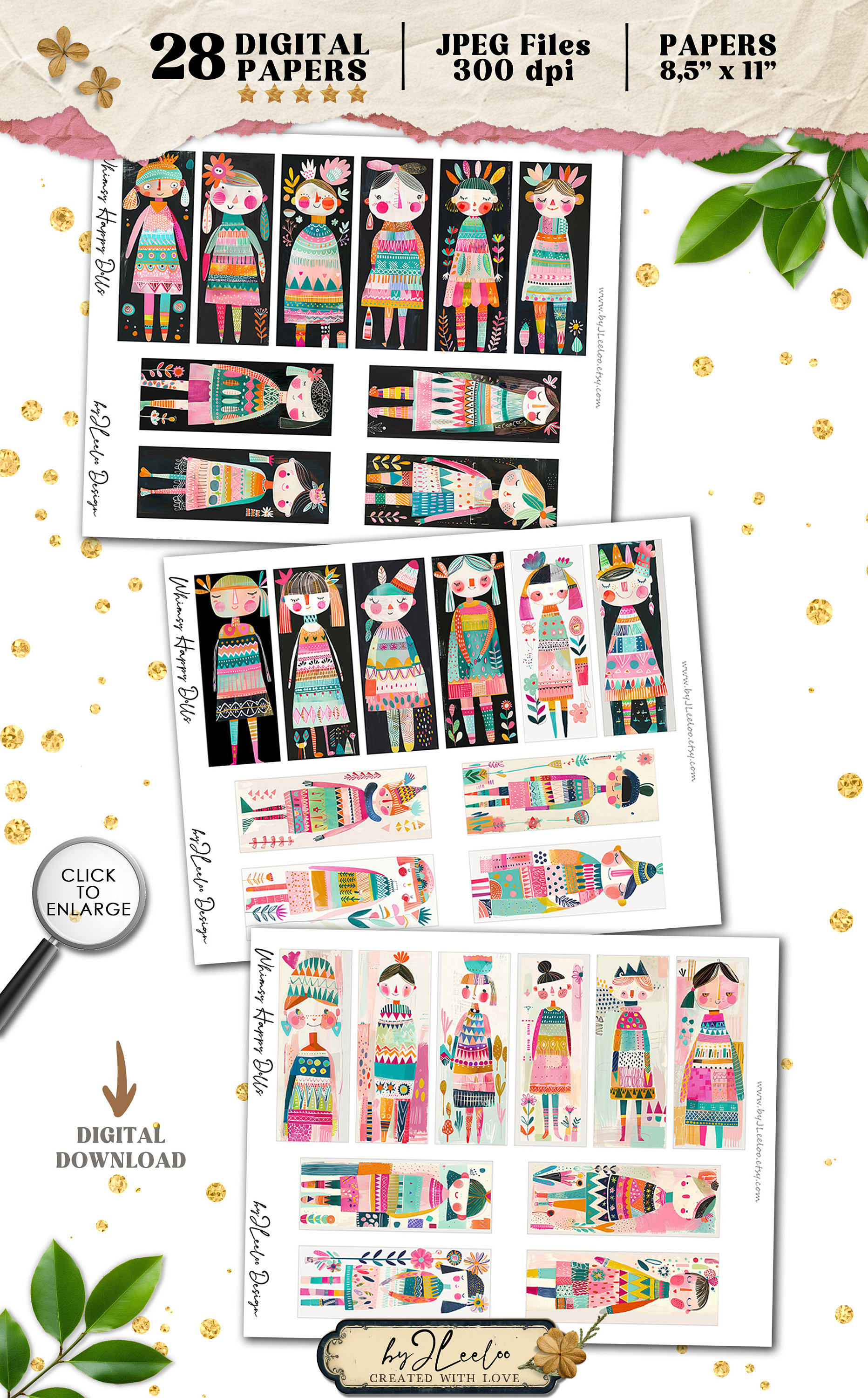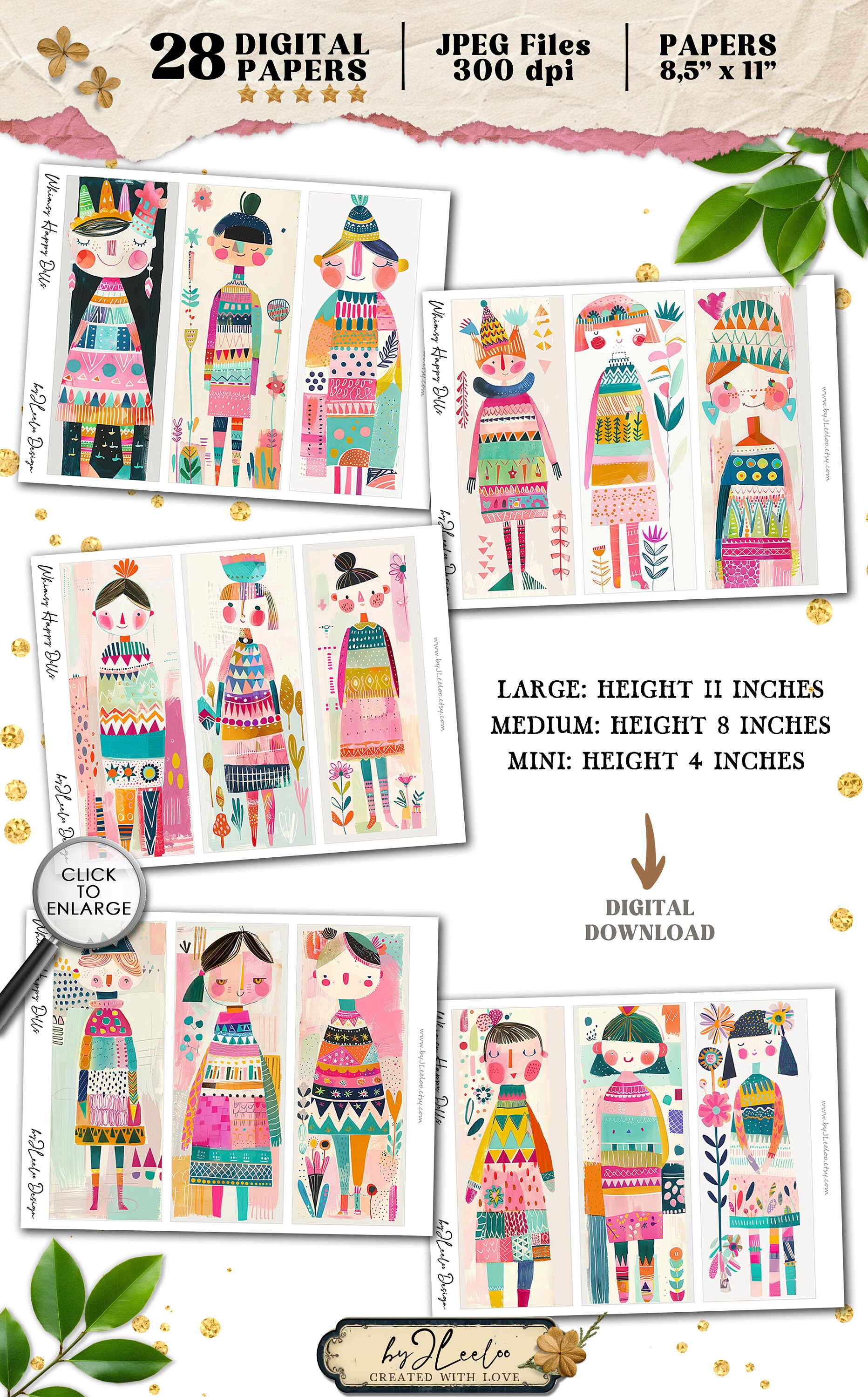 Whimsy HAPPY DOLLS tall bookmarks 3 sizes | Fancy characters paper doll hand-drawn mixed media children book | Digital Dowload CU | pp815