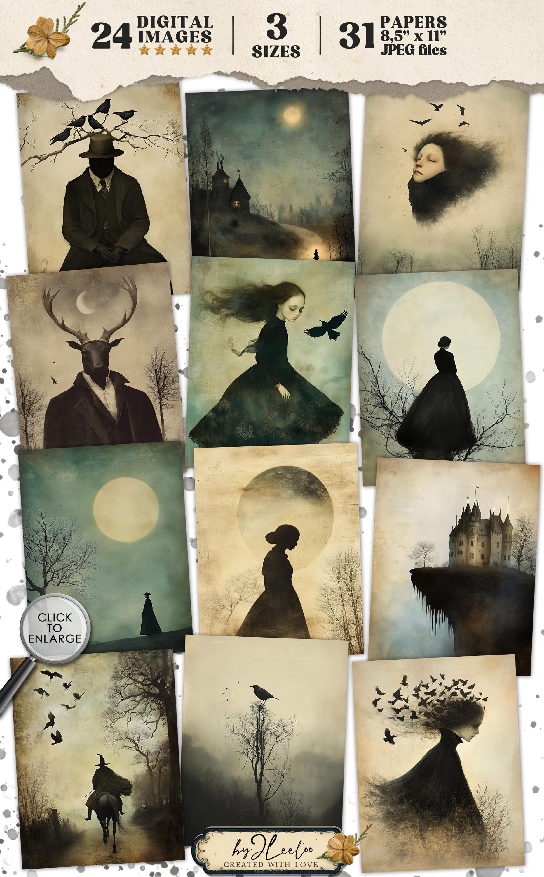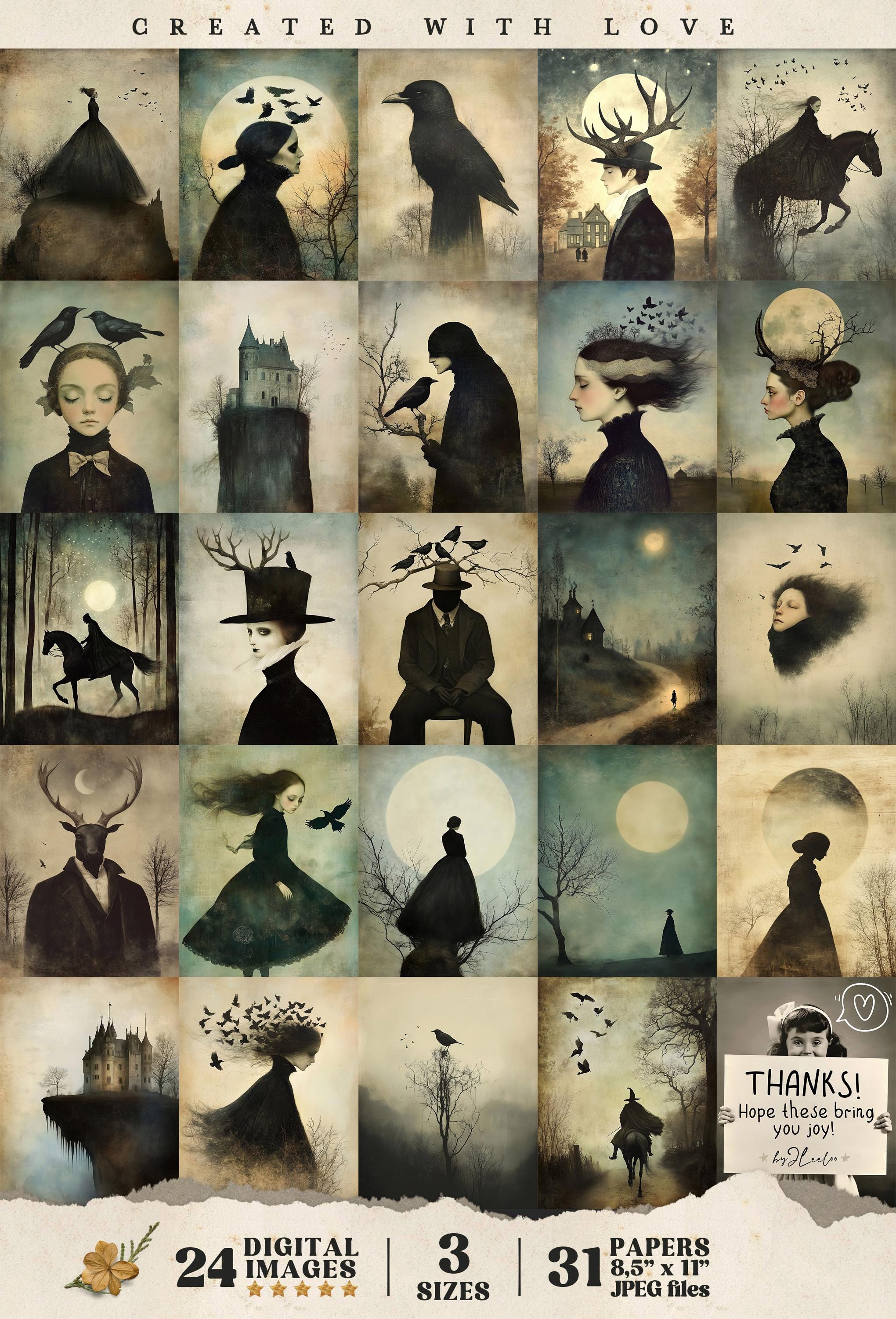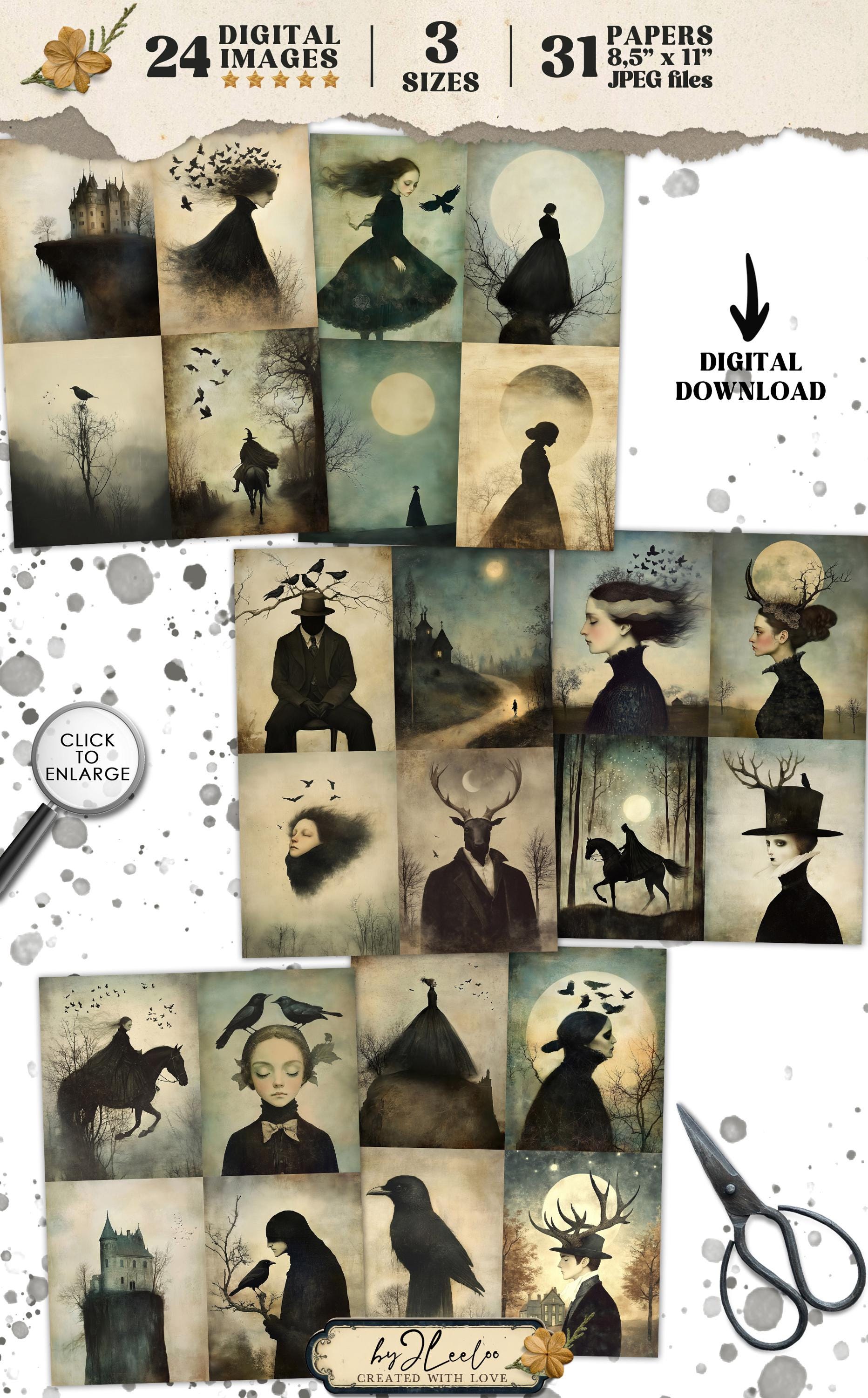 ๐ Enter the enchanting world of Sleepy Hollow with these captivating illustrations. Available in three sizes, these digital prints are perfect for adding a touch of gothic elegance to your Halloween decor or scrapbooking projects. Let the dark, obscure beauty of these Victorian-inspired artworks transform any space into a hauntingly beautiful realm. Ideal for wall art decoration or to embellish your junk journal with a touch of eerie charm. ๐ป