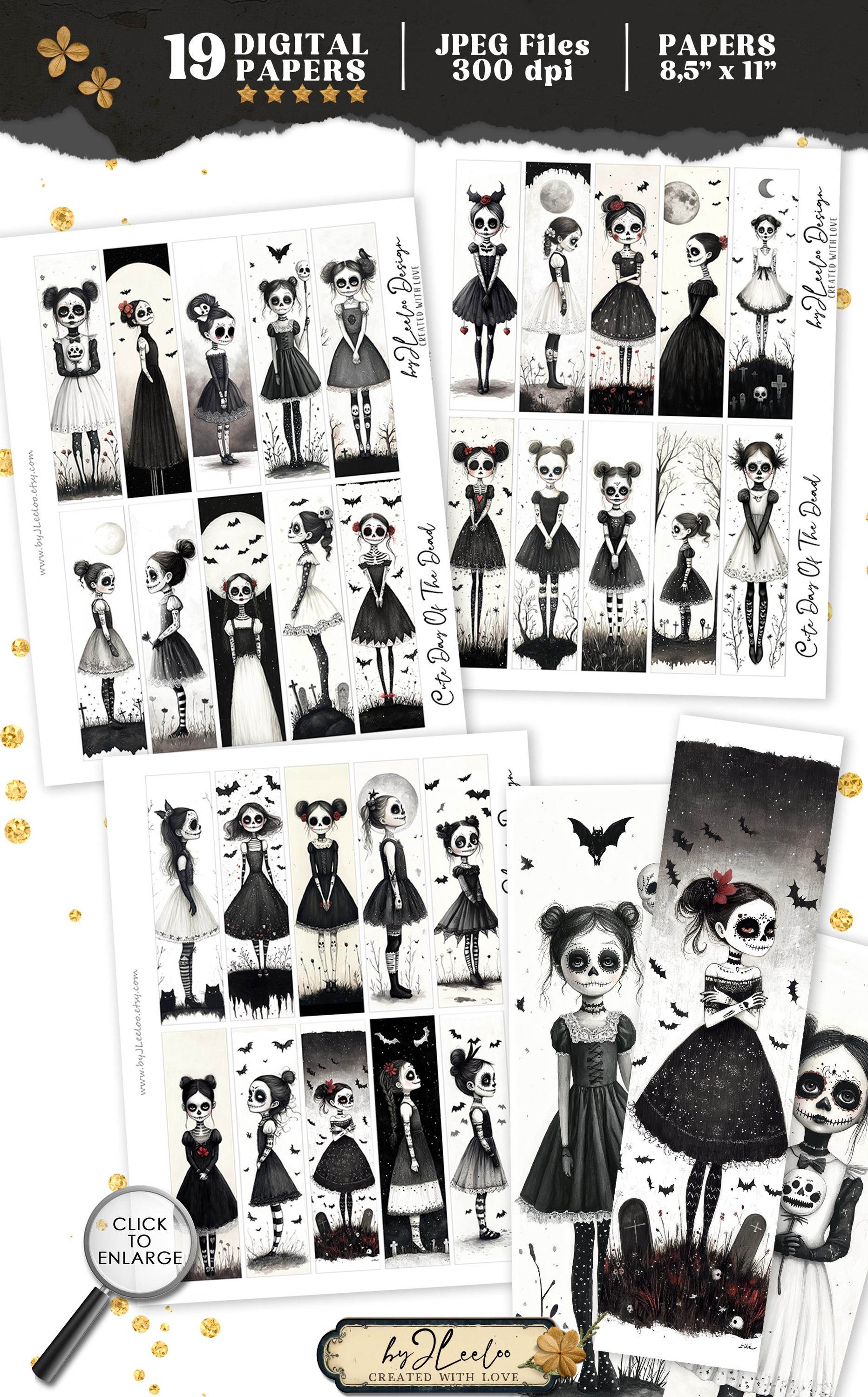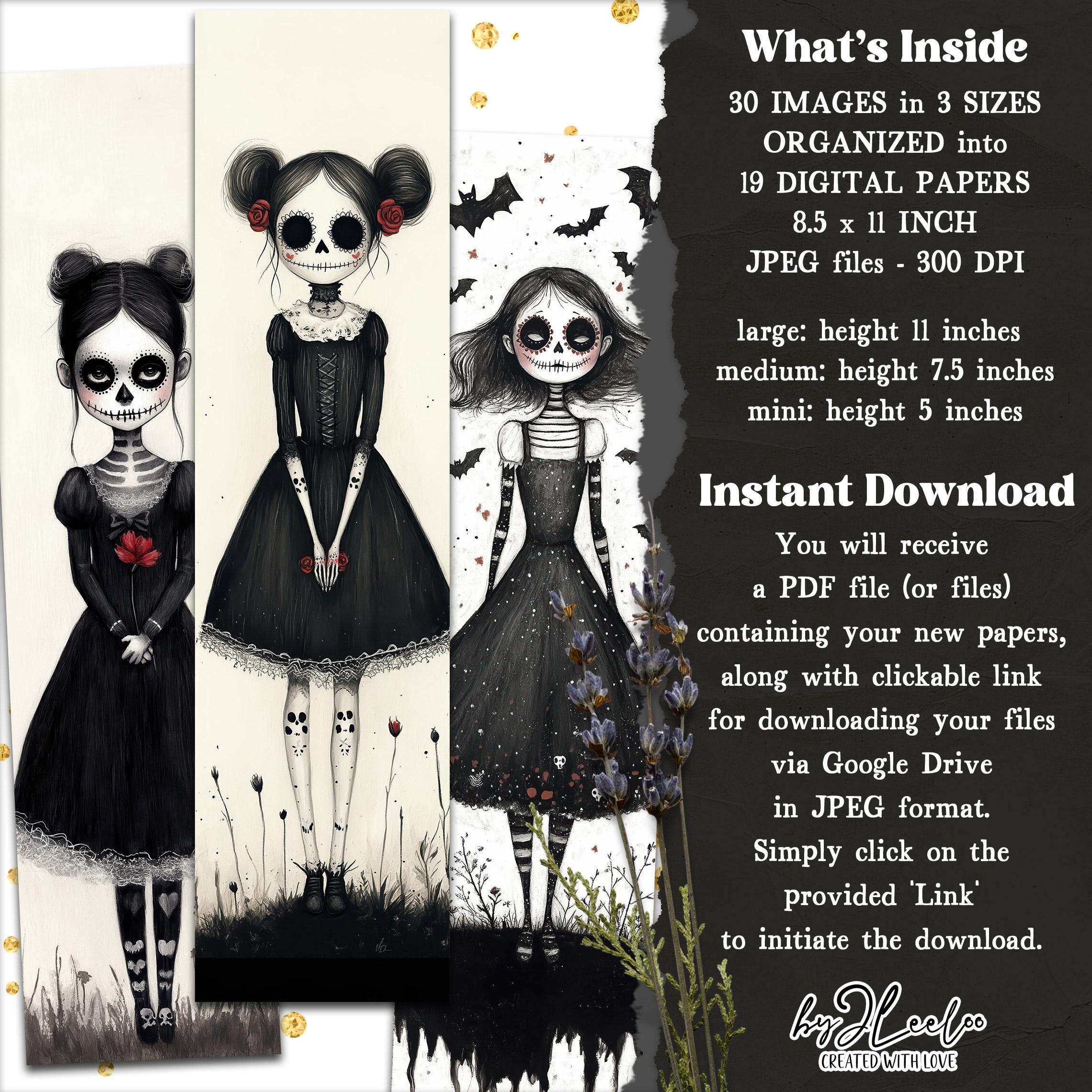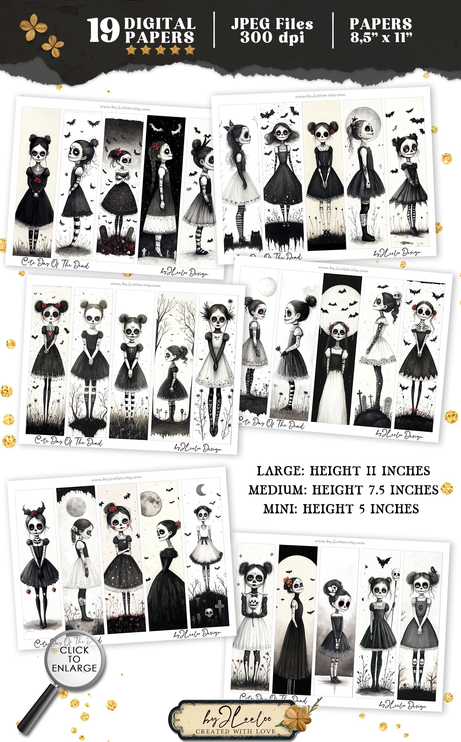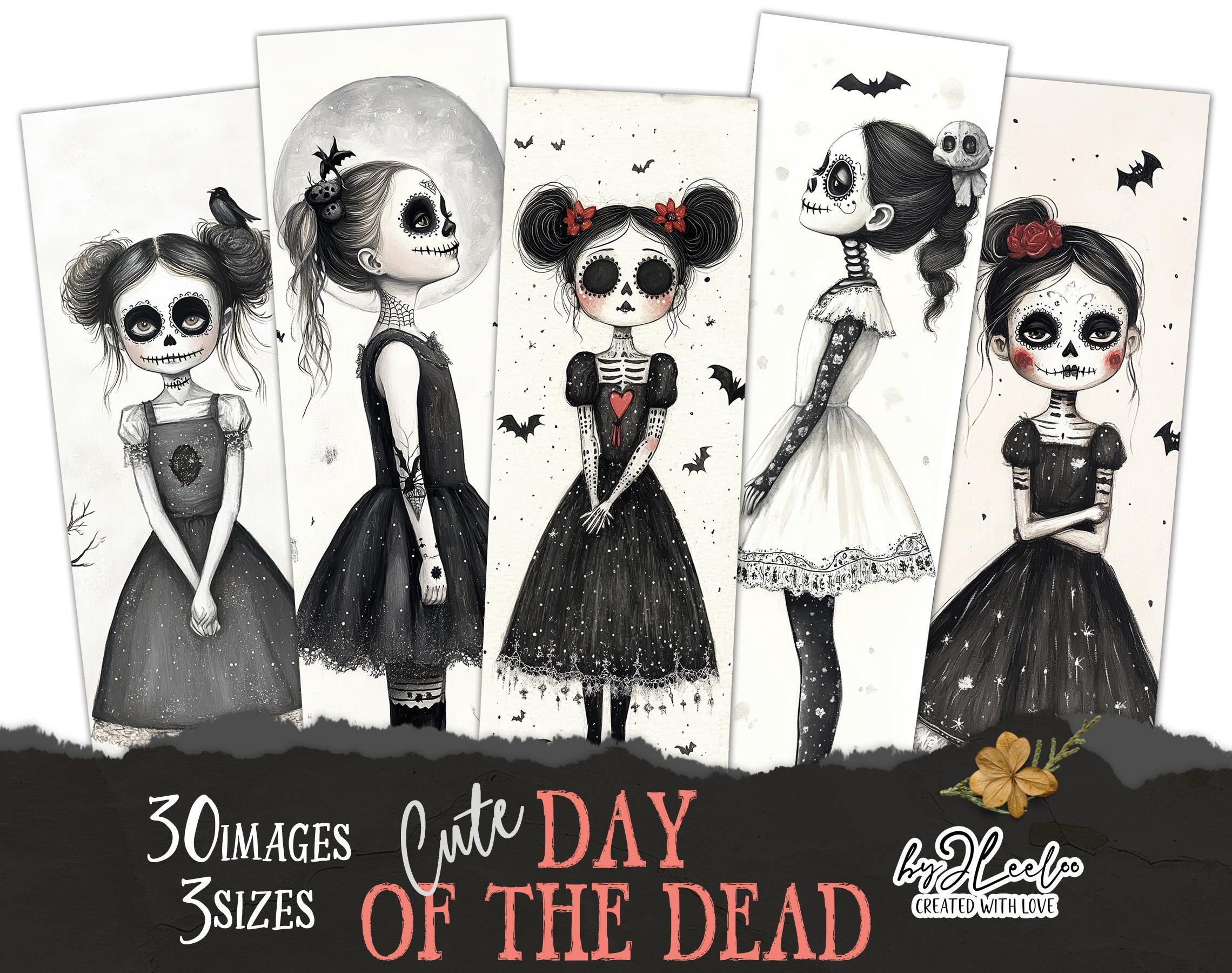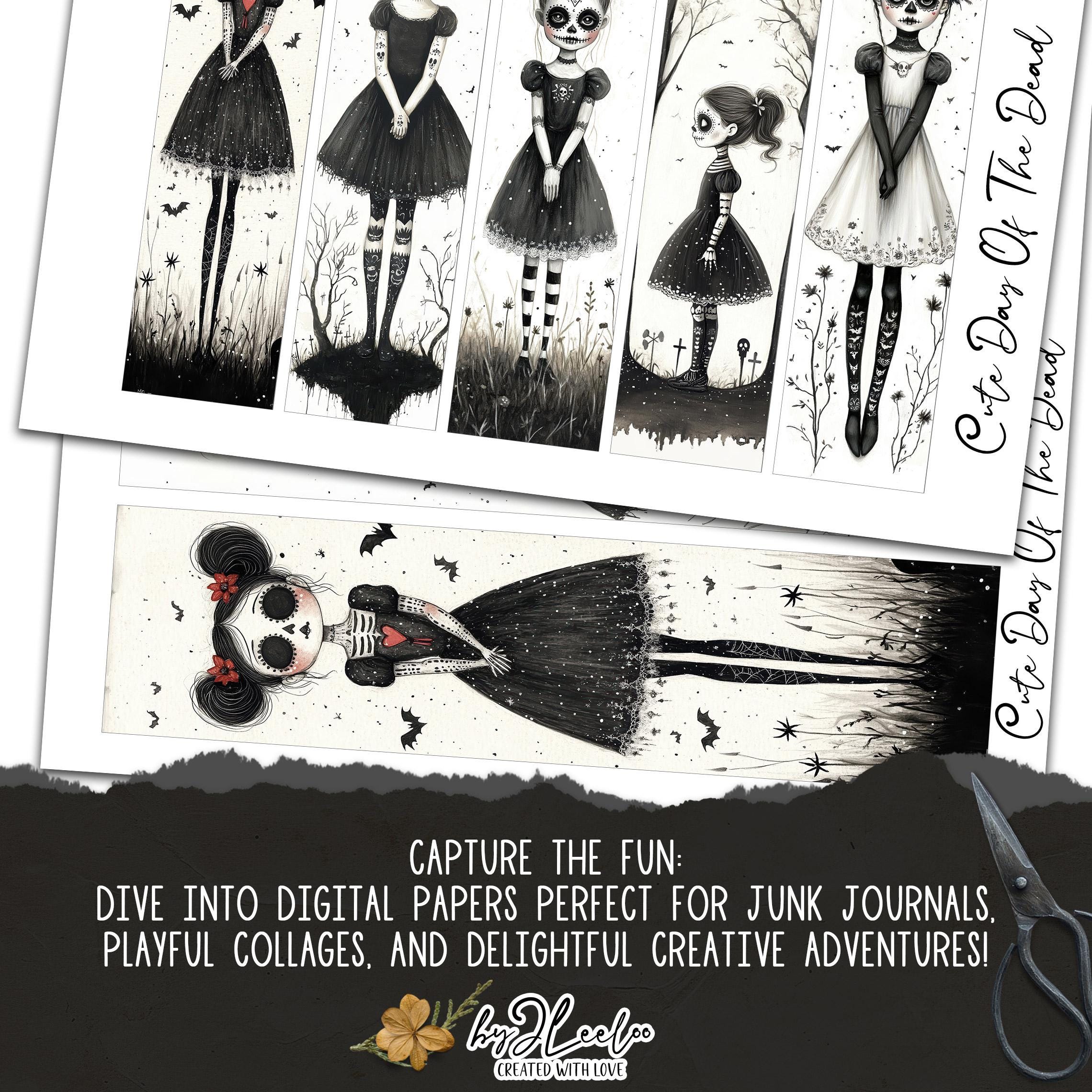 CUTE DAY of the DEAD gothic whimsy bookmarks 3 sizes | Hand-drawn card Ink paper tag junk journal | digital collage Commercial Use | pp833