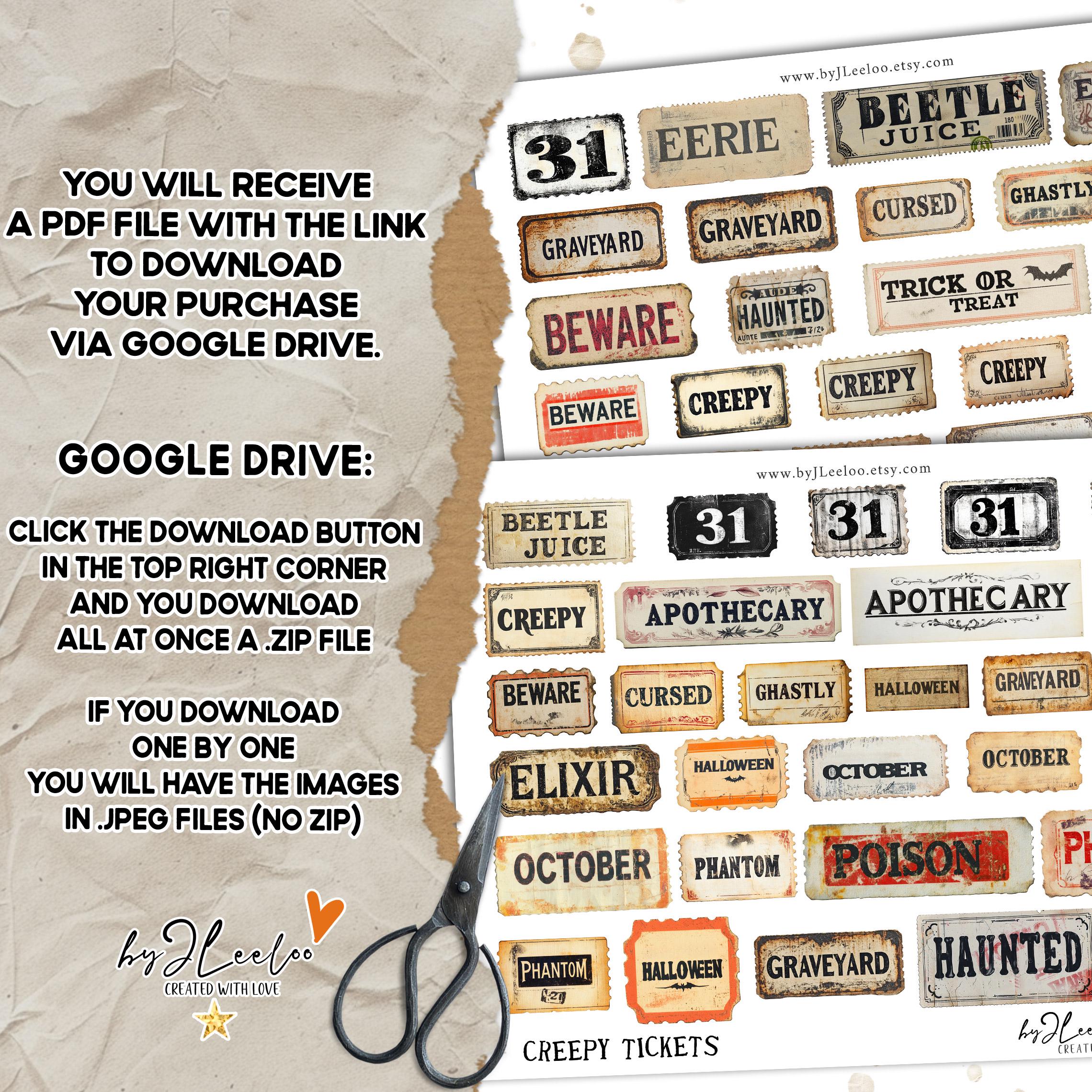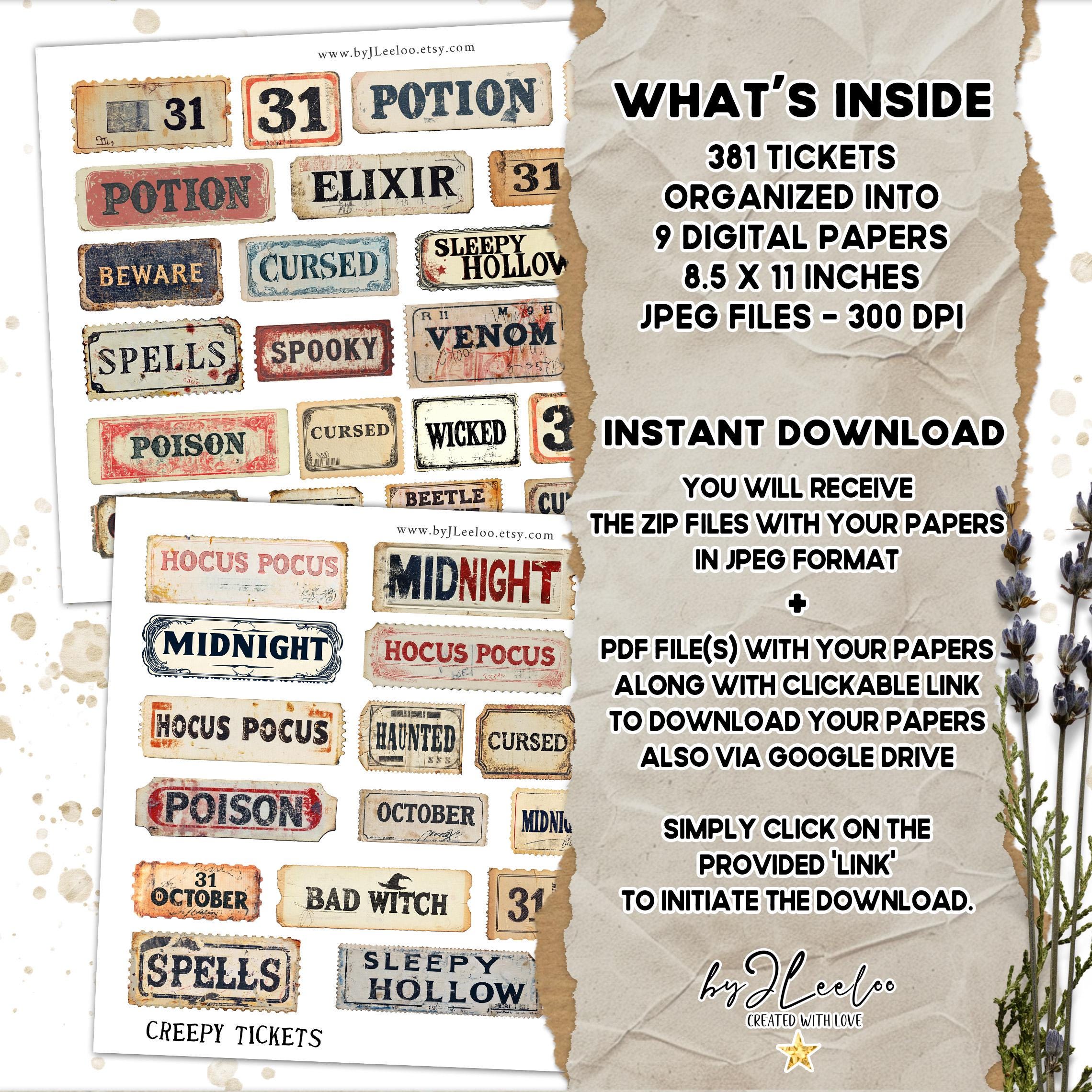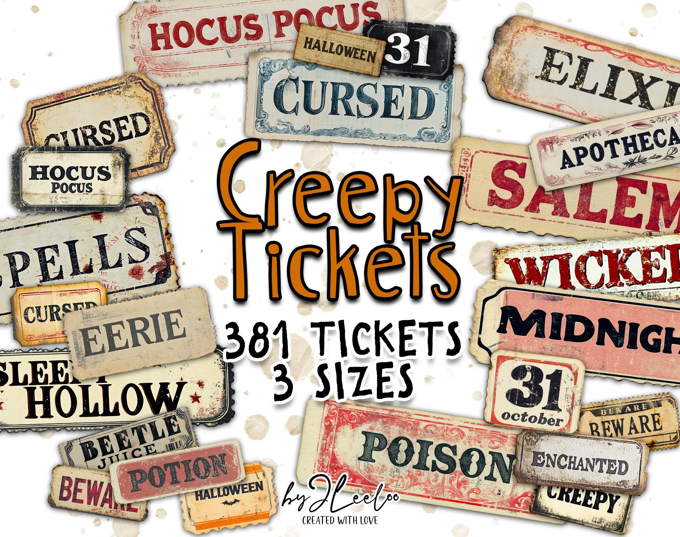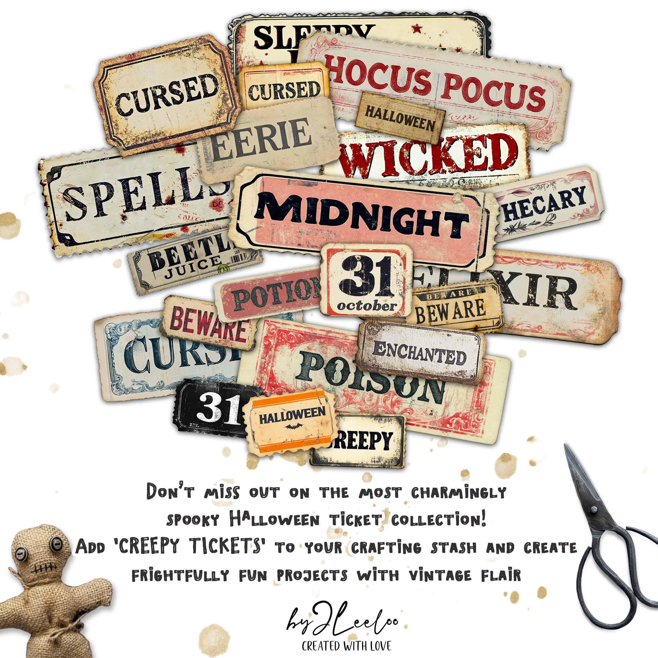 CREEPY TICKETS printable Scary Halloween | Word Labels Vintage Stickers Spooky Junk journal Gothic | scrapbooking Commercial Use | tl301