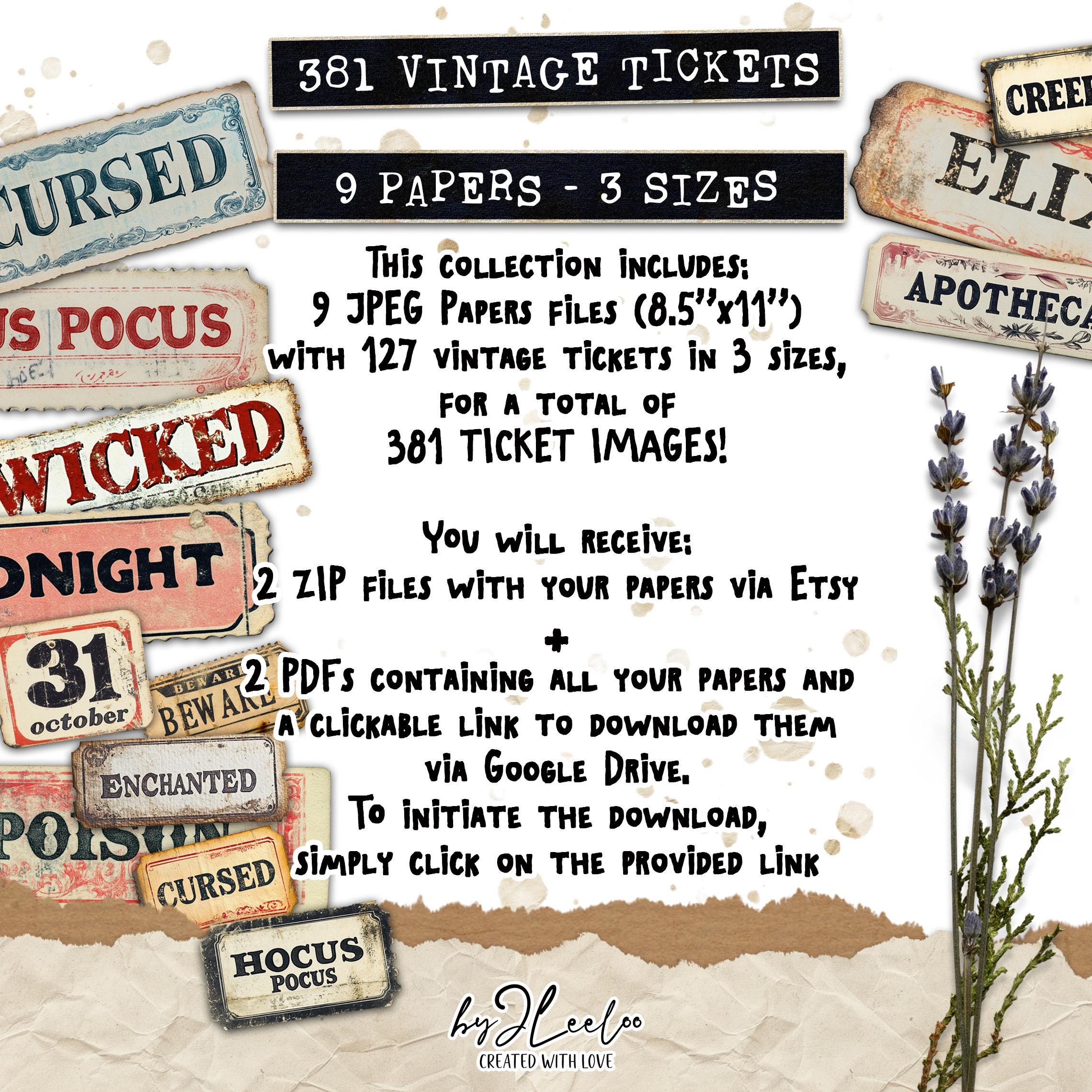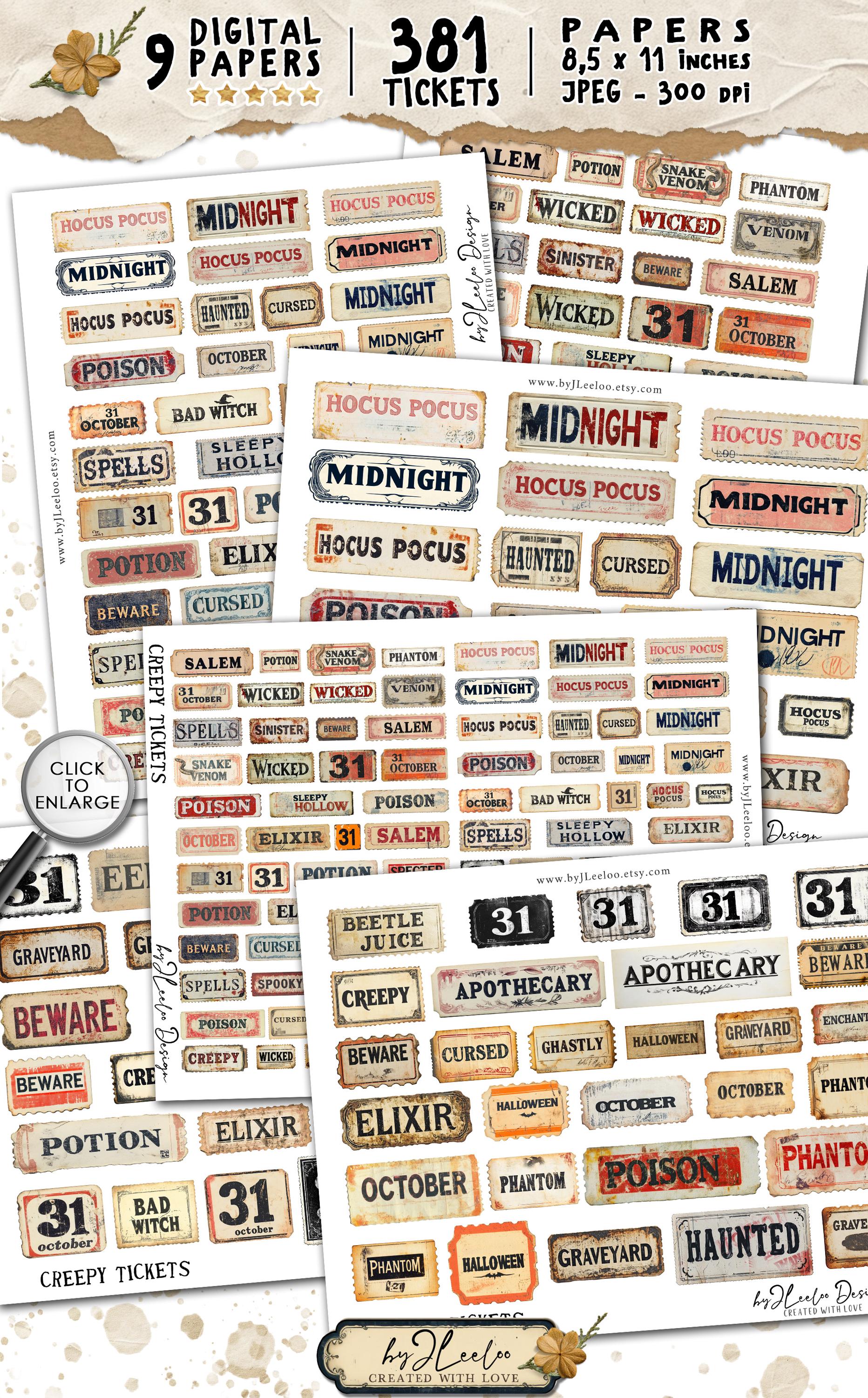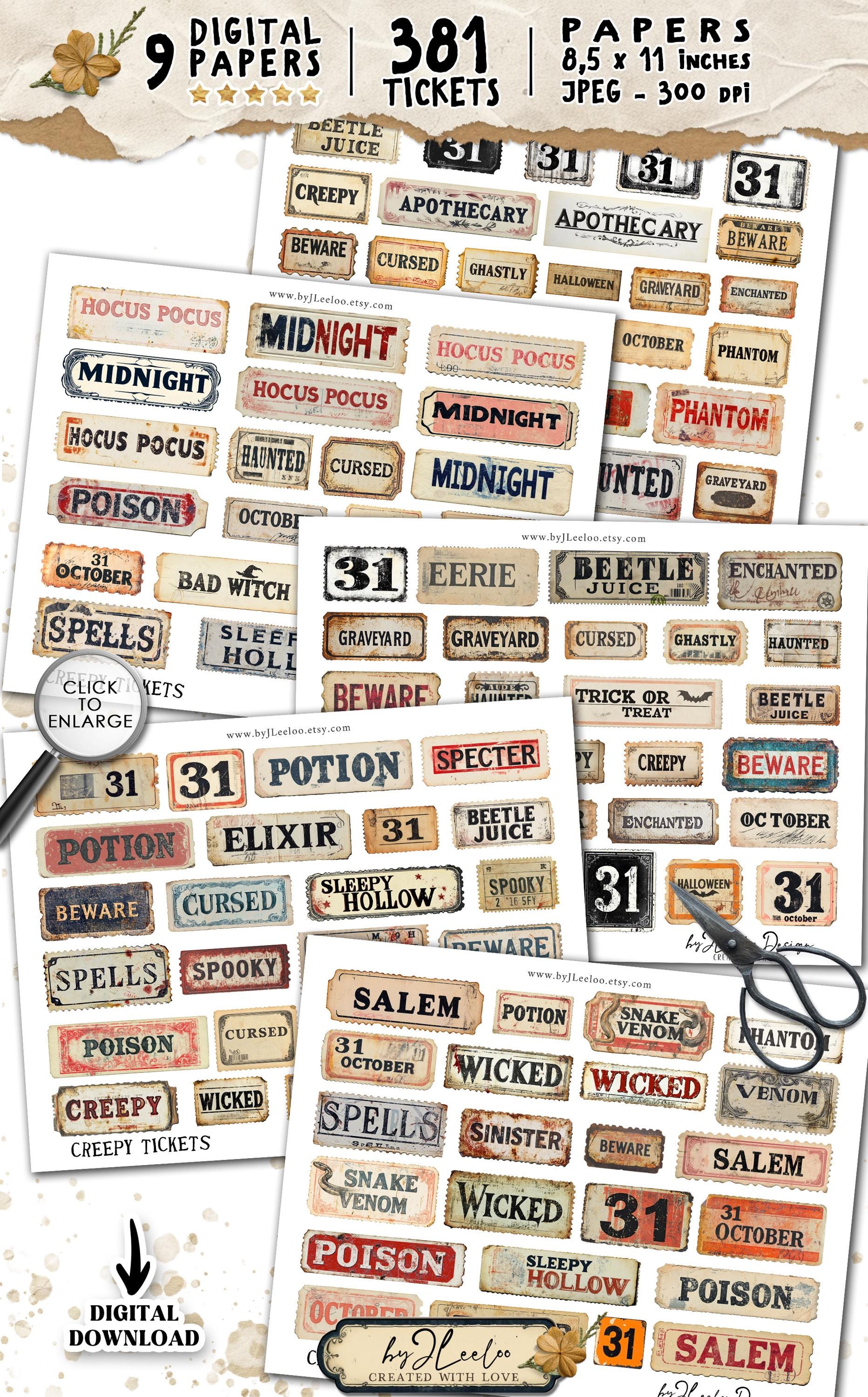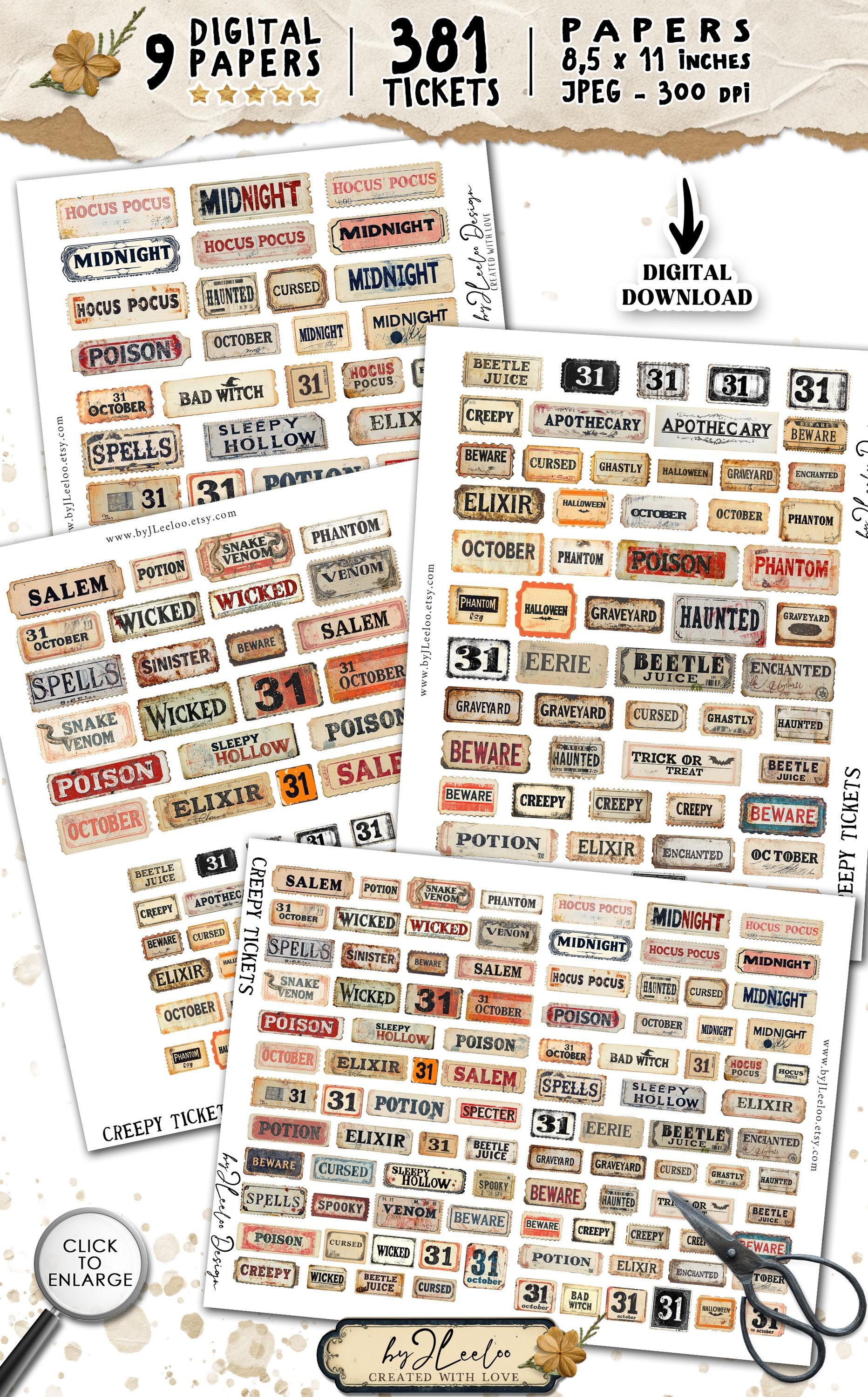 CREEPY TICKETS printable Scary Halloween | Word Labels Vintage Stickers Spooky Junk journal Gothic | scrapbooking Commercial Use | tl301
