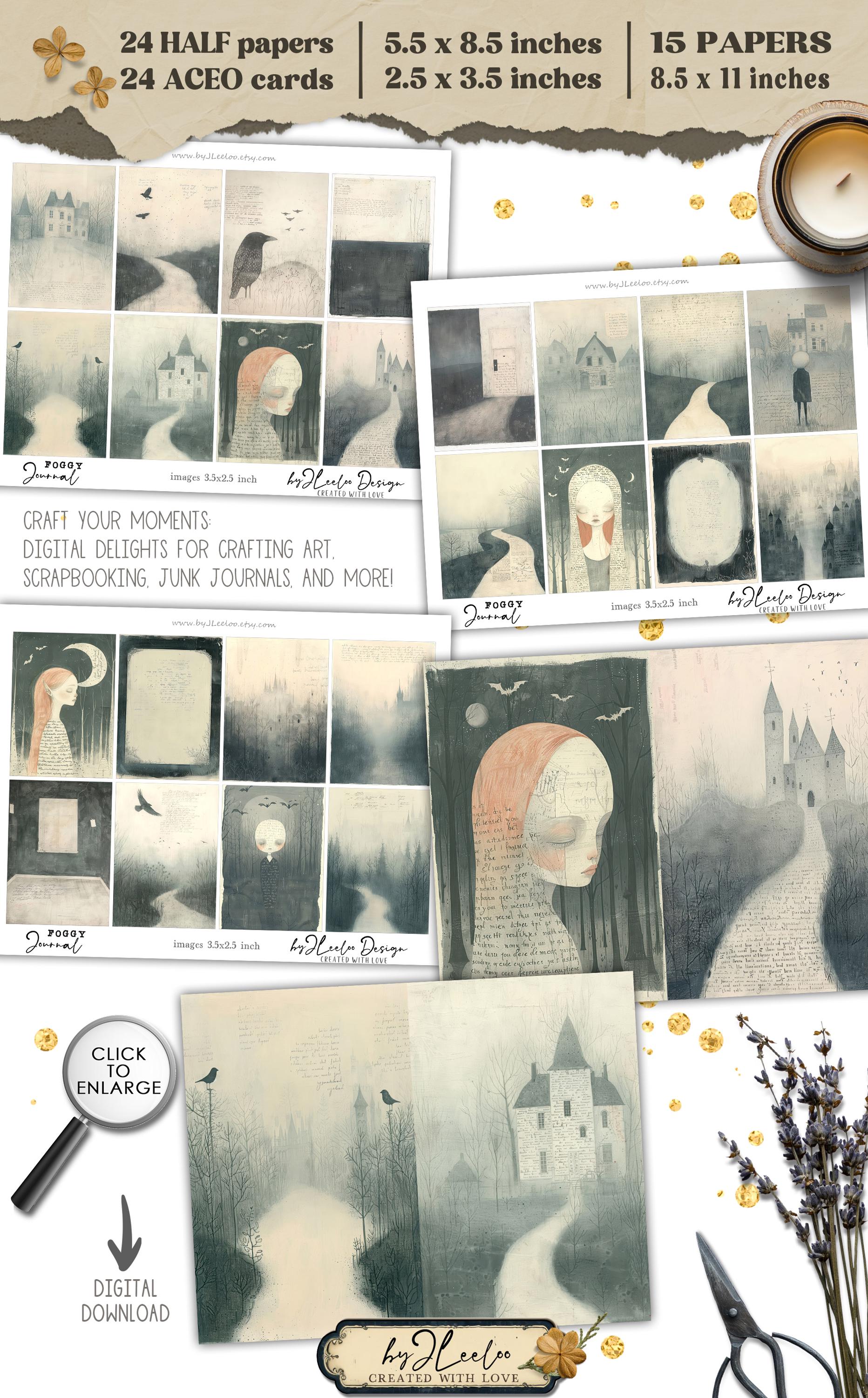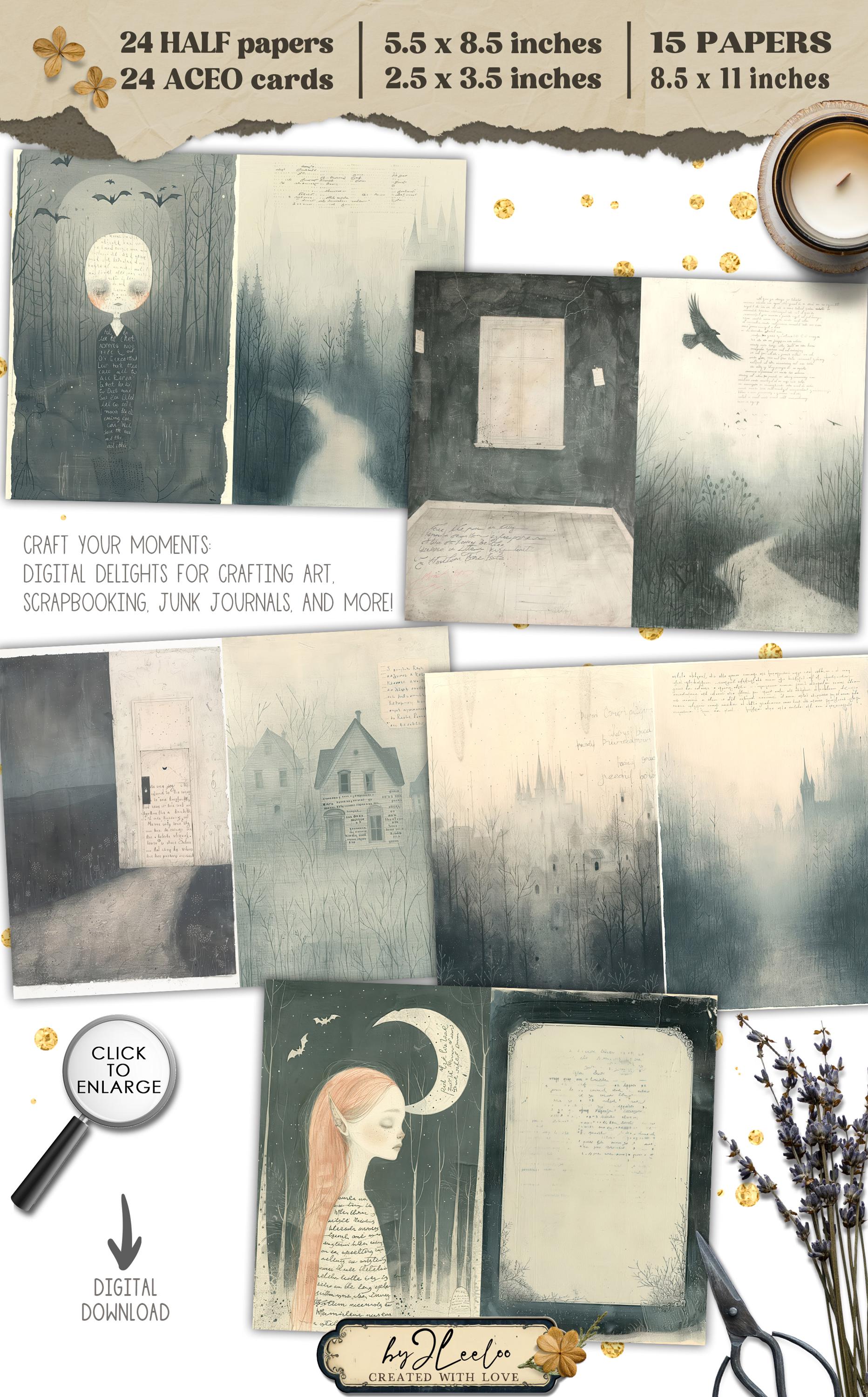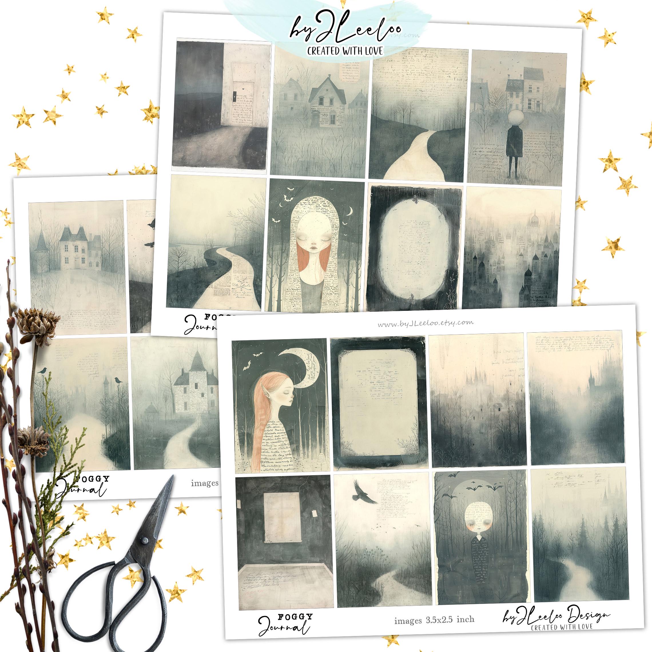 FOGGY JOURNAL half pages Dark Gothic printable | Eerie horror halloween Aceo Atc junk journal | Storybook paper collage digital card | pp832
