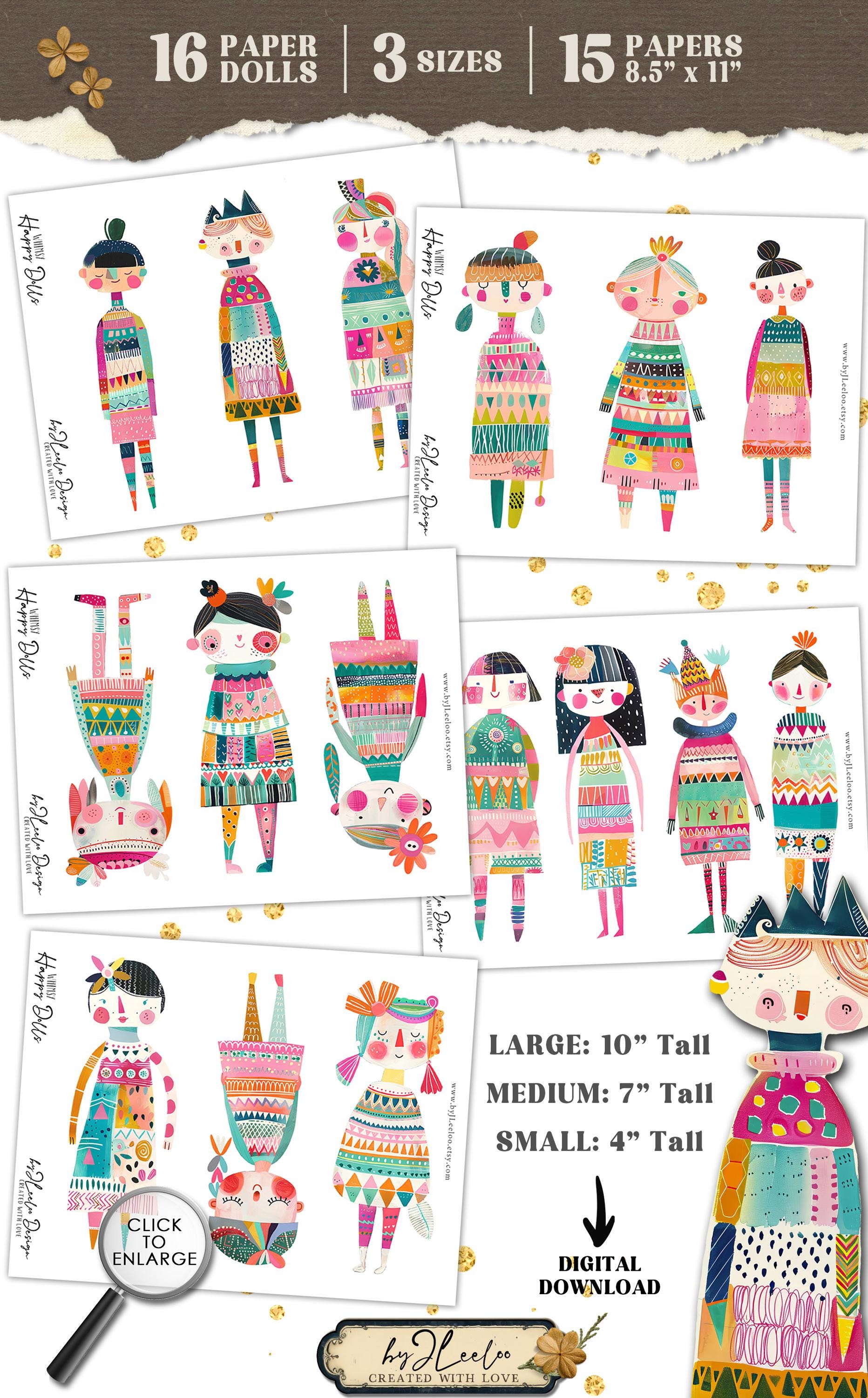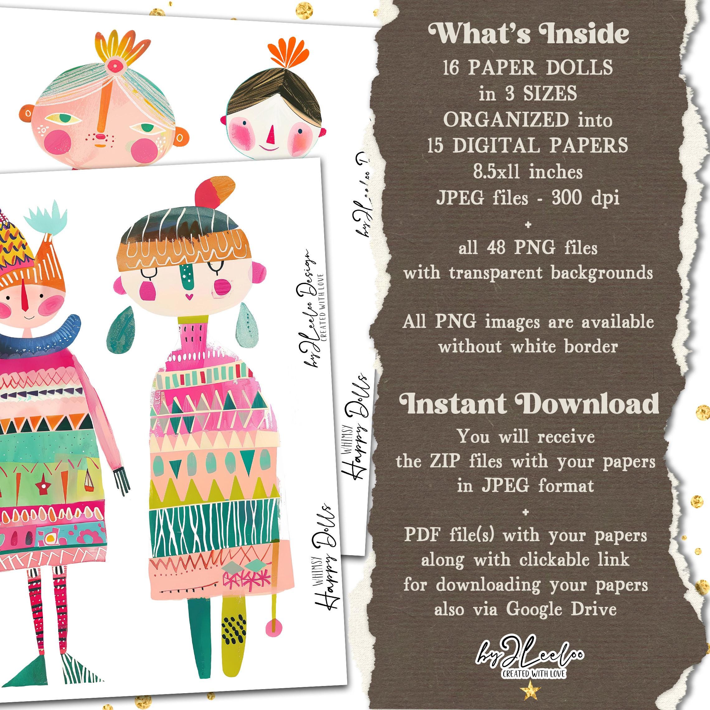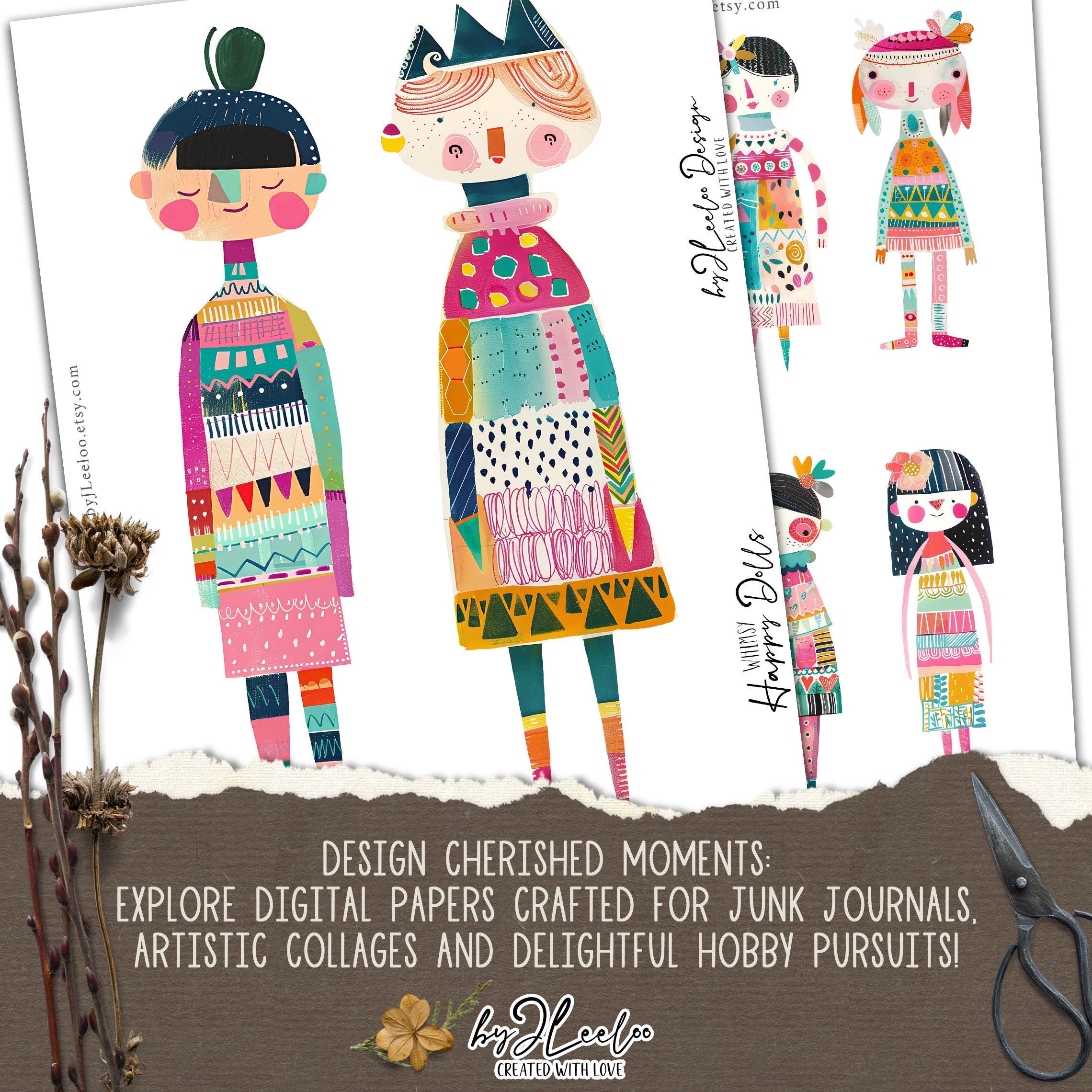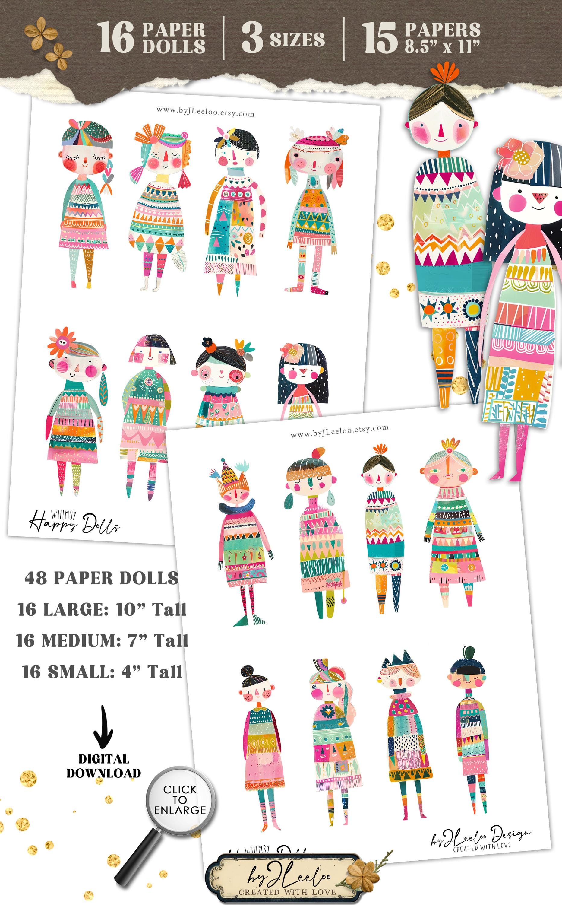 WHIMSY HAPPY DOLLS paper doll 3 sizes printable junk journal cut off | Paper Dolls journaling supplies Hand-drawn | mini fussy cut | pp836