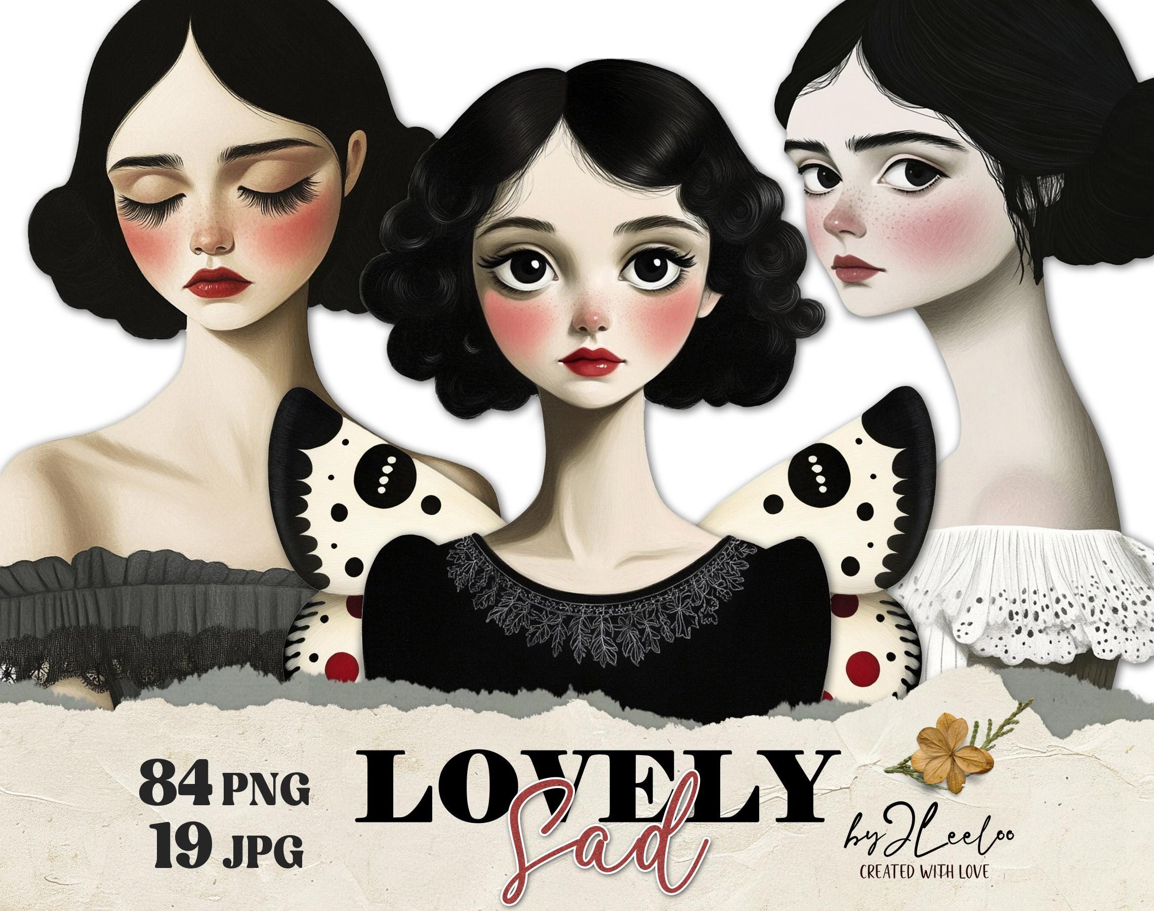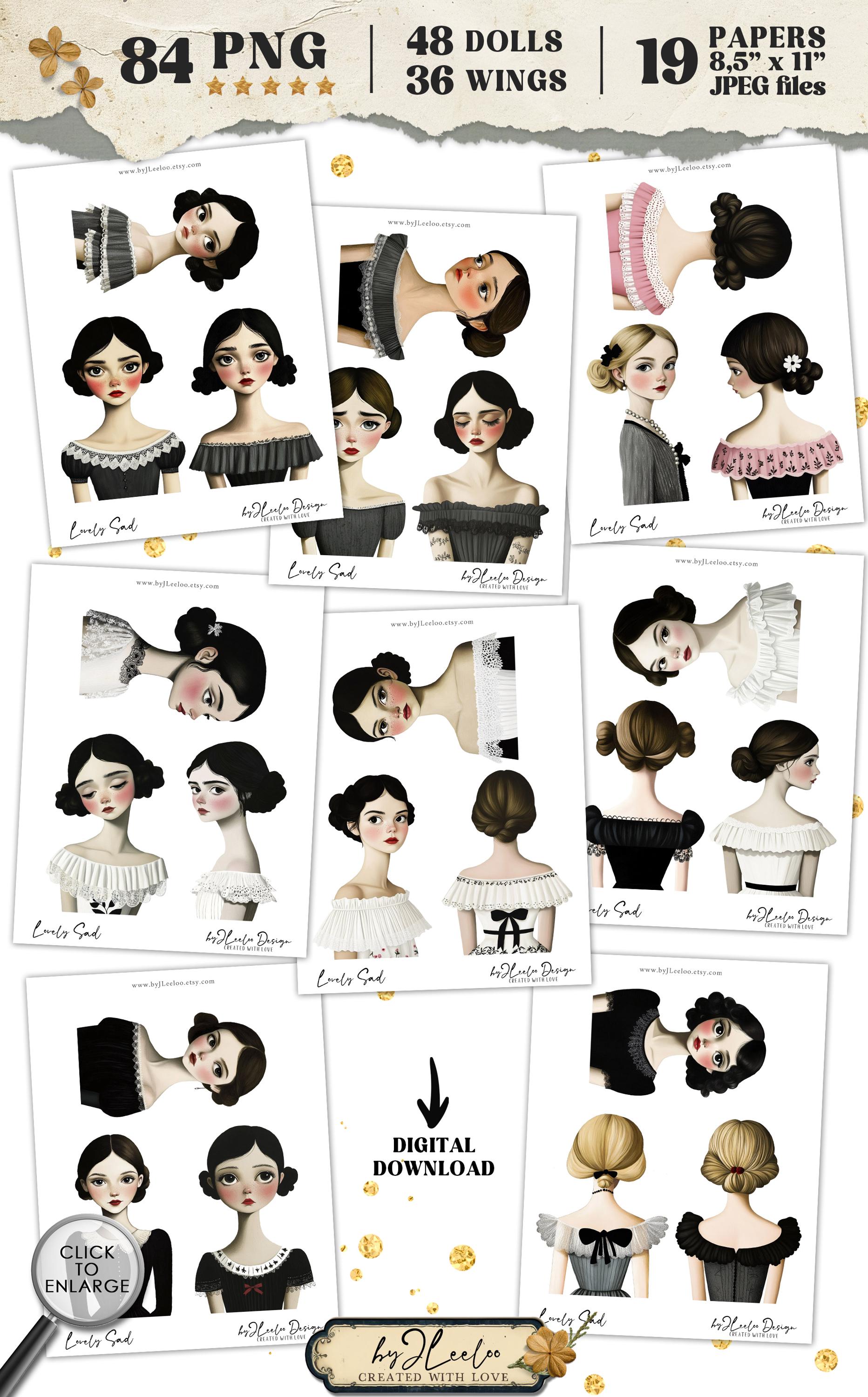LOVELY SAD clipart 84 PNG cute naive | Digital paper doll lady wings faces | Whimsical wings Journaling Stickers Commercial Use | cl175