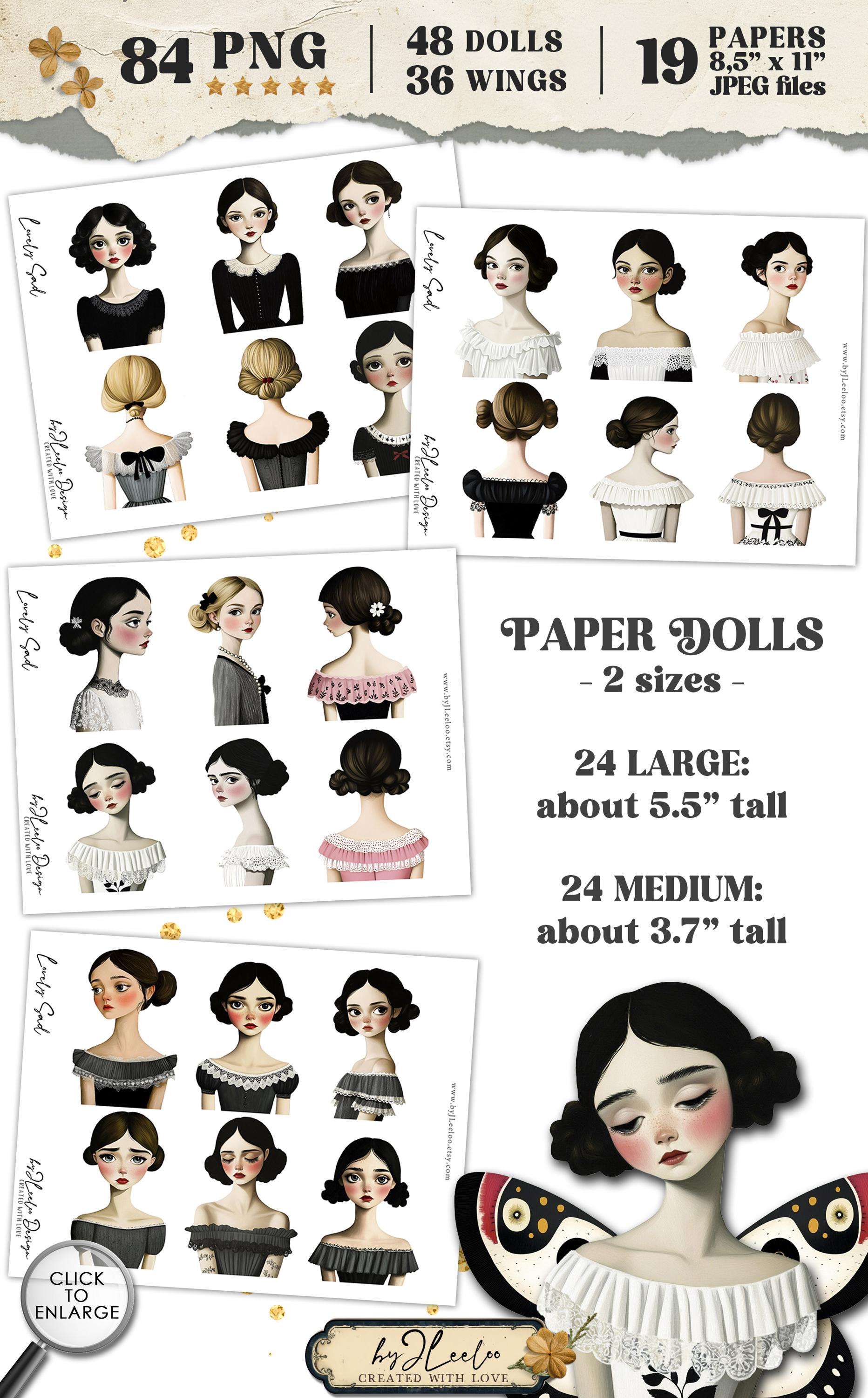 โข 48 half-body paper dolls - 2 sizes - 24 large about 5.5" tall and 24 medium about 3.7" tall
