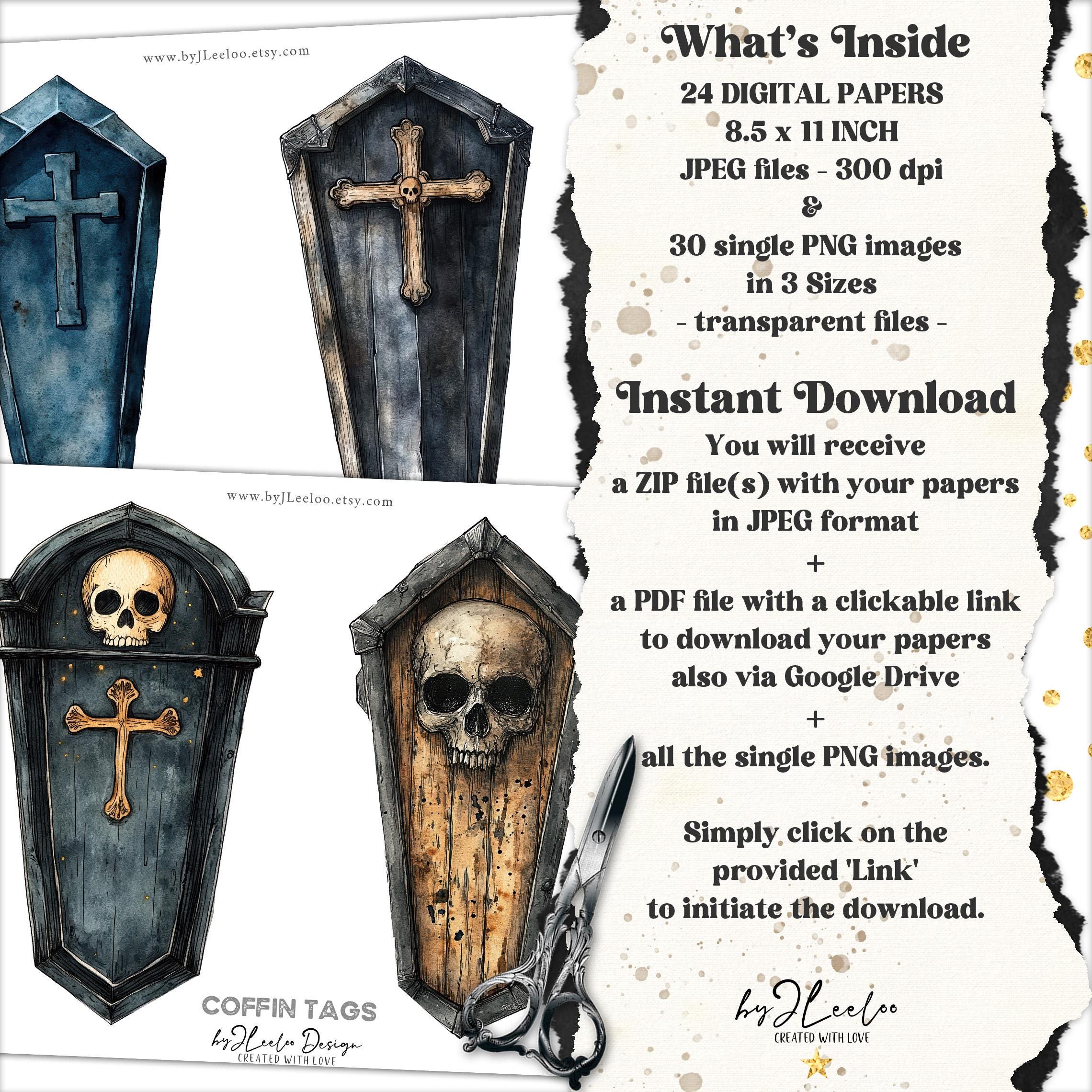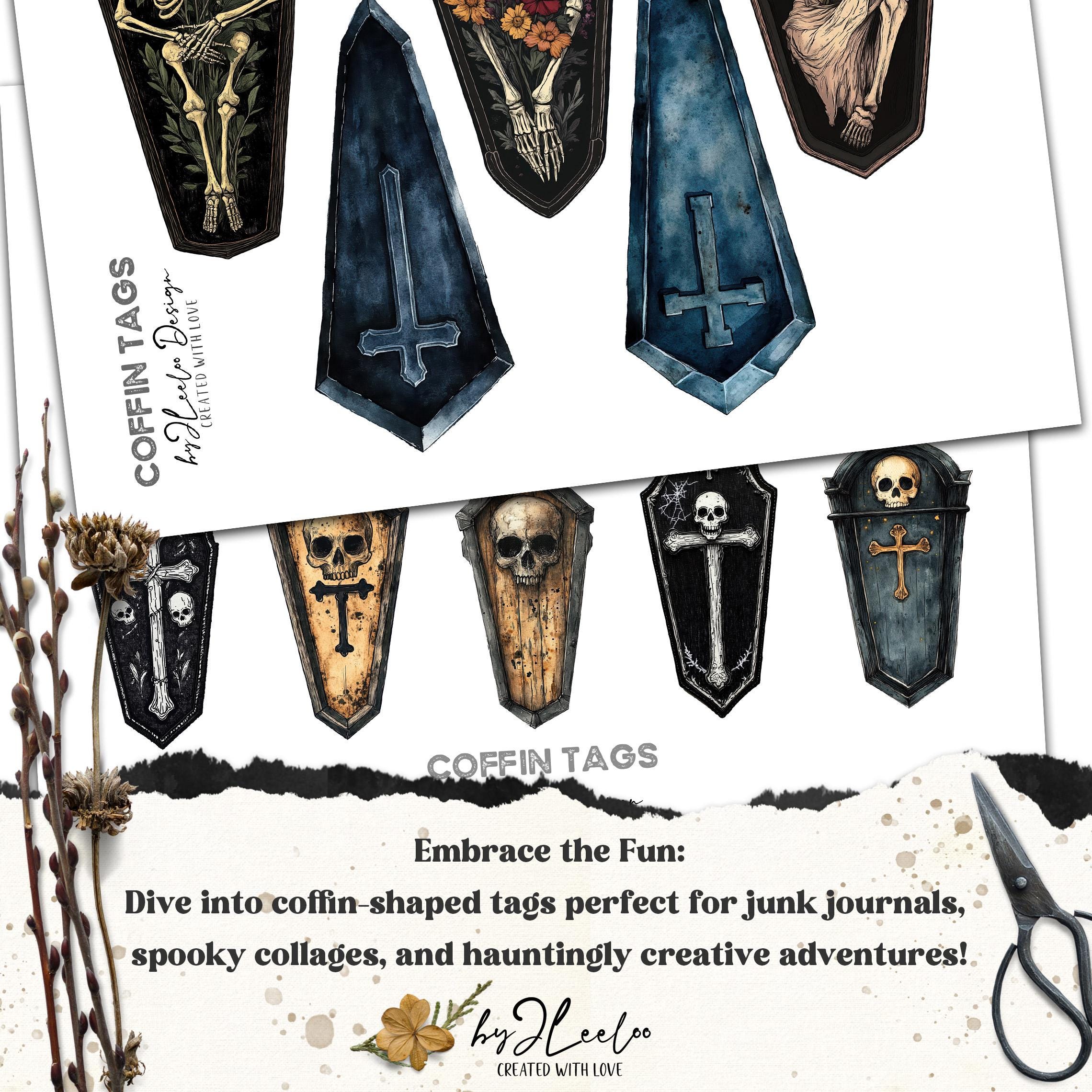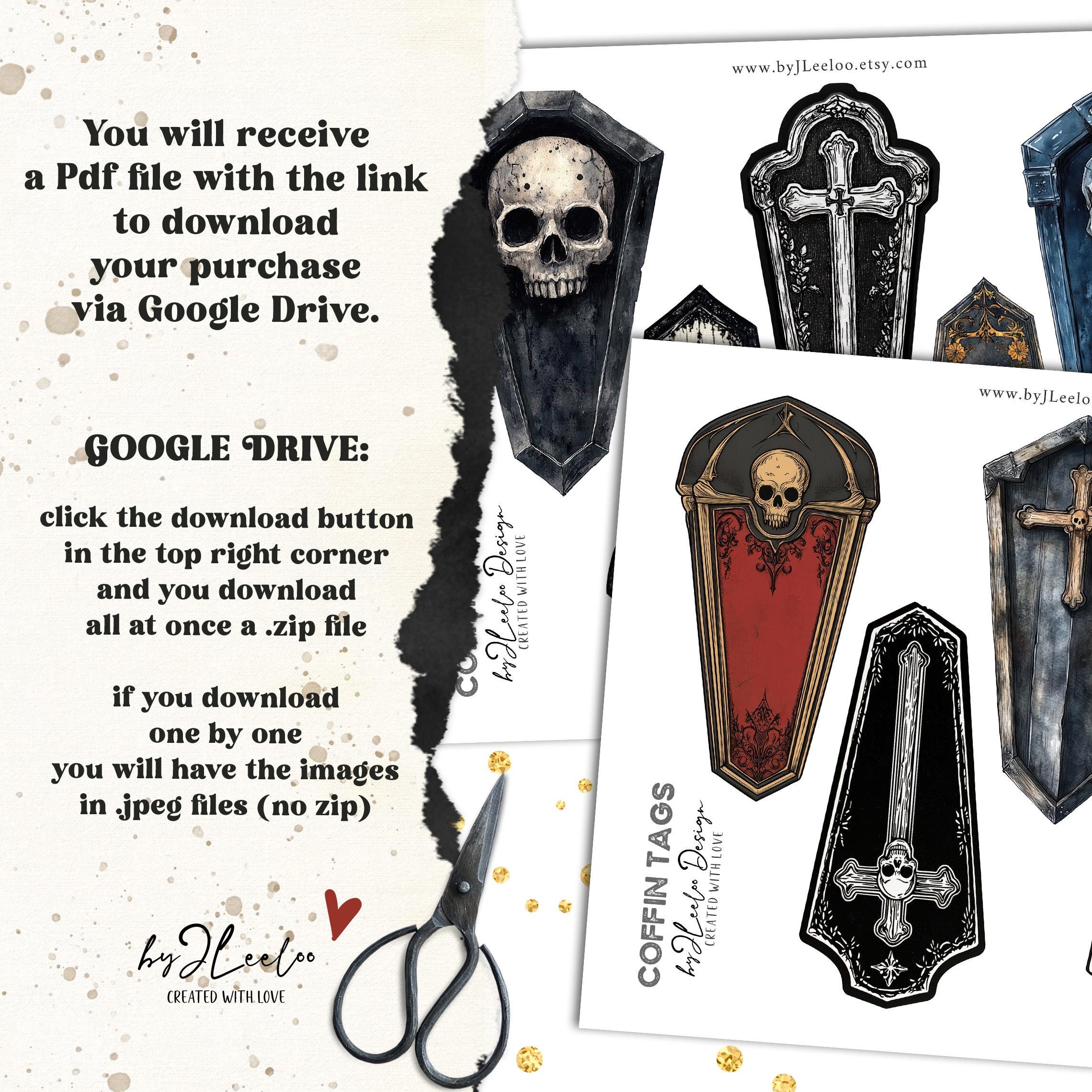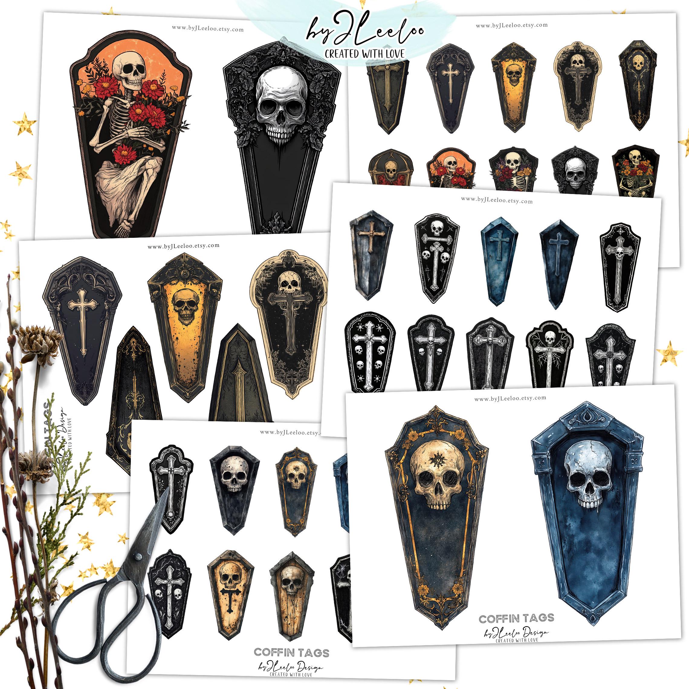 ๐ COFFIN TAGS | printable gothic designs for Halloween party | Antique Victorian Vampire Skull Scary invitation decoration journal CU | cl176 ๐