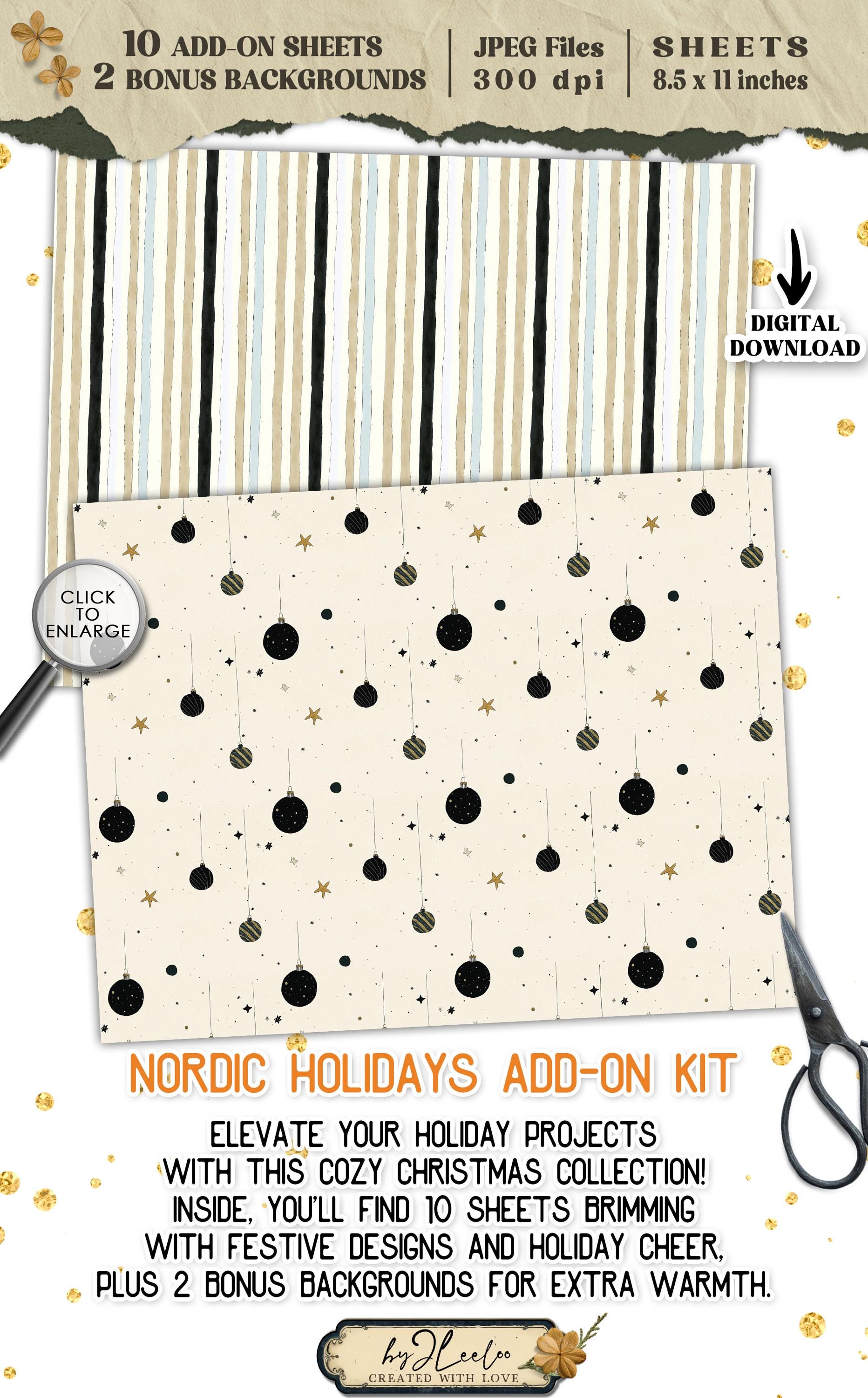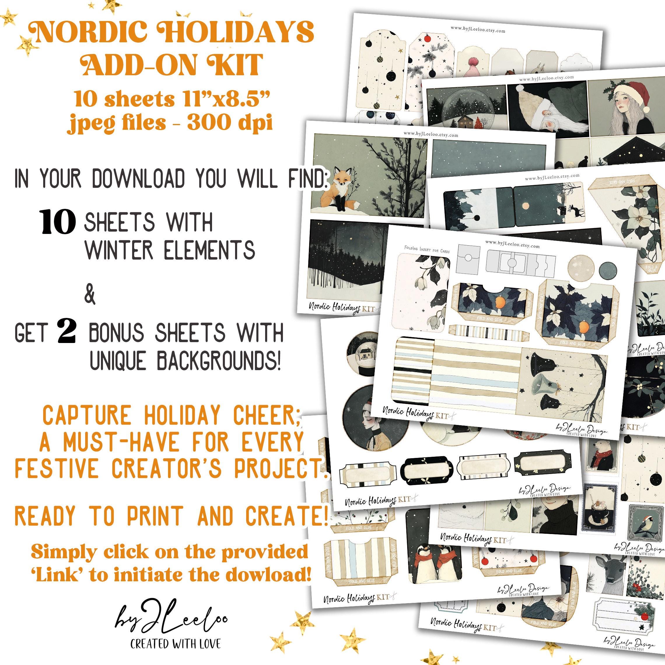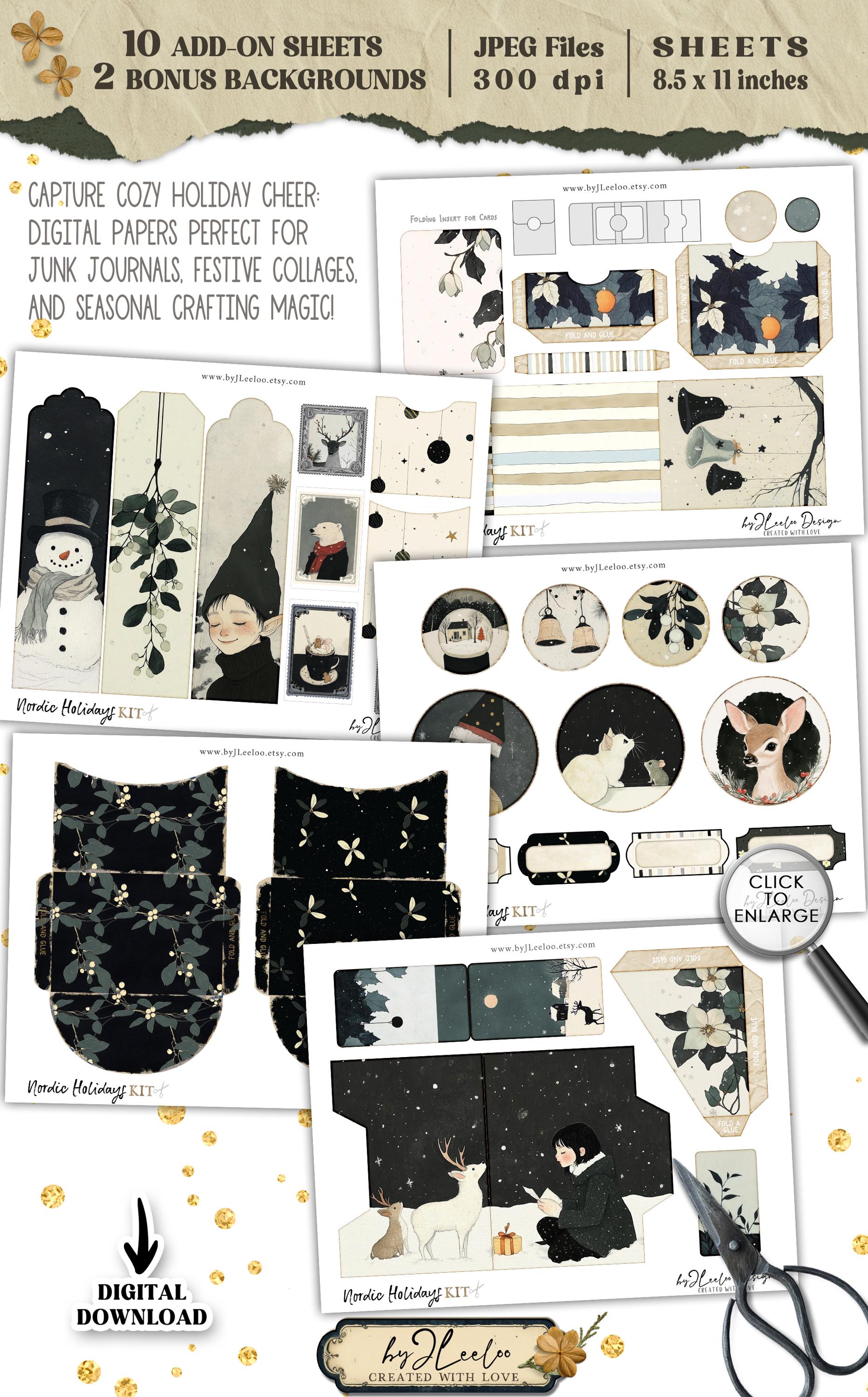๐ป Looking to add even more Nordic holiday charm to your journal? Discover our Nordic Holidays Add-On, a special collection of 10 digital sheets packed with all the essentials for your Christmas junk journaling! This add-on is brimming with festive elementsโATC cards, tabs, tags, envelopes, tickets, labels, ephemera, bookmarks, and pocketsโeverything you need to create layers of holiday magic. Each piece captures the cozy, whimsical feel of a Nordic winter with snow-covered designs, vintage textures, and delightful holiday motifs. Perfect for adding unique touches to your journal, this set brings the magic of the season to every page. Get ready to make your Christmas crafting truly special! ๐