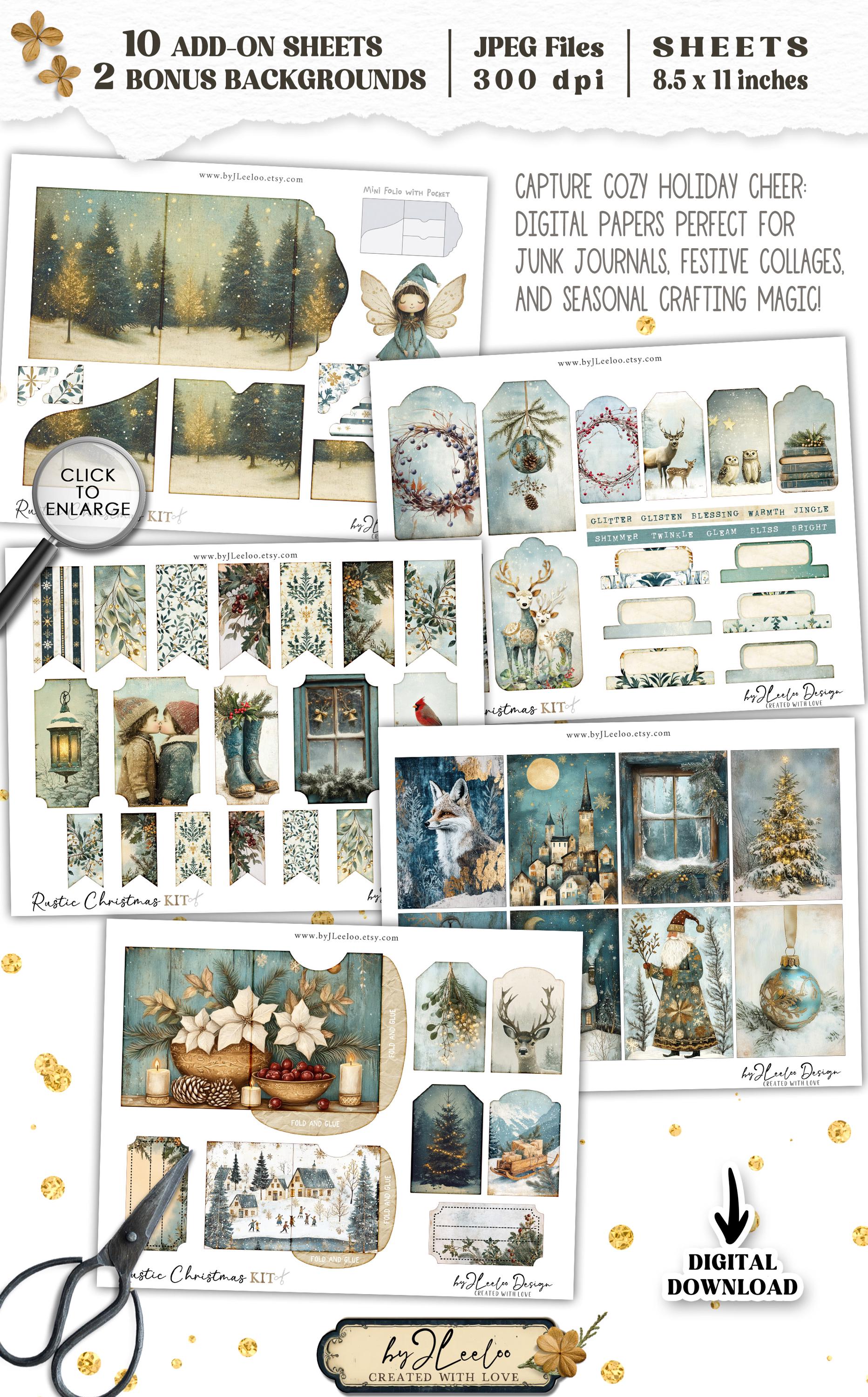 ๐ Looking to add a touch of rustic holiday charm to your journal? Discover our Rustic Christmas Journal Add-On, a curated set of 10 digital sheets crafted for vintage-style Christmas junk journaling! This add-on is brimming with festive elementsโATC cards, tabs, tags, envelopes, tickets, labels, ephemera, bookmarks, and pocketsโeverything you need to create layers of holiday warmth. Each piece is designed in romantic shades of blue, green, and gold, accented with gentle golden lights and vintage textures that capture the cozy essence of a rustic Christmas. Perfect for adding a unique, nostalgic touch to your journal, this collection will make your holiday crafting truly memorable. ๐