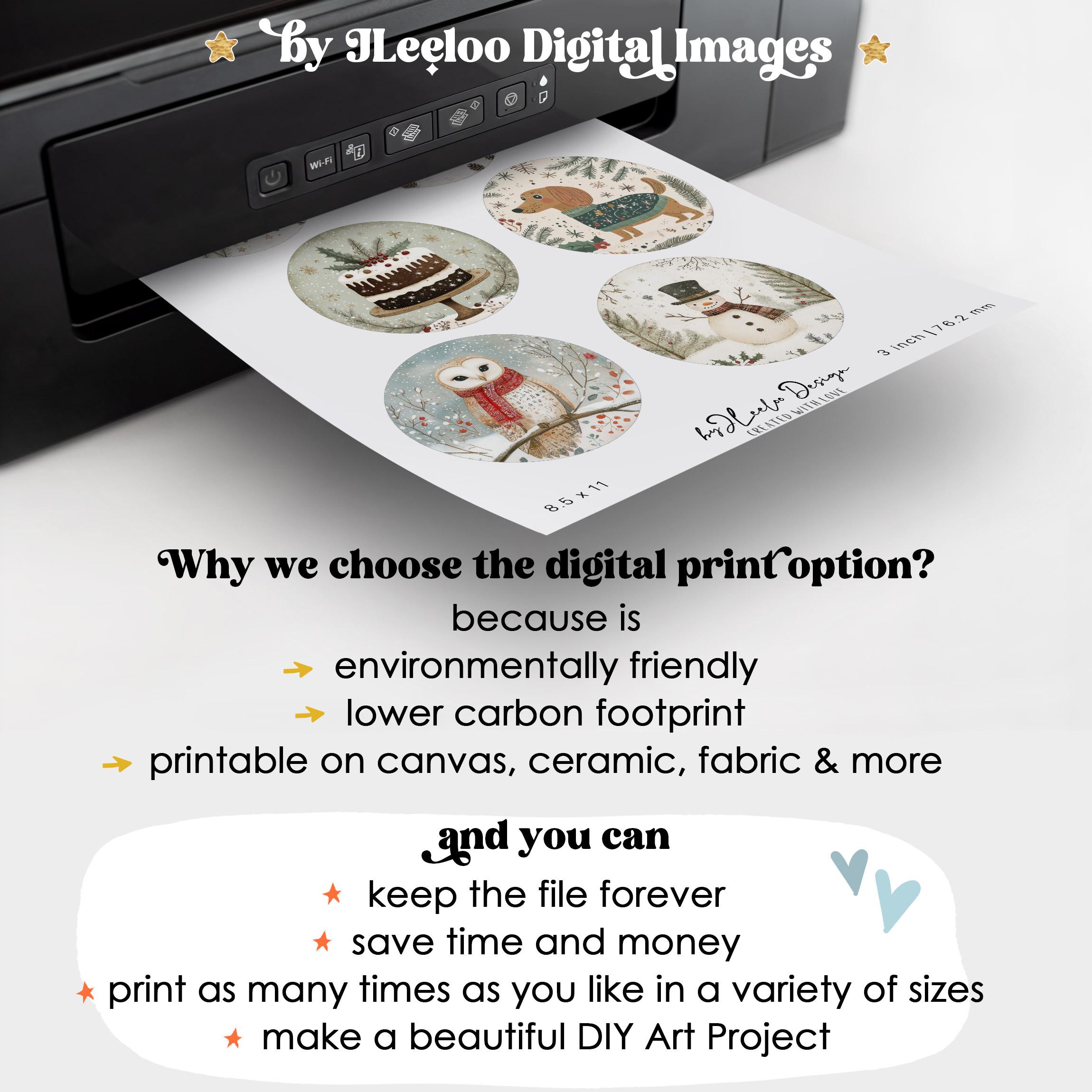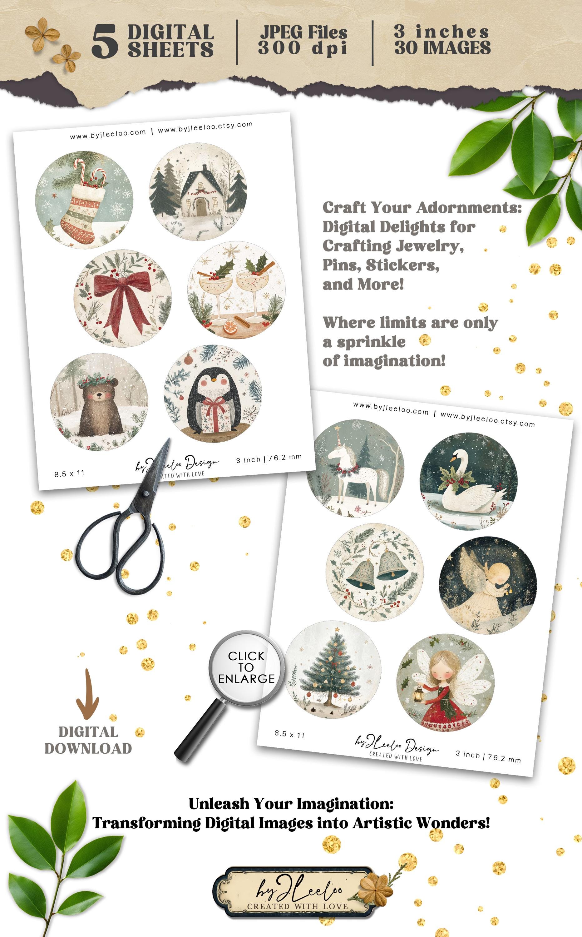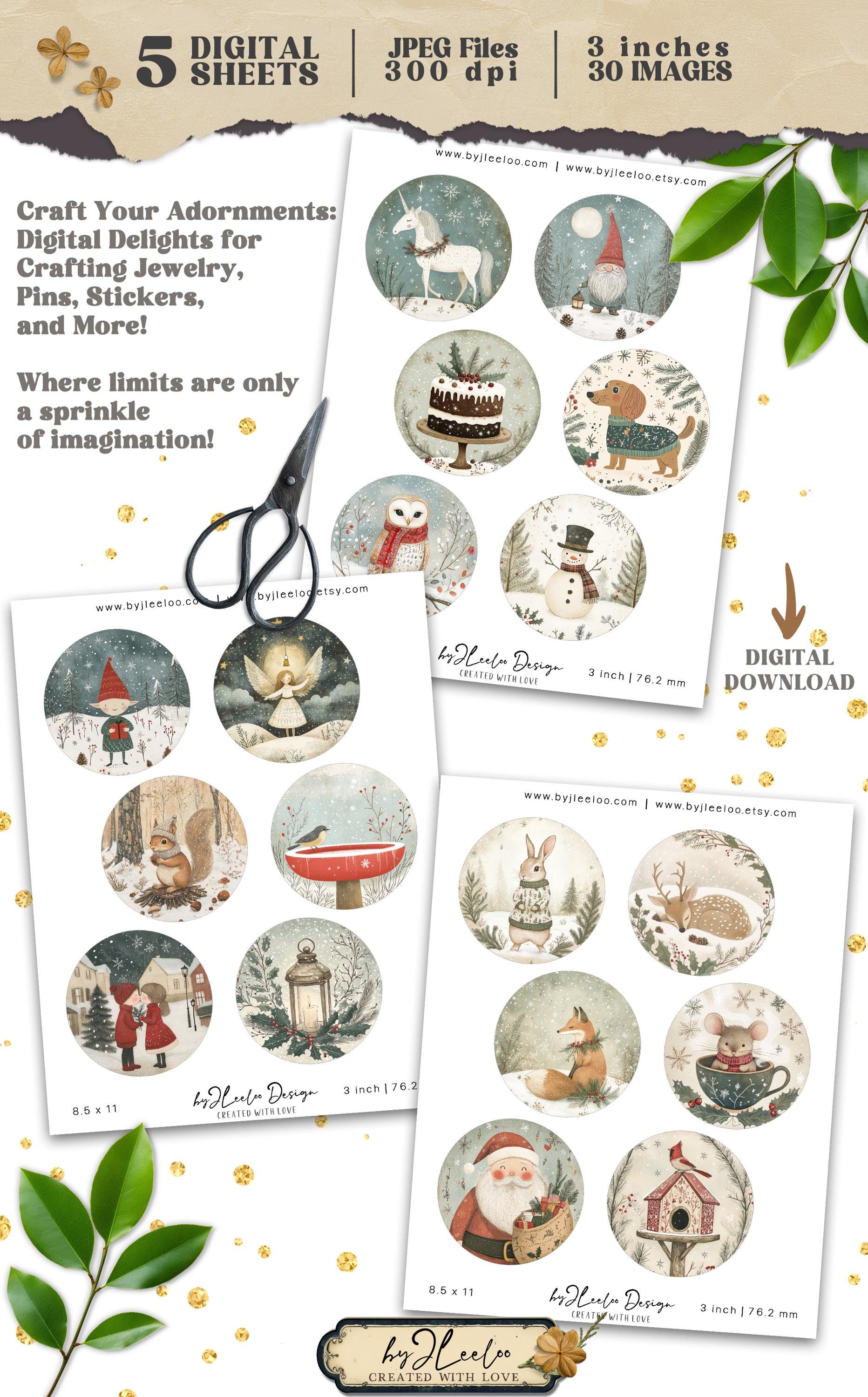 RUSTIC CHRISTMAS 3 inch printable illustration | for Pendant Decor, Labels Stickers, Winter Folk scrapbooking for Journal digital | tn840