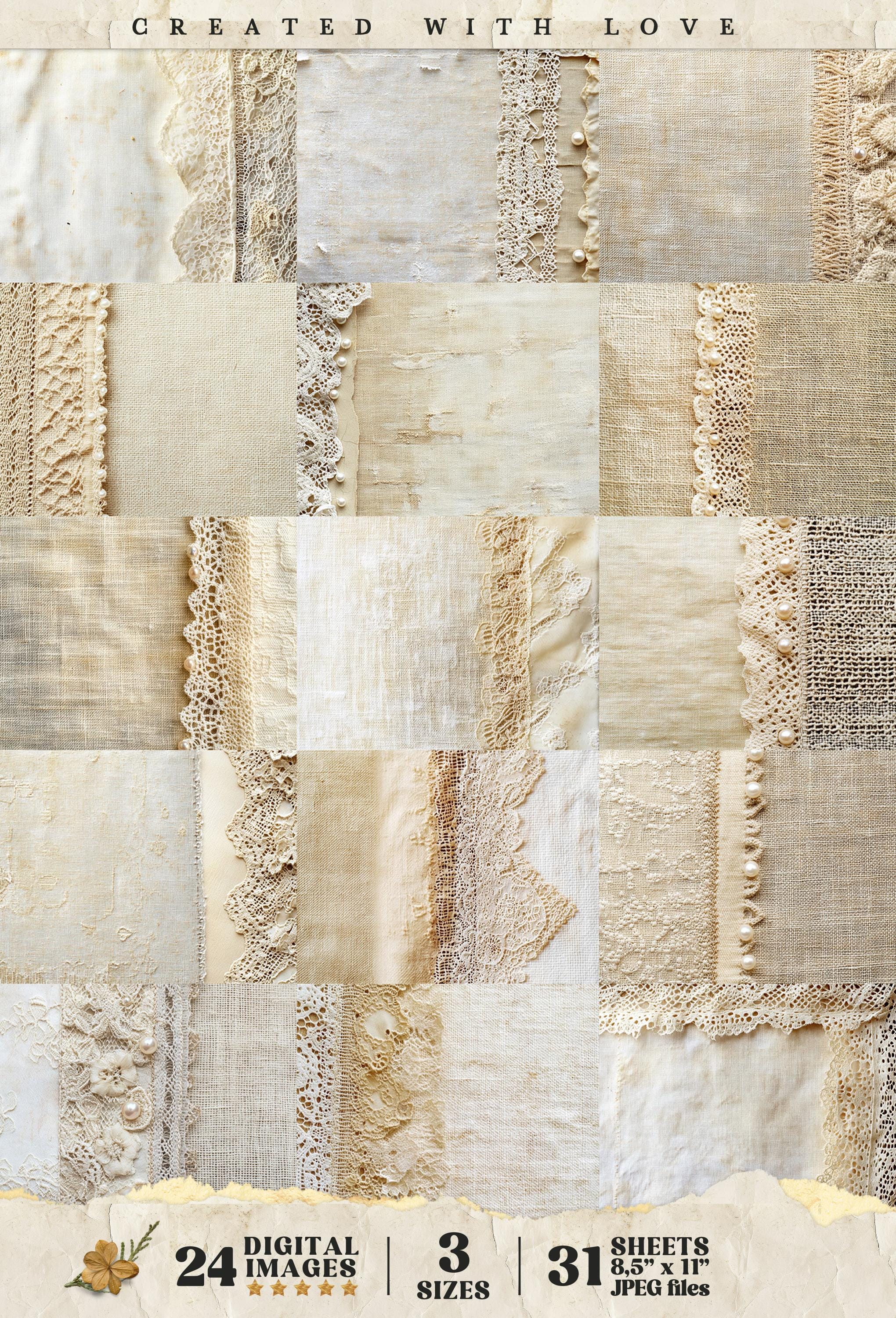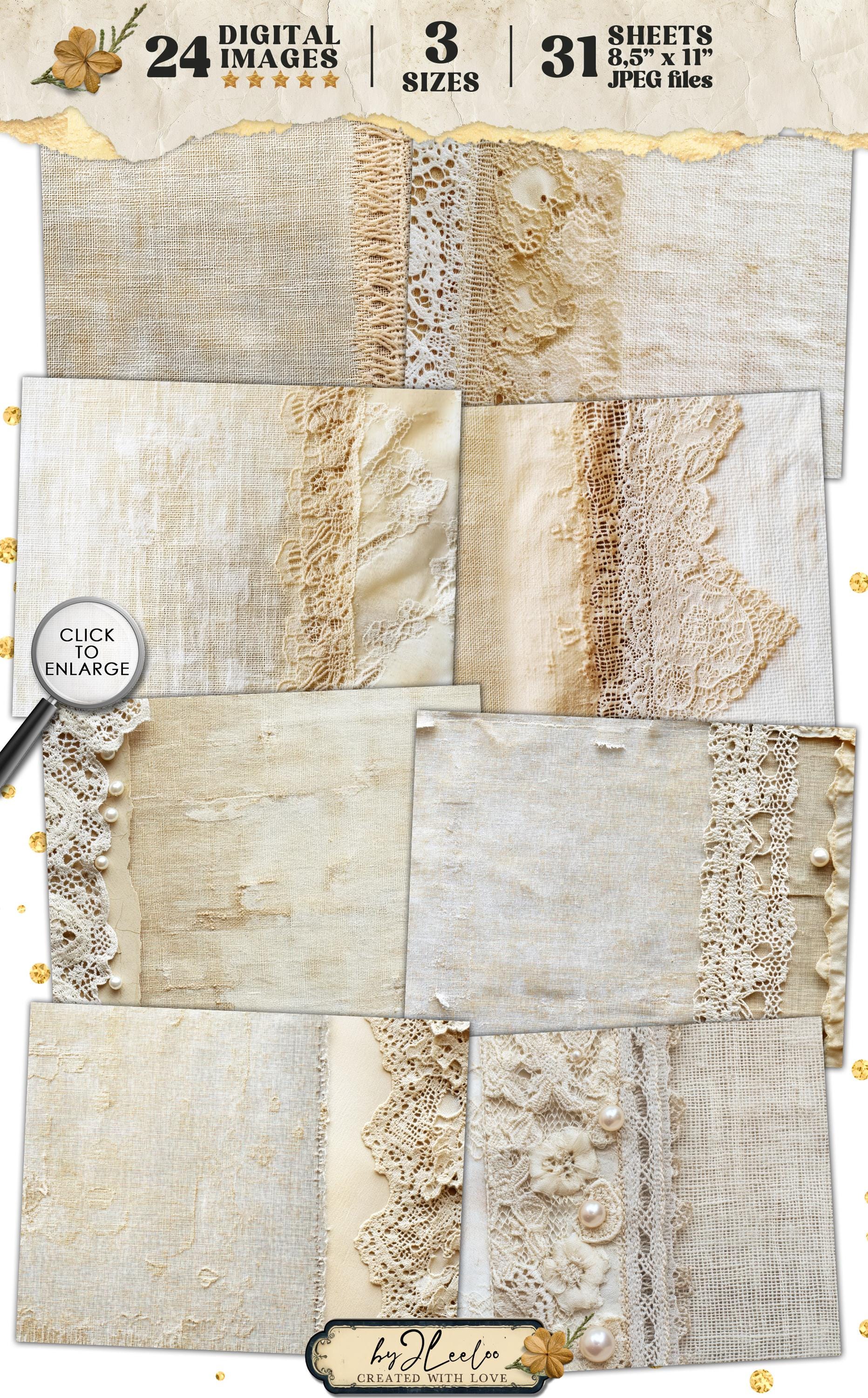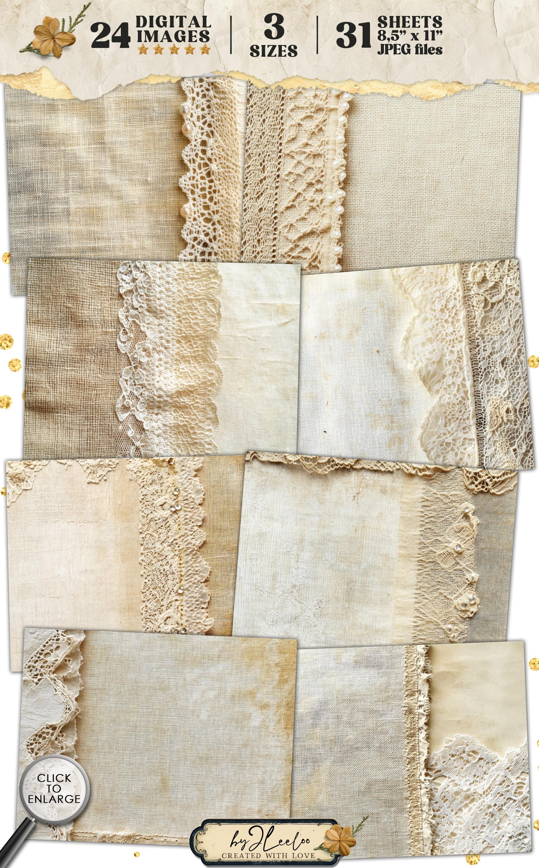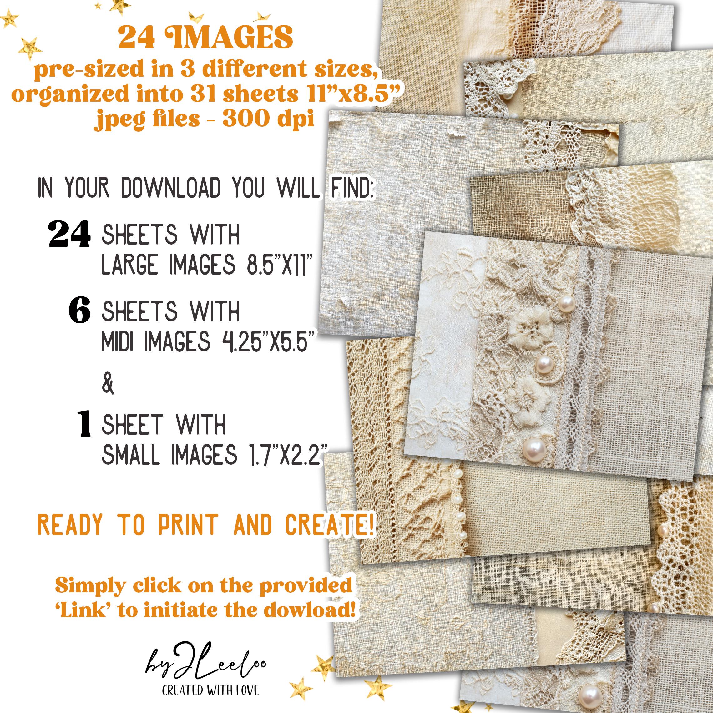LACE and LEGACY 24 rustic papers 3 sizes neutral background | Burlap Junk Journal Pages | scrapbook digital printable Commercial Use | pp893