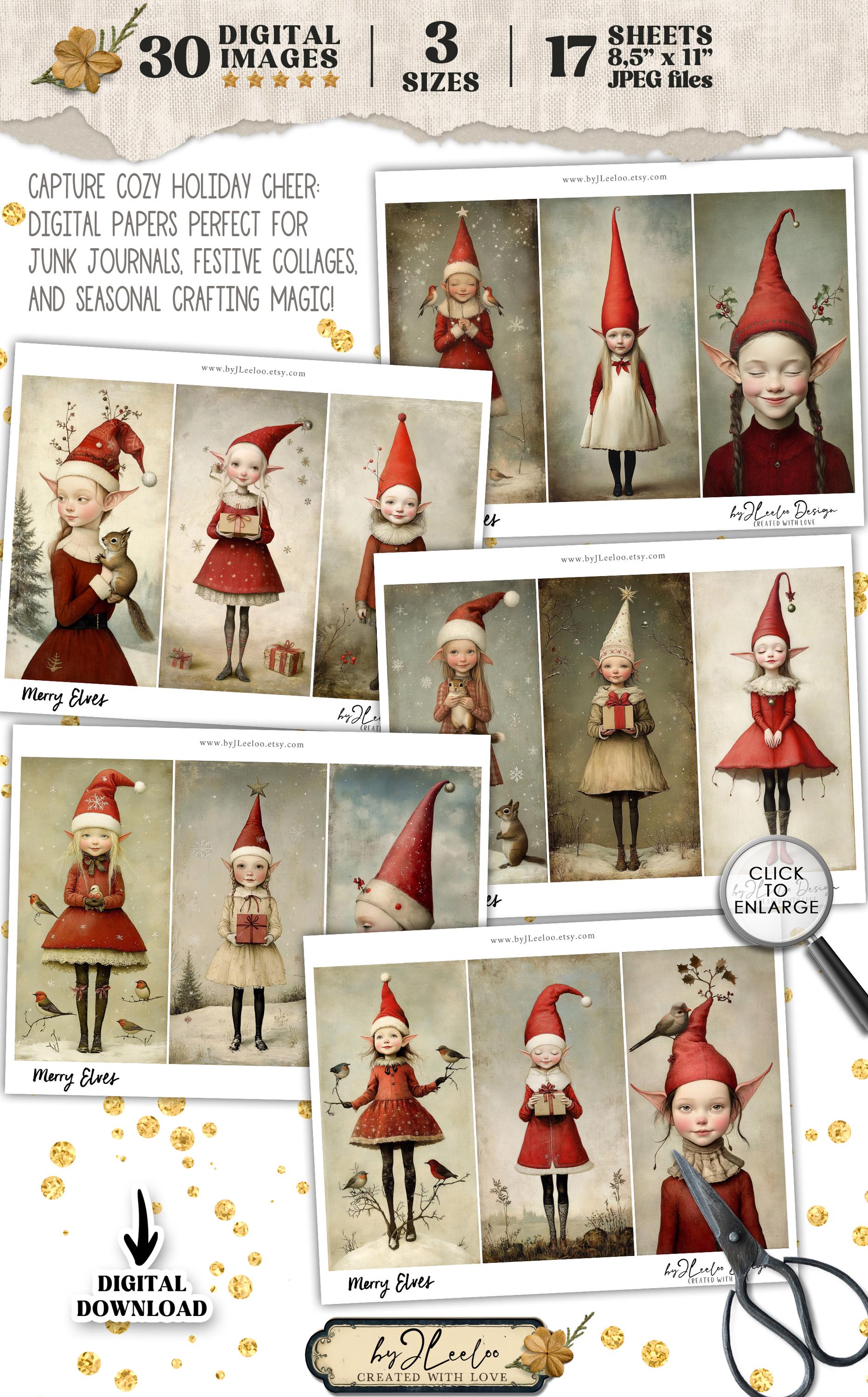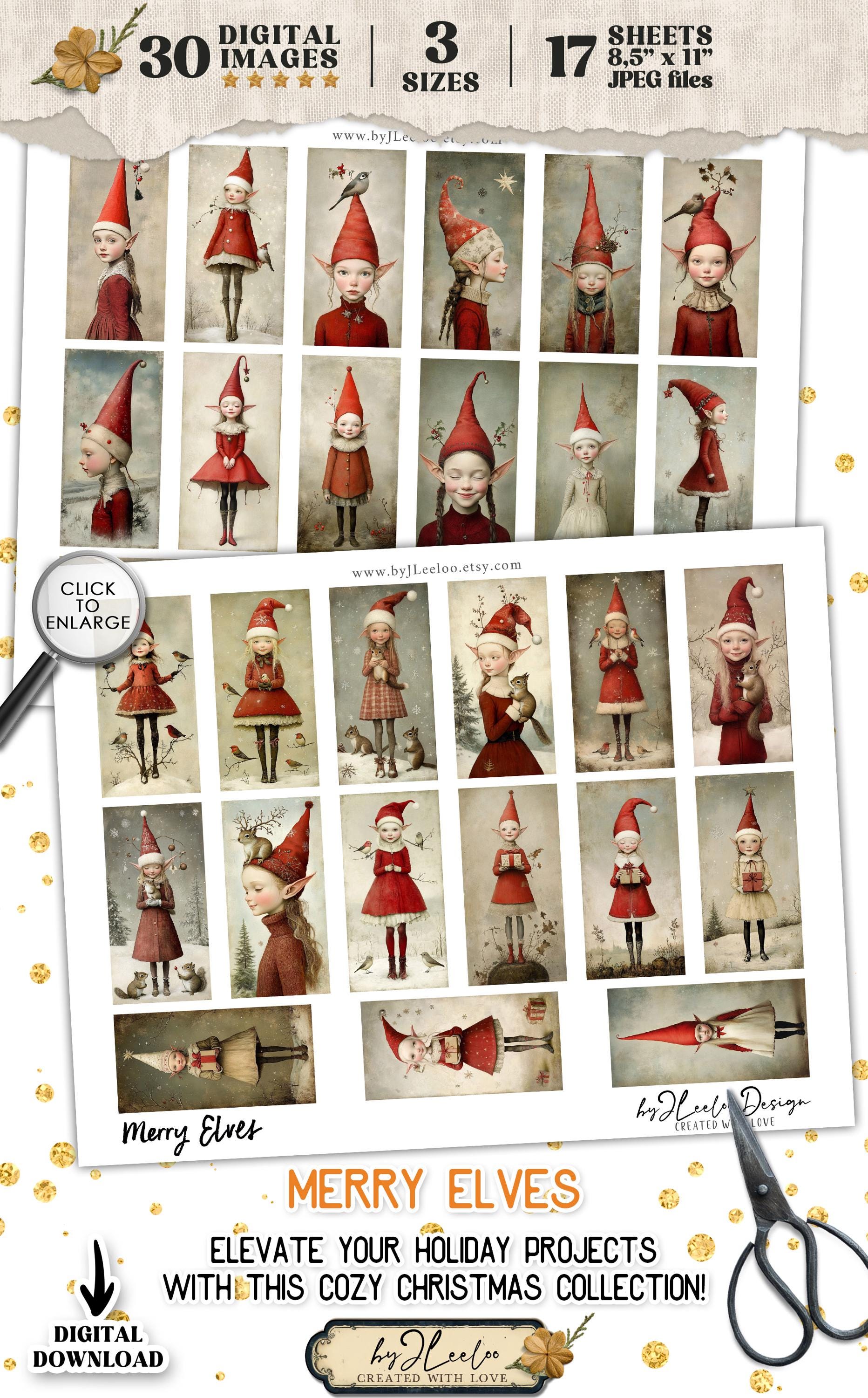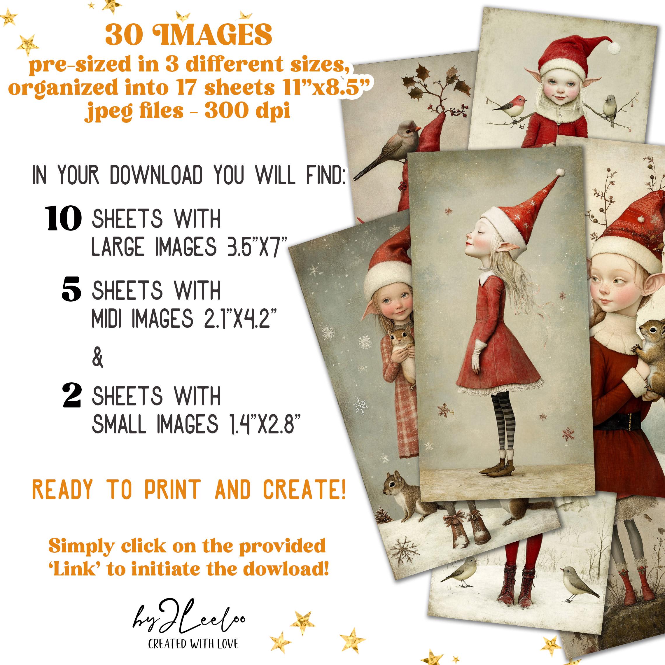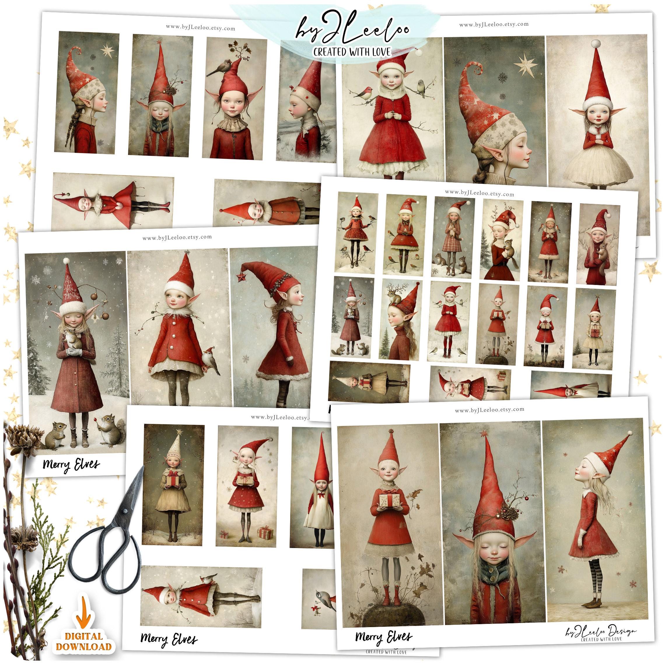MERRY ELVES 30 Images 3 Sizes Christmas cards | Junk Journal printable vintage Scrapbook | Portrait Rustic Label Pixie Gift Tag | CU | pp873