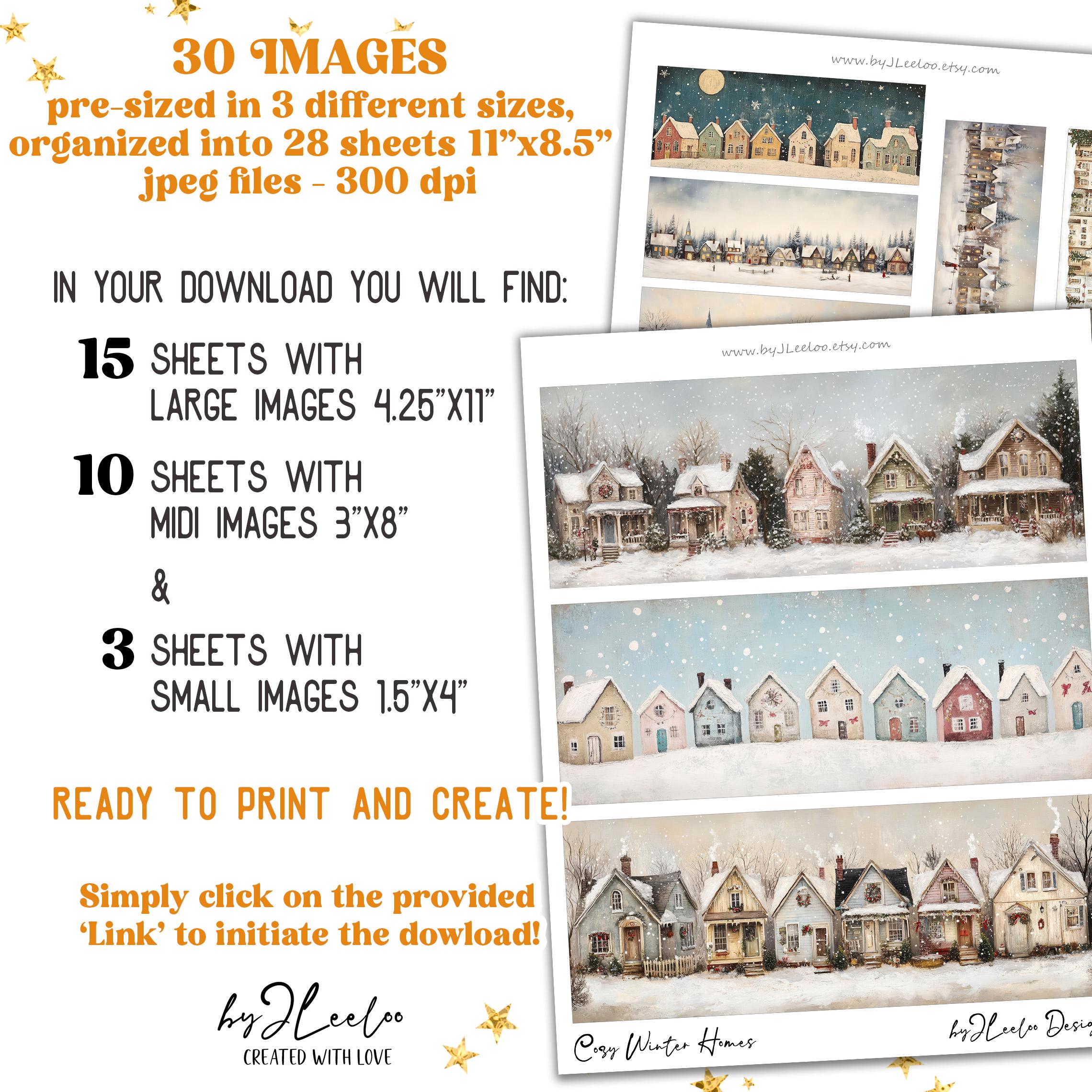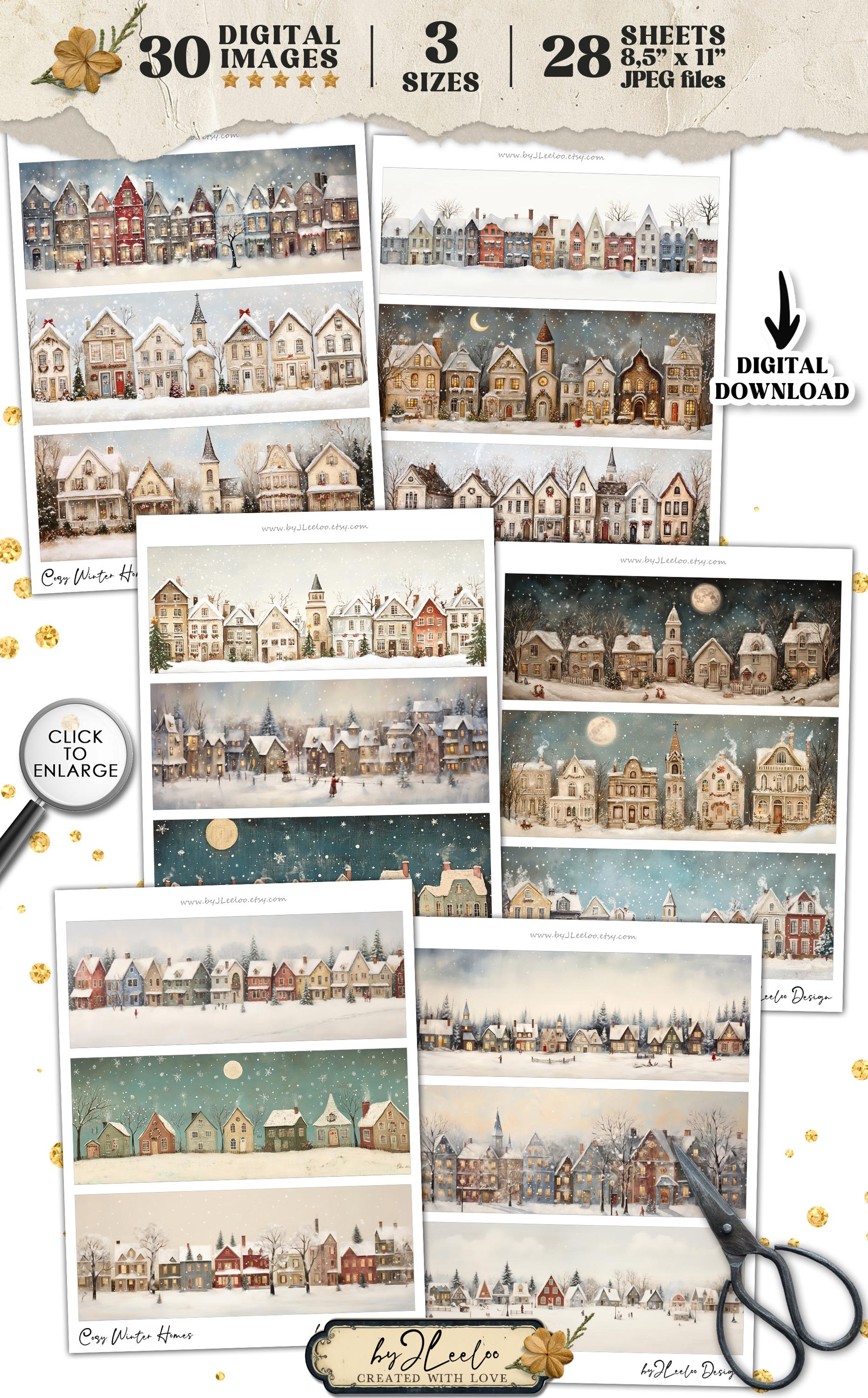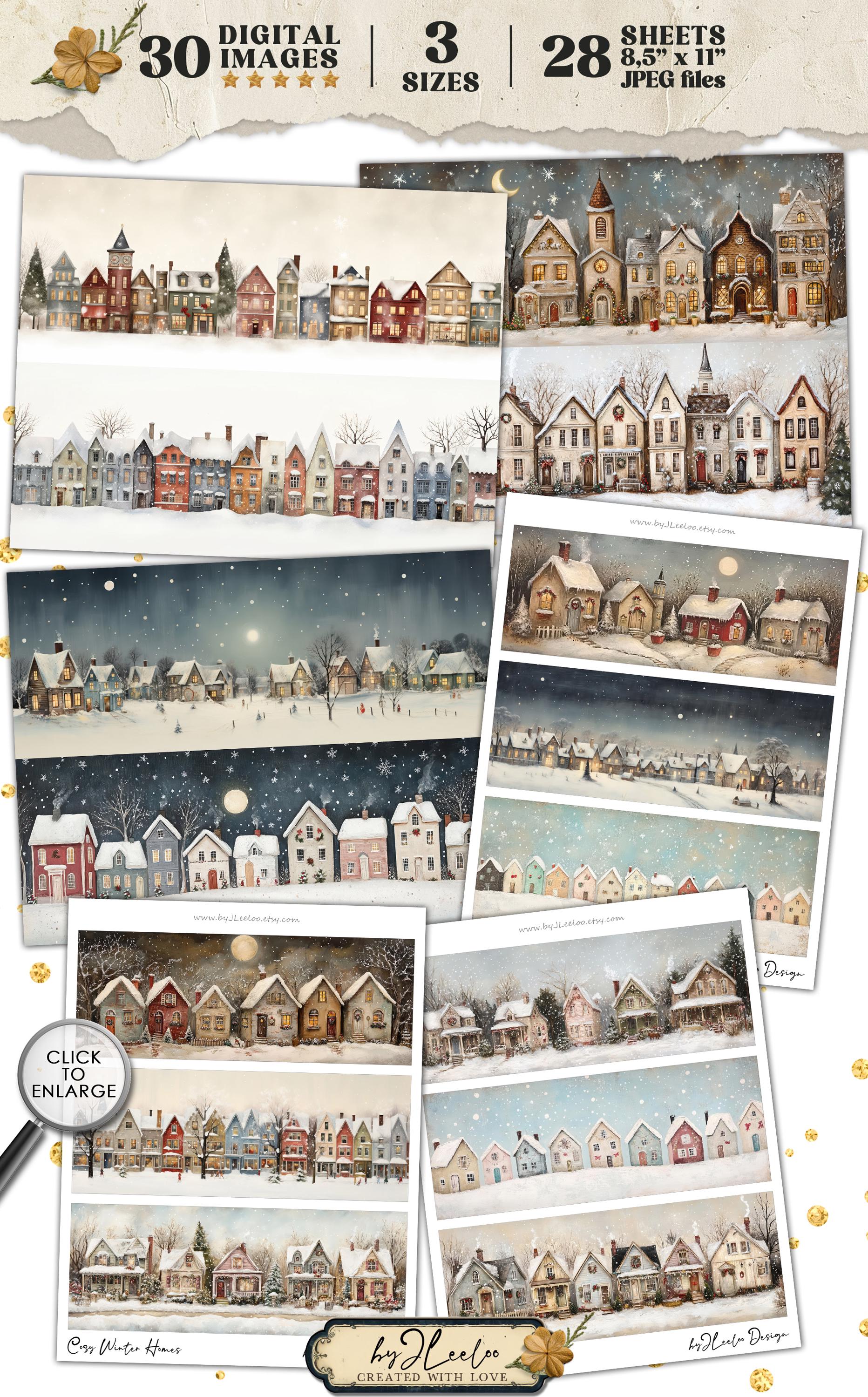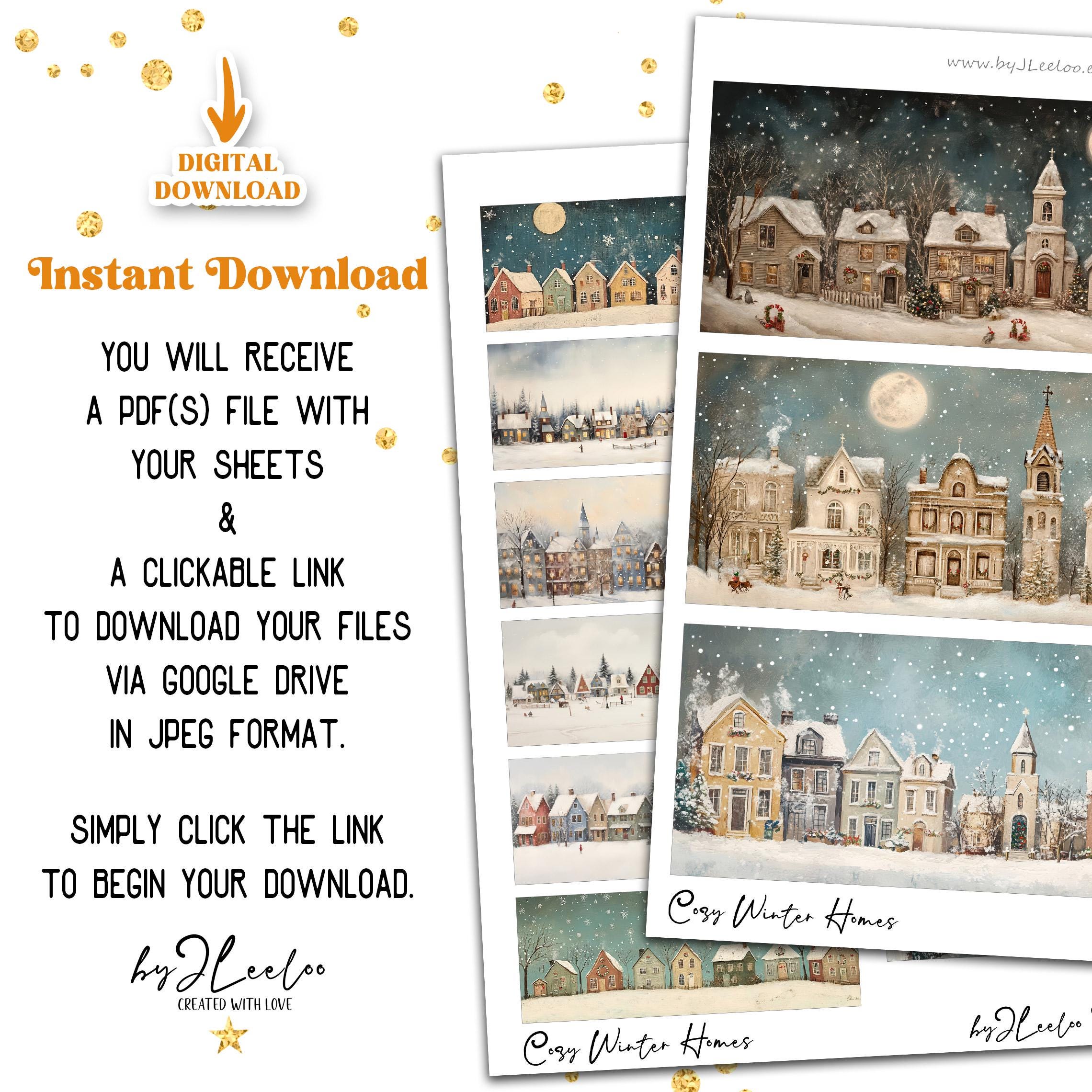 Cozy WINTER HOMES bookmarks 3 sizes | Christmas landscape illustration wrapper decor gift| Label tag printable | Digital Download CU | bm120