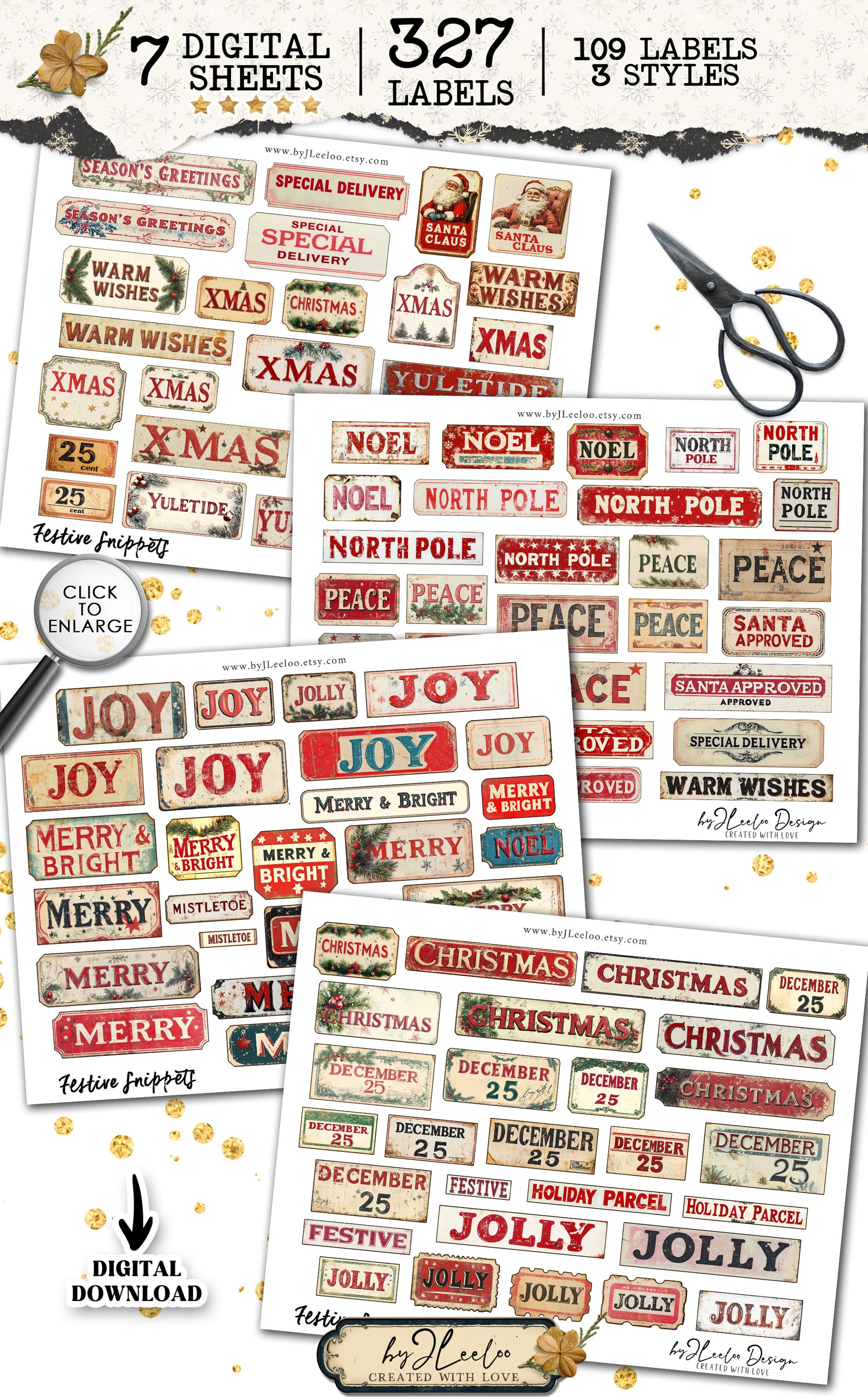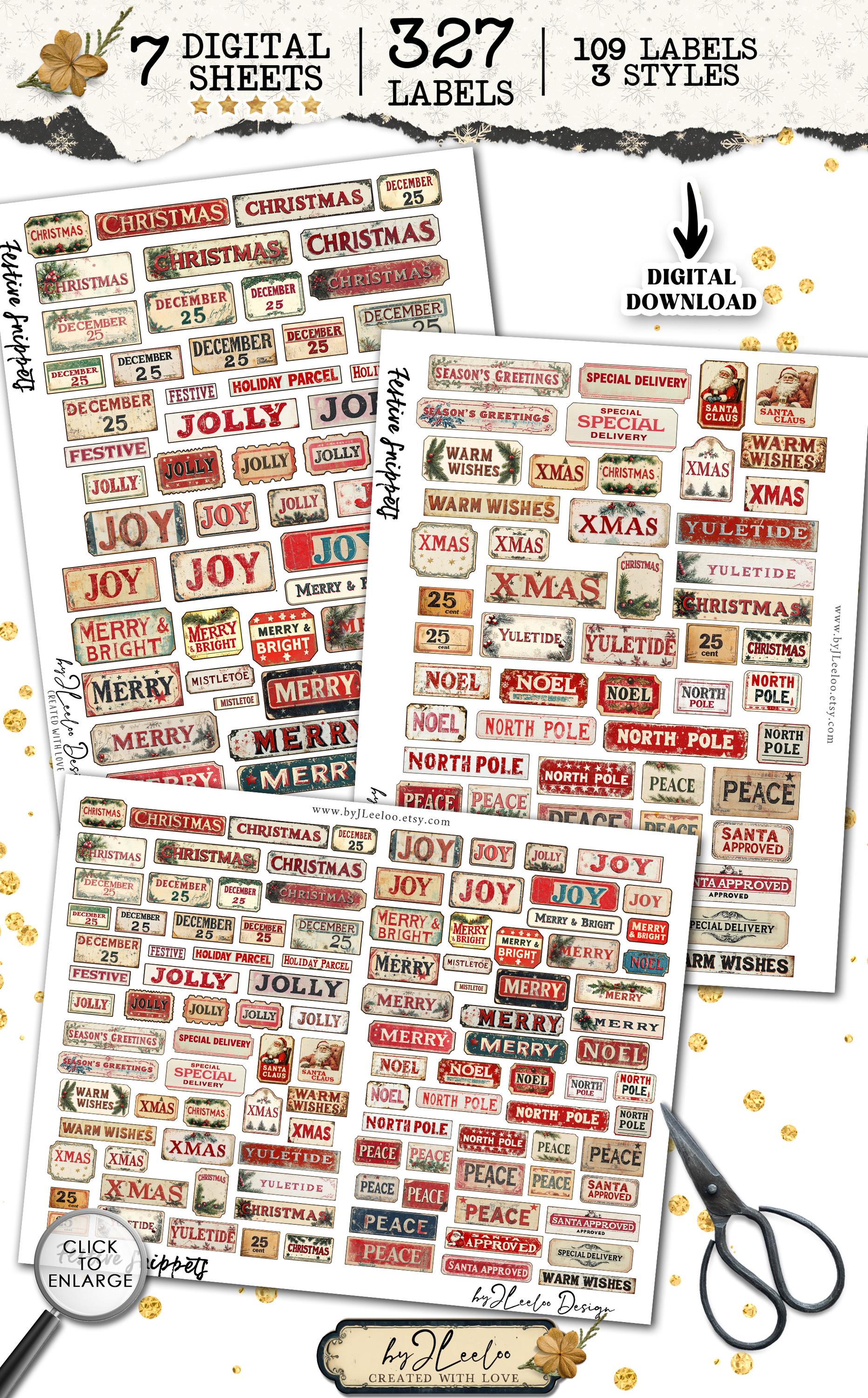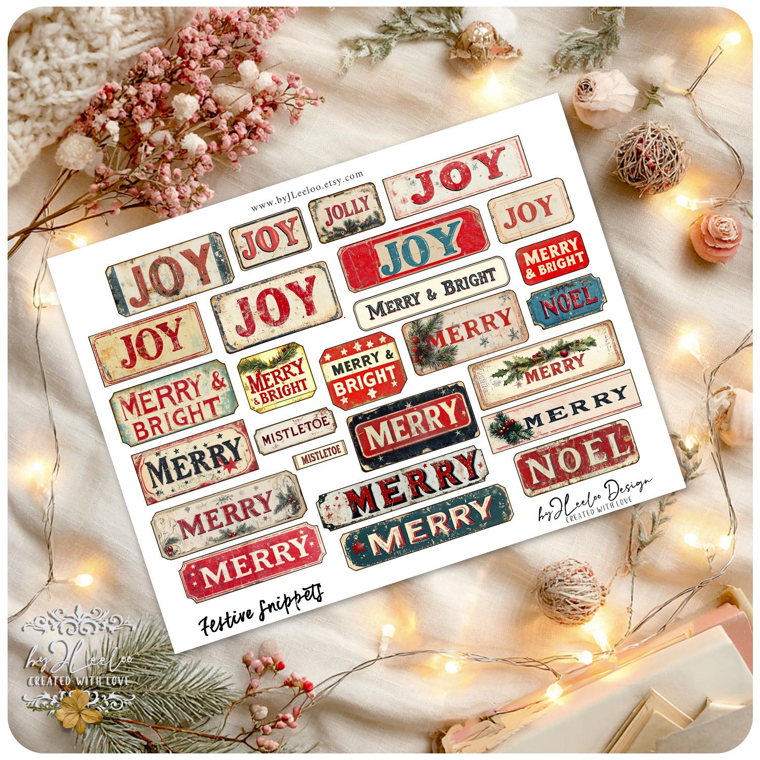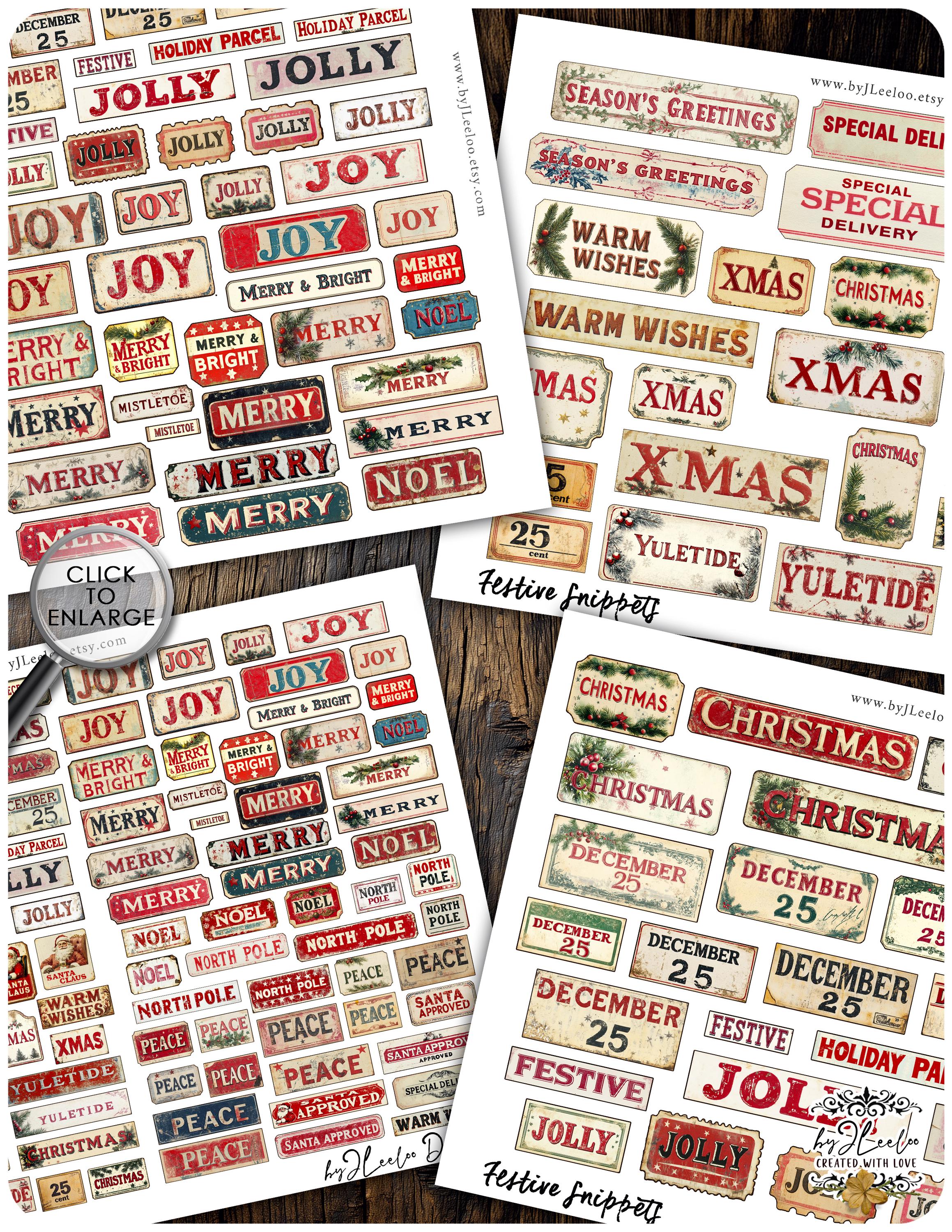 FESTIVE SNIPPETS printable Christmas words | Vintage Labels Antique Stickers Holidays Junk journal | scrapbooking collection art CU | tl306