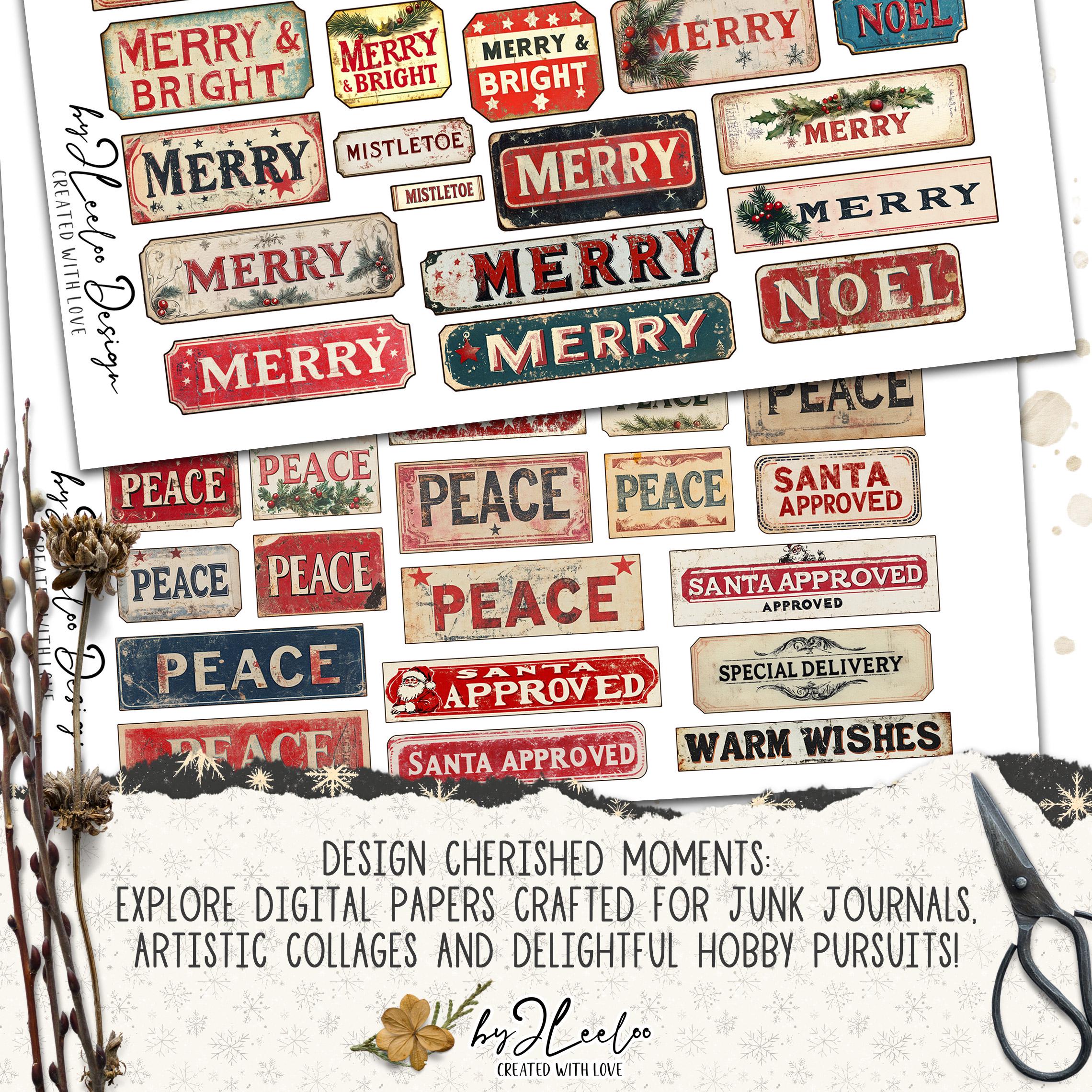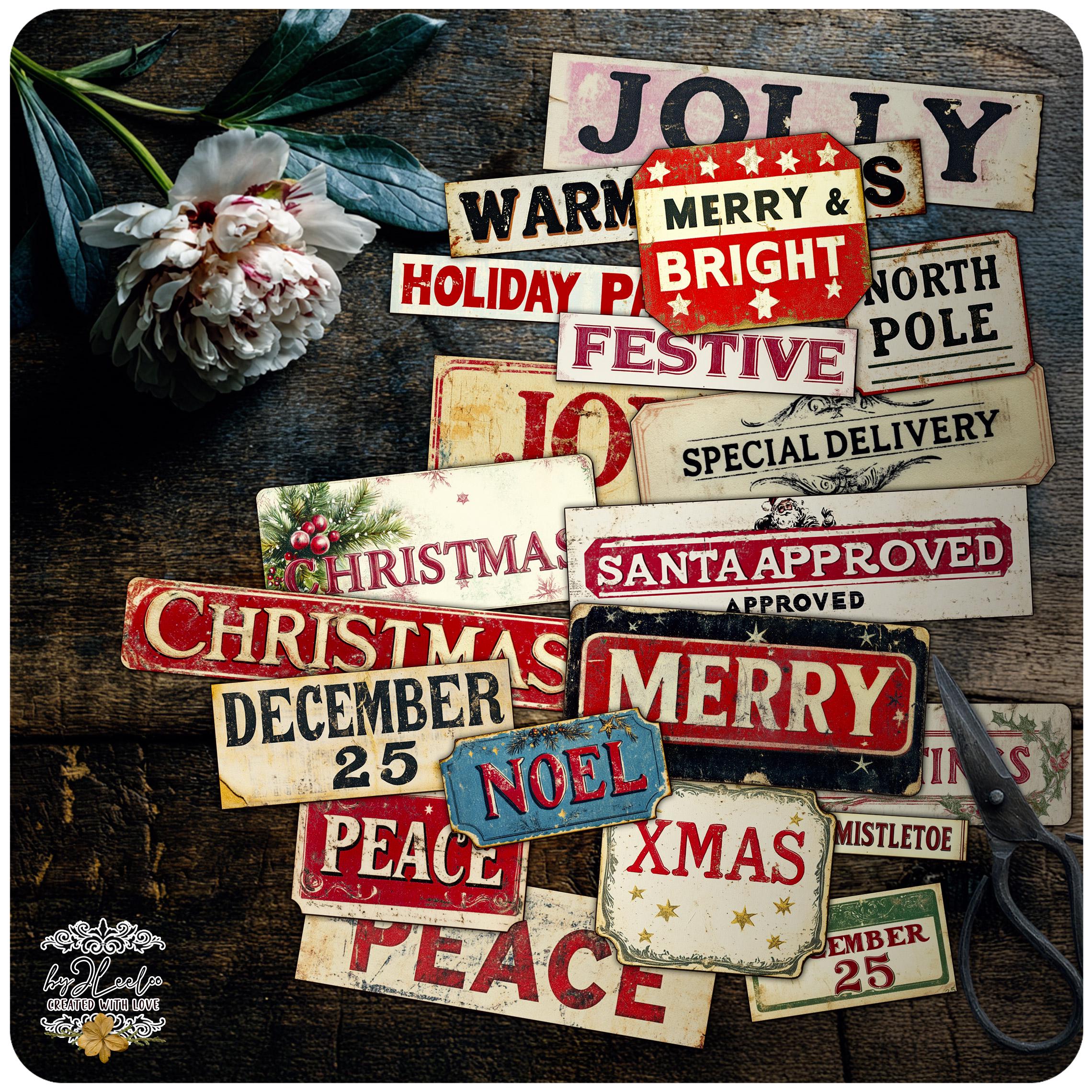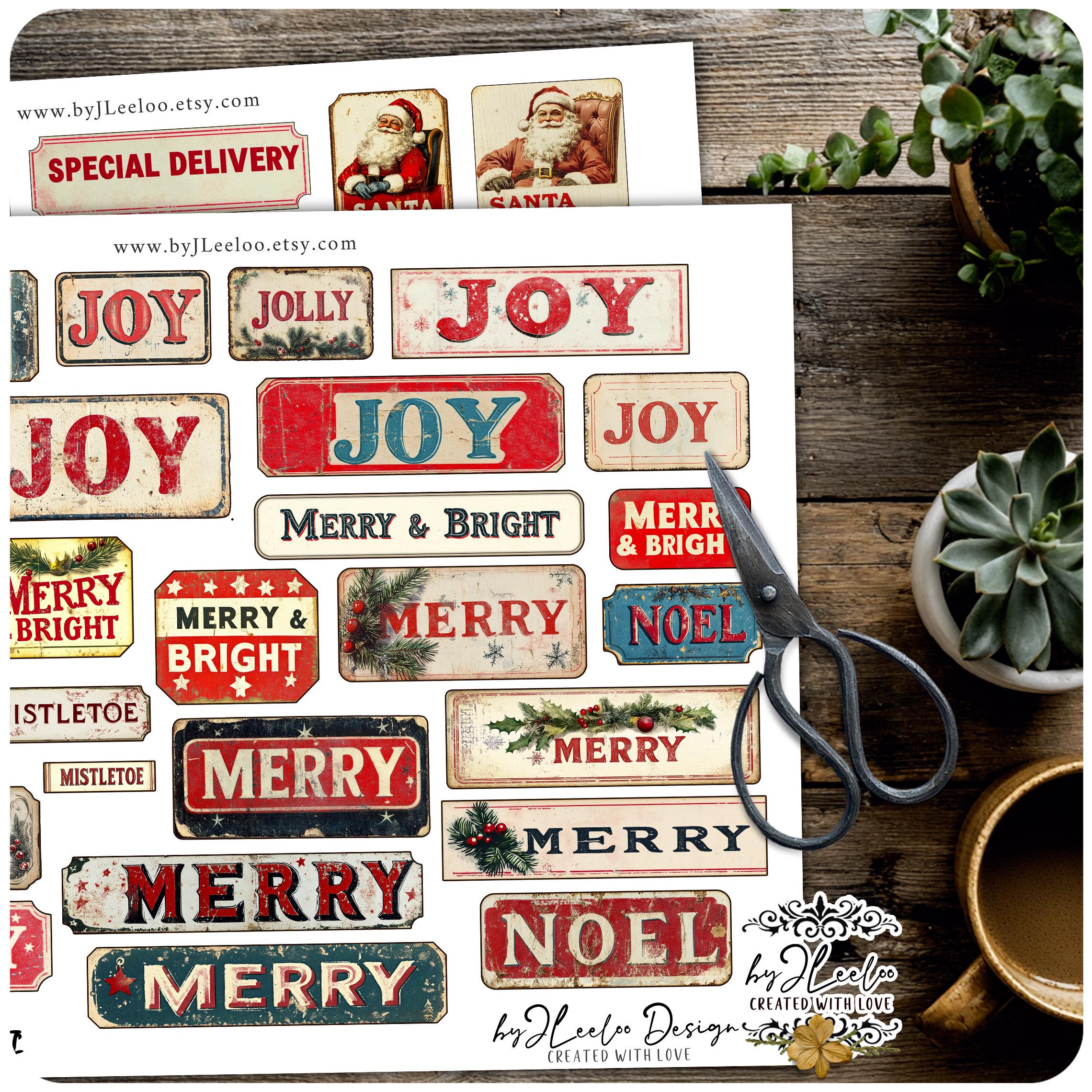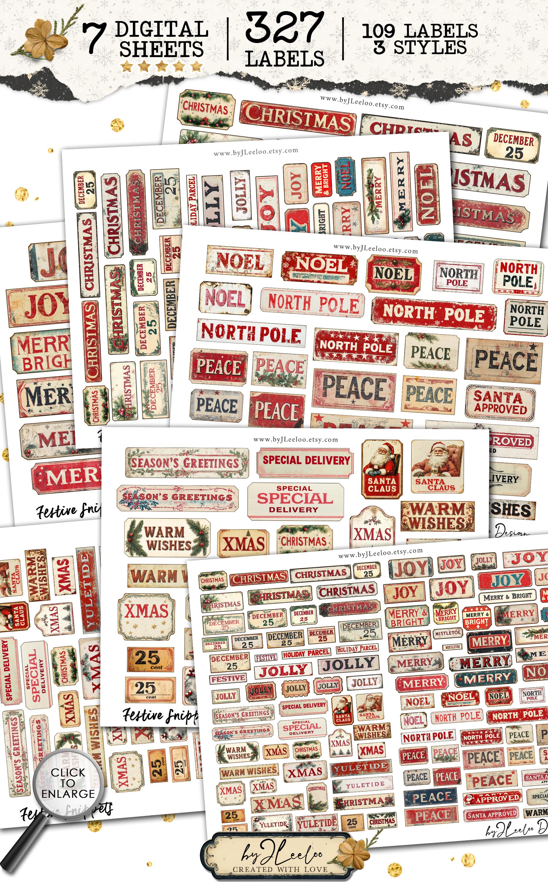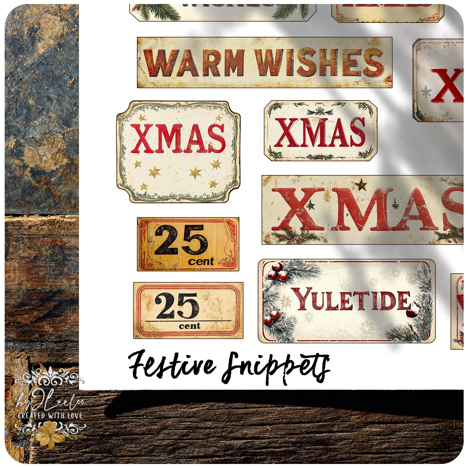 FESTIVE SNIPPETS printable Christmas words | Vintage Labels Antique Stickers Holidays Junk journal | scrapbooking collection art CU | tl306