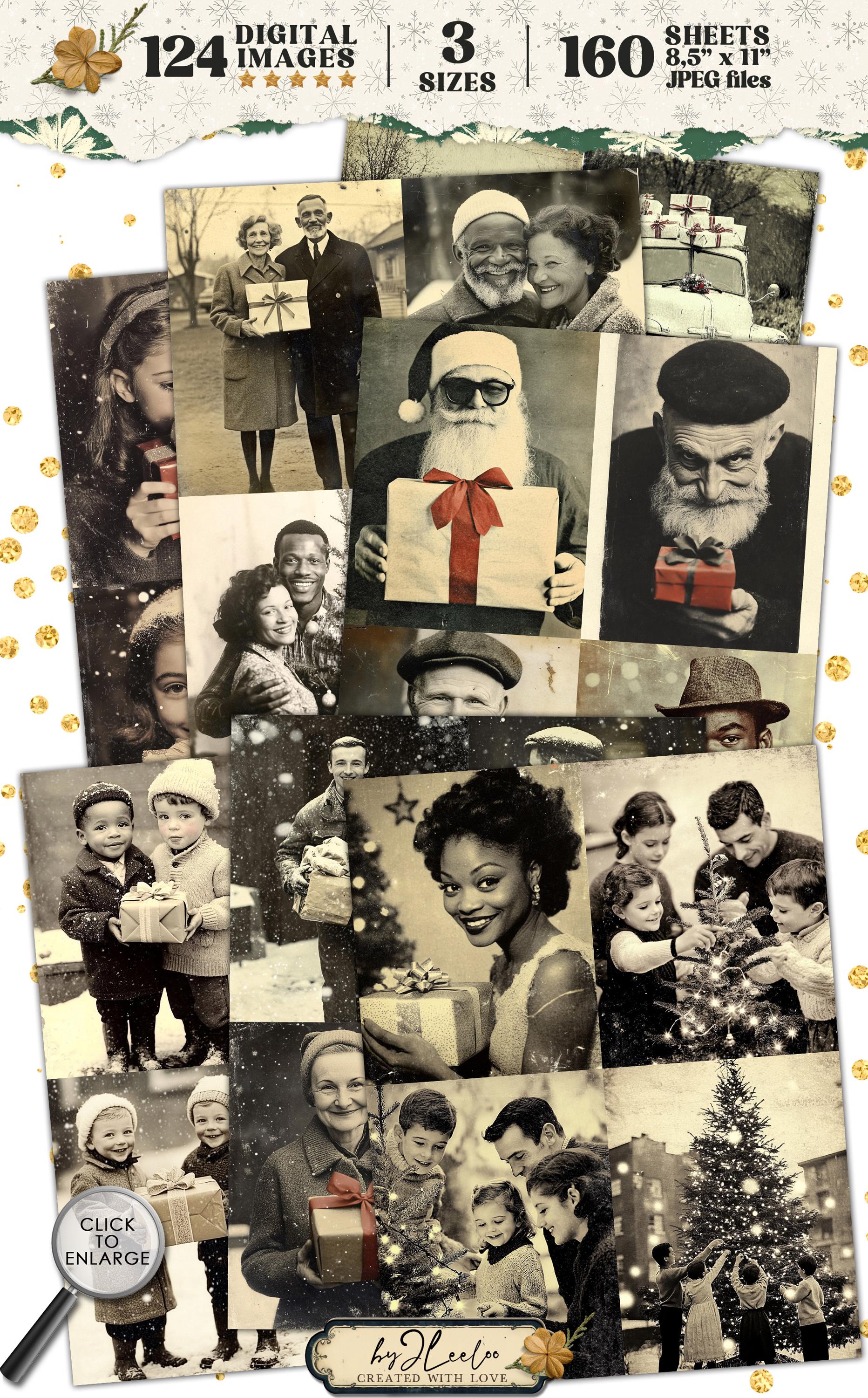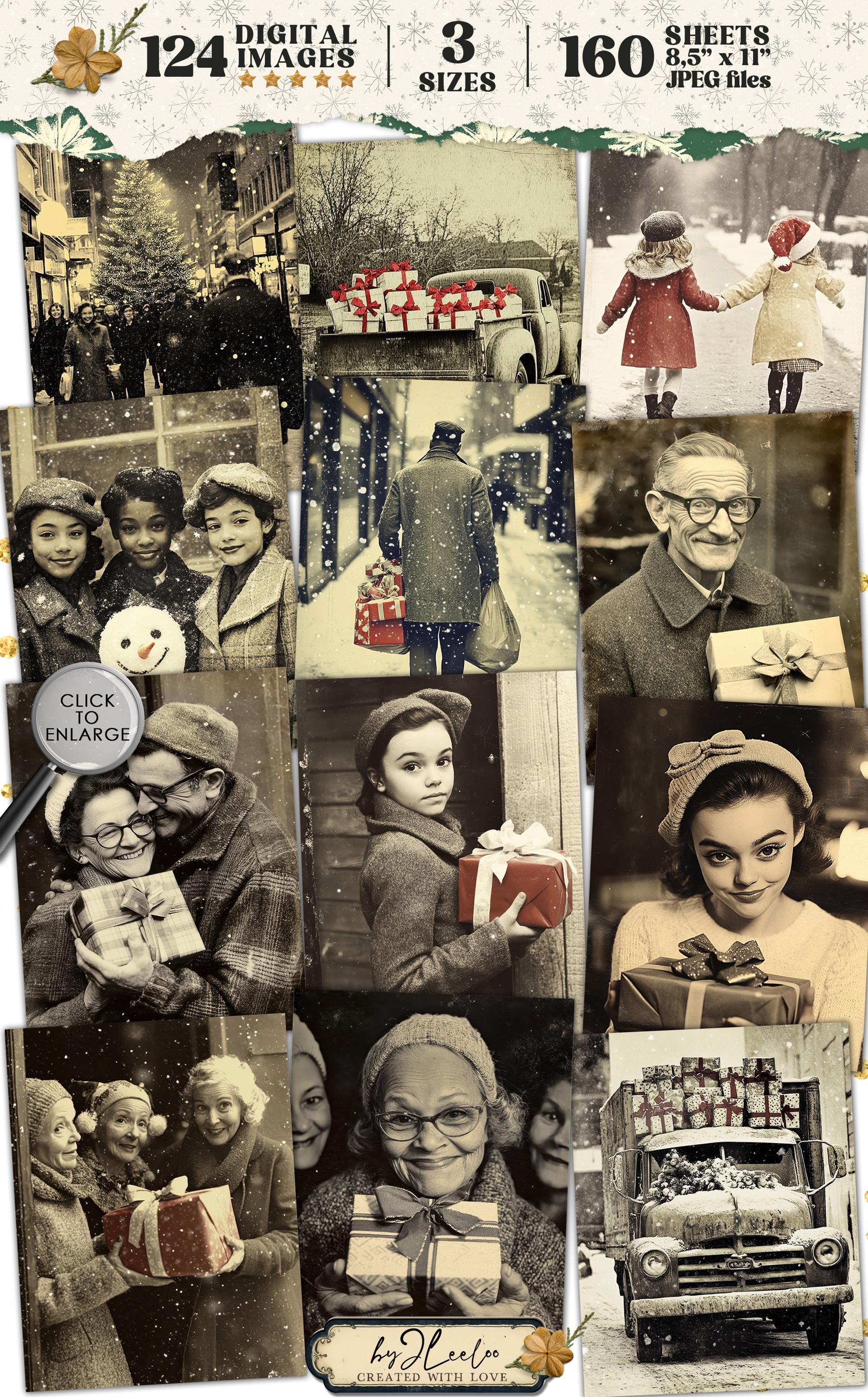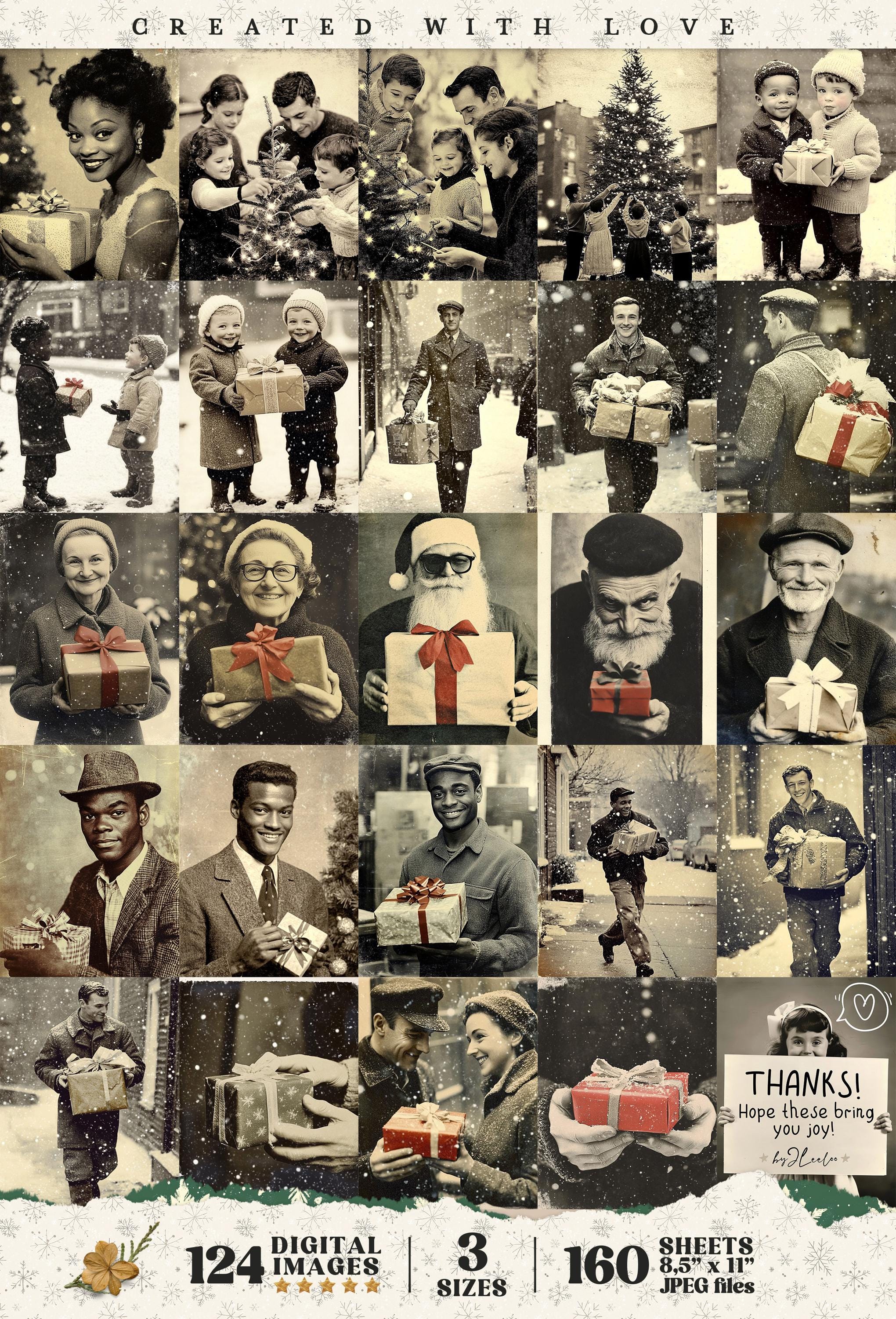๐ Hey crafters! Celebrate the joy of giving this season with our charming collection of 124 vintage-inspired photos in sepia, black and white, and hand-tinted tones. Featuring smiling children, couples, Santa Claus, delivery men, and snowy scenes with festive packages, this versatile collection is offered in three sizes. Perfect for wall decor, journaling, scrapbooking, invitations, gift tags, collages, jewelry-making, and more, these nostalgic images add a touch of holiday magic to all your creative projects! โ๏ธ