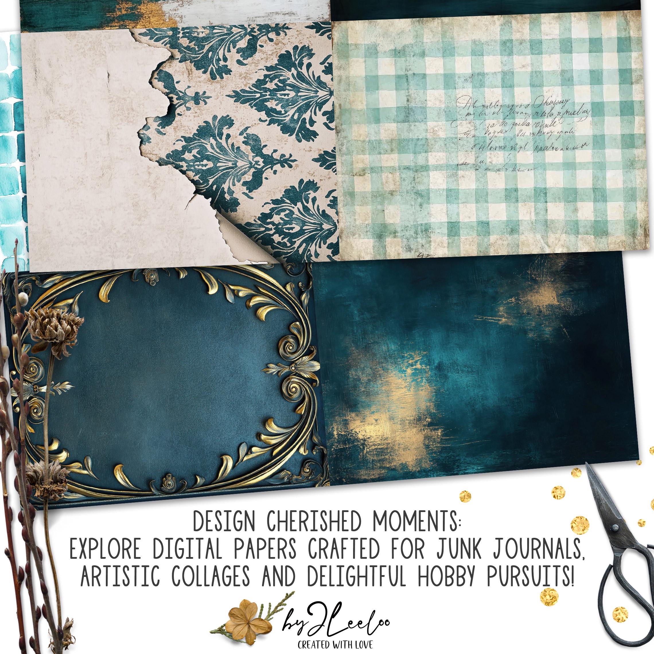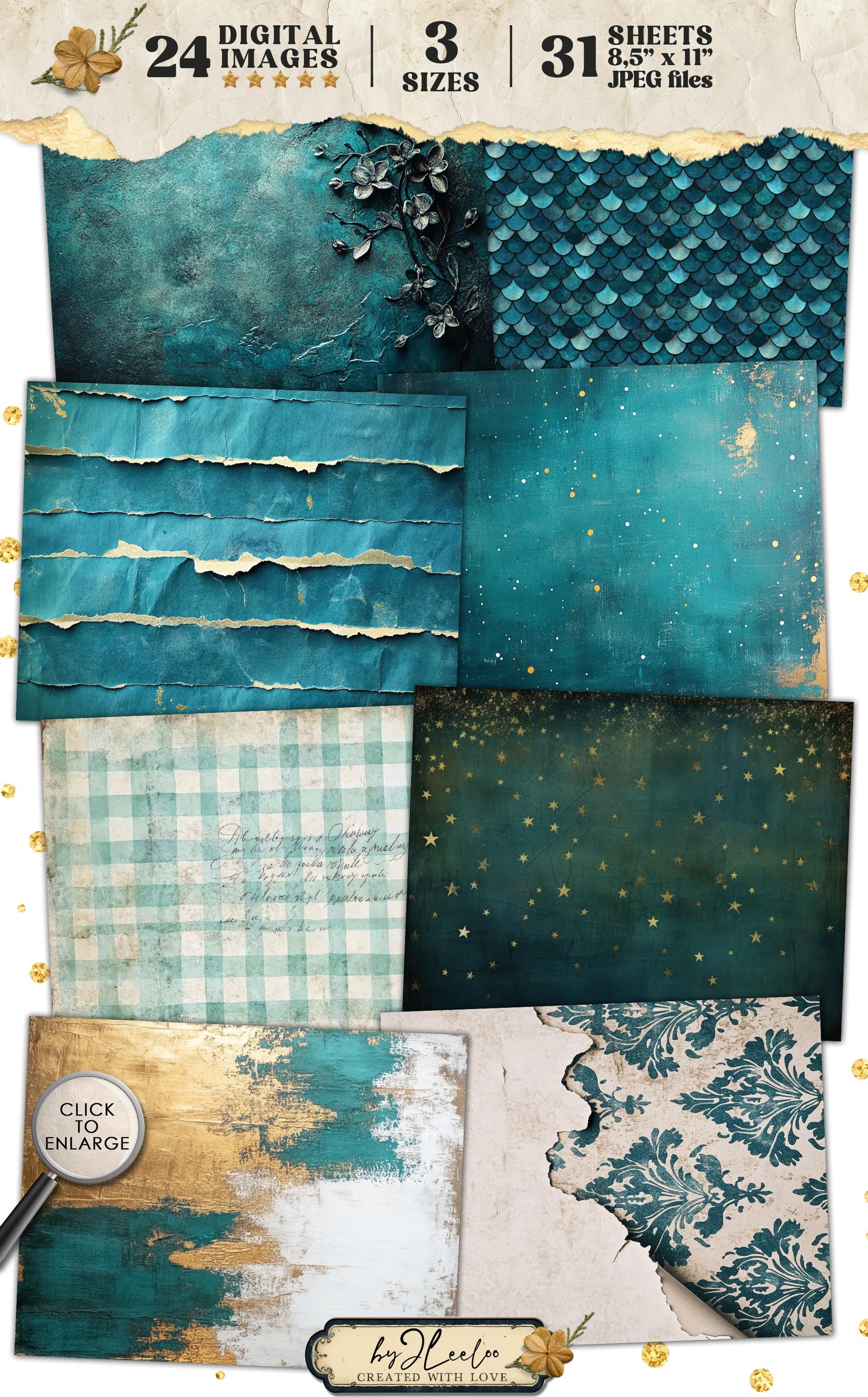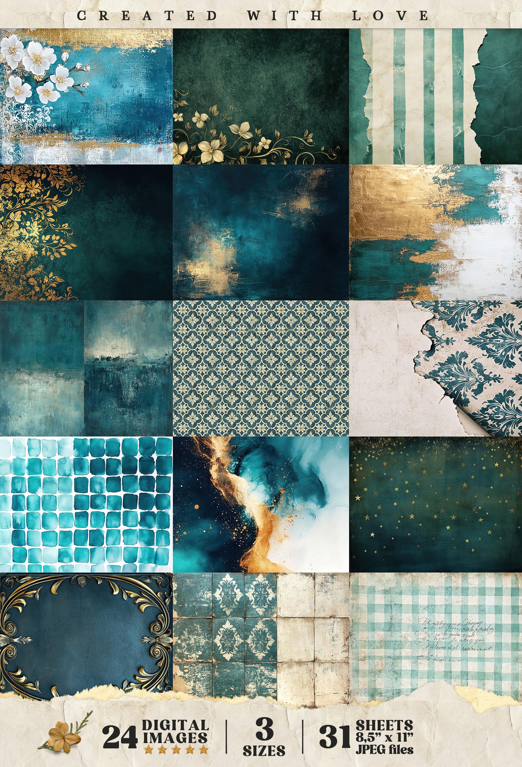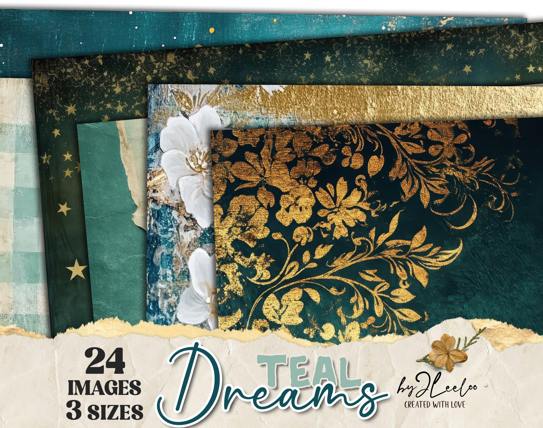 TEAL DREAMS 24 papers 3 Size | Mix background blue and gold backdrop | Printable for Junk Journal scrapbook digital Commercial Use | pp890