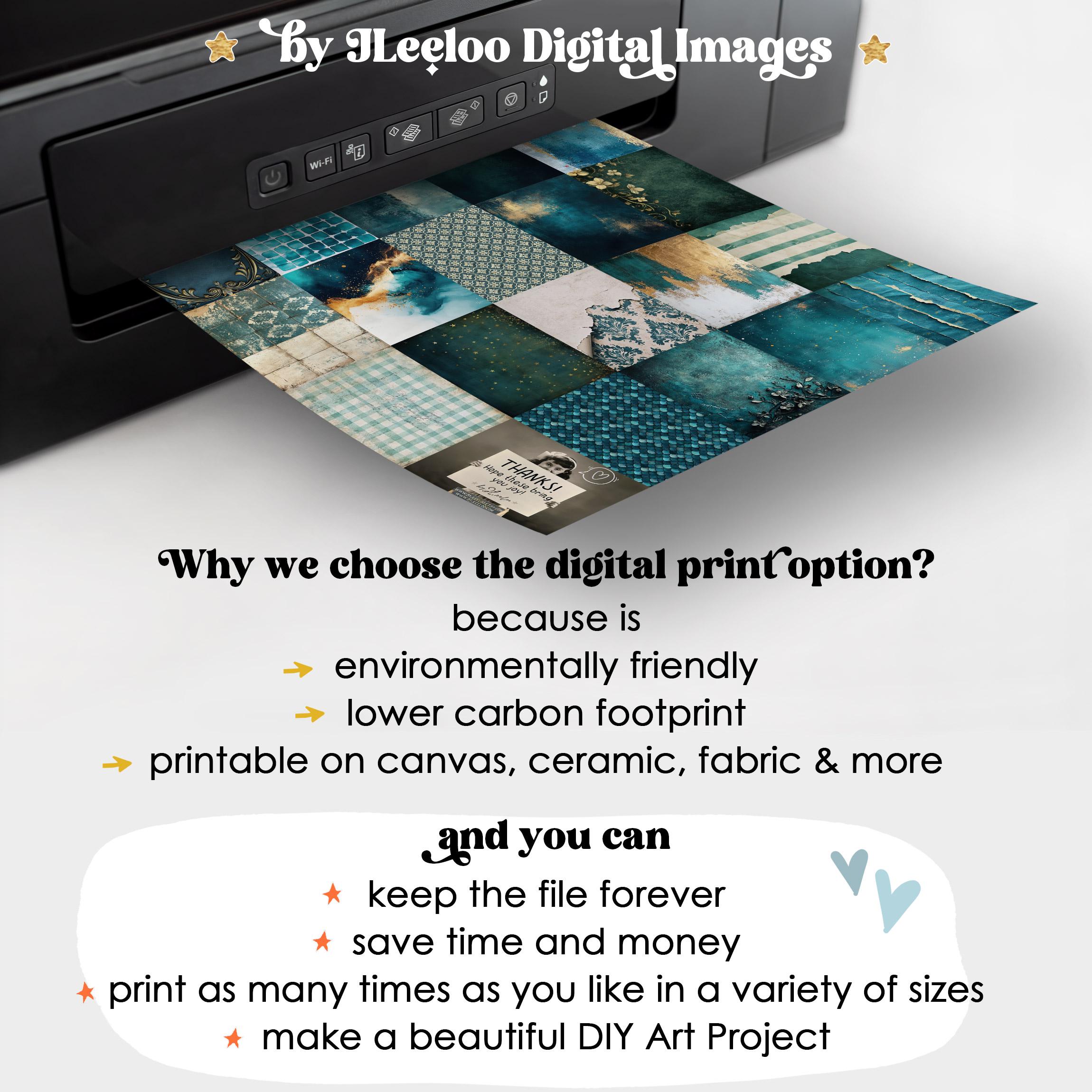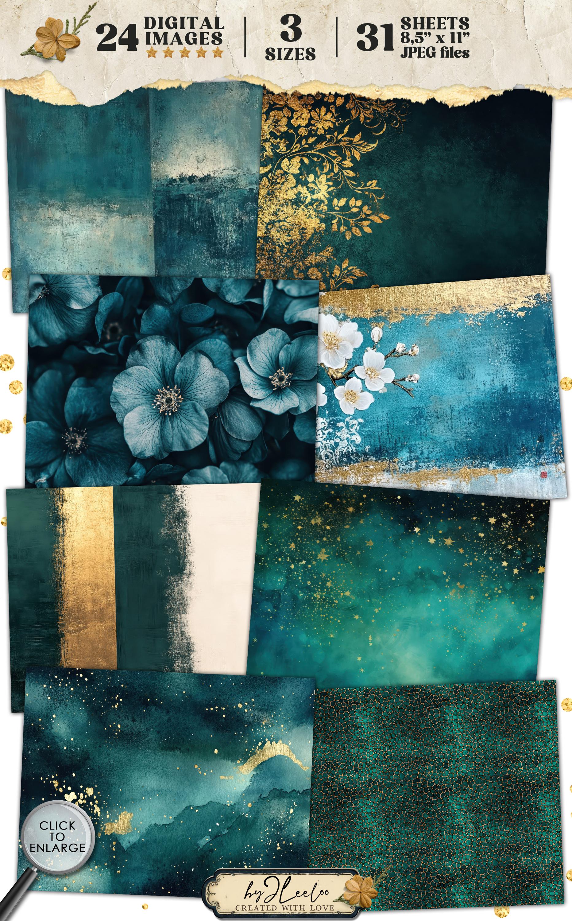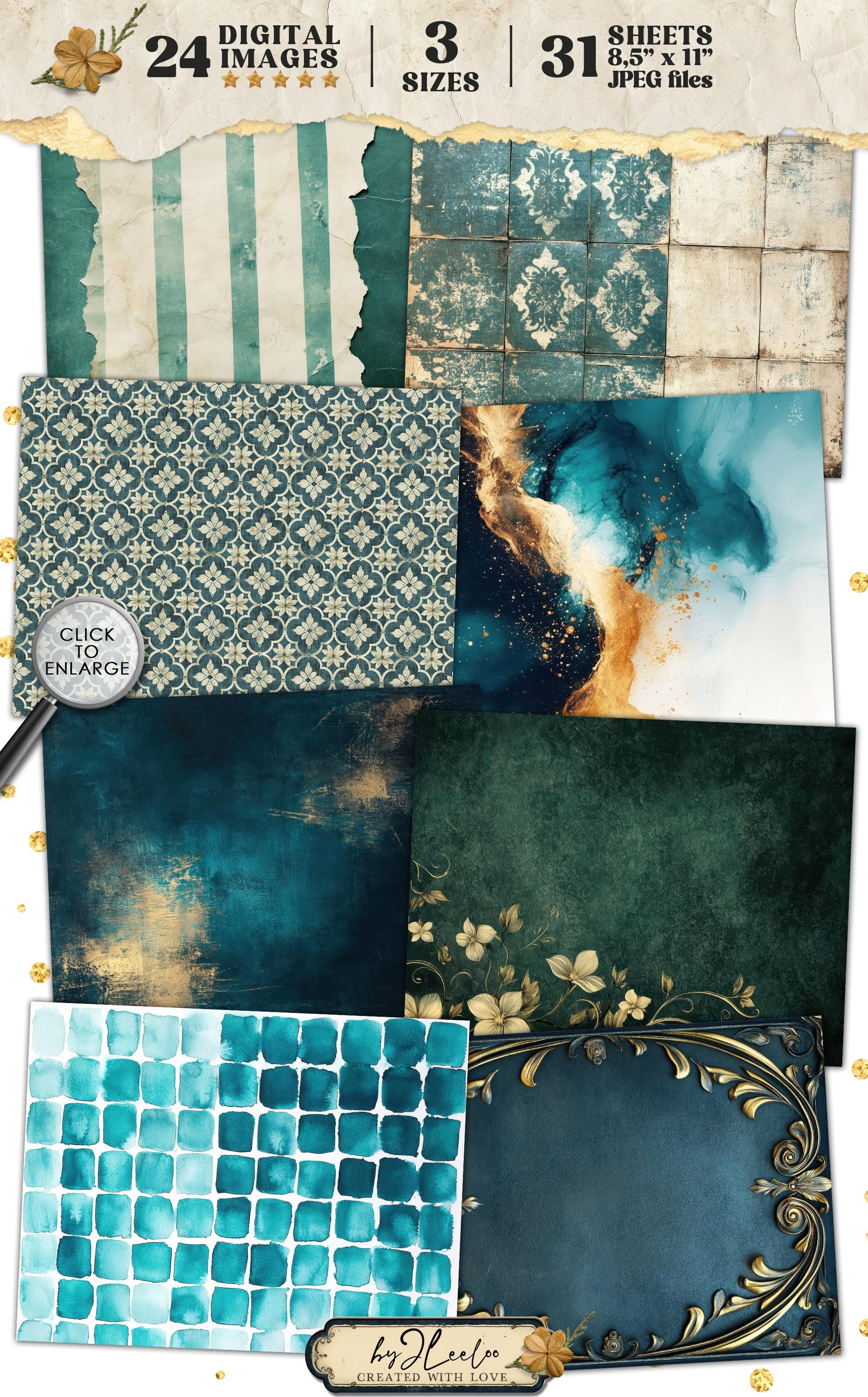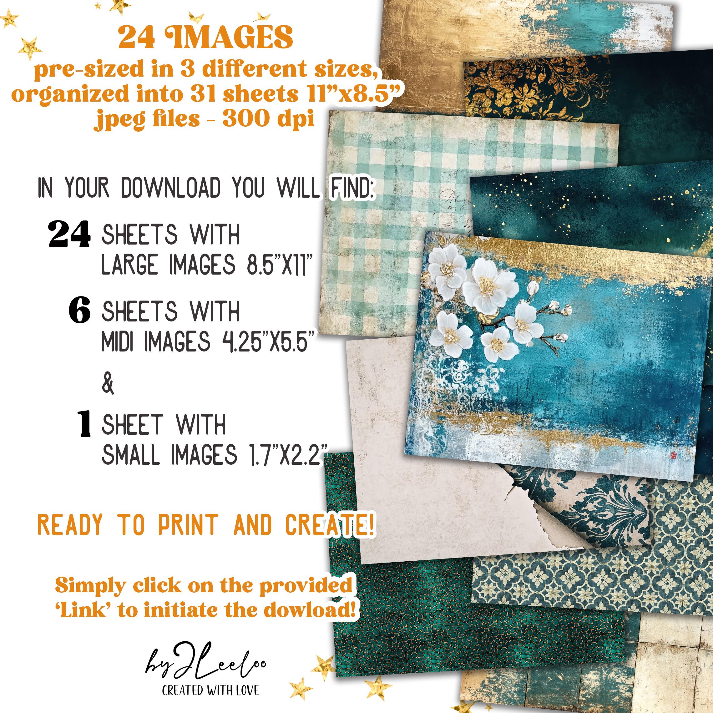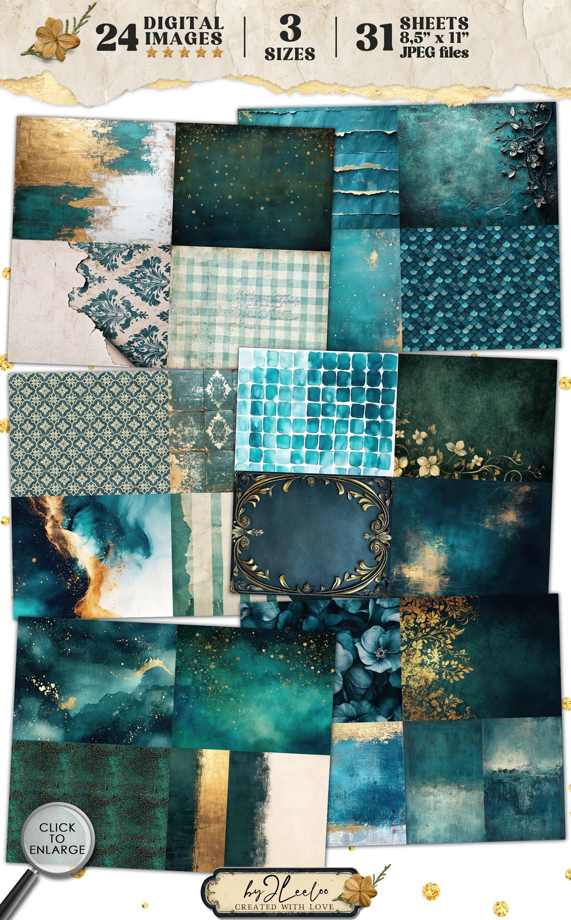 TEAL DREAMS 24 papers 3 Size | Mix background blue and gold backdrop | Printable for Junk Journal scrapbook digital Commercial Use | pp890