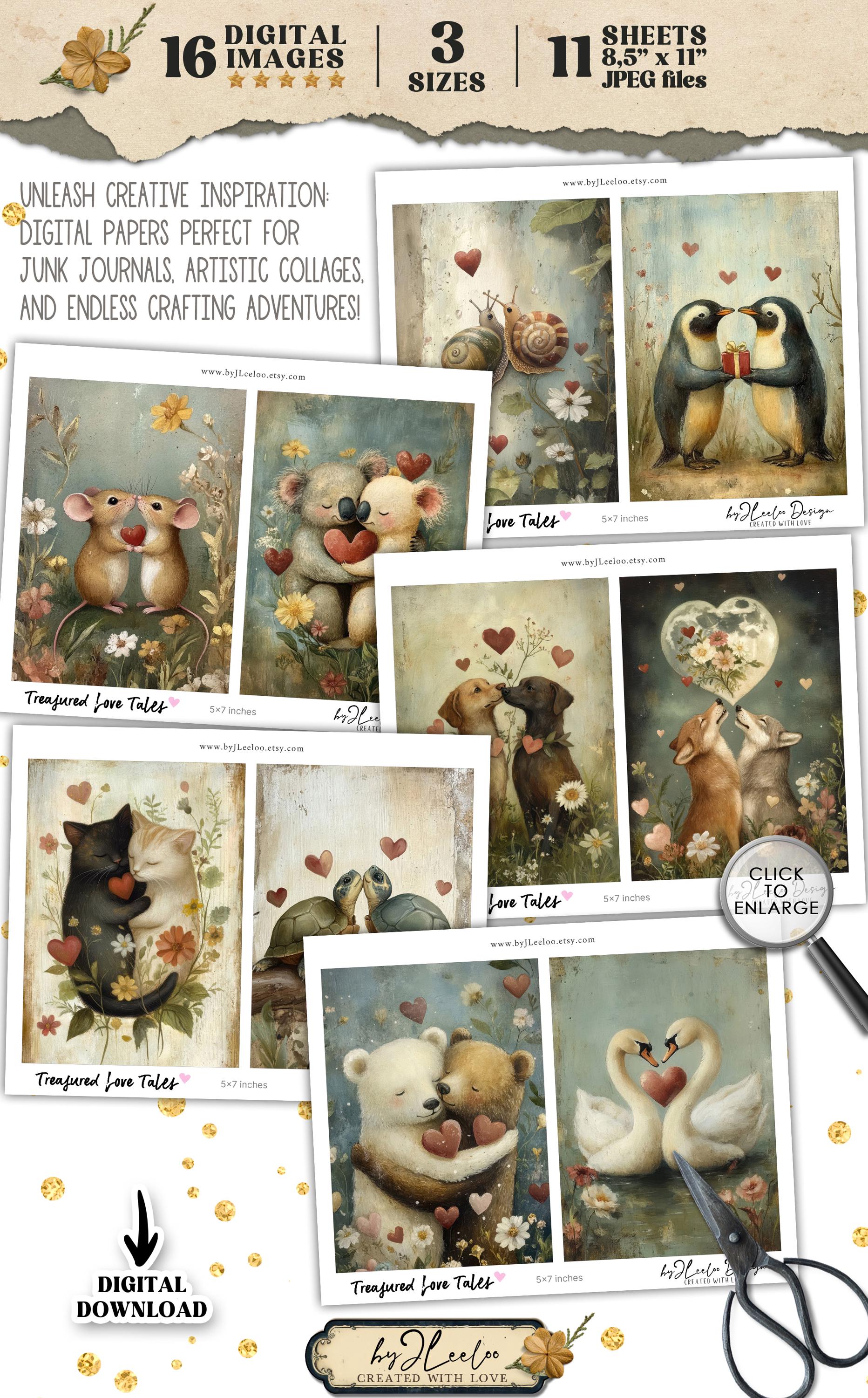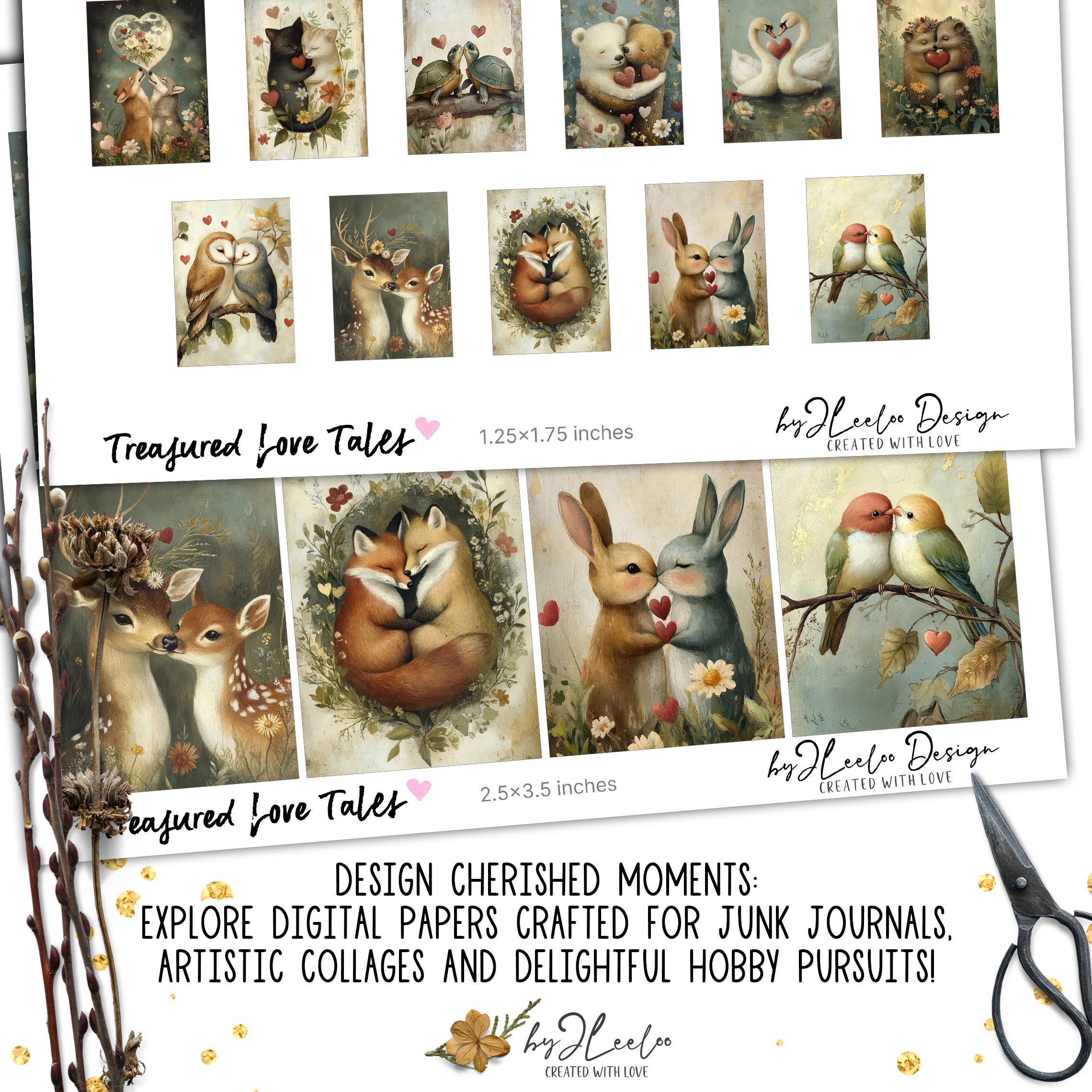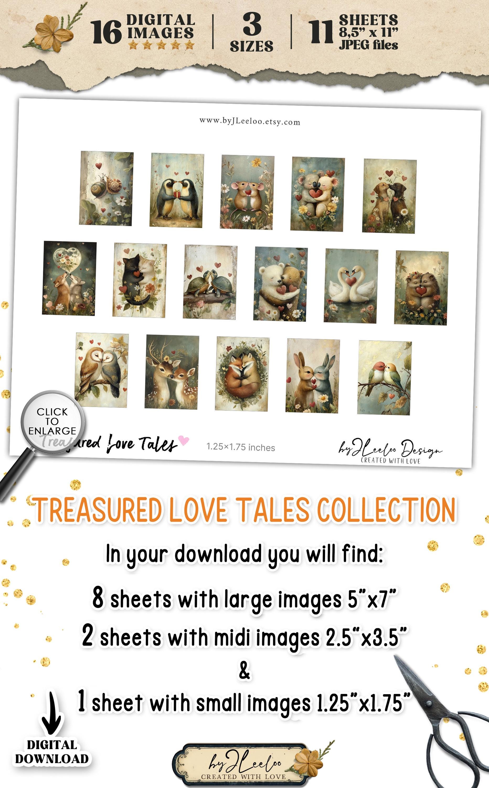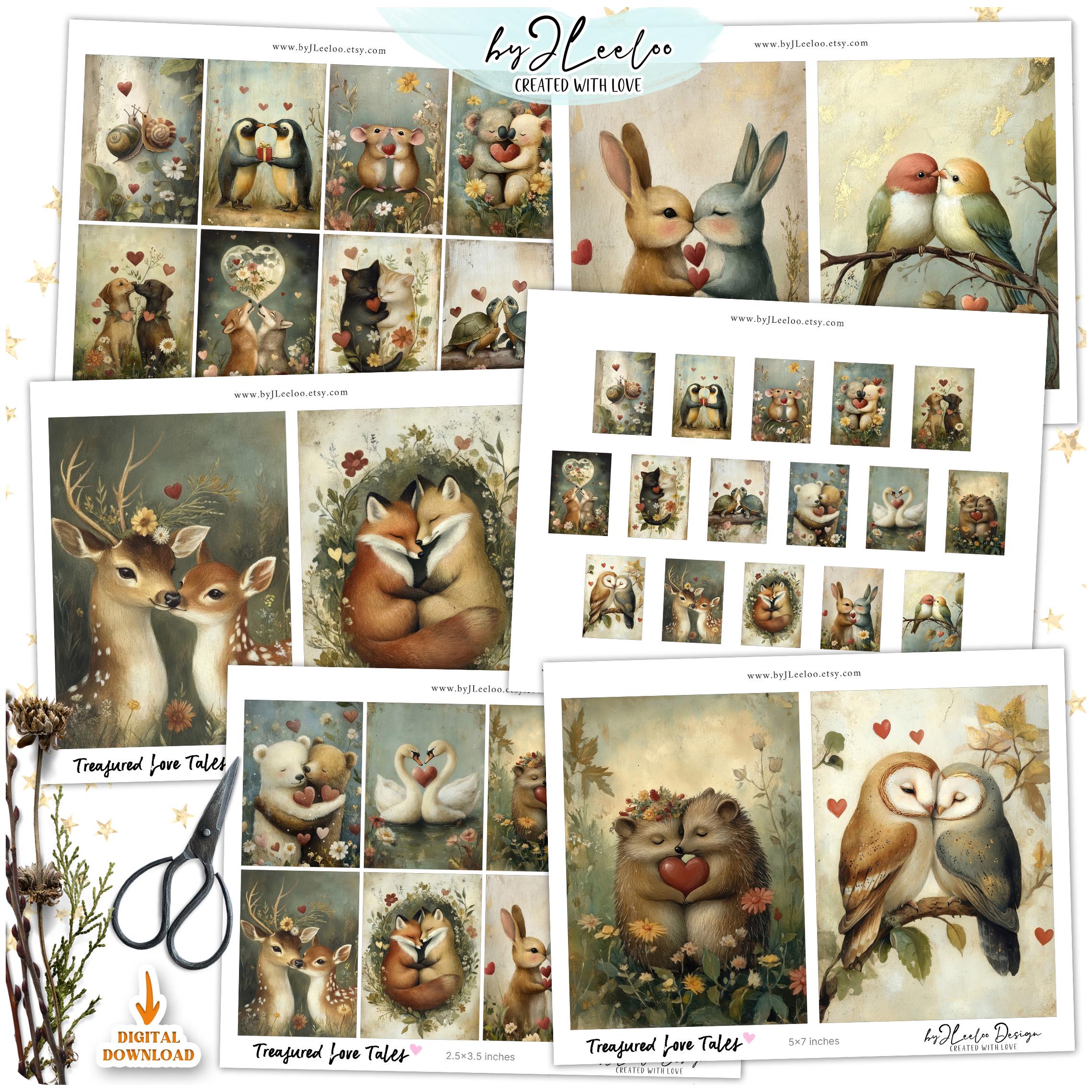 TREASURED LOVE TALES 3 sizes | Valentine card journal printable vintage supplies | animals in love illustration scrapbook romantic | pp913