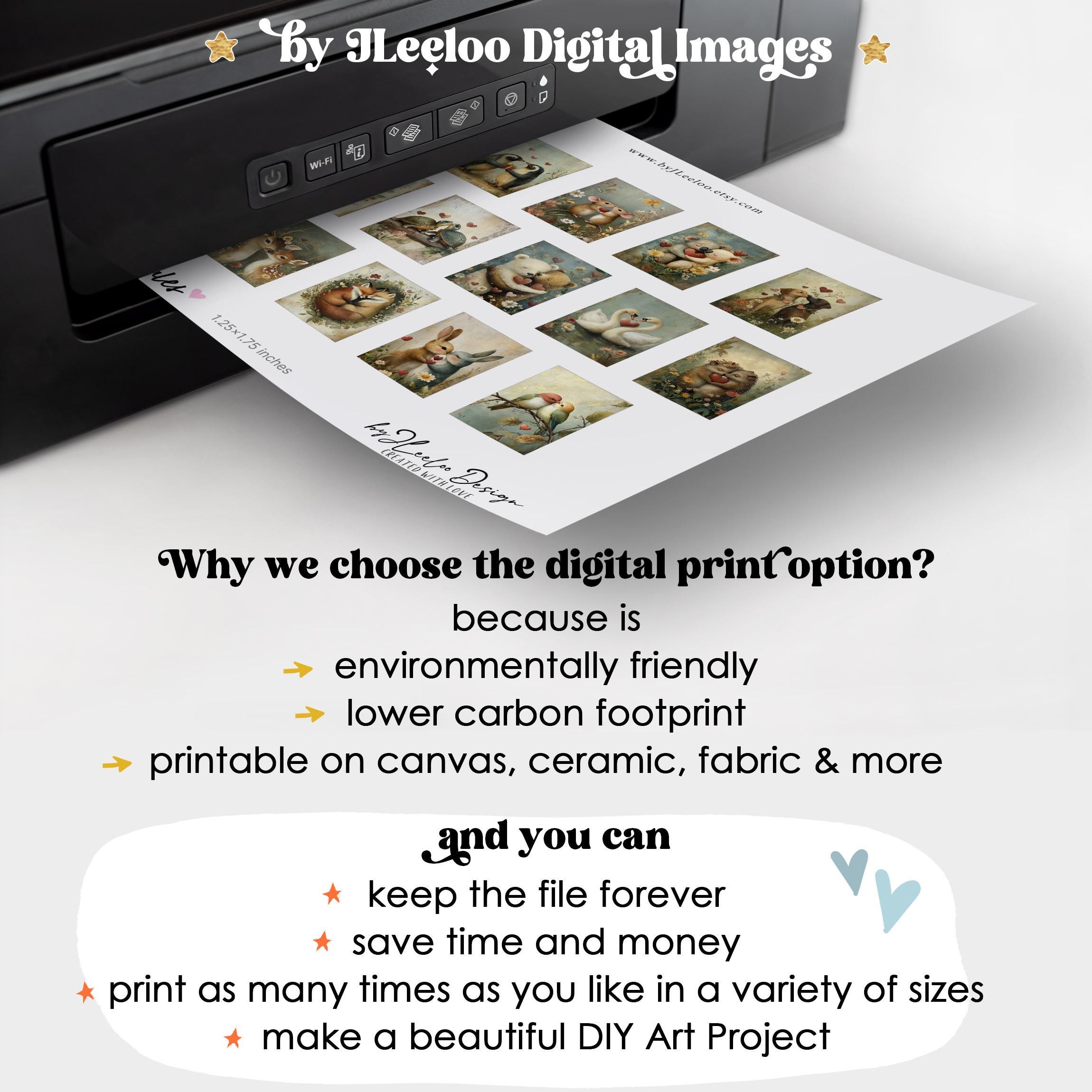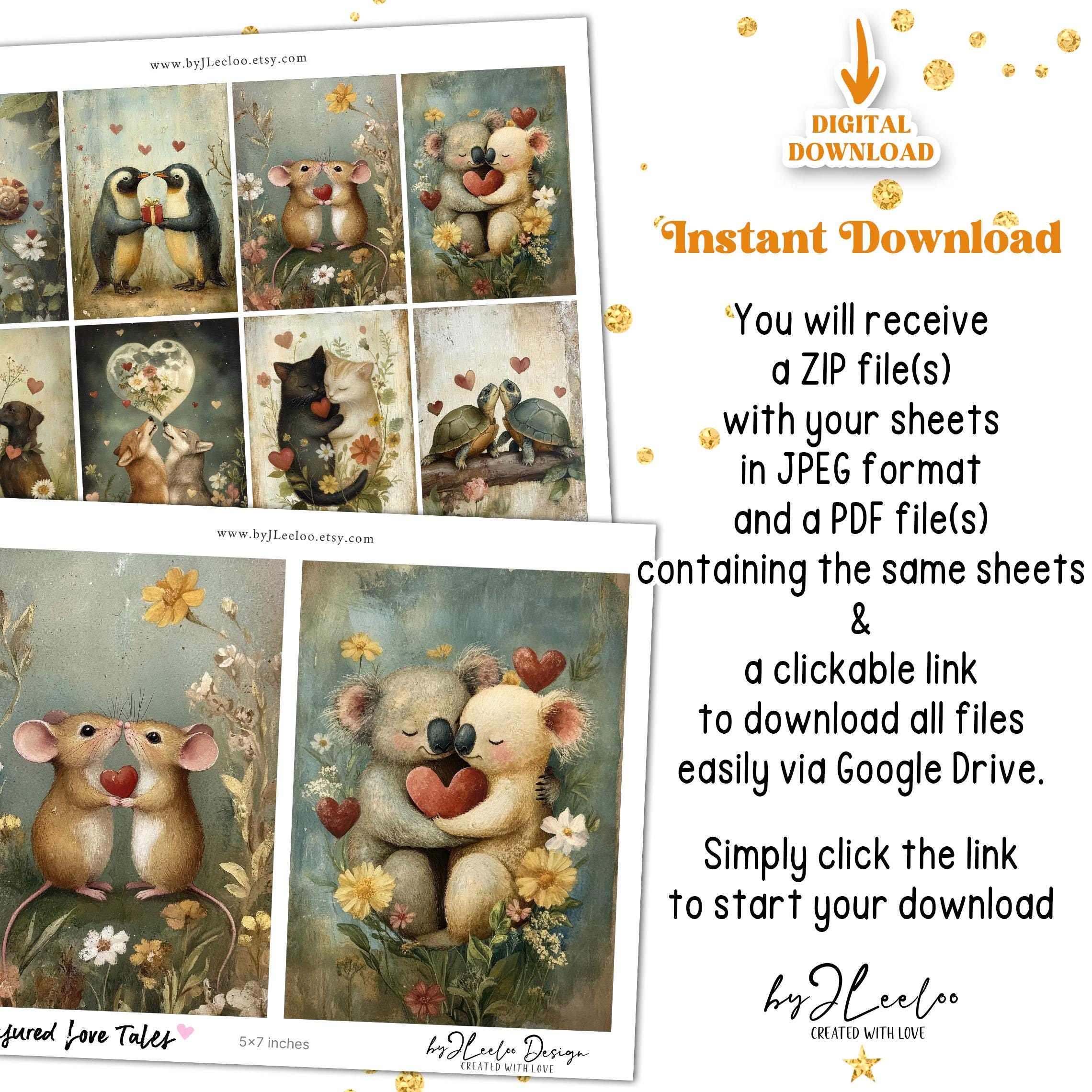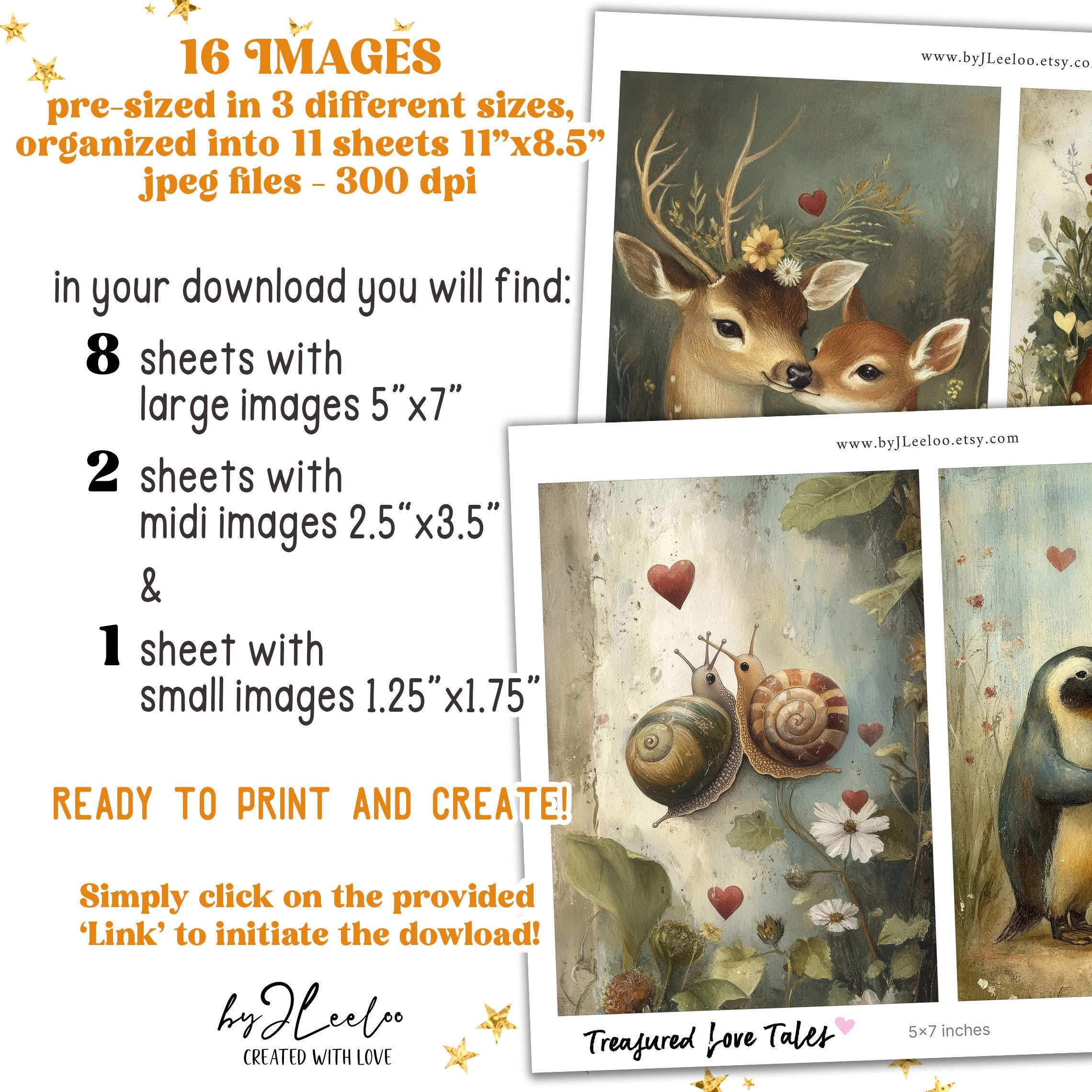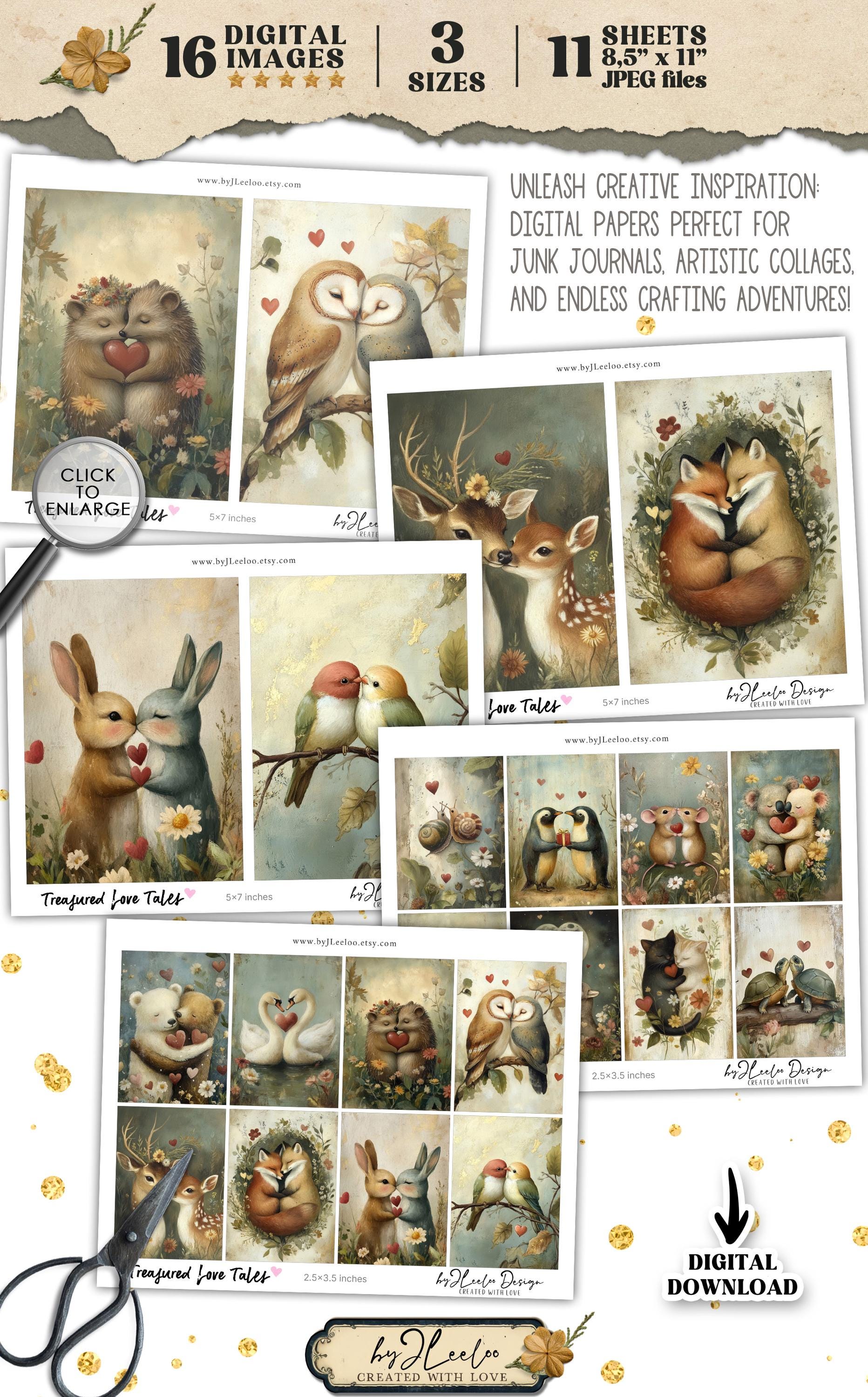 TREASURED LOVE TALES 3 sizes | Valentine card journal printable vintage supplies | animals in love illustration scrapbook romantic | pp913