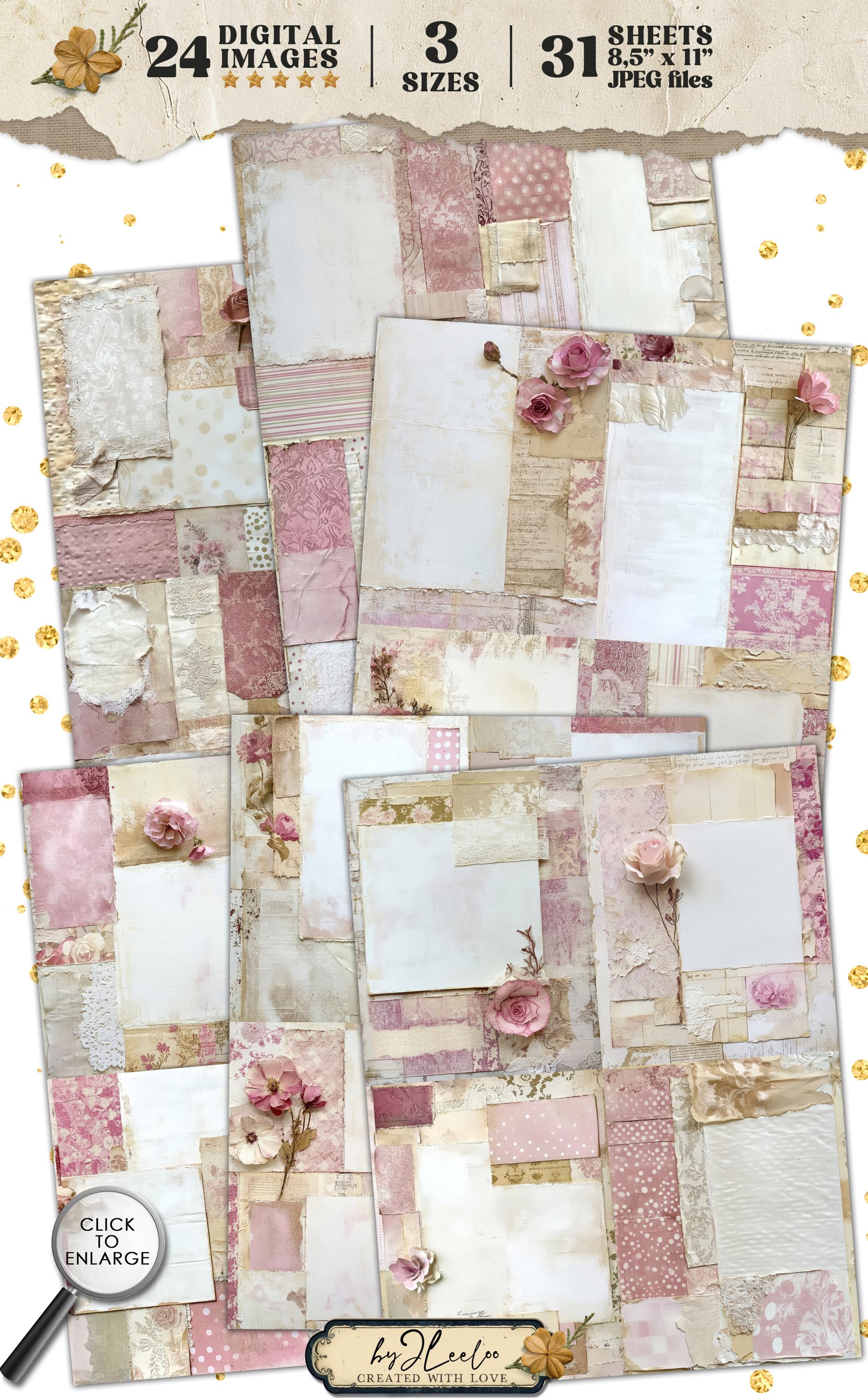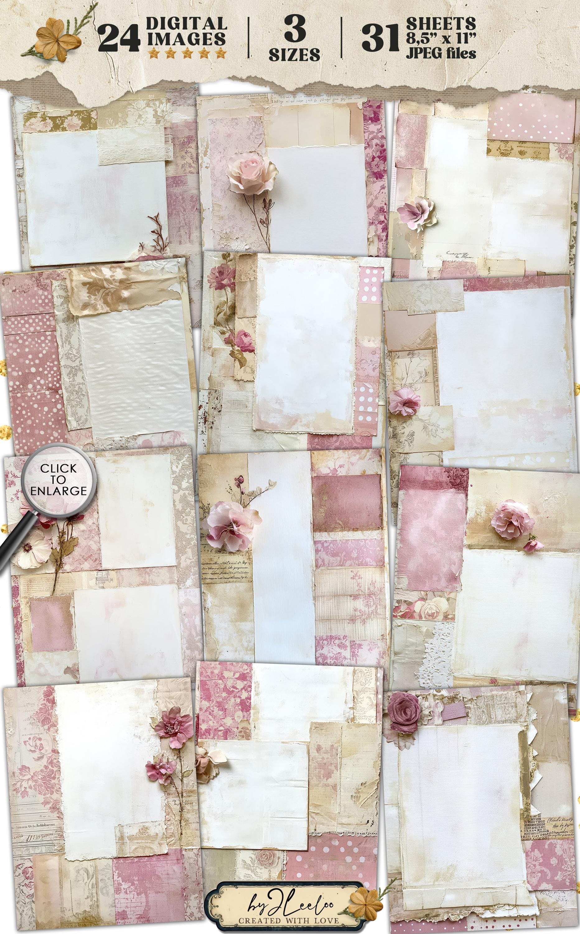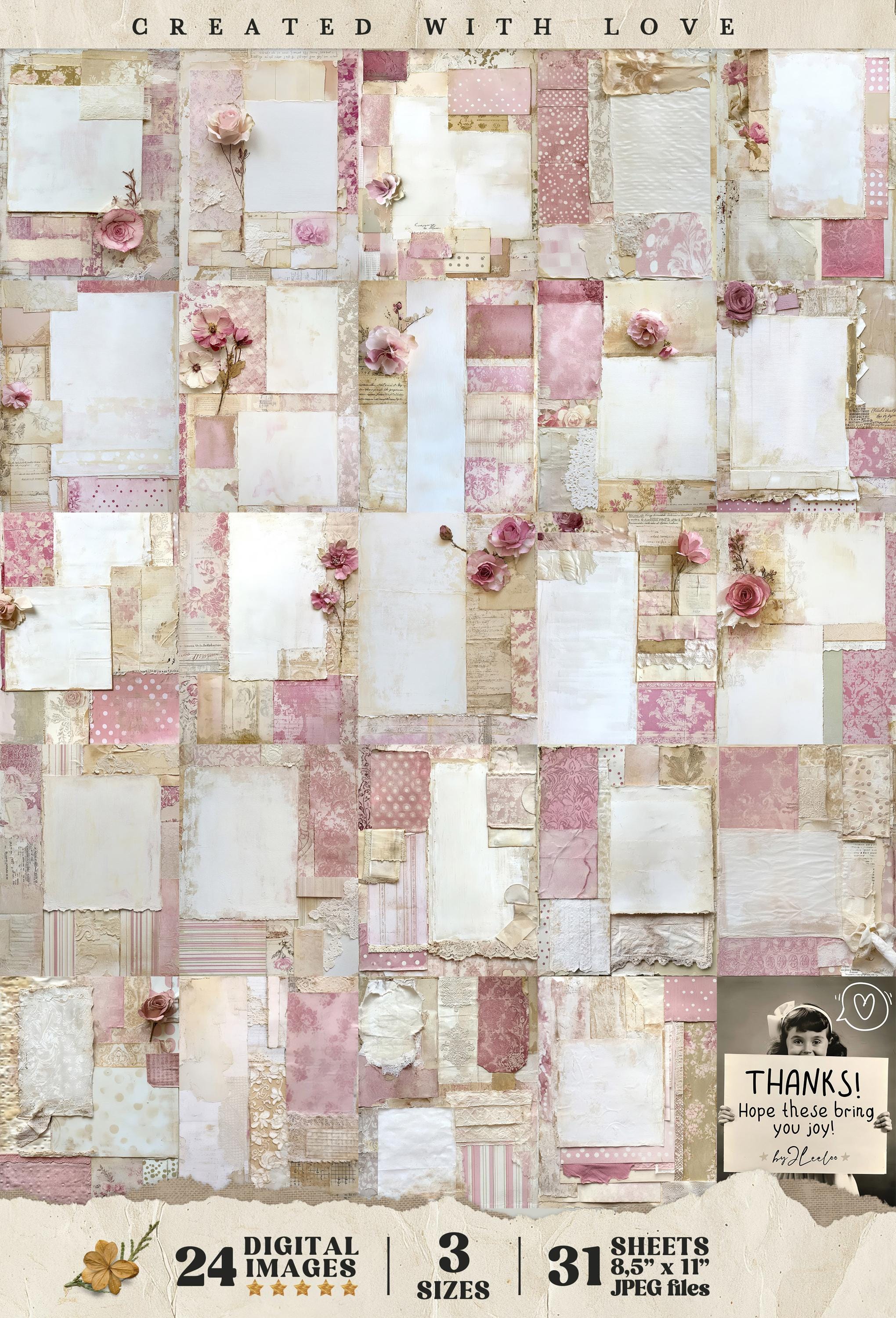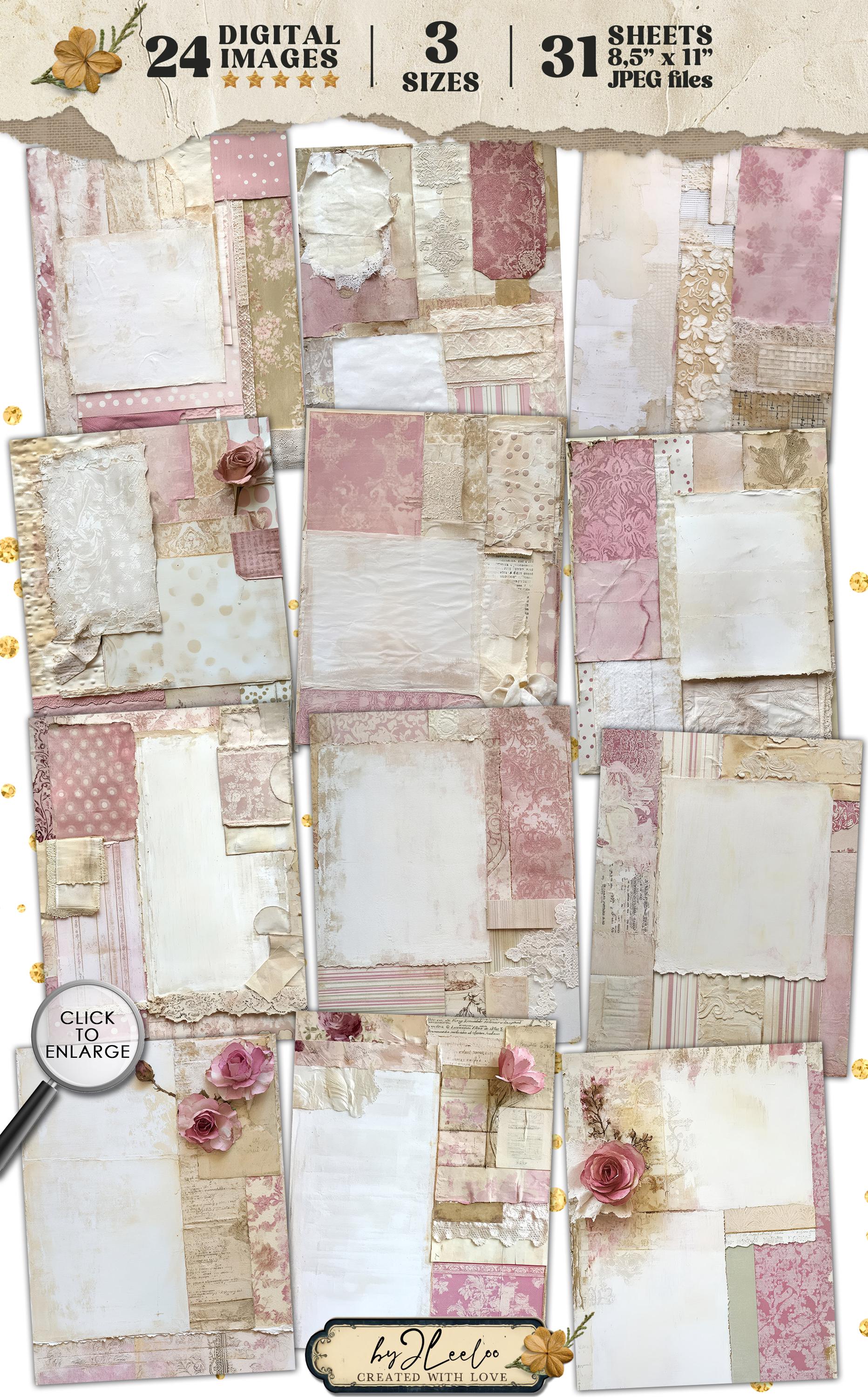 ๐คโ๏ธ Hey, crafters! Give your creative projects a soft, romantic touch with our collection of 24 stunning digital sheets in three versatile sizes! Designed in dreamy shades of pink, ivory, and soft beige, these sheets feature delicate lace accents, tiny white polka dots, subtle damask patterns, and elegant pink florals, making them perfect for adding a vintage-inspired charm to your work.
