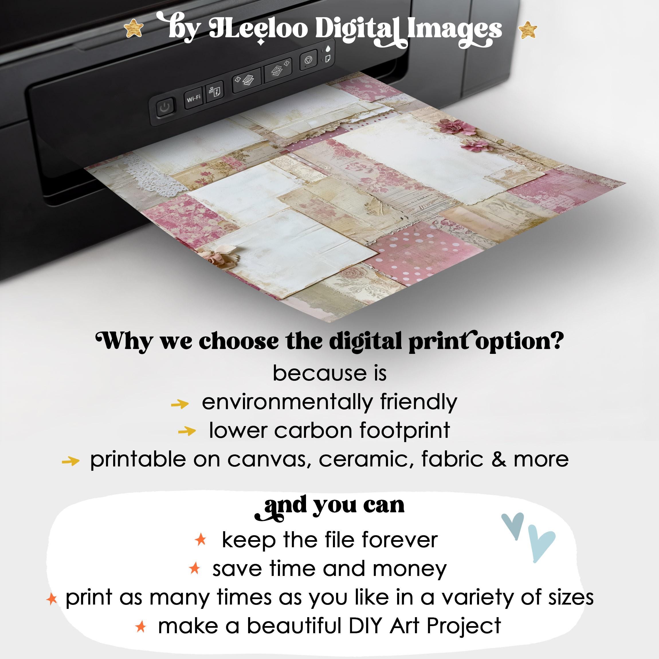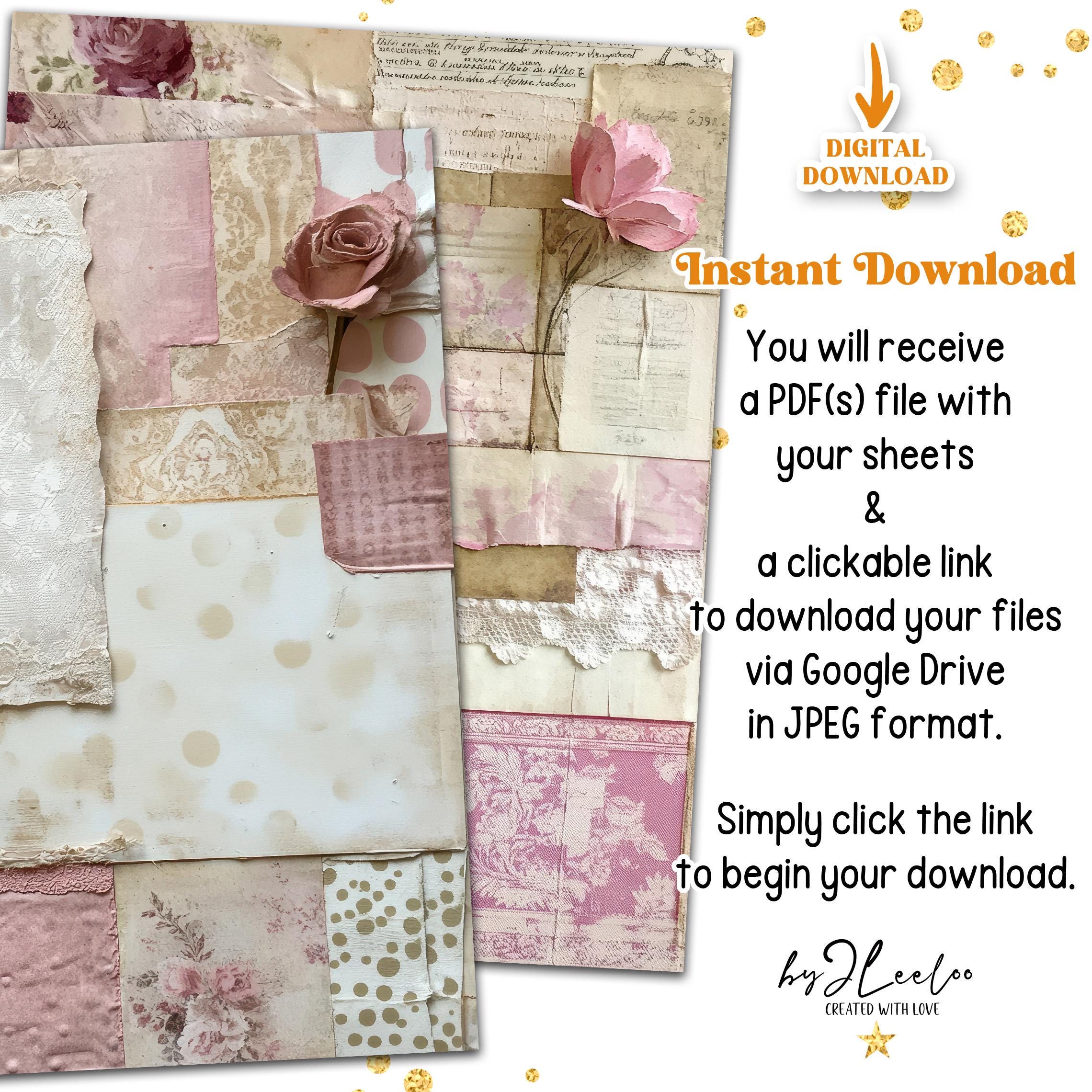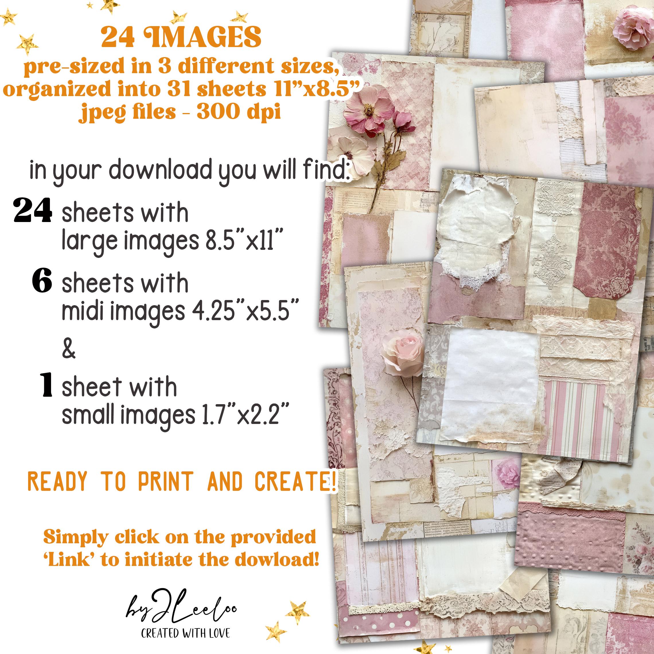 From large formats for bold backgrounds to medium sizes ideal for journals and scrapbooks, and tiny formats for intricate details, collages, or jewelry, this collection offers endless creative possibilities. Whether youโre crafting a shabby chic journal, romantic stationery, or heartfelt scrapbooking pages, these digital sheets will bring warmth and beauty to every project.