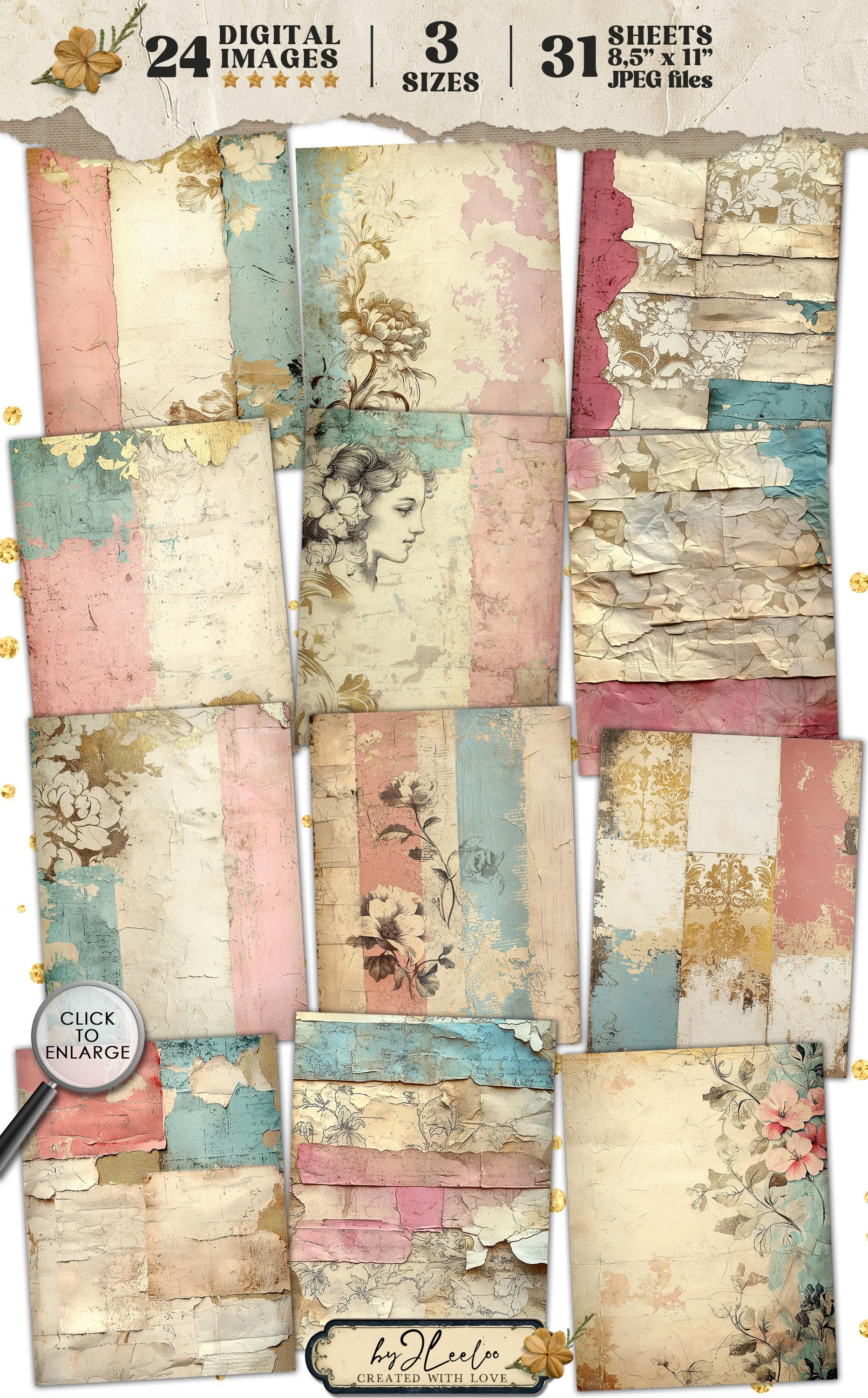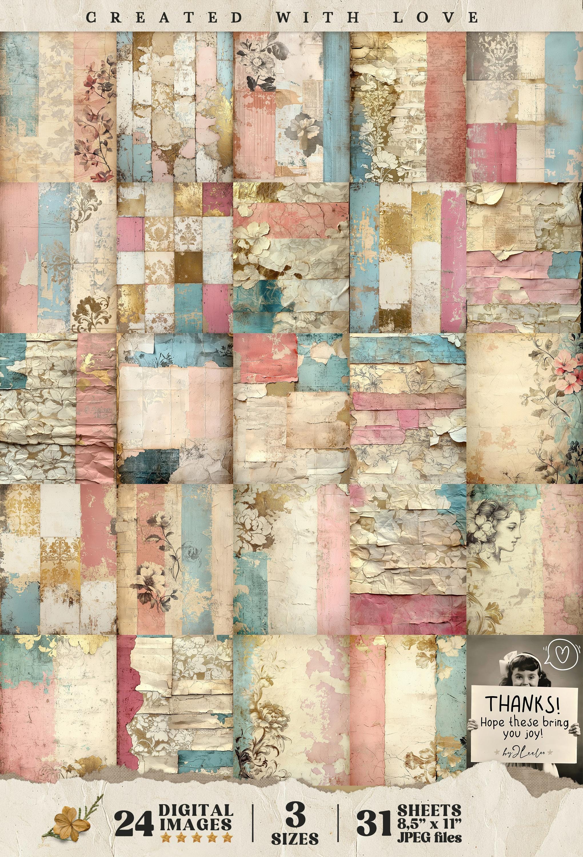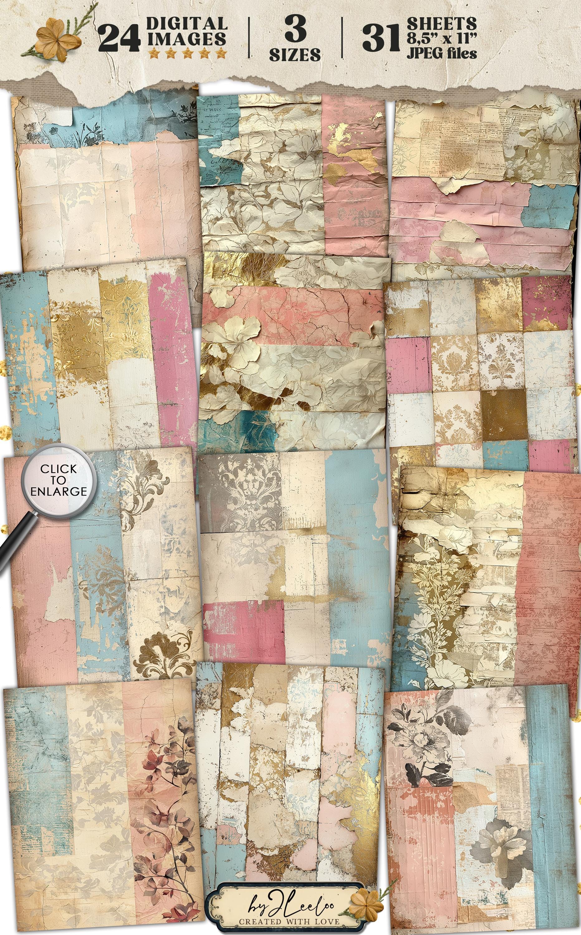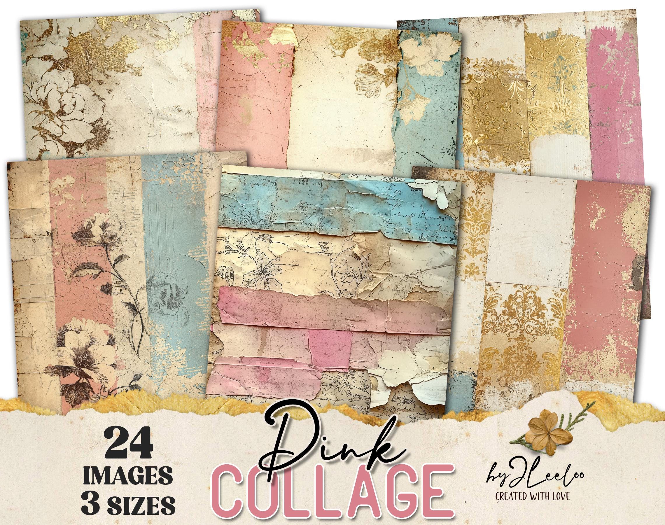 PINK COLLAGE 24 pastel background 3 Sizes | Junk Journal Collage Pages | Backdrop Rustic papers | scrapbook digital | Commercial Use | pp923