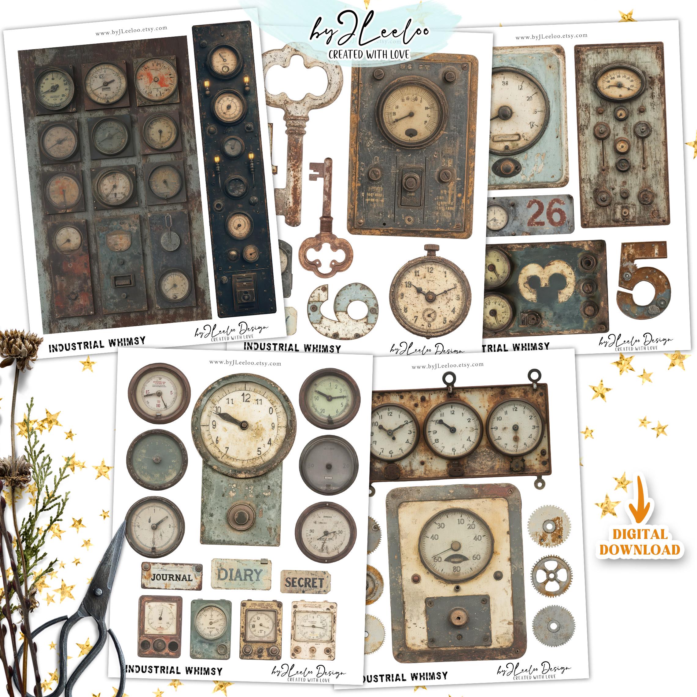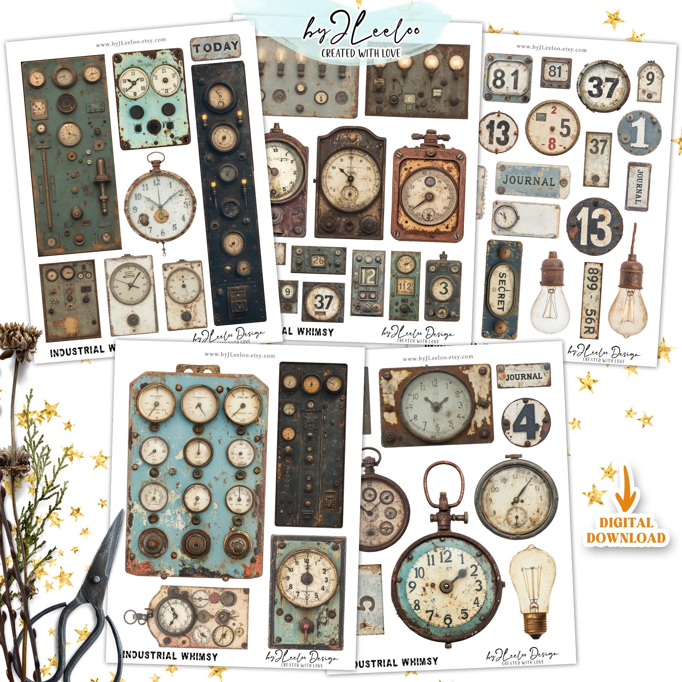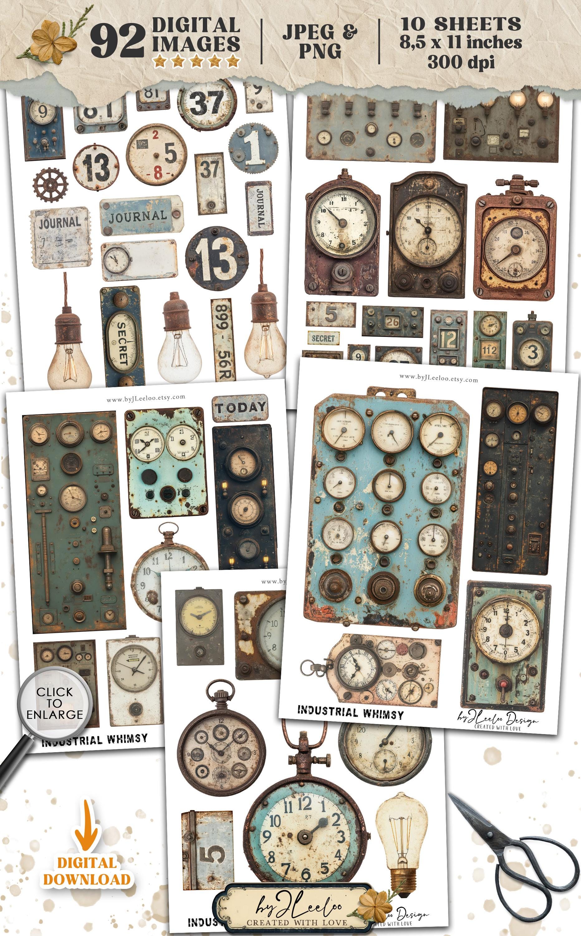 A collection of vintage industrial ephemera perfect for junk journals, scrapbooking, mixed media, and steampunk-themed crafts!