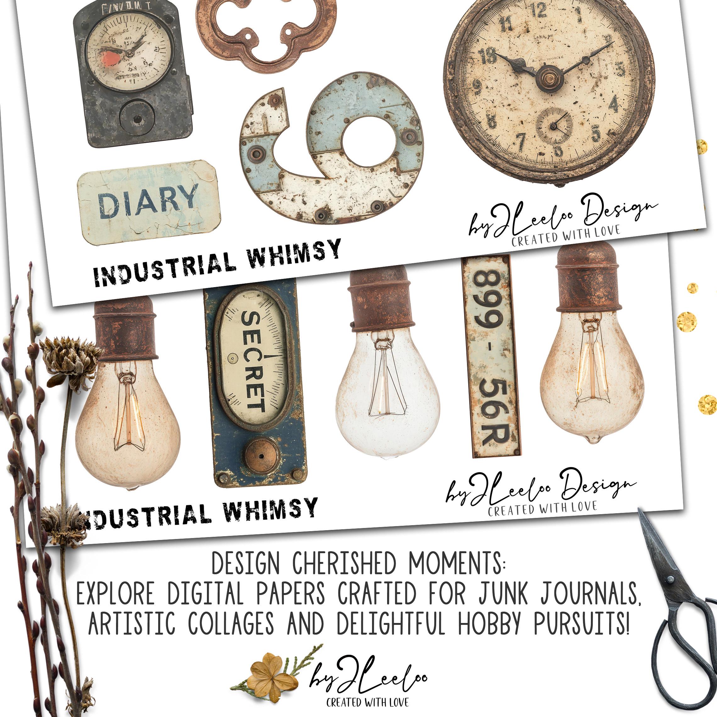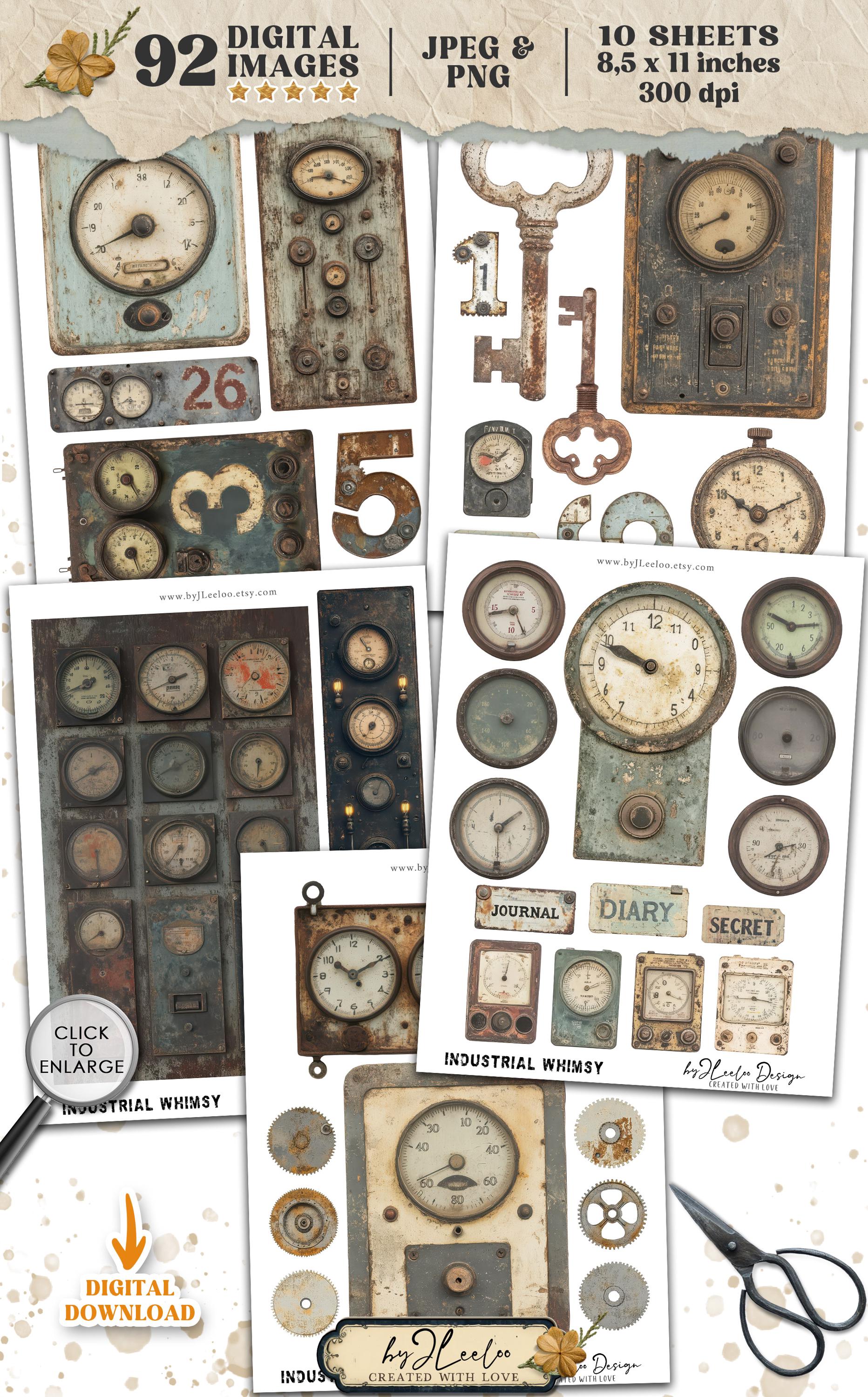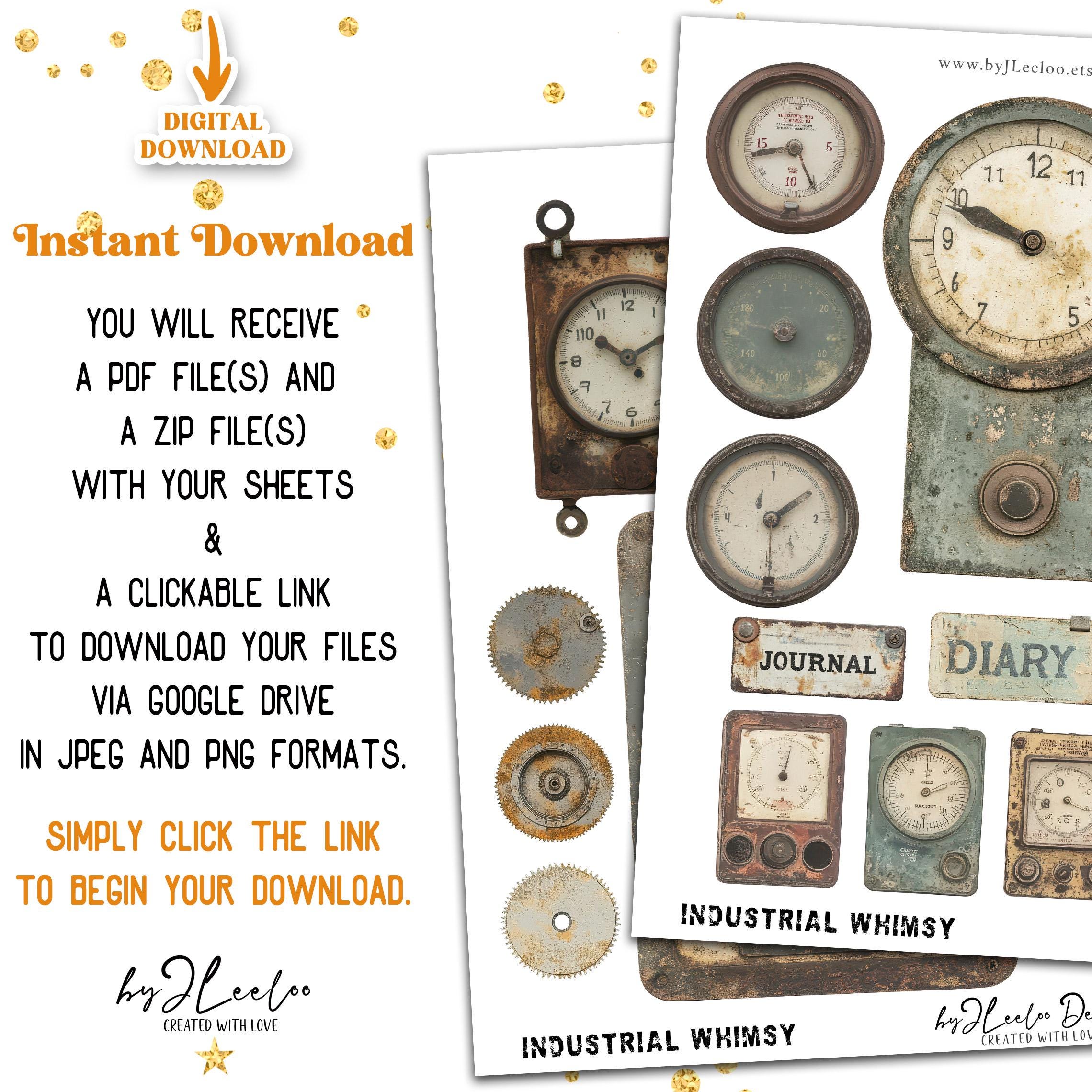 A collection of vintage industrial ephemera perfect for junk journals, scrapbooking, mixed media, and steampunk-themed crafts!