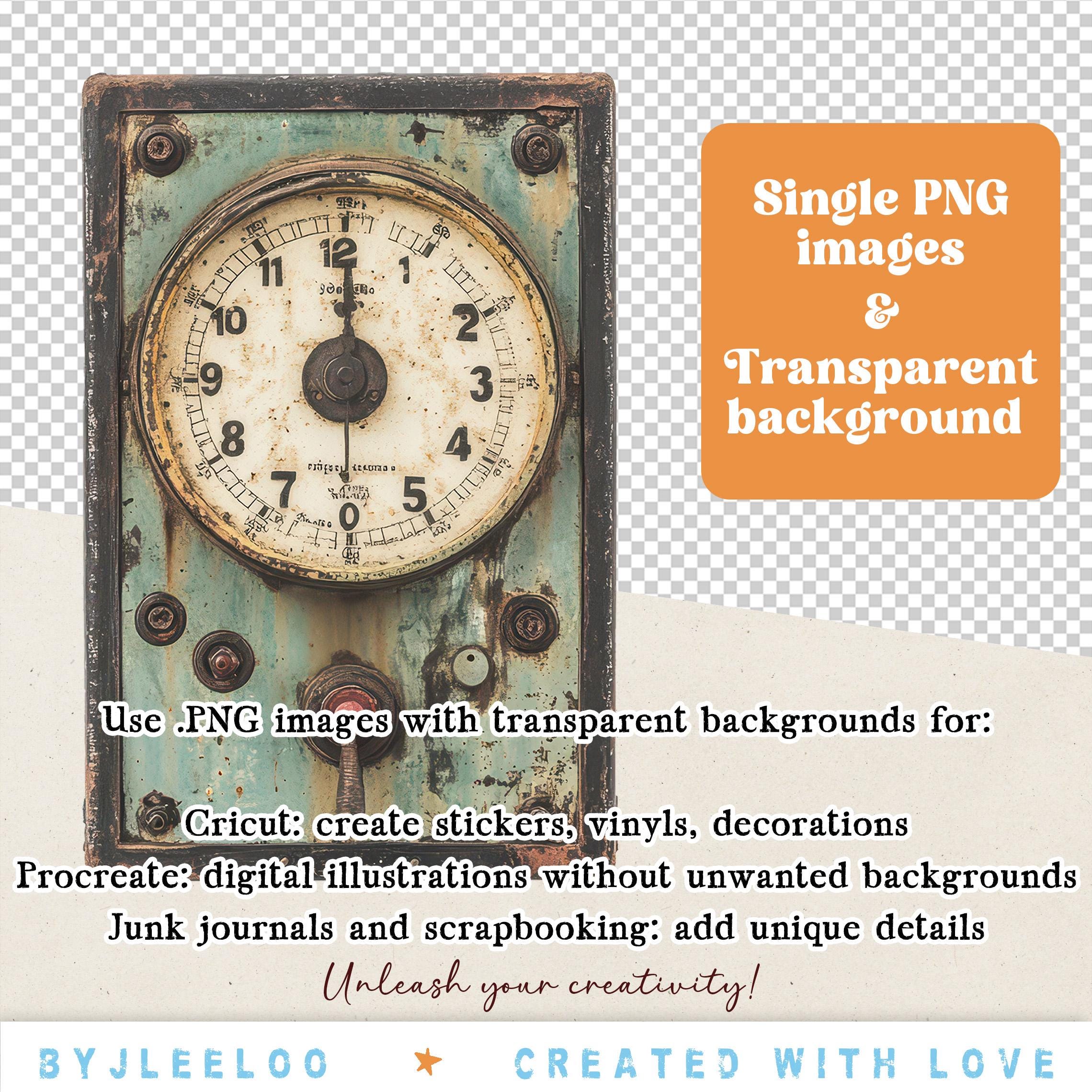 This set features a unique selection of mechanical elements, aged dials, clocks, gears, labels, and numbers, all with a distressed, timeworn aesthetic. These high-quality digital images are ideal for creating masculine, industrial, and grunge-style projects.