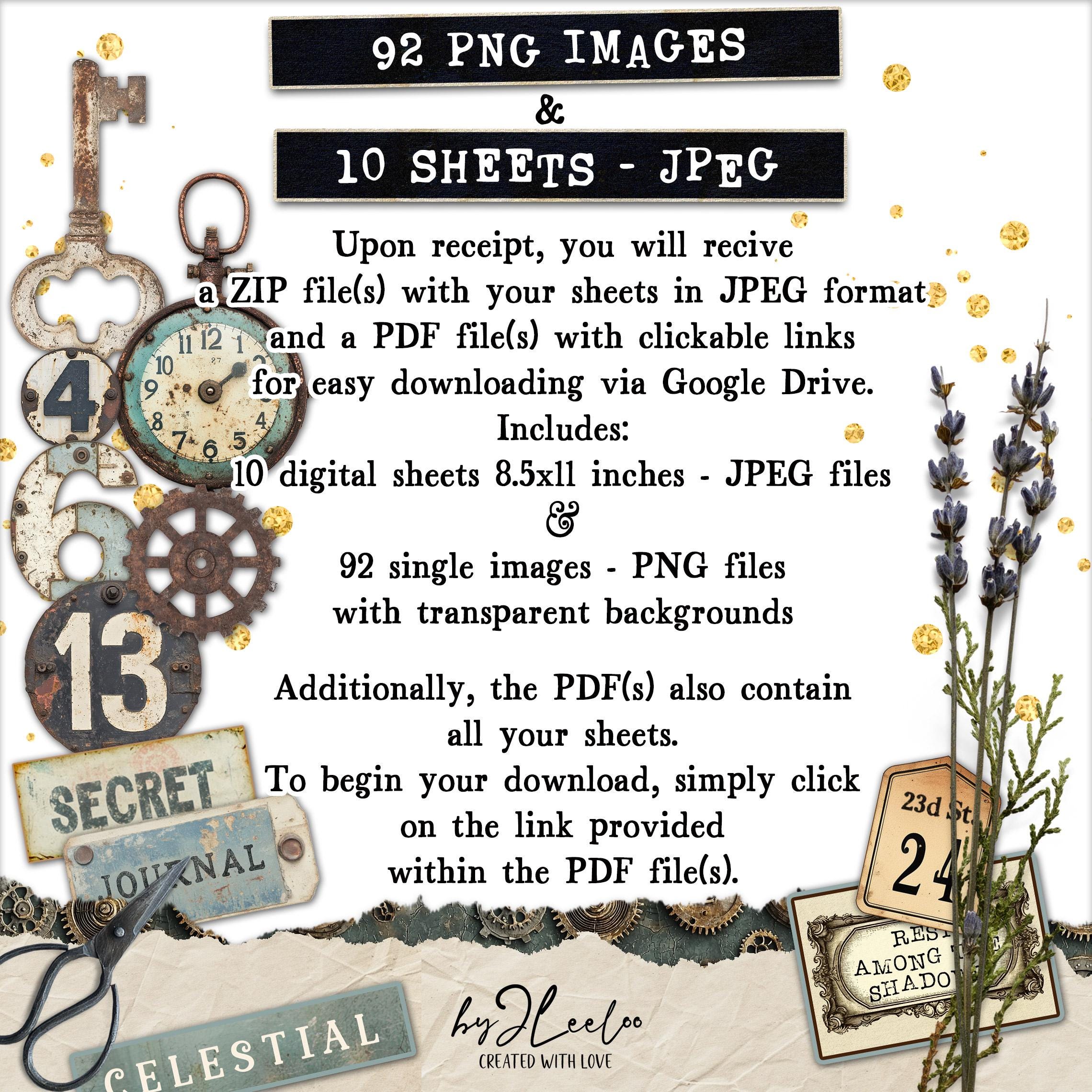 โ 10 digital sheets (JPEG, 300 DPI) โ Filled with 92 authentic steampunk-inspired elements