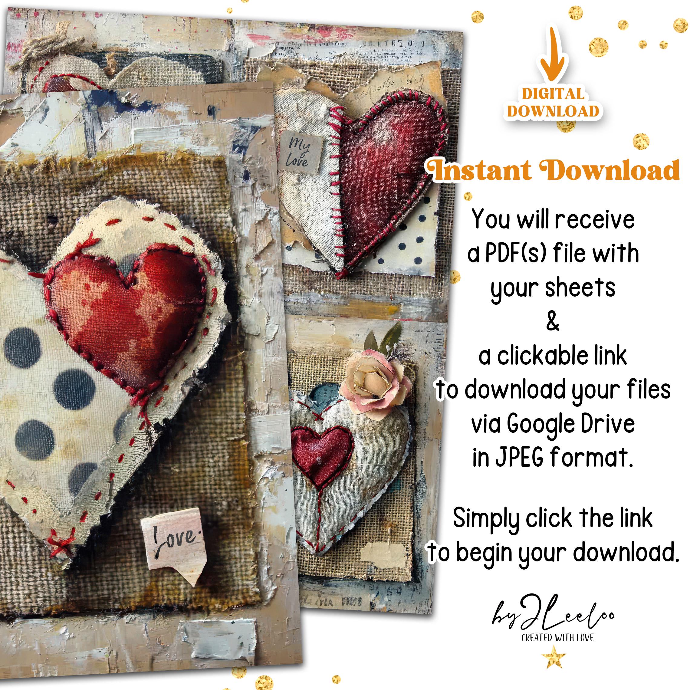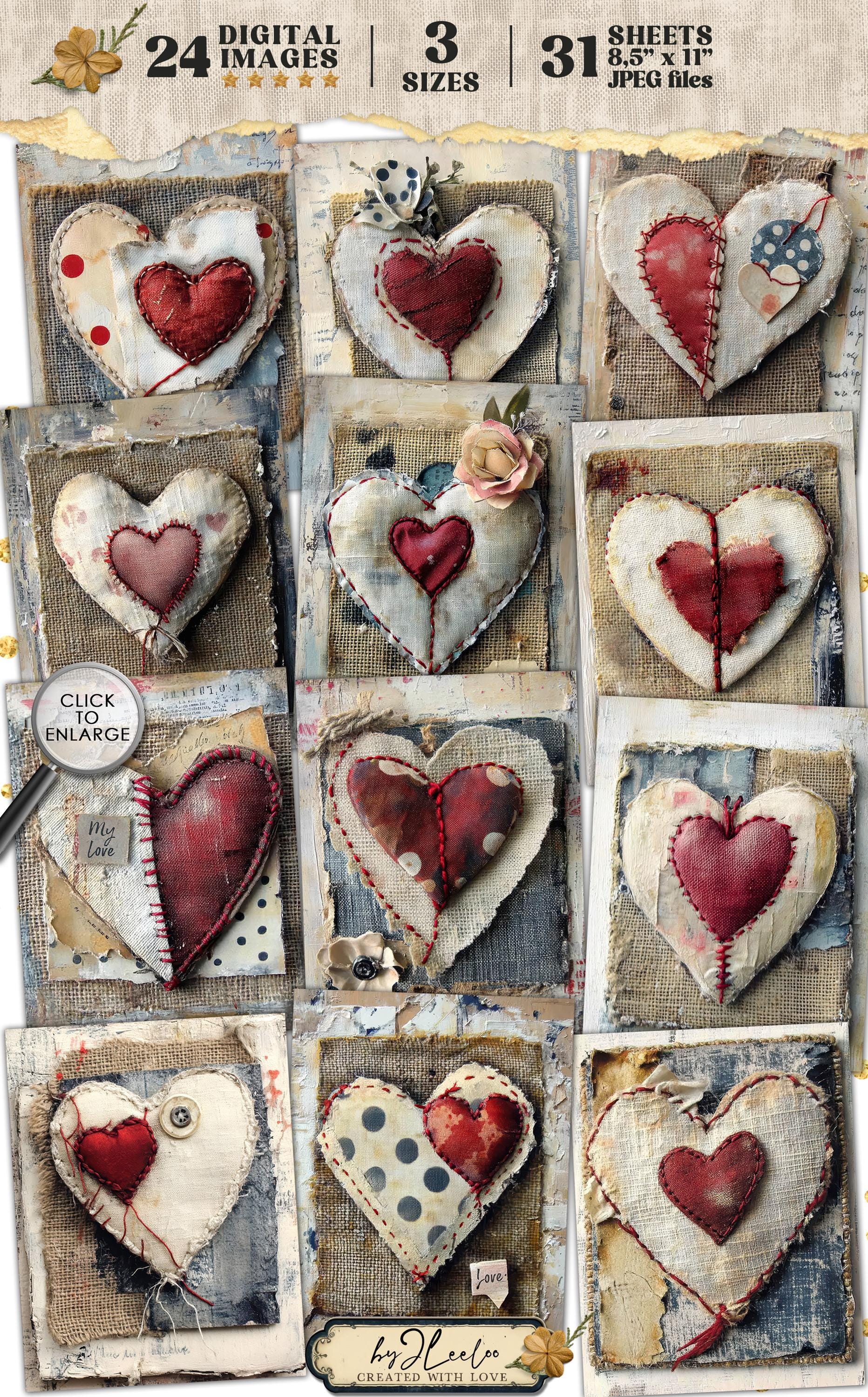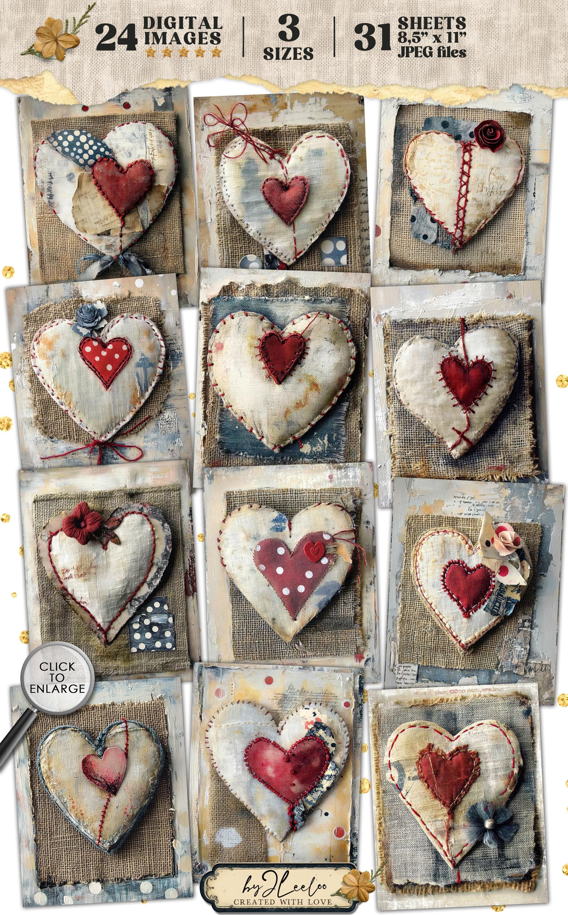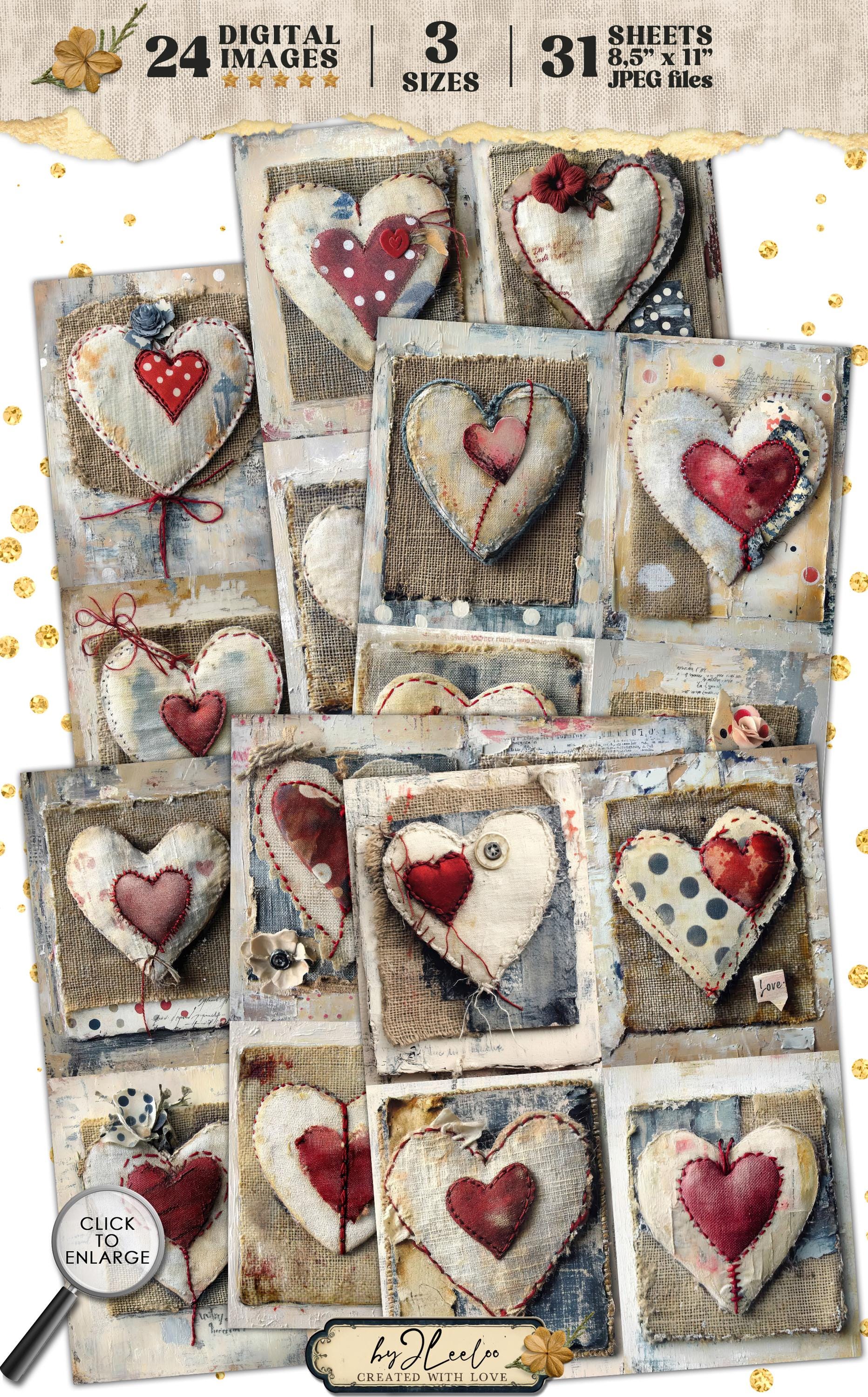 ๐ Hey, crafters! Add a heartfelt, rustic touch to your projects with this collection of 24 digital sheets, each featuring a fabric heart stitched onto a charming burlap background. Subtle brushstrokes and hints of blue polka dots enhance the vintage feel, making this set perfect for Valentineโs Day creations.