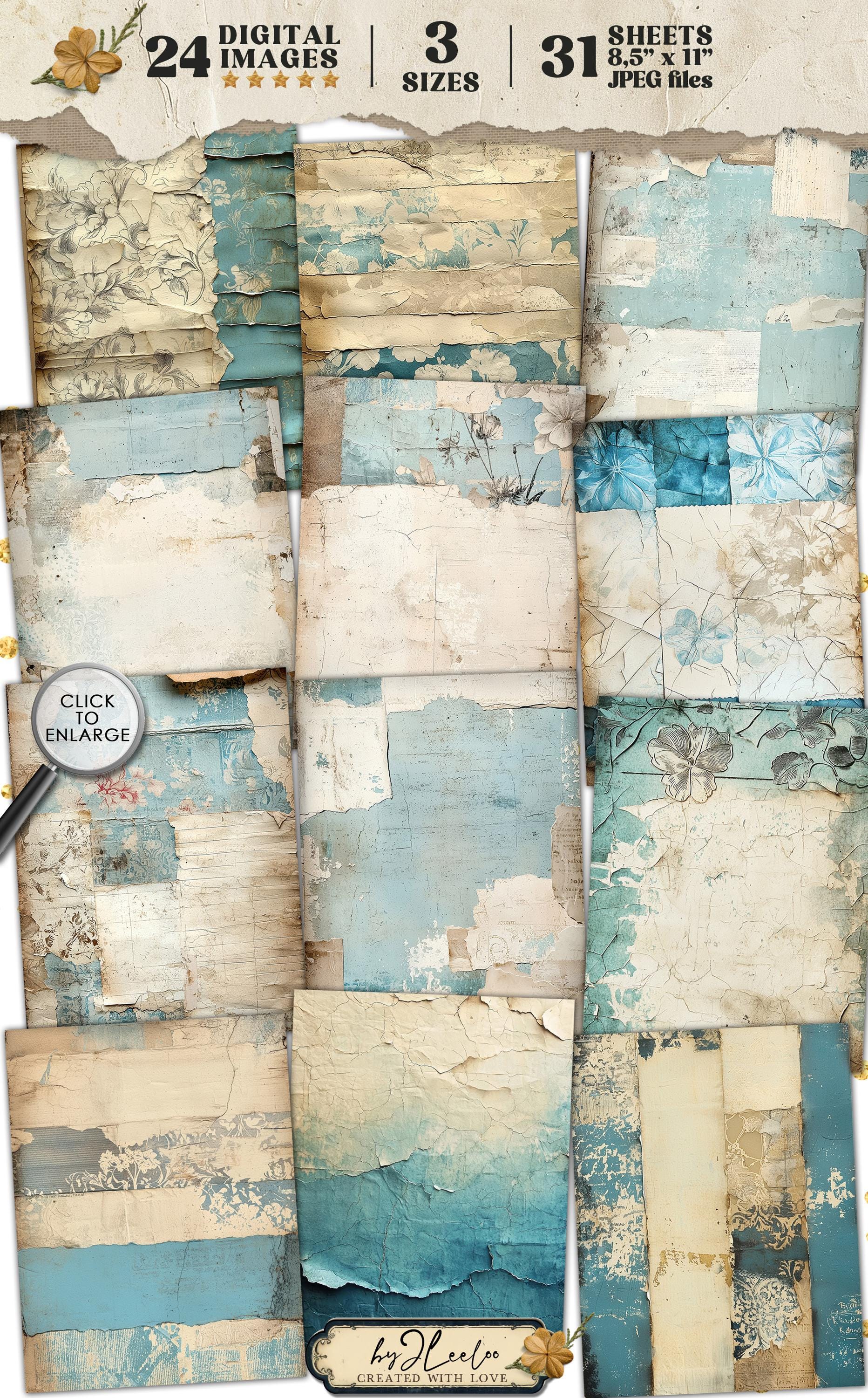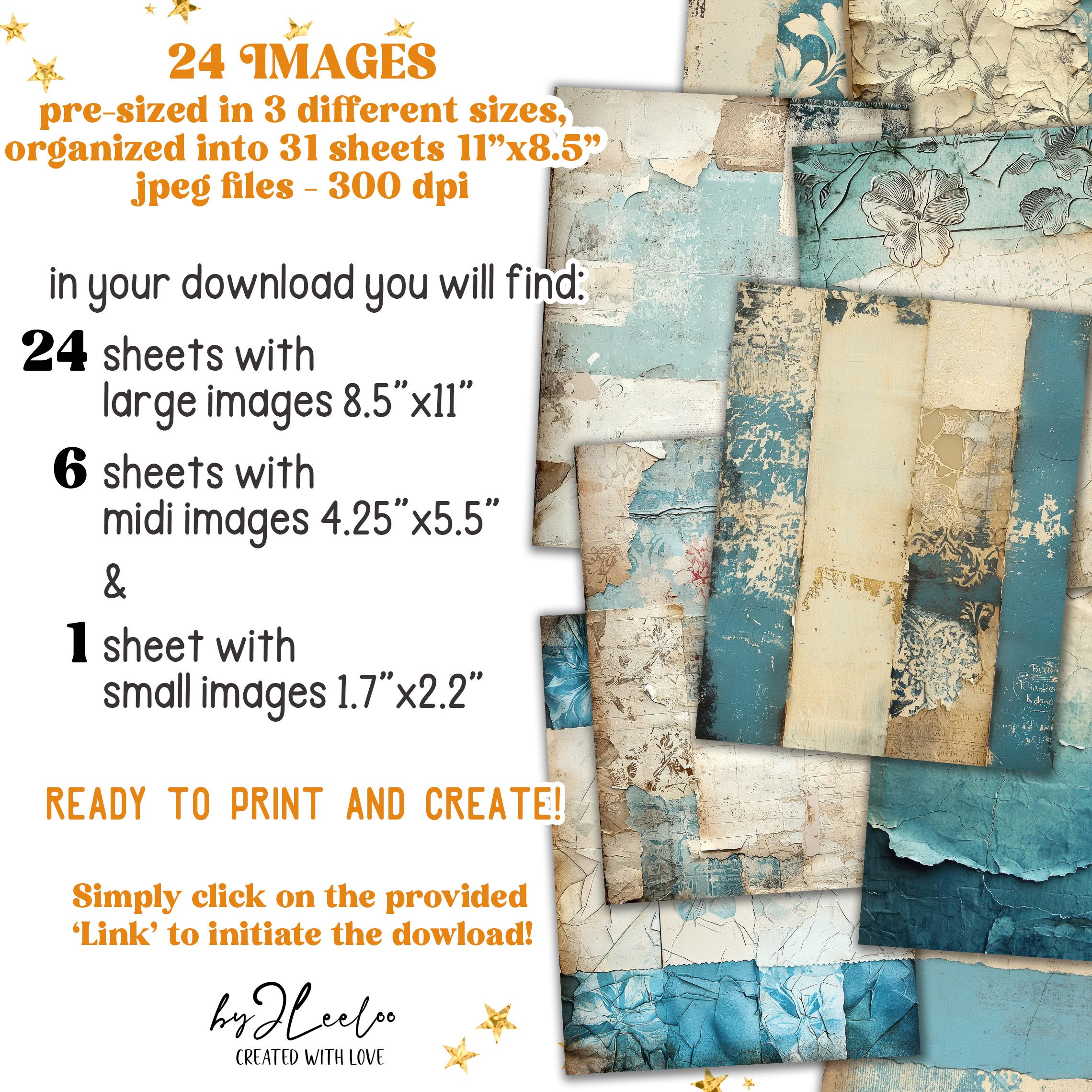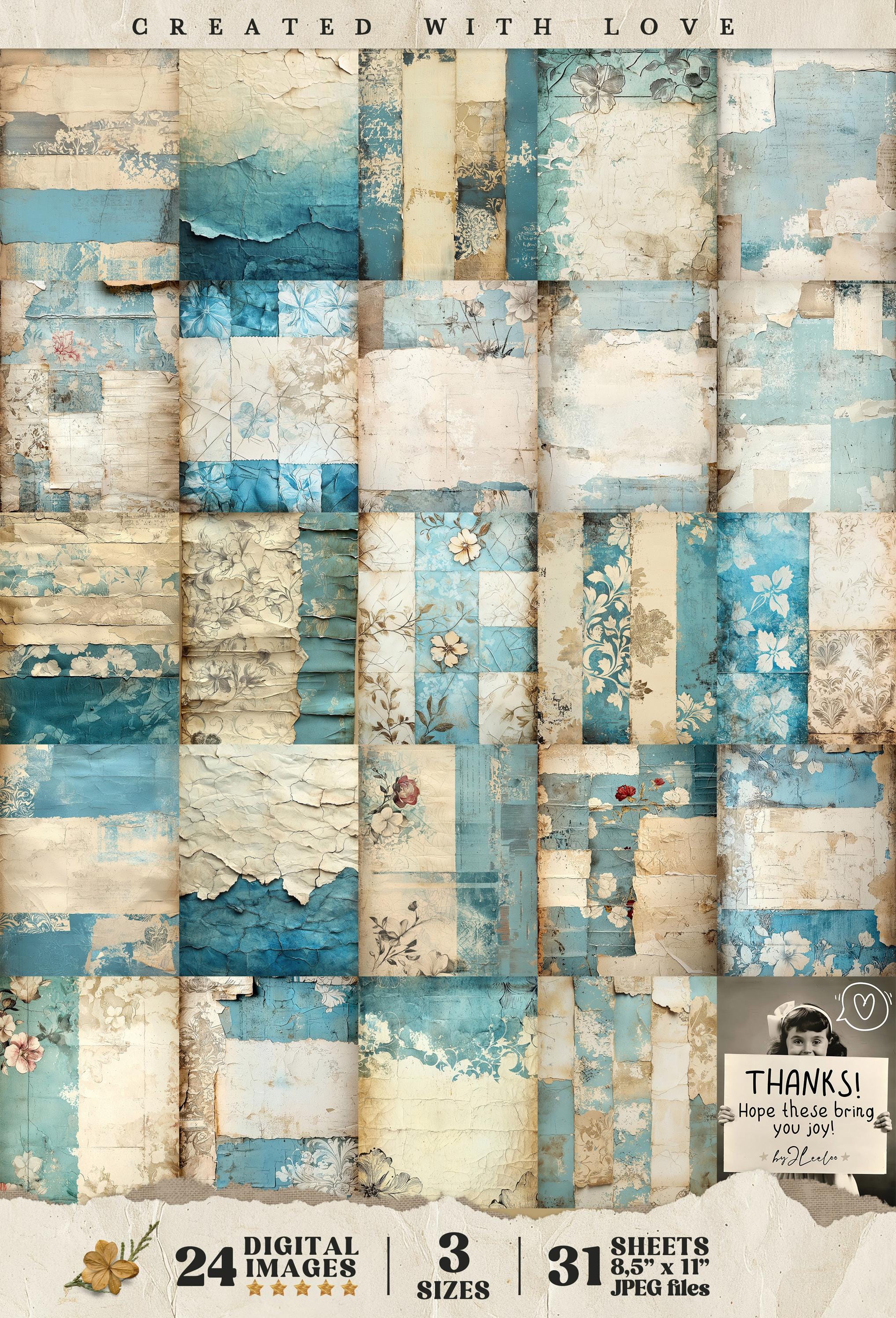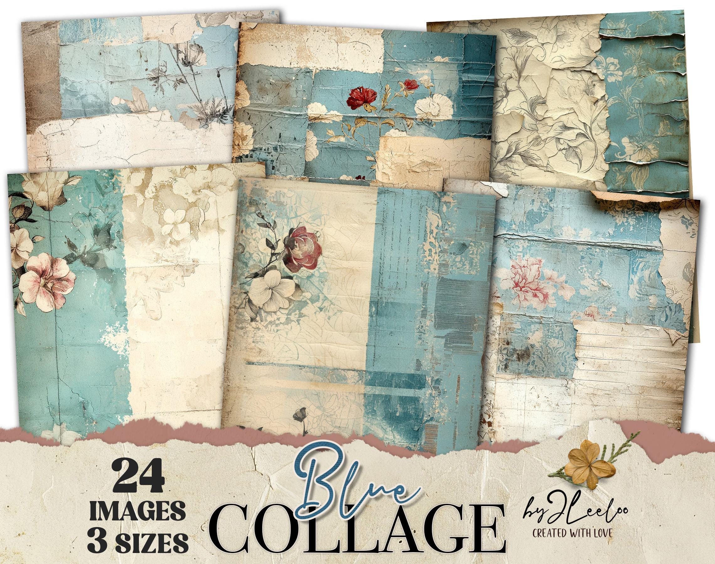 BLUE COLLAGE 24 papers 3 Sizes | Junk Journal Distressed Pages | Backdrop Rustic Background | Junk Journal scrapbook Commercial Use | pp920