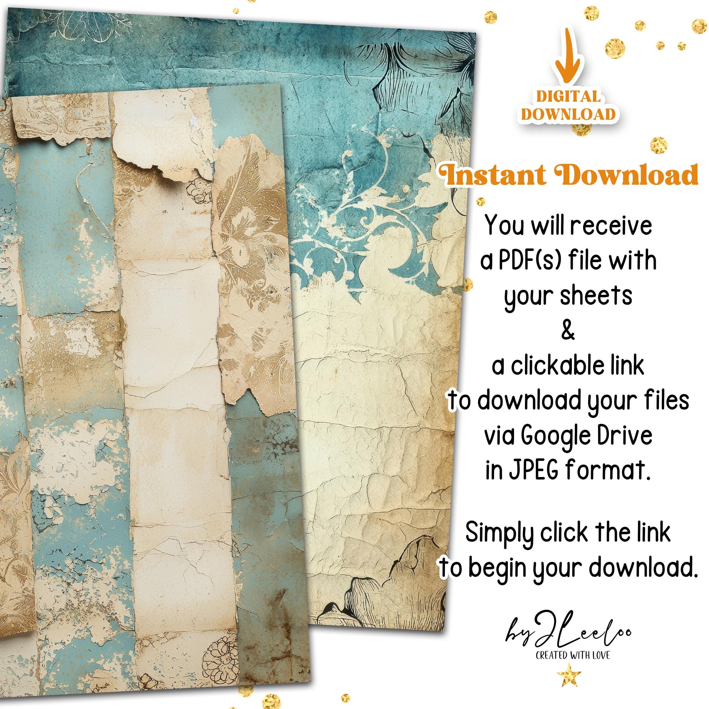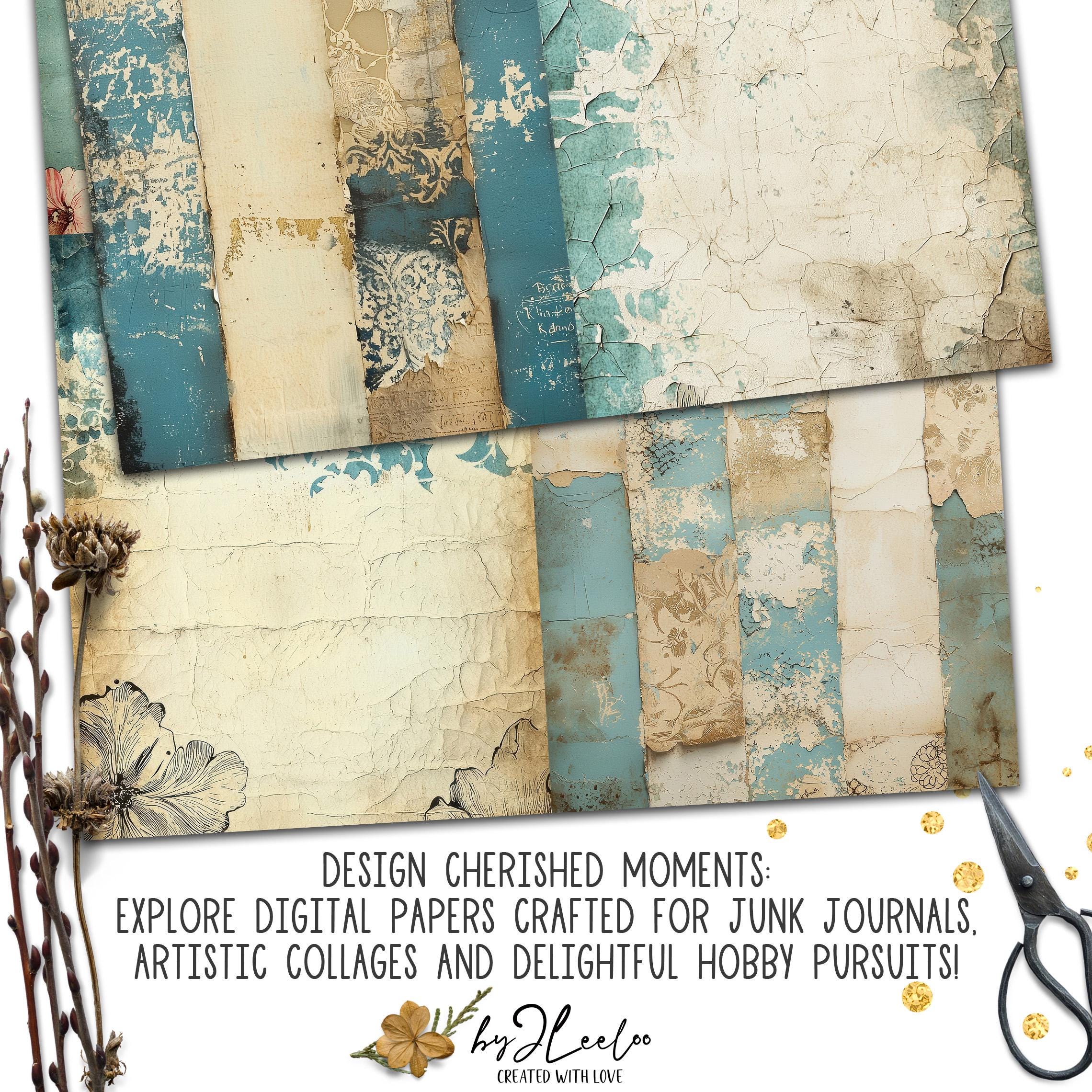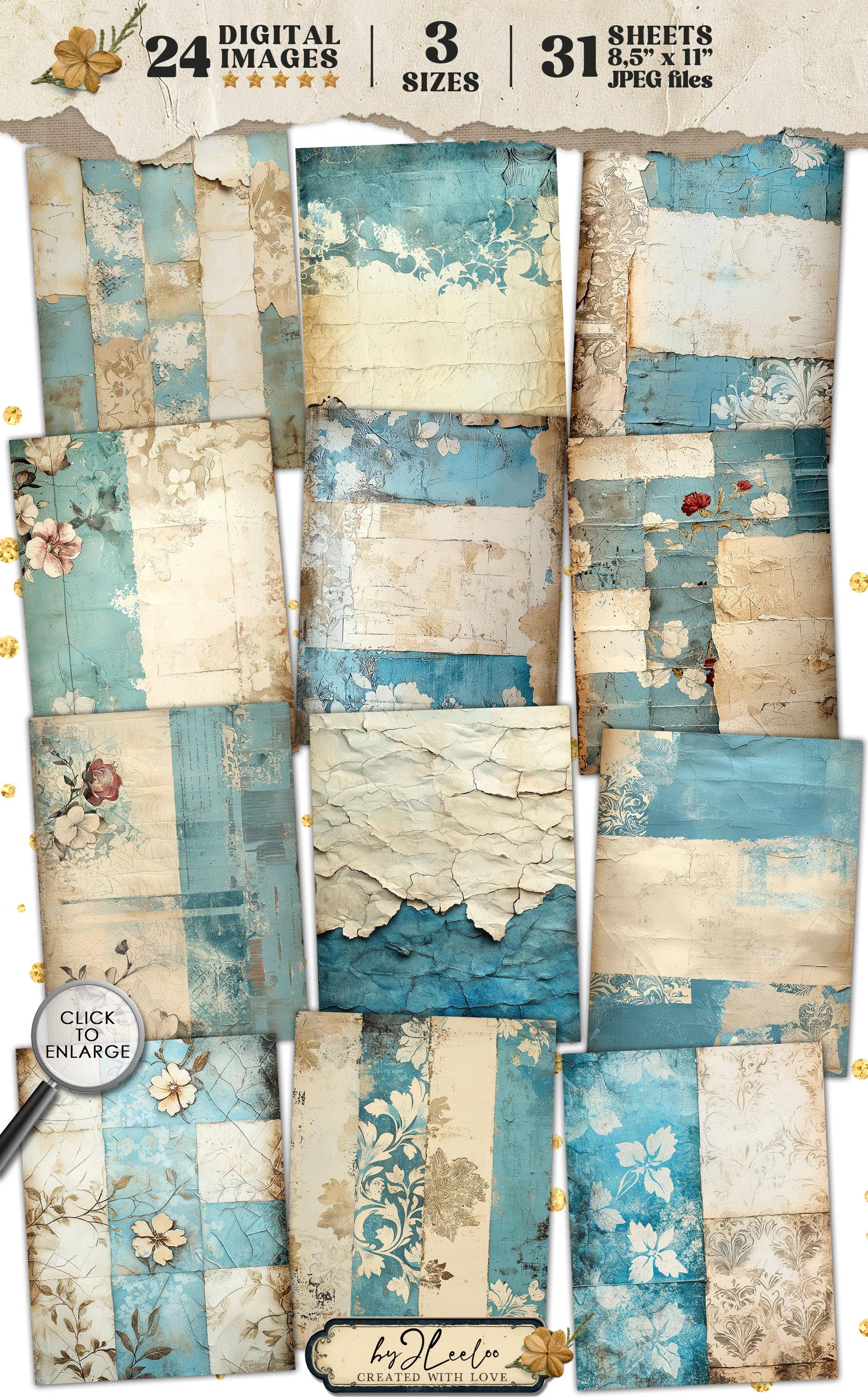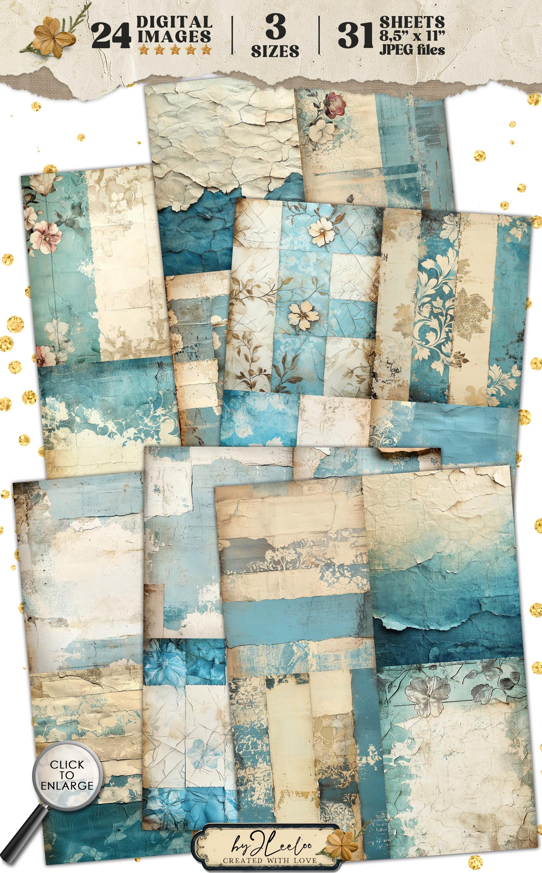 BLUE COLLAGE 24 papers 3 Sizes | Junk Journal Distressed Pages | Backdrop Rustic Background | Junk Journal scrapbook Commercial Use | pp920