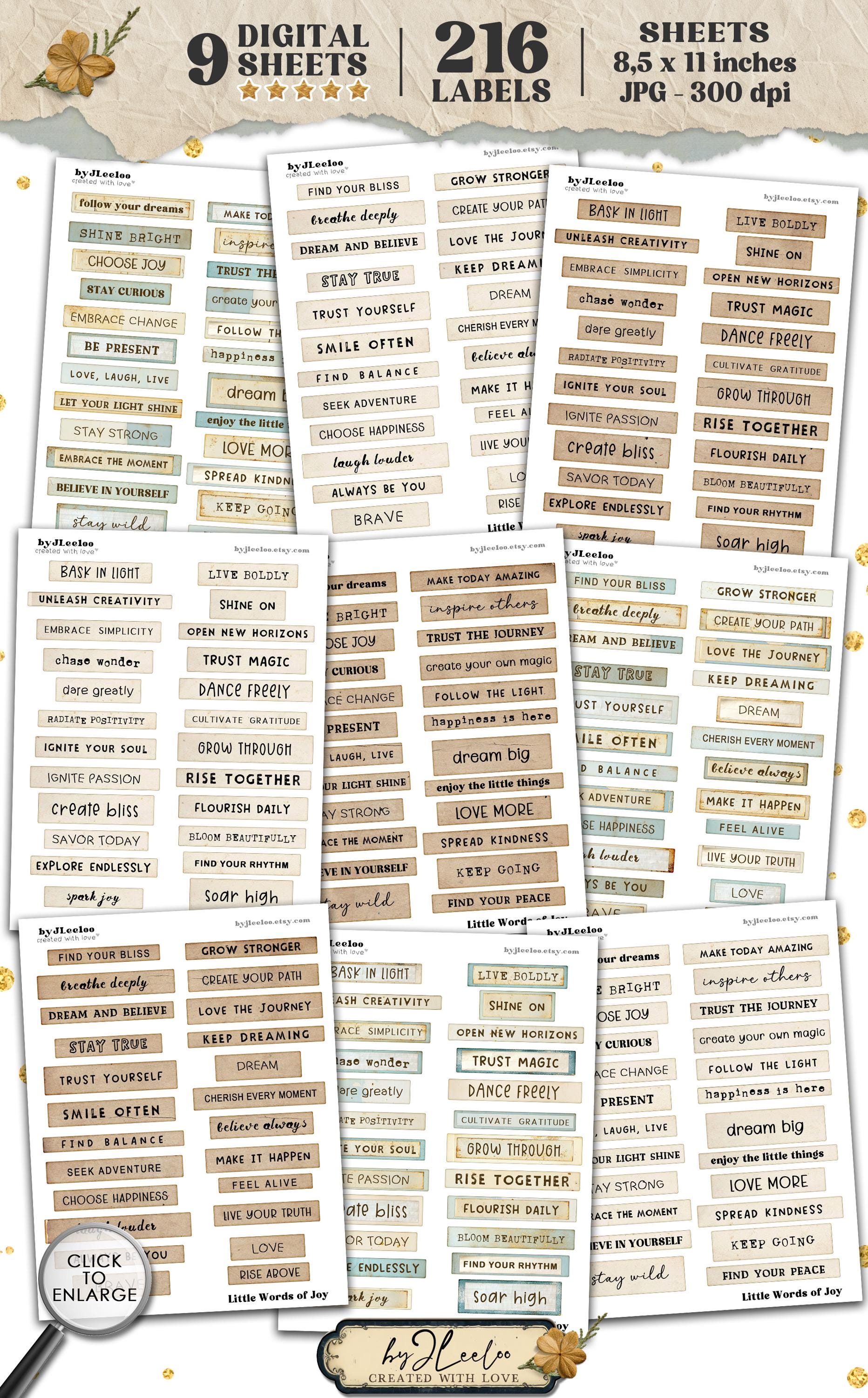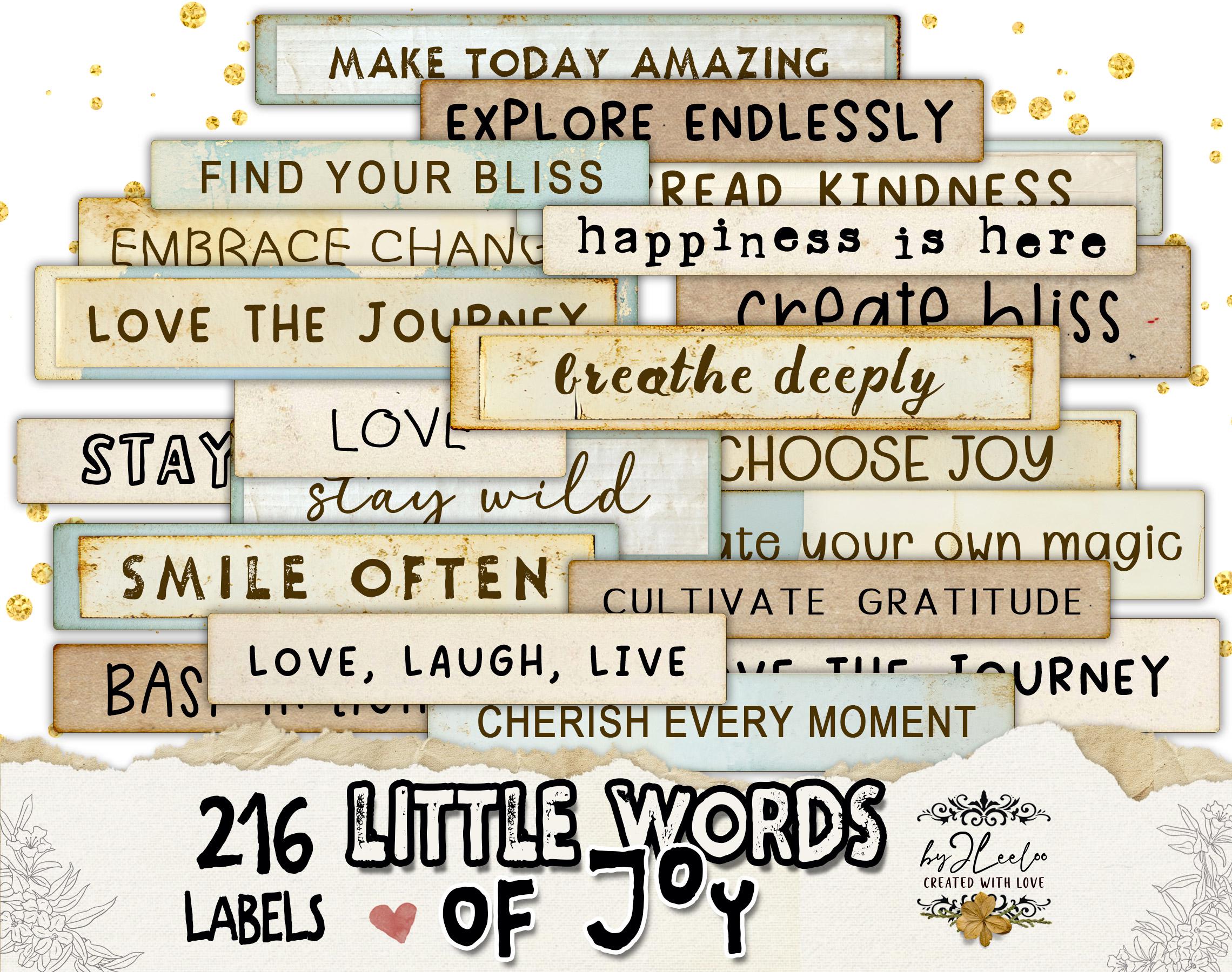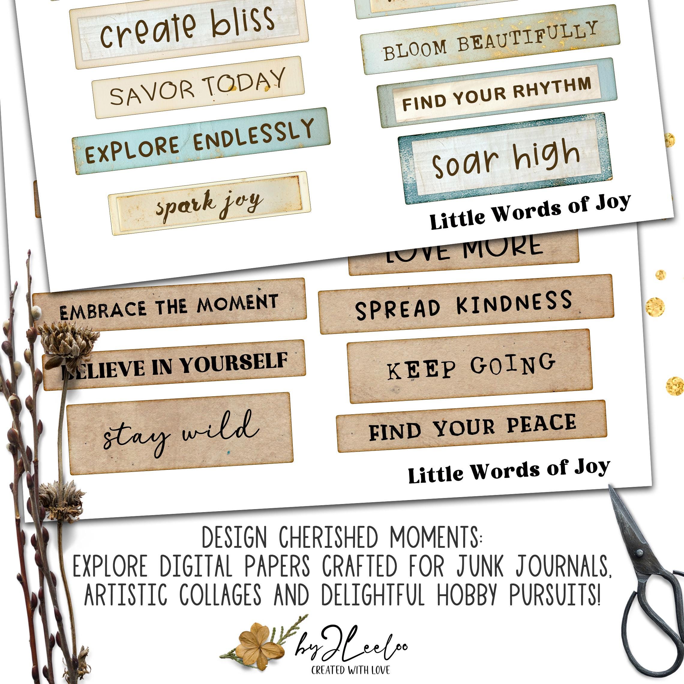 Sprinkle a little joy into your creative projects with LITTLE WORDS OF JOY! This collection features 216 beautifully crafted labels in 3 unique styles, packed with uplifting words and inspiring phrases. Whether you're working on junk journals, scrapbooks, card-making, or mixed media art, these labels are the perfect touch to bring warmth and positivity to your creations. Let your creativity flow and add a little magic to your craftsโbecause every project deserves a happy word! ๐